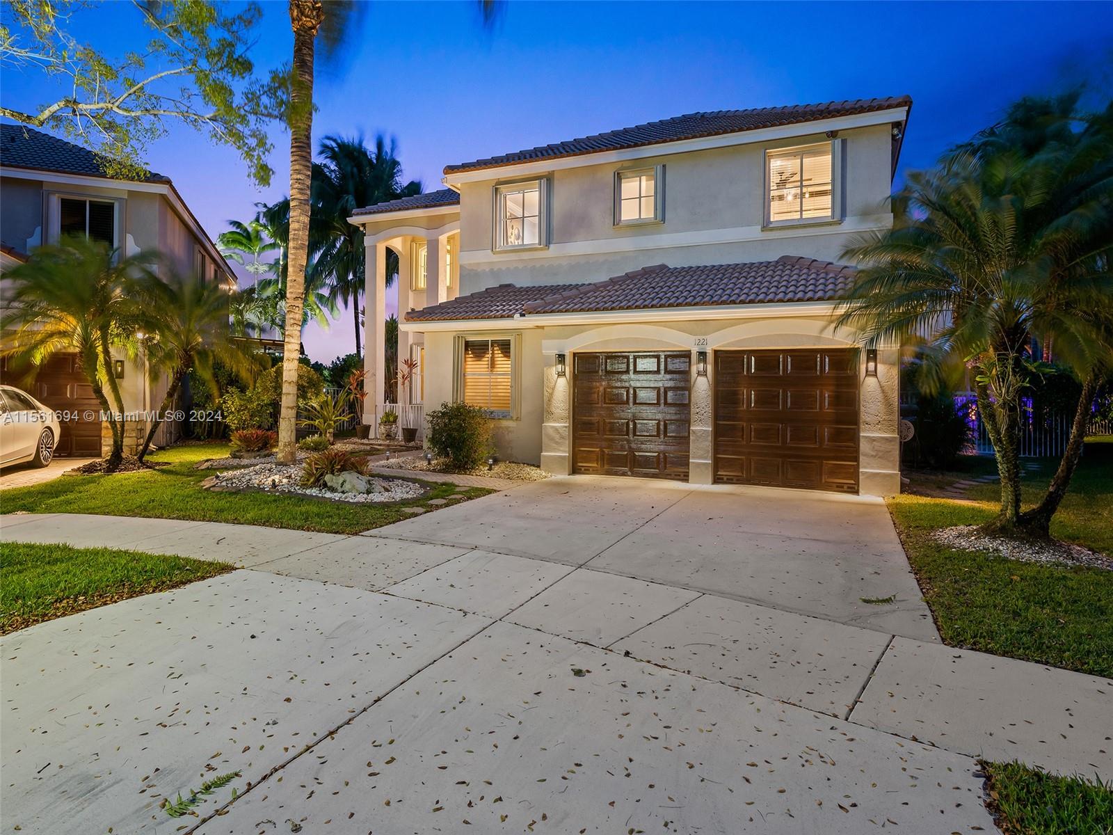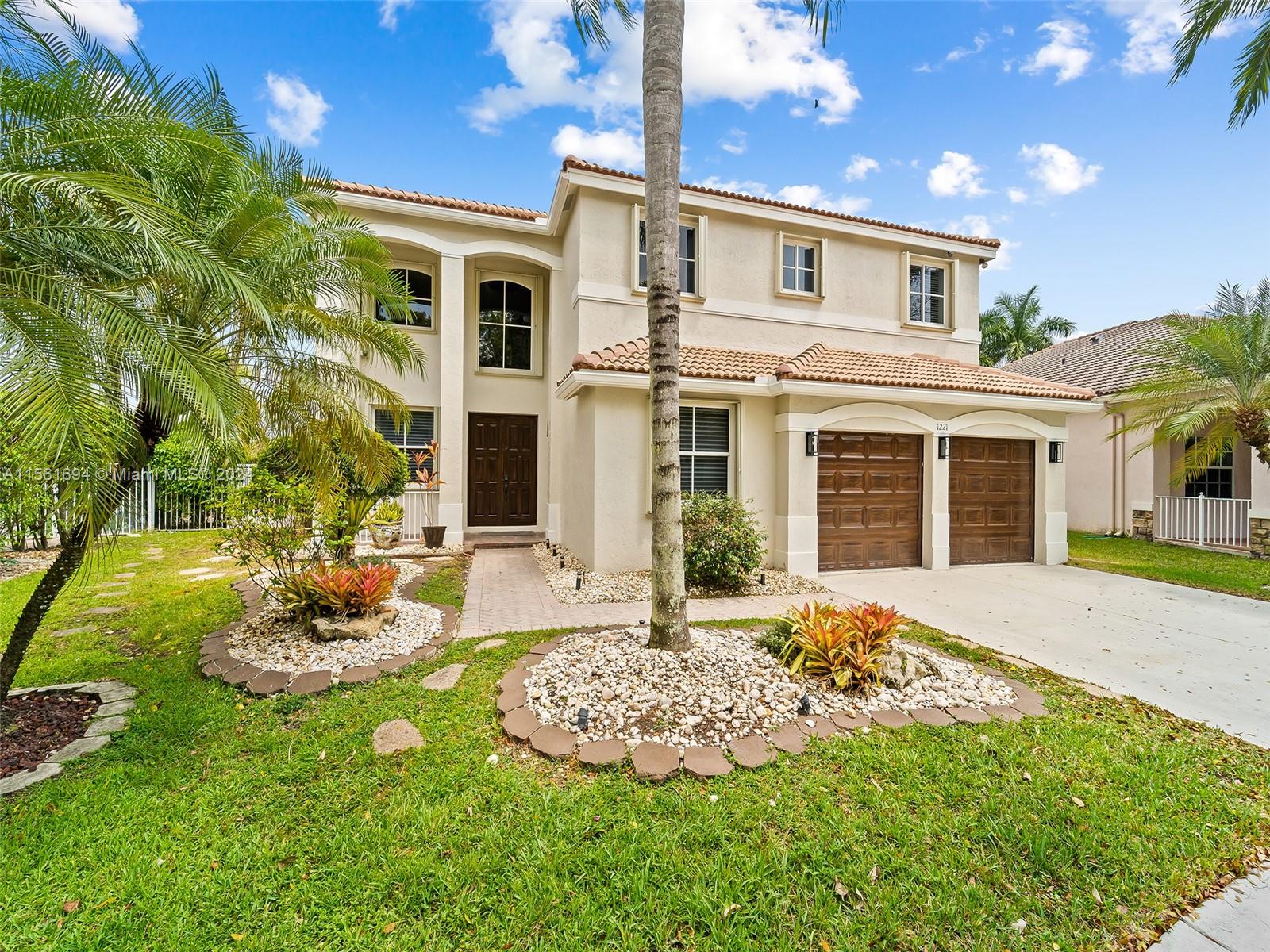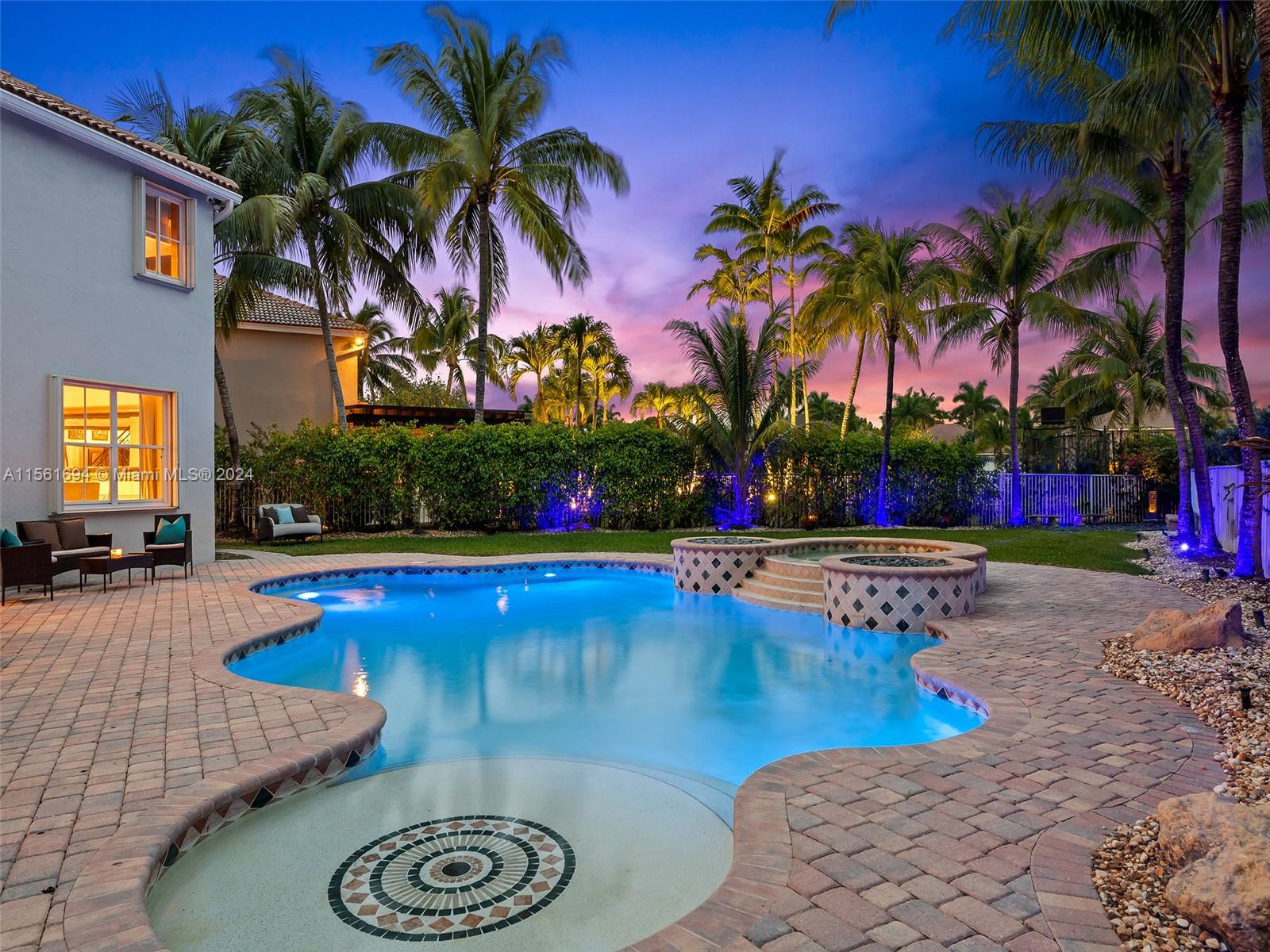 Welcome to 1221 Chenille Circle, a truly magnificent residence exuding elegance and luxury. This stunning home features 6 bedrooms, 3 bathrooms, plus an office/lounge, and two-car garage. Nestled on a gorgeous pie-shaped lot with a resort-style pool, cascading spa, lushy landscape, and lake views. This home offers a perfect blend of elegance and comfort. Features include motorized Hunter Douglas blinds on the first floor, handcrafted drapery, 2-newer AC's (2021), HIK cameras, custom built-in dry bar, and stunning chandeliers that illuminate each room. The freshly painted exterior enhances the curb appeal, making a striking first impression. Experience the epitome of refined living in this exquisite Weston abode. Located in the highly desirable community The Grove III at Savanna.