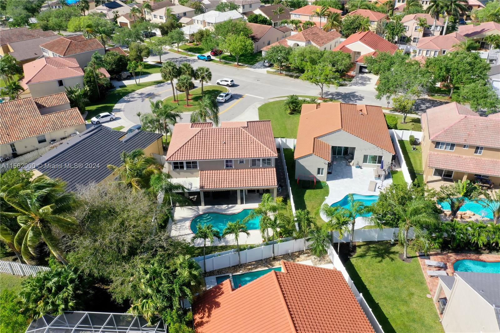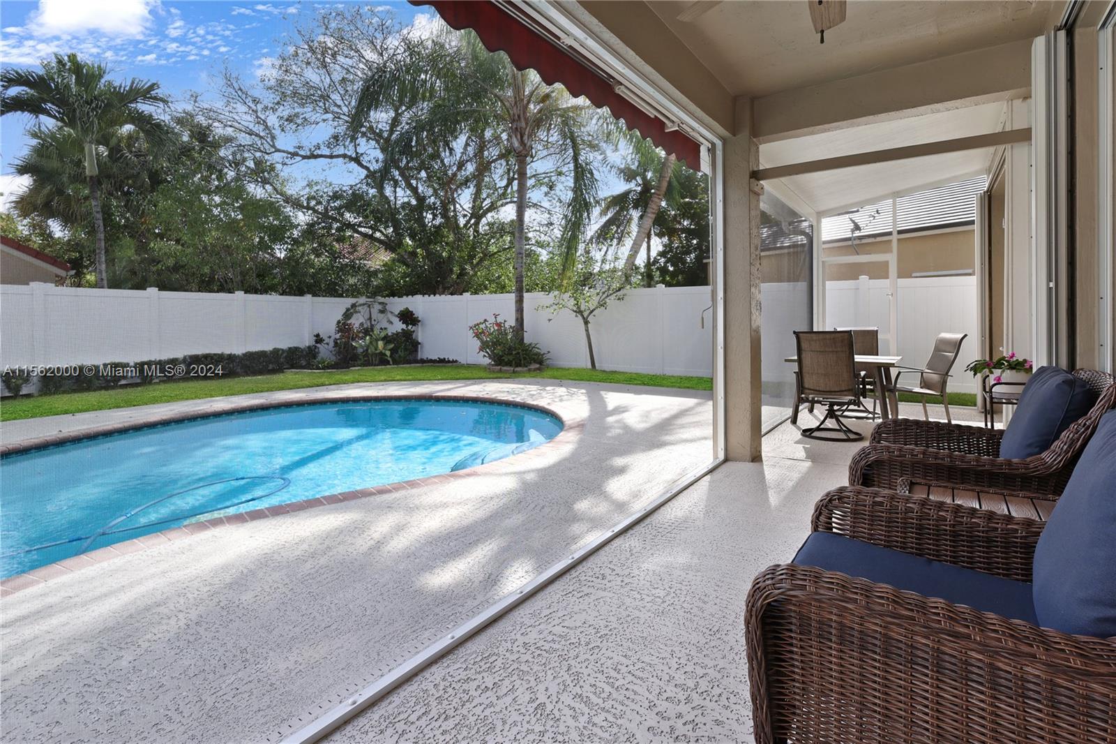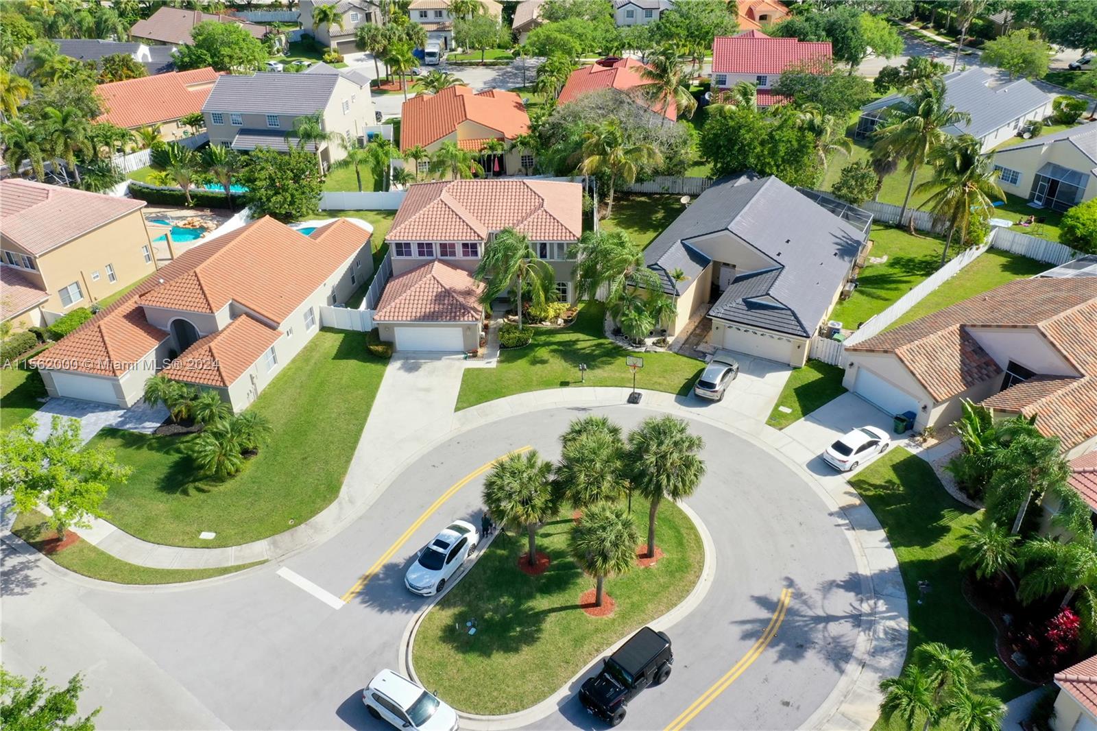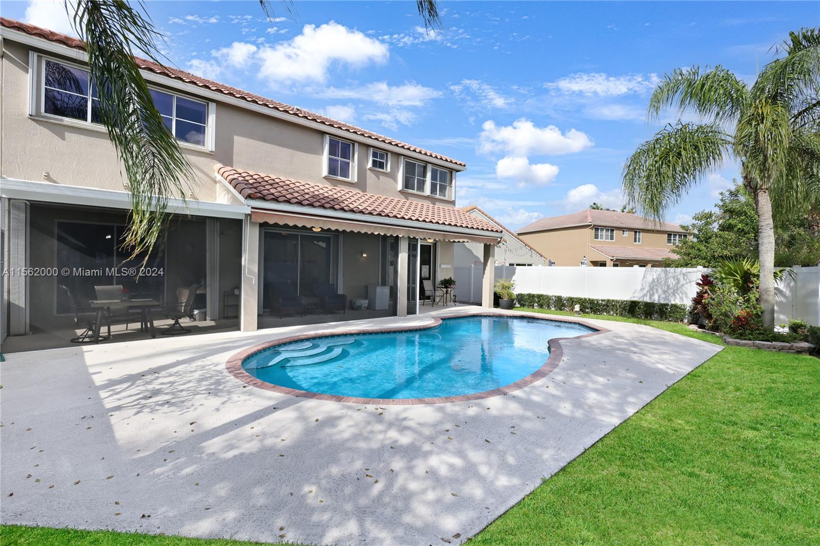 Beautiful Family Home on a cul-de-sac in prestigious North Lakes, Weston! Immaculate ideal layout for a large family with A+ Schools. 4 Bedrooms plus Den and 3 full Baths. Boasting 2-car garage, stunning tiled floors & hardwood upstairs, Kitchen is a chef's delight with SS appliances, spacious countertops, pull-out pantry drawers & breakfast nook. High vaulted ceilings in living area and formal dining room. The private backyard features a saltwater pool, new pump, screened porch, new fence & retractable awning. Additional highlights include plantation shutters, high-hat lighting, separate laundry room & accordion hurricane shutters. This home promises luxury, peace of mind & comfort. Conveniently located near Bonaventure, Weston Town Center Shops, Restaurants, Parks & access to highways.