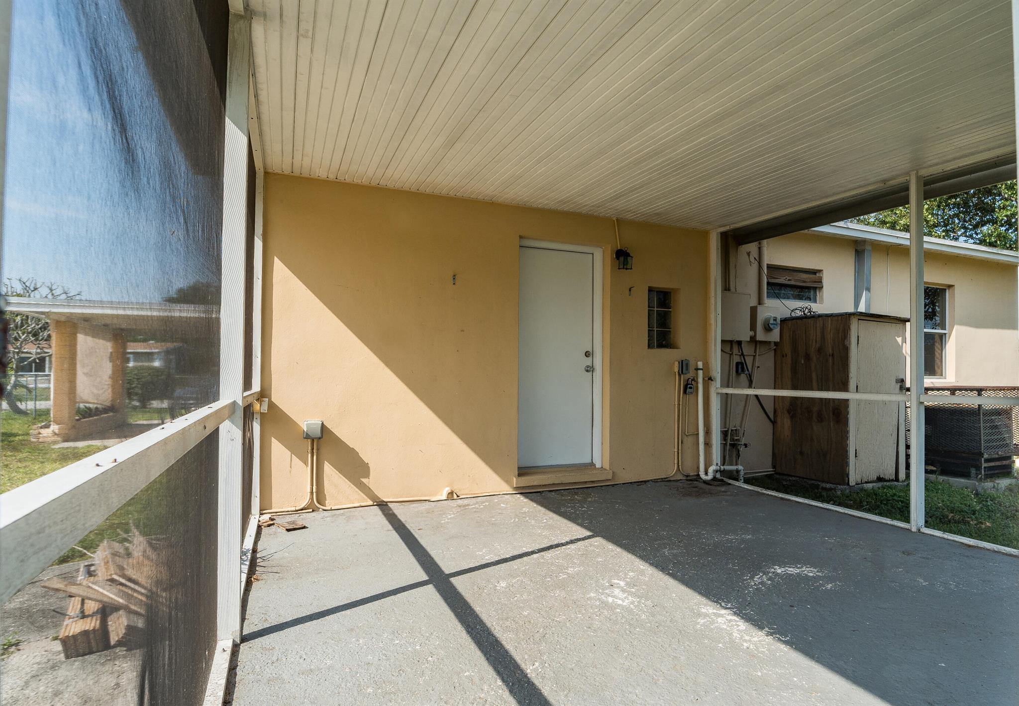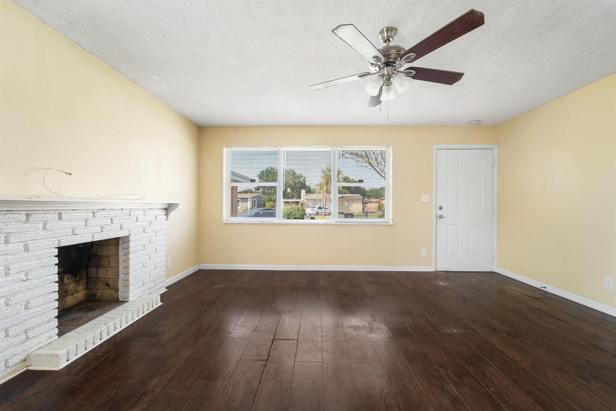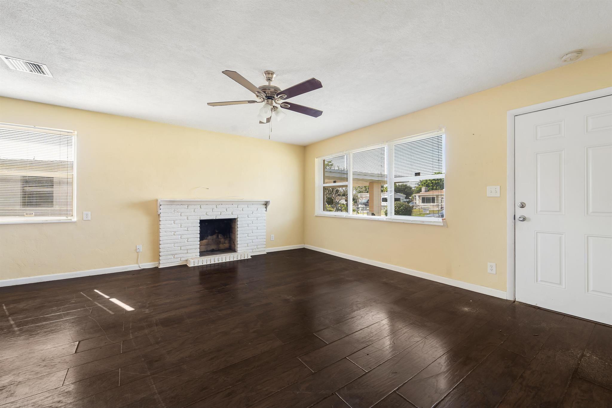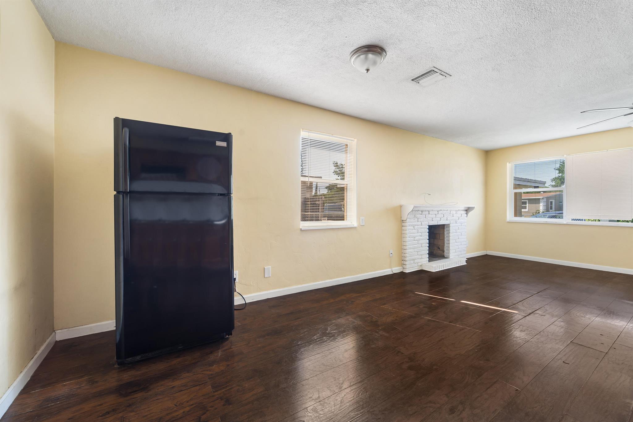 Welcome to this charming 2-bedroom, 1-bathroom home nestled on a quiet street awaiting a new owner. As you step inside, you are greeted by a spacious living room adorned with laminate flooring, creating a warm and inviting atmosphere. The focal point of the room is a real wood-burning fireplace, perfect for those chilly evenings. The home has an open floor plan with an adjacent kitchen/dining concept. Stacked 2 bedroom floor plan with a shared bathroom. Venture outside and discover a lovely covered screened-in patio, ideal for al fresco dining. Beyond the patio lies a spacious backyard, offering plenty of room for outdoor activities and the potential to add your own personal touch, whether it be a lush garden oasis or your very own private pool retreat. With no carpet throughout the home,