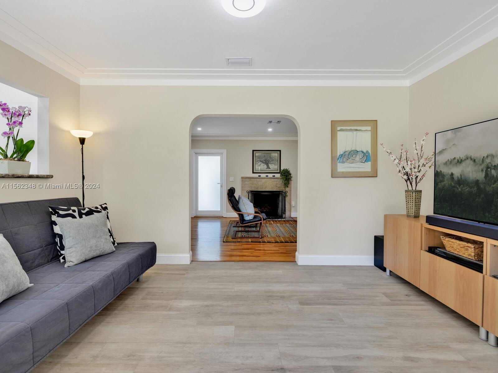 Welcome to Casa Maya! Serenity and timeless comfort await you in this spacious two-bedroom home that lives large on a grand 9,600 SF lot. Enter into bright, light, open-flow living, dining, updated designer kitchen, and media sunroom opening to a massive entertainment patio and lushly private yard, mango tree, and gorgeous blooming ylang ylang trees. Great features: Art Deco wood-burning fireplace; tray ceilings; hardwood floors; impact windows-doors; spacious bedrooms with custom closets; stainless steel kitchen appliances; modern bath; updated electric-plumbing; new water heater; laundry room; one-car garage; Chicago brick driveway; and room for a pool, expansion, or new build—all super clean and meticulously maintained, just a block and a half to Downtown Miami Shores dining and shops.