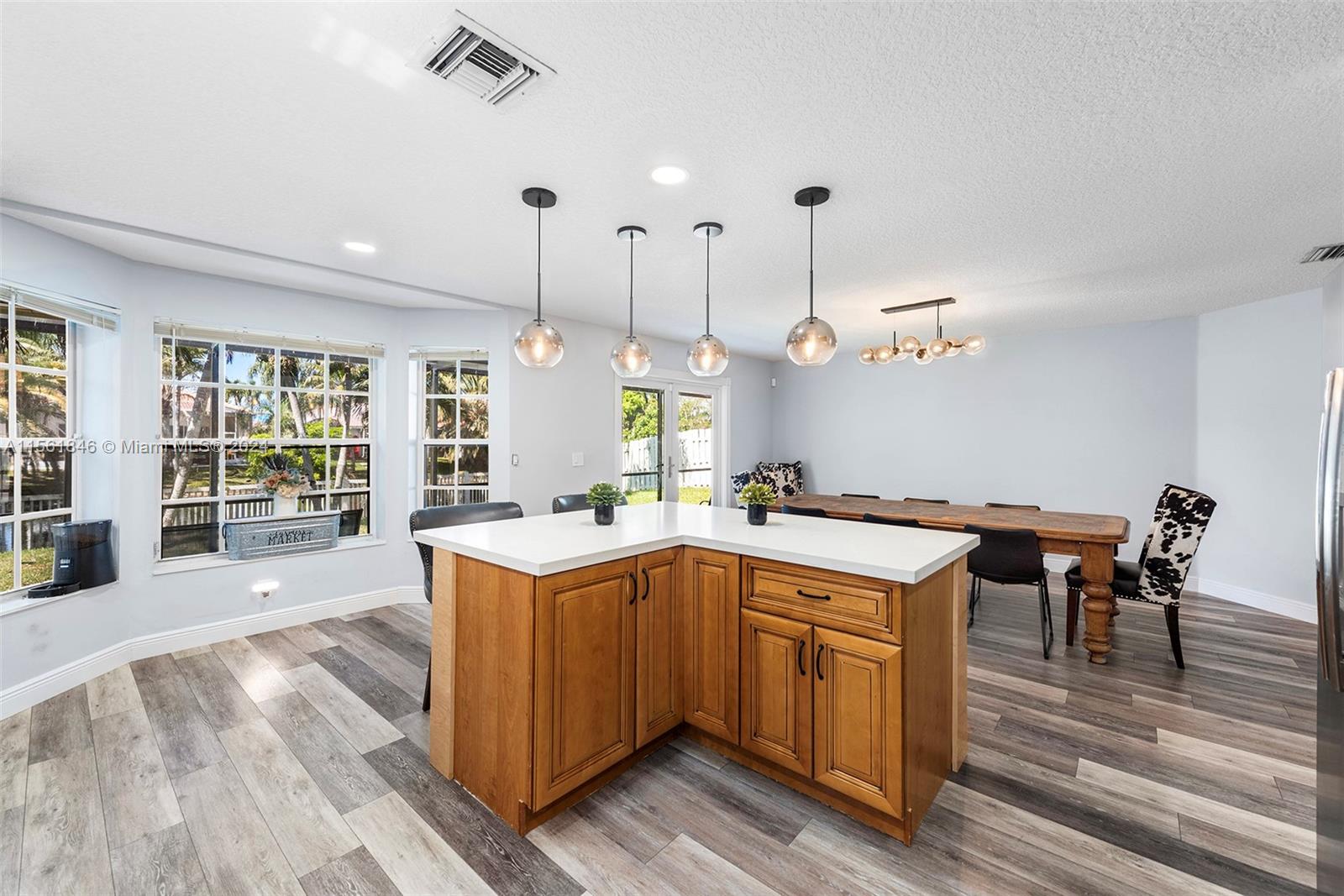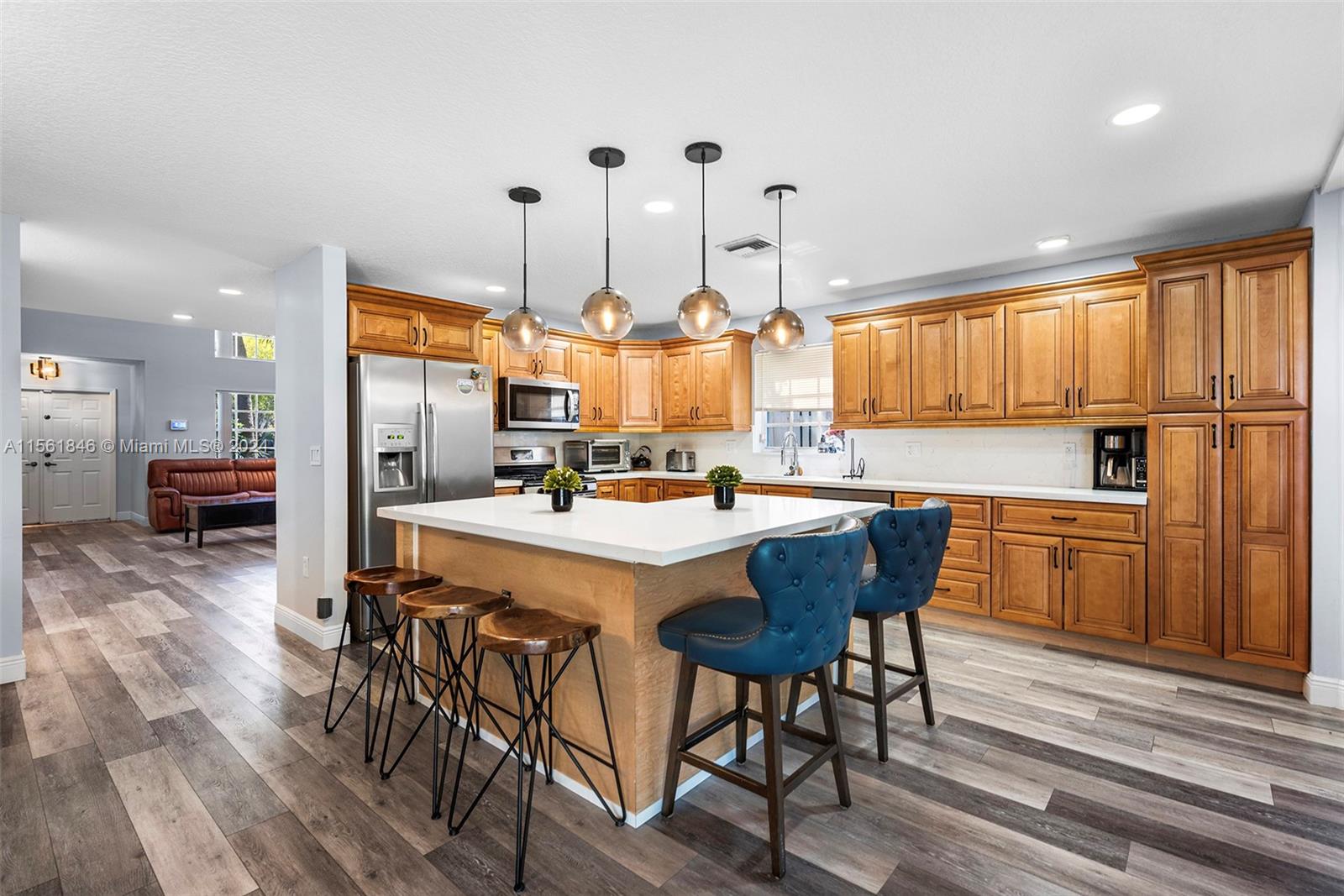 Discover a well-maintained 4-bed, 2.5-bath, 2,334 sq ft lakefront home, showcasing upgrades that reflect true pride of ownership. The spacious 2-story foyer and living room offer sophistication, while the remodeled kitchen features exquisite cabinetry and quartz counter tops, overlooking a manicured backyard and serene lake. Enjoy an added screened patio for outdoor entertaining. The primary bedroom on the main floor offers lake views, double walk-in closets, and an ensuite bath. Upstairs, find three bedrooms and a versatile loft. Equipped with hurricane protection and a 2-year-old AC unit for peace of mind. The fenced backyard includes a fire pit with stunning water views. Close to Sawgrass Mills, dining, shopping, and easy access to Fort Lauderdale and Miami.