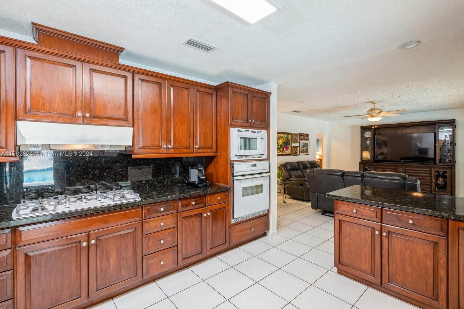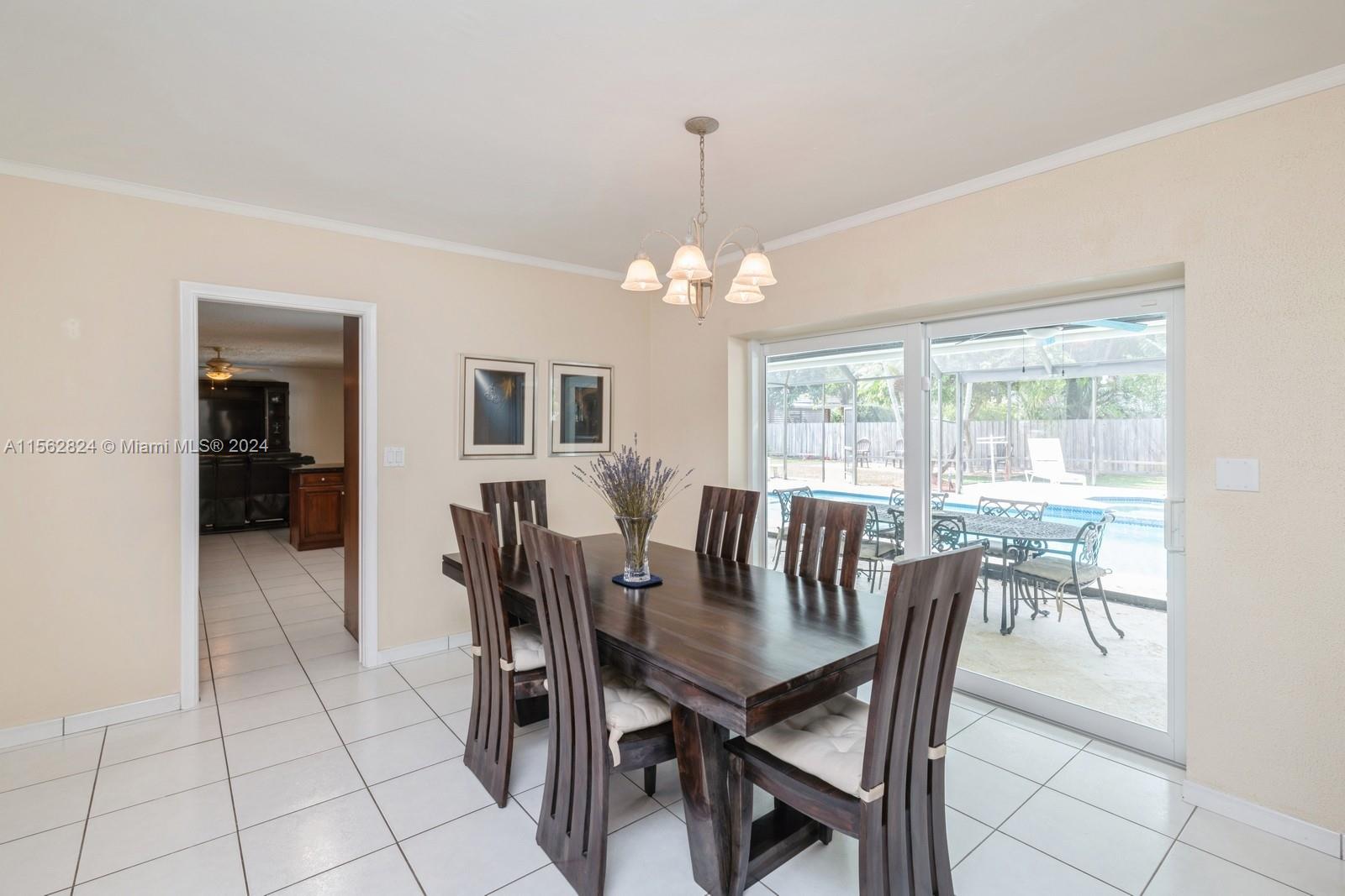 Impeccably maintained 1-story home w/ 3,600+ adj. sf of interiors flooded w/natural light. Welcoming foyer leads to light & bright living room w/ fireplace, adjacent dining room w/ glass doors overlook expansive covered terrace, sparkling pool & charming Tiki hut. Family room+ adjacent kitchen offers intimate setting for family living. Versatile split floor plan (primary + 2b/1b + 2b/1b). Spacious primary suite w/walk-in closet, bath w/tub & shower & 2 vanities. 2 beds/1b work ideally as a “junior suite”. Impact windows + shutters, tiled floors, laundry & 2-car garage. Lushly landscaped 18,759 sf lot walled/ fenced w/ gated circular driveway. Bring your choosiest buyers!