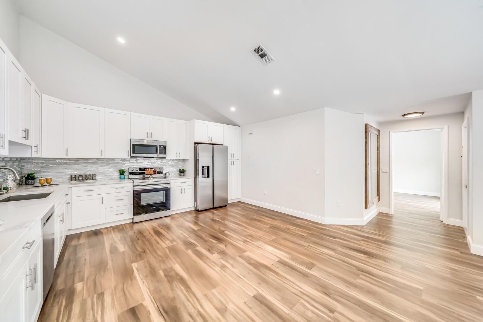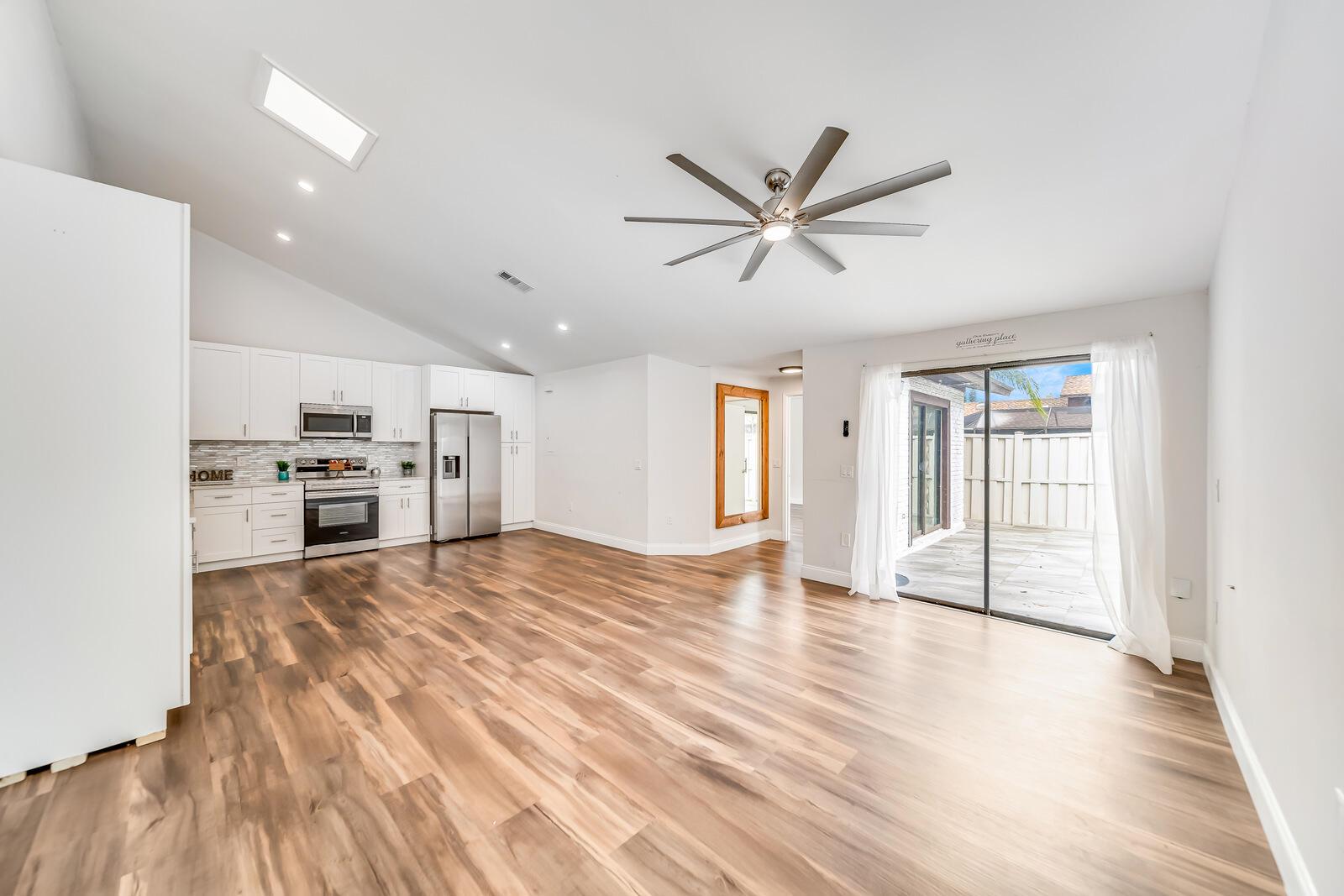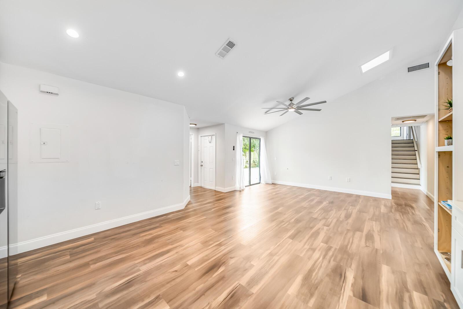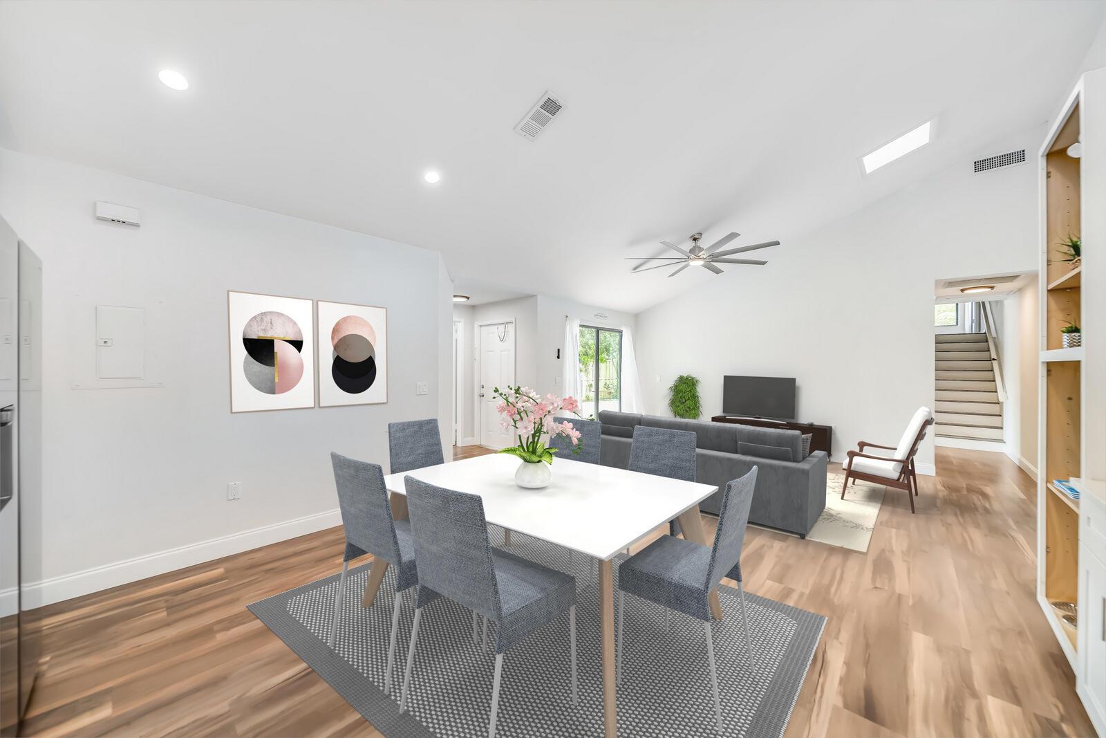Totally updated, open and bright with soaring vaulted ceilings this townhome features three bedrooms, three-and-a-half-bathrooms, a one-car garage, attached driveway, an assigned parking spot, and guest parking. Private fenced in 800 square feet expansive courtyard entry with tile flooring is perfect for relaxation and entertaining! Luxury vinyl flooring throughout. Gourmet kitchen features newer modern updates including quartz counter tops, glass tile backsplash, stainless appliances, white shaker wood cabinetry, a huge stainless farmhouse sink and more! All bedrooms have there own En Suite bathrooms & all 4 bathrooms are updated. Guest/Cabana bath is convenient for swimmers.