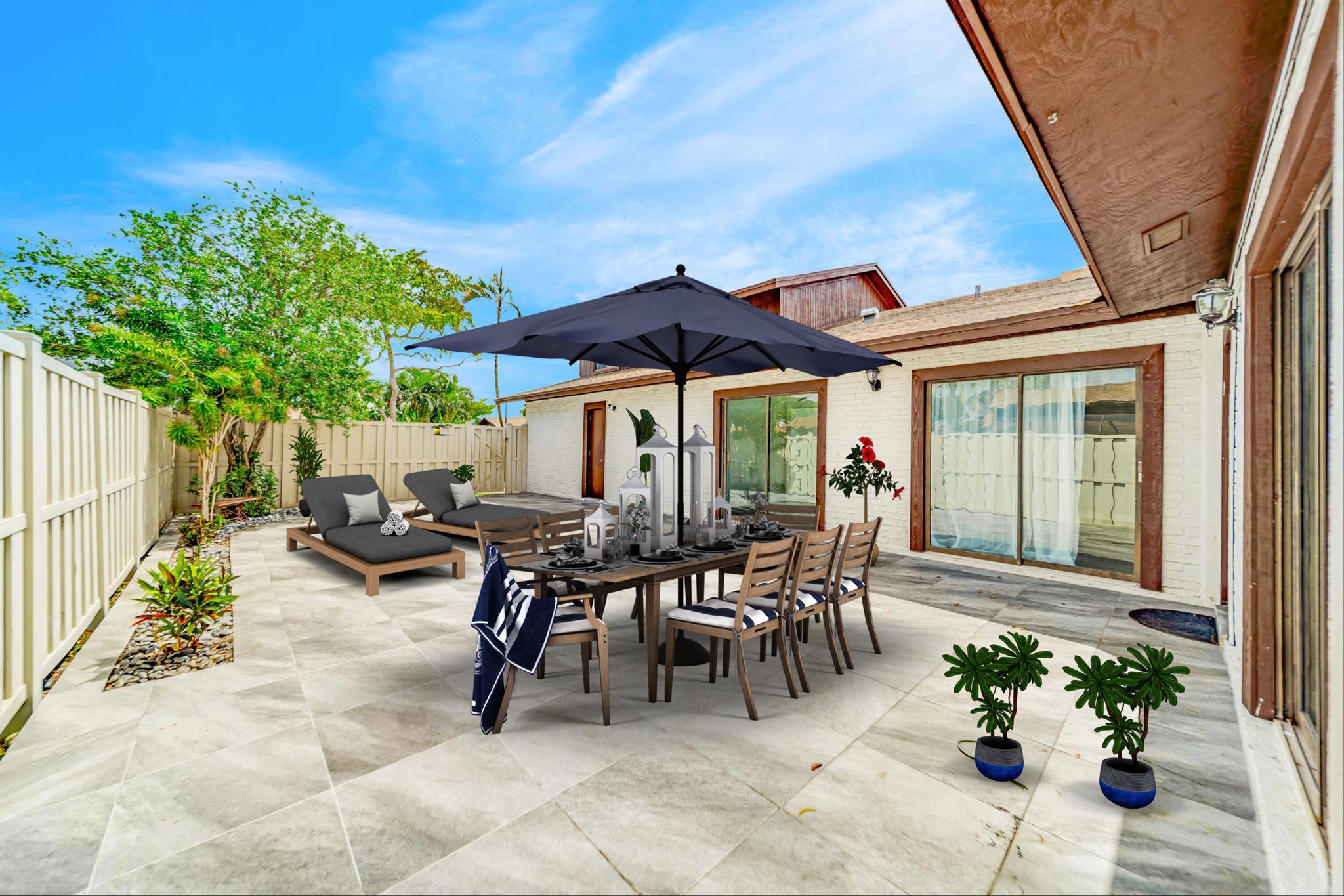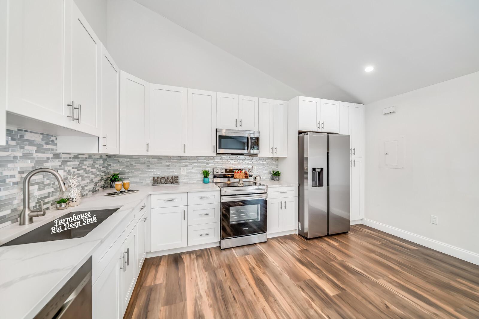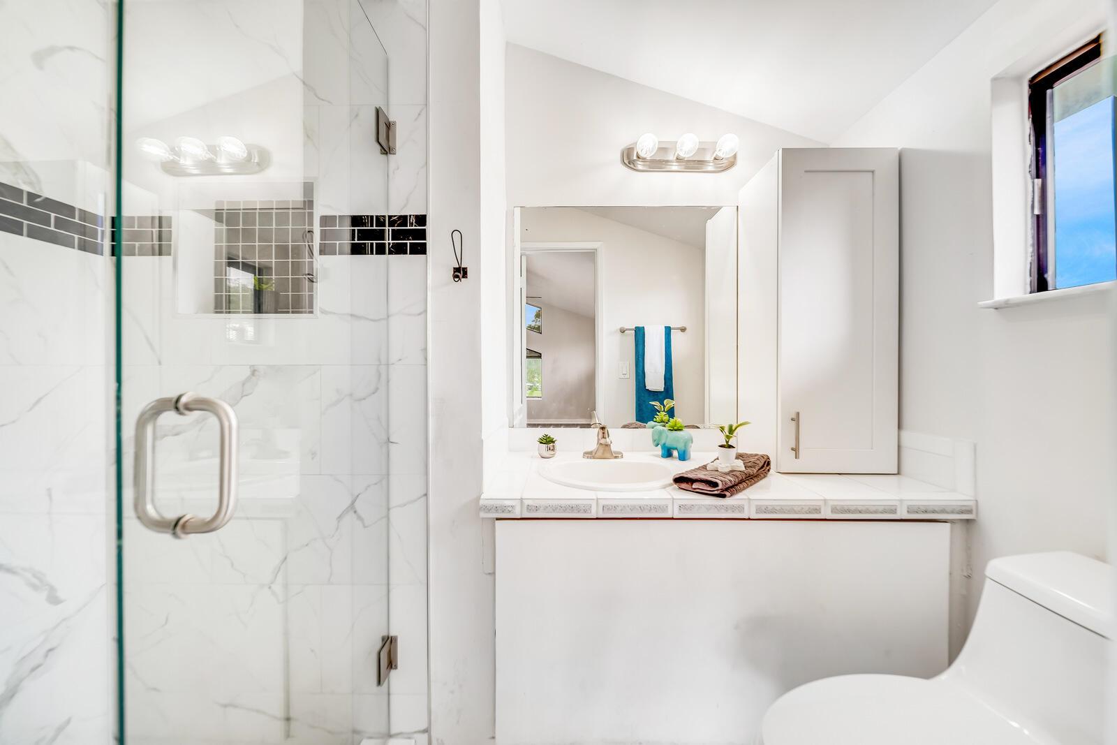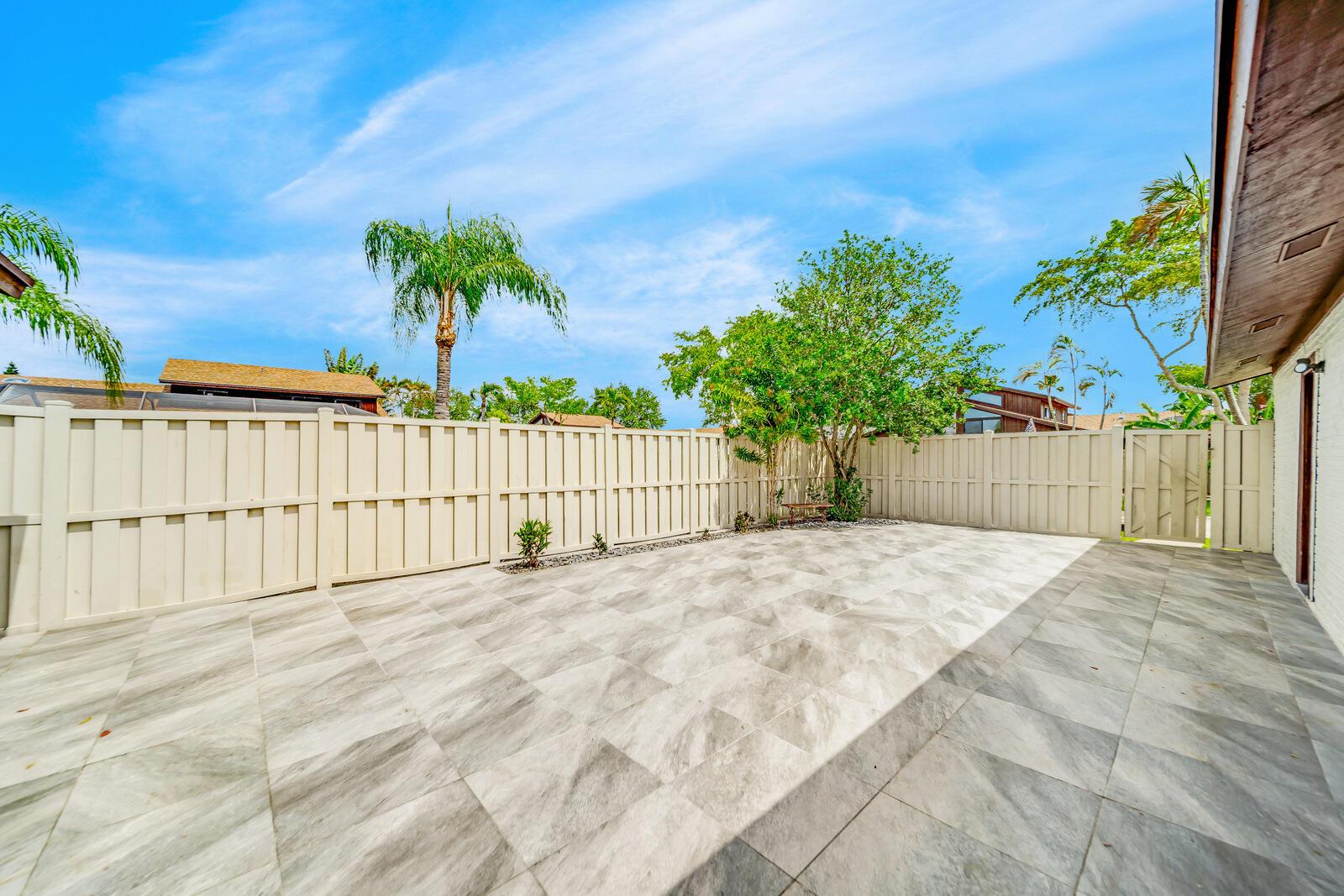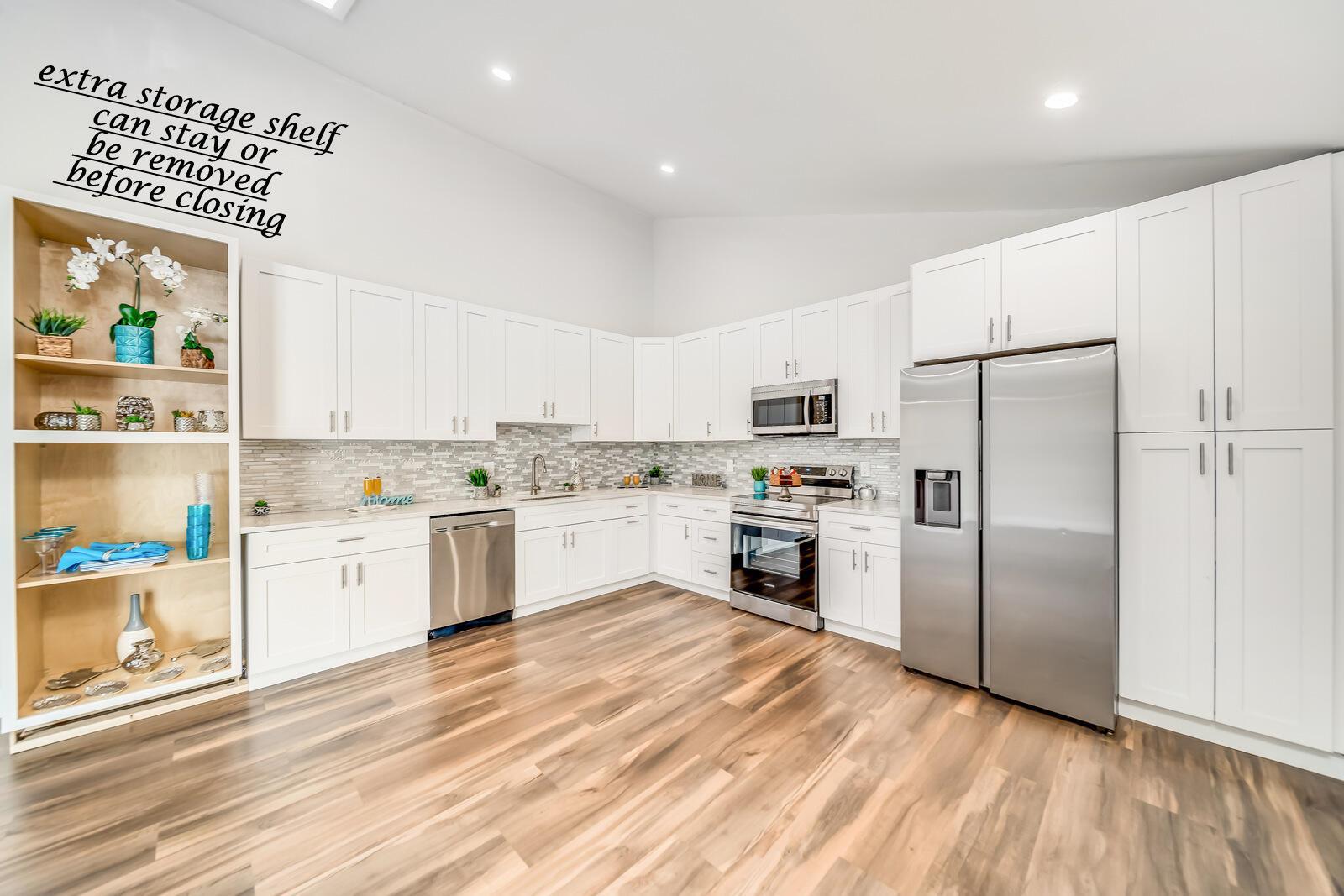 Totally updated, open and bright with soaring vaulted ceilings this townhome features three bedrooms, three-and-a-half-bathrooms, a one-car garage, attached driveway, an assigned parking spot, and guest parking. Private fenced in 800 square feet expansive courtyard entry with tile flooring is perfect for relaxation and entertaining! Luxury vinyl flooring throughout. Gourmet kitchen features newer modern updates including quartz counter tops, glass tile backsplash, stainless appliances, white shaker wood cabinetry, a huge stainless farmhouse sink and more! All bedrooms have there own En Suite bathrooms & all 4 bathrooms are updated. Guest/Cabana bath is convenient for swimmers.