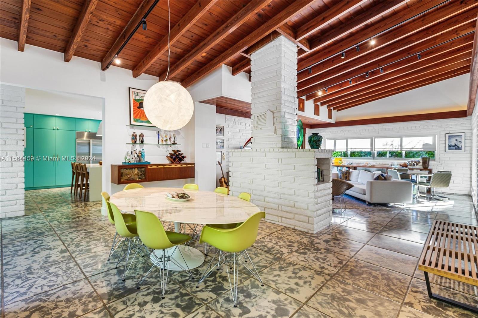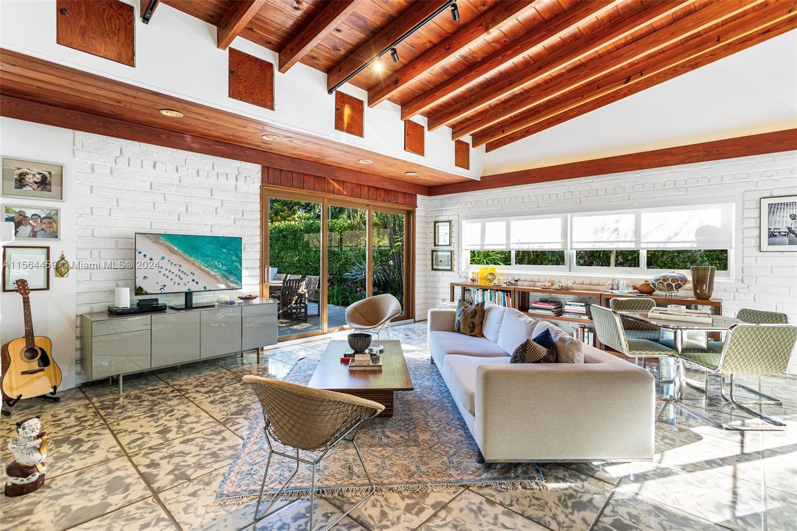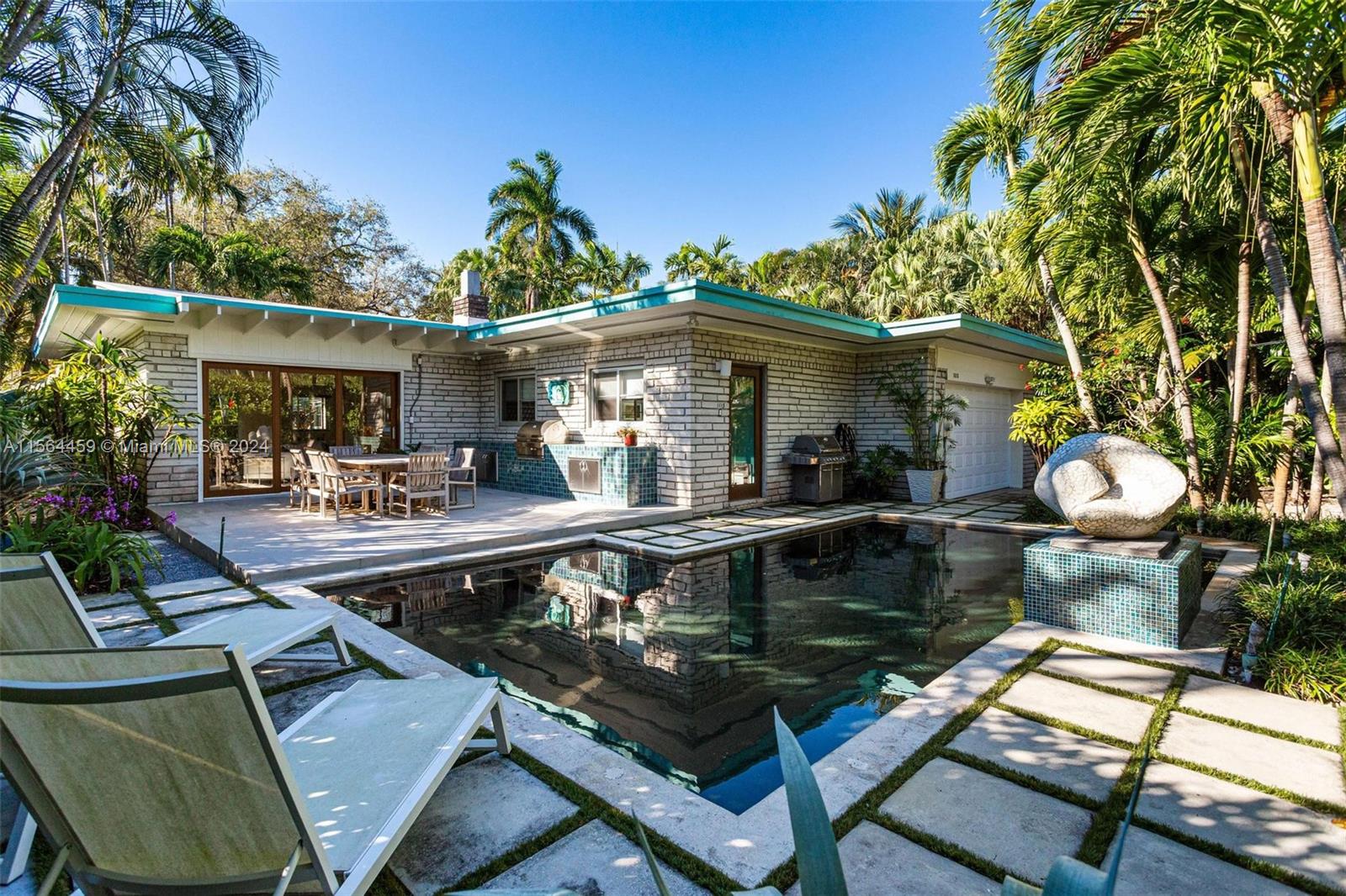 Mid-century gem by Florida tropical modern architect Alfred Browning Parker. A truly special house in Eastern Miami Shores, one block from the bay. Built in 1949, the house features original Cuban tile, cathedral ceilings, soffits, cove lighting, and concrete brick walls. Light filled with garden paradise views. 3 good sized bedrooms, 2 bathrooms. Primary is en suite. The eat-in kitchen features a large island, wood cabinets, and stainless steel appliances including a large sub zero. Outdoor kitchen, patio, and zen pool give a resort feel. Large 2 car garage with storage, laundry, and AC. Impact windows and doors, newer roof and AC units, outdoor lights and sprinklers. Front and rear 2 car driveways and gated backyard. This historically designated design-lover’s dream won't last!