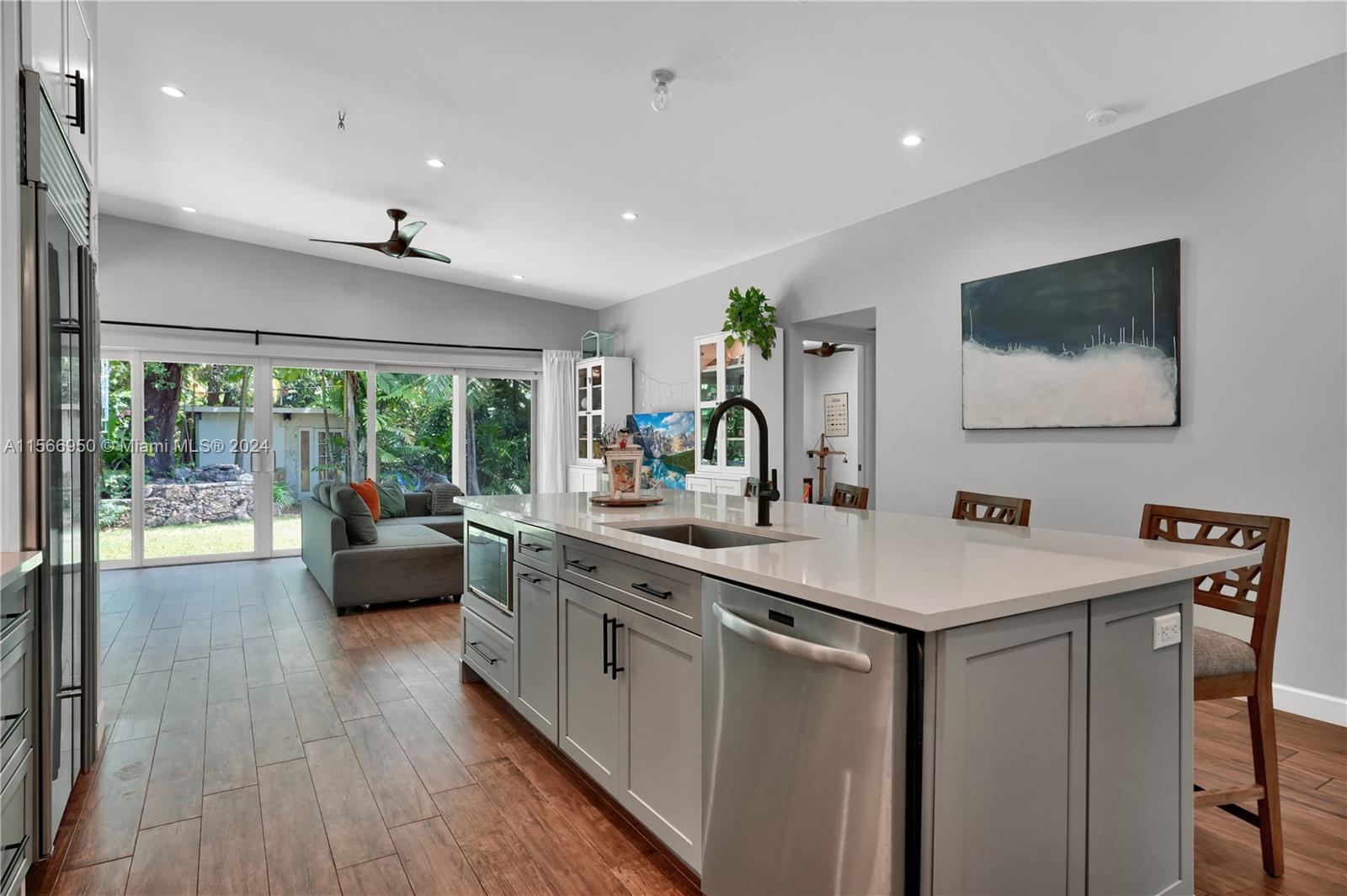 Newly reconstructed three bedroom two bath home in the heart of South Miami. Fully reconstructed in 2018, this home features a large open floorplan with a huge modern kitchen equipped with soft close drawers and pull outs, lazy susan storage organizers, Sub Zero refrigerator, large single piece kitchen island with oversized farm sink, additional storage, and electric. The bathrooms both feature double sinks and subway tile and the floors are wood-look porcelain tile. Floor to ceiling hurricane impact windows, in the main living room doors slide fully to create the perfect environment for seasonal living. Large lot adorned with various coral rock features: arches, walk-way, walls, and more. Centrally located on a very low traffic residential street. Roof 2018 strapped.