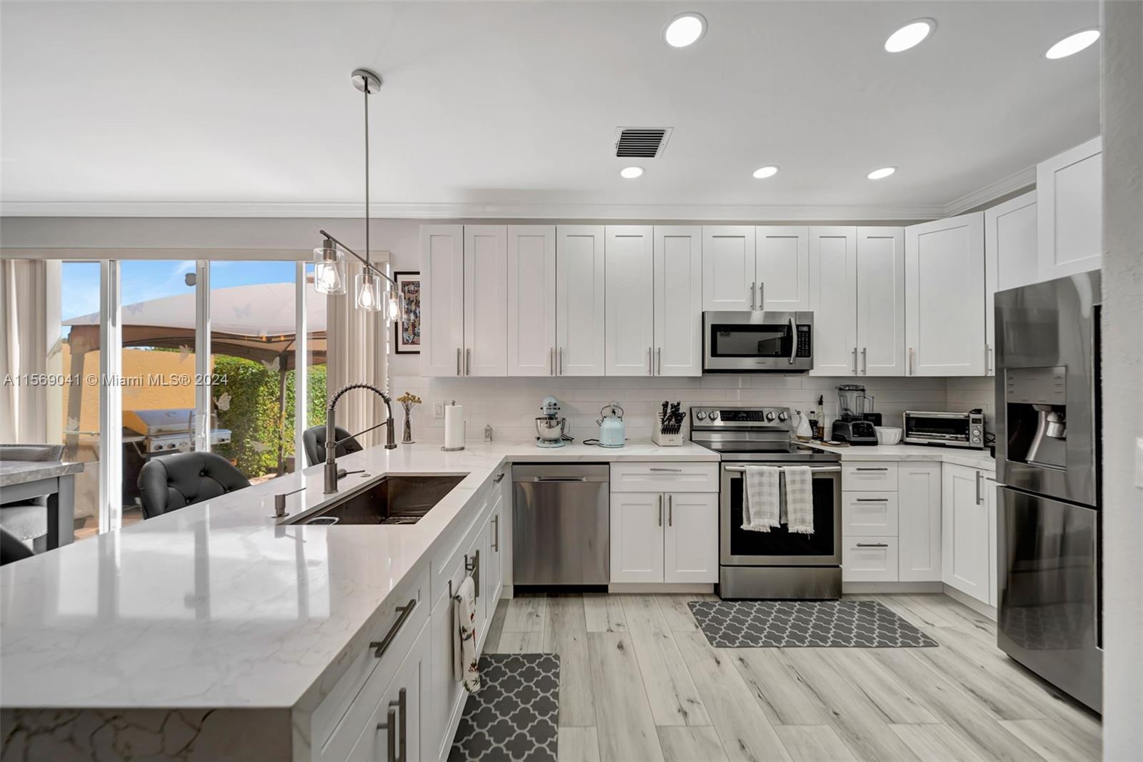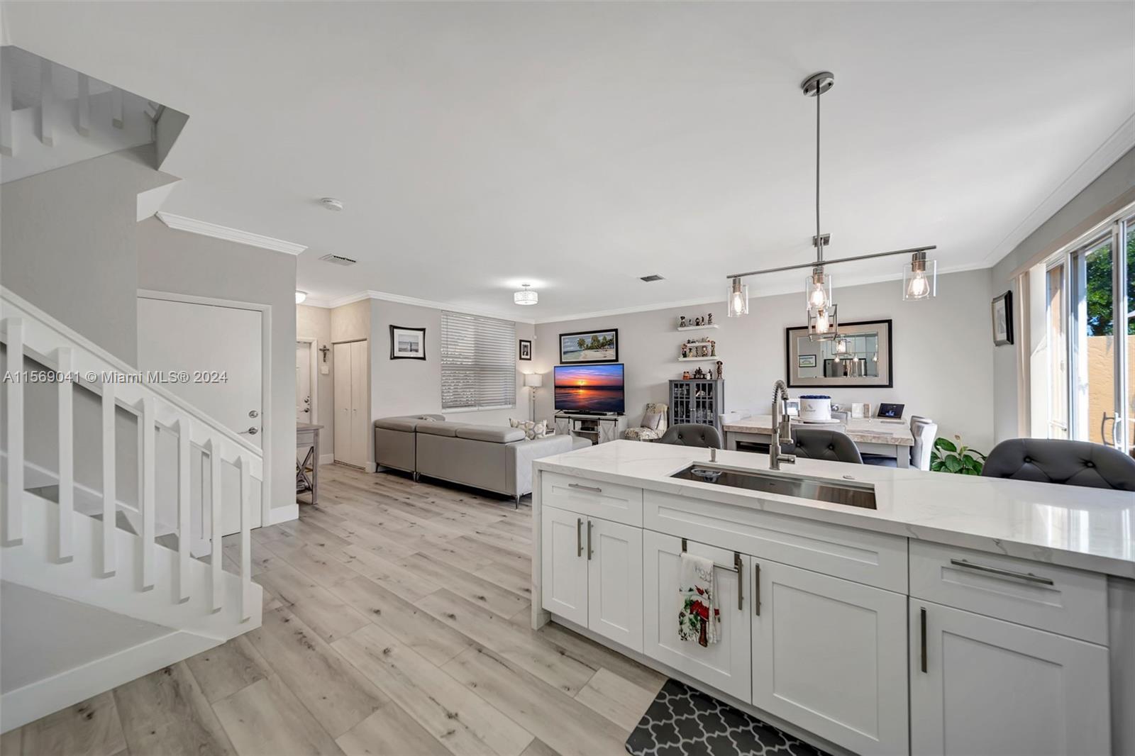 Welcome to this stunning home which features an open floor plan with a modern kitchen, sleek appliances, custom cabinetry, marble countertops and breakfast bar. The Living Room and Dining area boasts plenty of natural light which makes this an inviting space for relaxation and gatherings. This home exudes elegance and charm with every detail: crown molding, baseboards, wood laminate flooring, modern light fixtures. Relax on your patio and enjoy the serene surroundings and waterfront views. Park Crossing installed new roofs in 2023. Towngate offers many recreational options with community pools, tot lots & picnic areas. The city park has tennis courts, basketball courts, a soccer field, a baseball field, and pool. Silver Palms Elementary school is conveniently located within the community.
