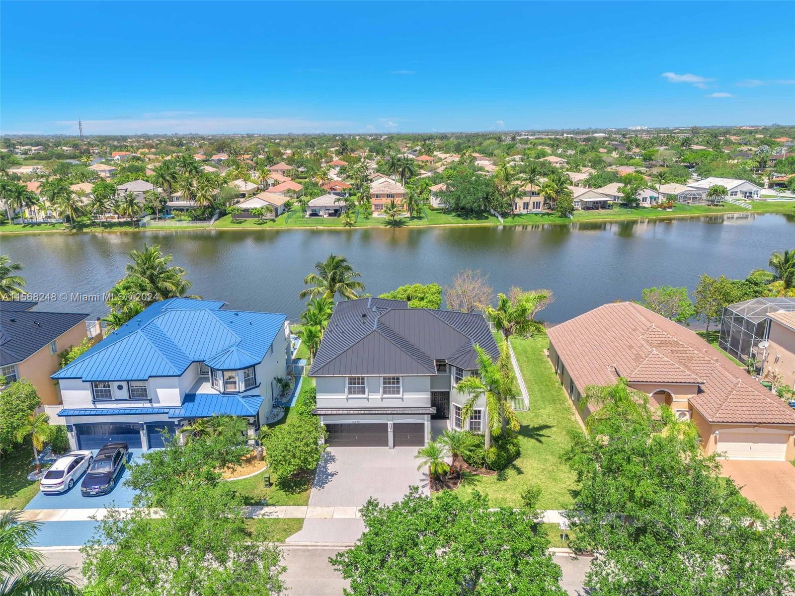 Welcome to your lakefront home. Your home has a brand-new metal roof installed in Jan of 2024! Entertain family and friends in your spacious gathering areas and impress with the soaring 19' living room ceiling. Enjoy relaxing views from the balcony off the primary bedroom and/or under the screened in patio. Snack on your own fruit with established banana, mango, and avocado trees in the oversized backyard with plenty of room for a pool. Additional features include full accordion shutters, 1-full bed/bath downstairs, oversized bedrooms, 2-zone AC units, brick paver driveway and patio, and laundry room with sink. Pembroke Shores is a private gated community located near I-75, parks, golf, restaurants, shopping, and schools.
