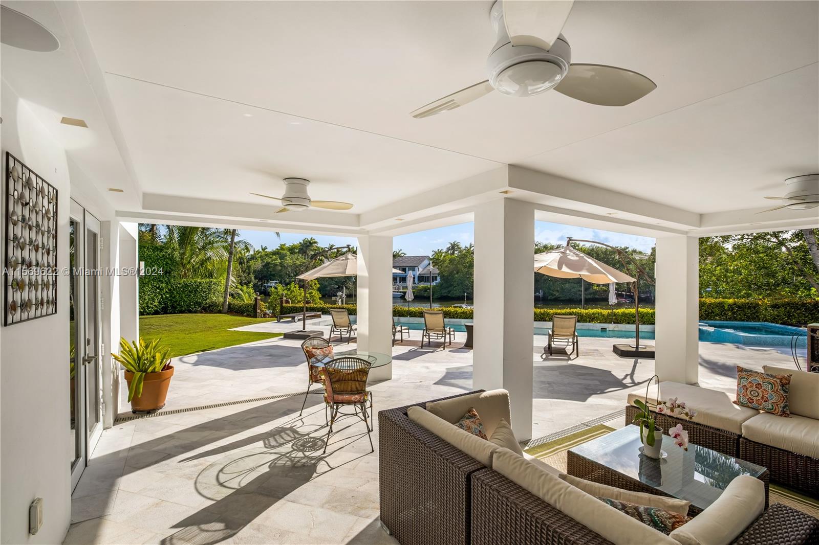 Islands of Cocoplum fully gutted, re-designed by Pacheco Arch, re-built/expanded in 2017, oversized 20k+ lot, 119 ft WF on Lago Maggiore’s expansive views. Main level lofty ceilings, open water view features living rm, Mia Cucina Kit, family rm w/wrap around terrace. Formal dining rm. Bedrm wing incl 2 jr suites & main suite w/sitting area, glass walled office & top $ view, spa bath, double California Closet, all 5-1 AV. Lower level 2/3 & laundry/utility/staff +Bonus media rm with 7.1 system, bar/lounge all open to lap pool, spa, expansive deck, fully refurbished dock. Meticulous attention to detail, materials, lighting, smart controls, security, AV & appliances, chosen w/highest & most current standards for enjoyment & entertaining. Gated motor court for 20 cars, 3 car AC garage/gym.