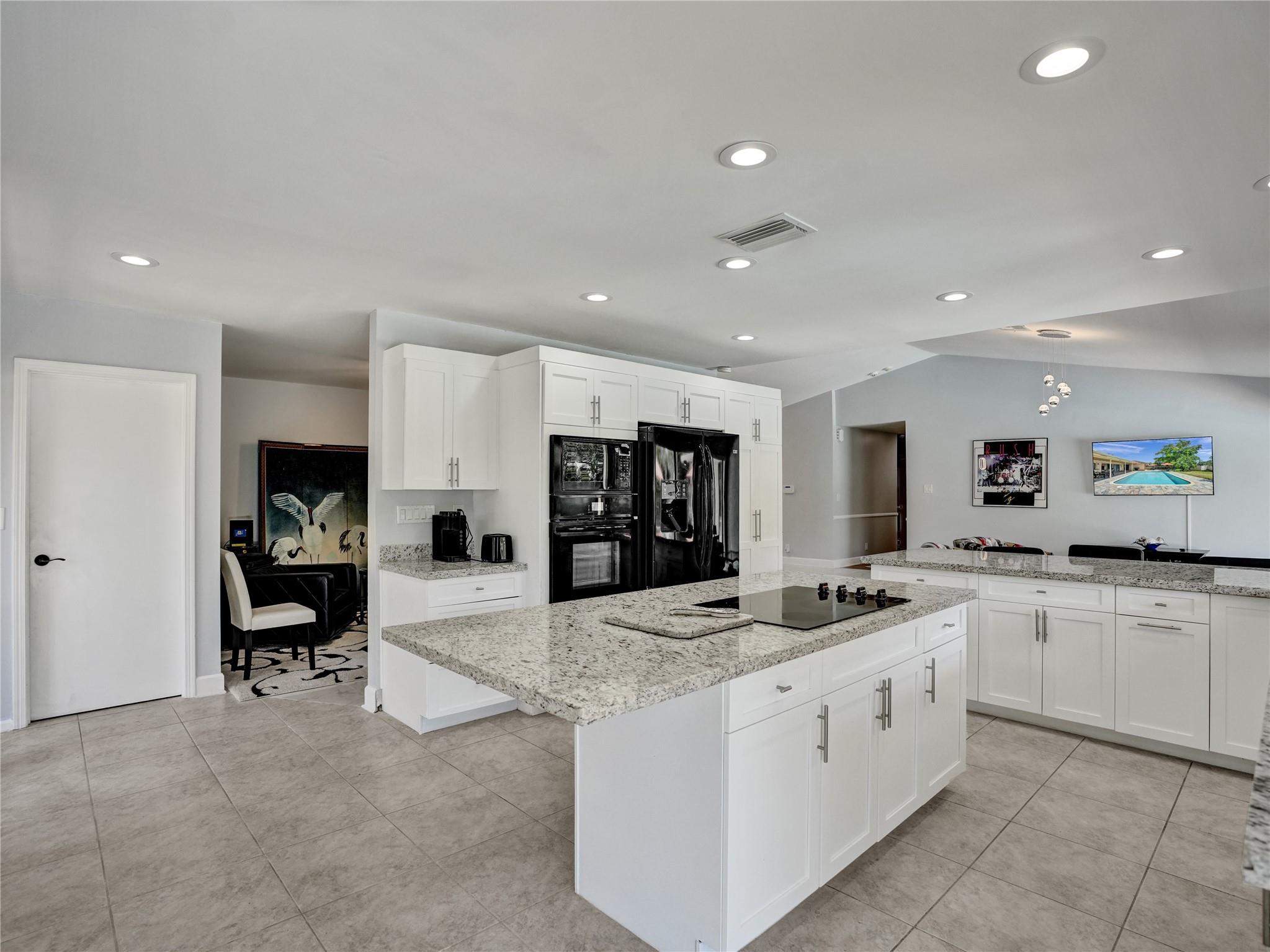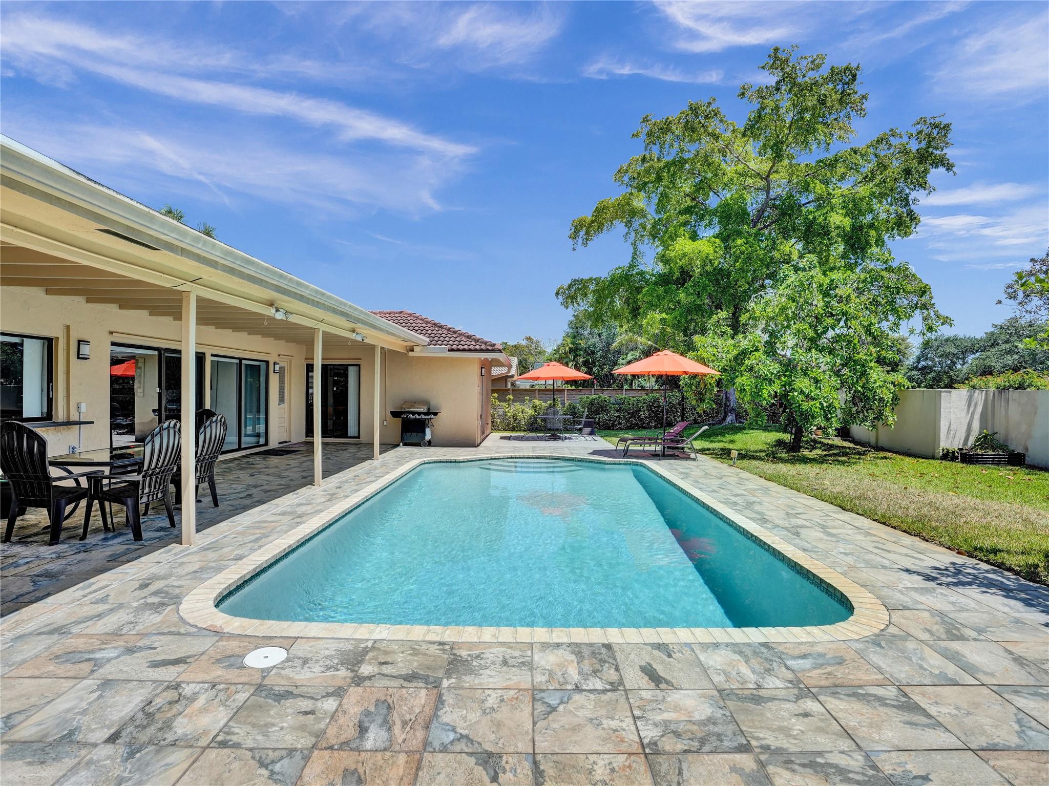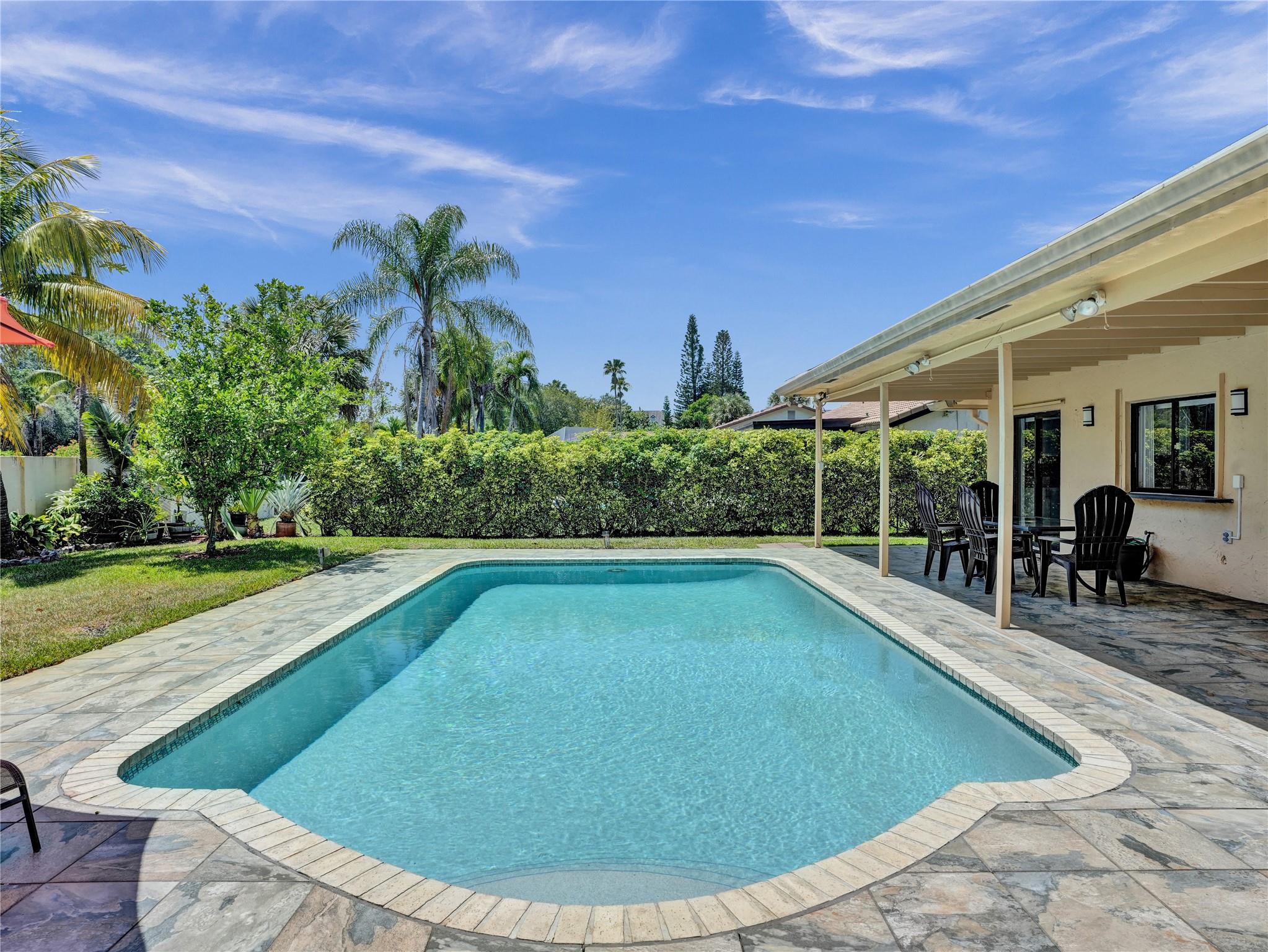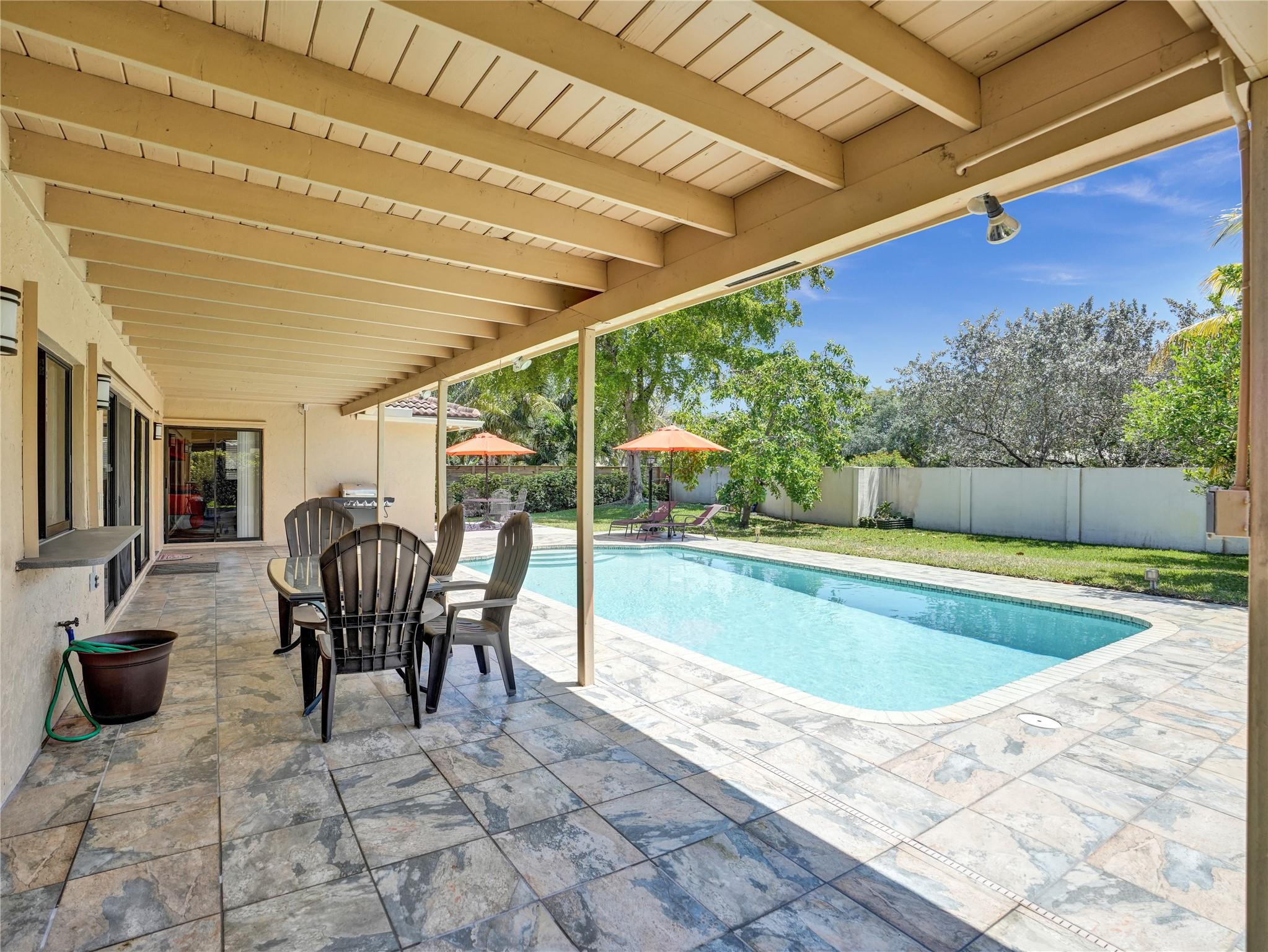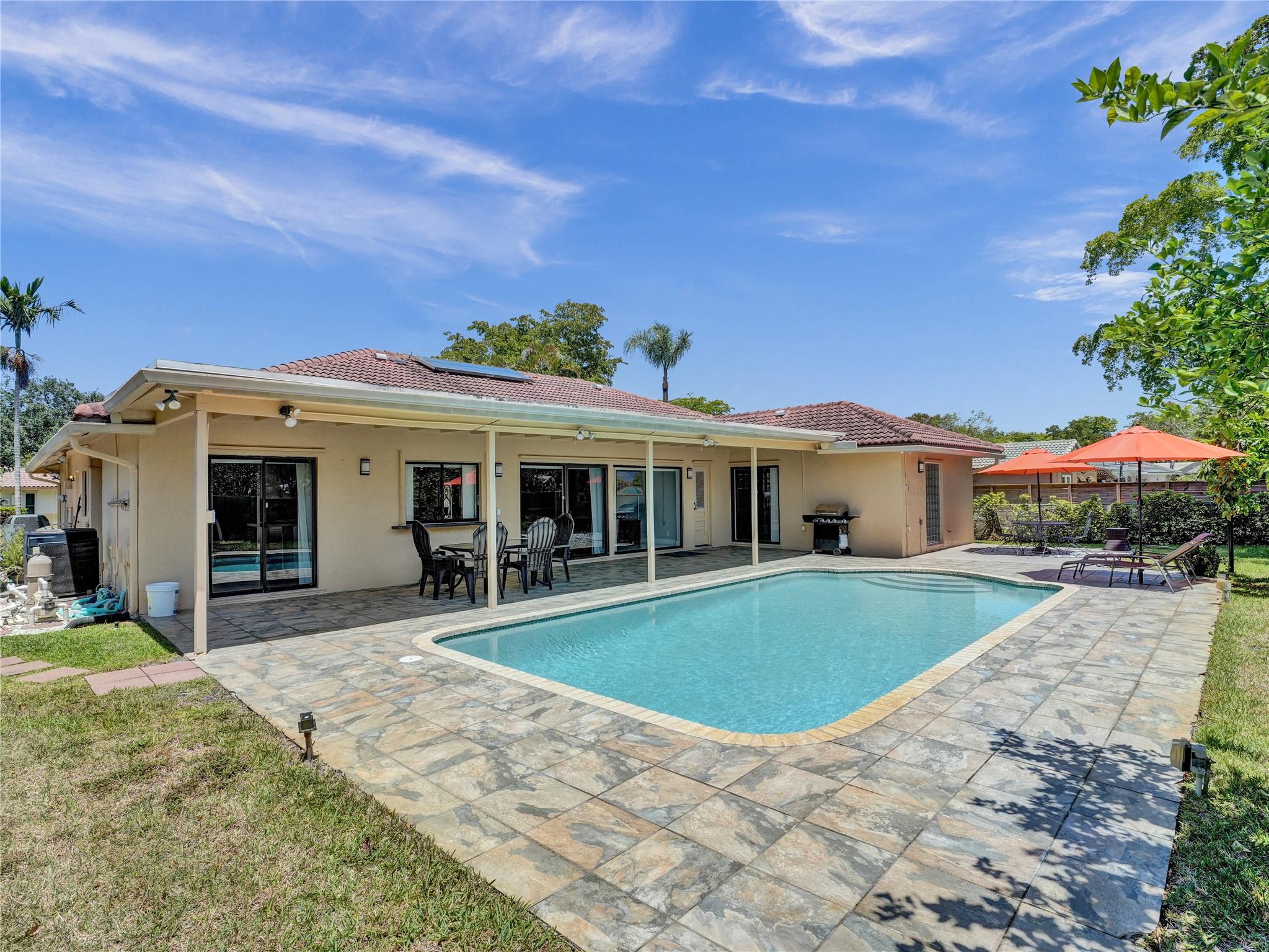 Motivated Seller has reduced the price! Beautifully updated with leveled flooring, (no step-down) updated kitchen cabinets, new countertops, new electric box wiring, replaced plumbing pipes. New exterior paint, new vanity in guest bath. Thermal fan in hallway, wired generator, solar water heater BRAND NEW A/C and refrigerator!! Come see this lovely pool home with circular driveway, hurricane rated decorative entry doors, impact windows. Sliders have panels. Vaulted ceilings. Big kitchen with tons of storage overlooks open pool and covered outdoor sitting area. Flat roof installed 2019. 3 patios make the most of outdoor living! Appliances new within the last few years -AND American Home Shield warranty free to buyer! You'll fall in love with this gorgeous, well maintained home.