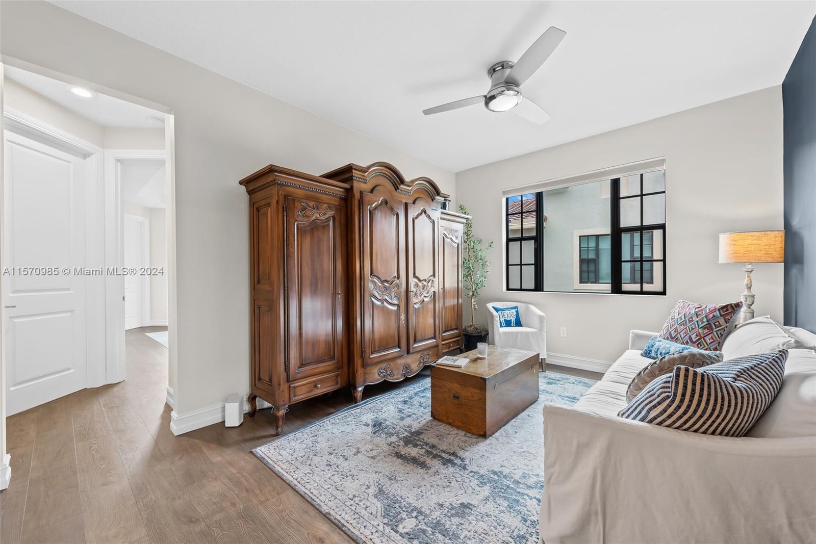 Unique opportunity. Rarely available corner unit located in the gated enclave of The Cove at Lago Mar. This townhome boasts upgrades throughout - plank flooring on the main, stairs and the second floor (no carpet), quartz kitchen countertops, KitchenAid stainless steel appliances, expanded kitchen coffee/wine bar with two wine refrigerators, transitional marble backsplash, marble and brass powder room vanity, adjustable built-in garage shelving and much, much more. This home has 3 spacious bedrooms, 2.5 bathrooms, a large 2 car garage and loft. This property includes impact windows/doors. Laundry room located on second floor. The lush backyard and patio is perfect for BBQ and quiet enjoyment with no rear neighbors! Chandeliers in dining room and breakfast nook do not convey.