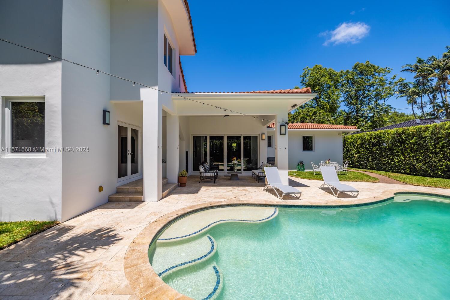 Welcome to Watersong! This magical, rare, five-bedroom secluded East Miami Shores mid-century modern pool home flows like a poem and will be music to your ears! Enter through a welcoming front porch into multiple cascading living areas with high ceilings, a designer eat-in kitchen and dining, opening through sliding doors to a grand vaulted covered terrace, lush fenced private gardens and sparkling pool and spa with soothing fountain feature—perfect for entertaining or relaxing. Great open-flow plan with five split spacious bedrooms (three are full ensuites). Fantastic features: modern designer kitchen and baths; hardwood floors; newer concrete tile roof; impact windows-doors; upgraded electrical-plumbing; and new smart-zoned AC system. All in one of The Shores’ most prestigious locations!
