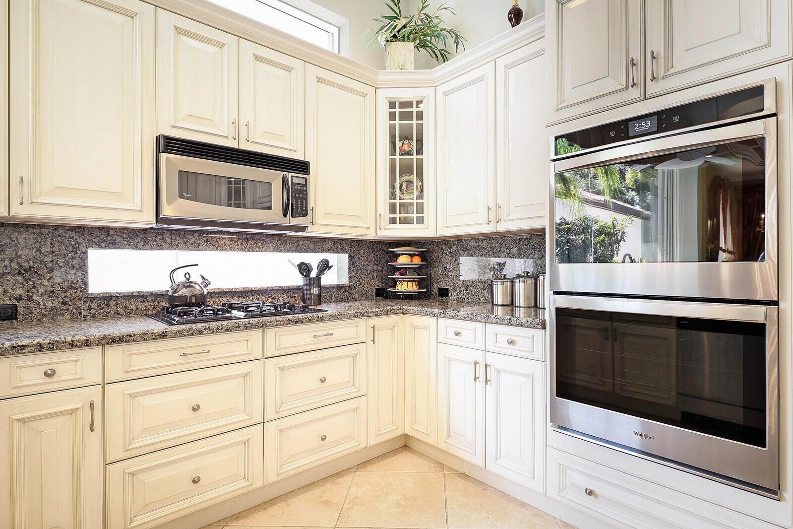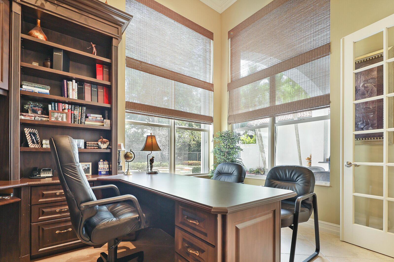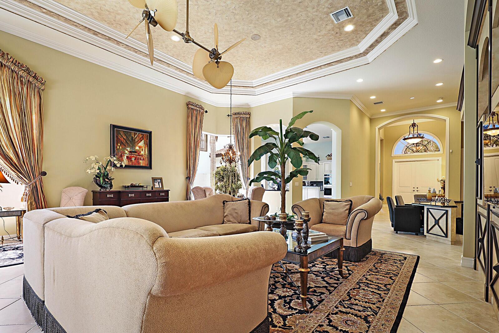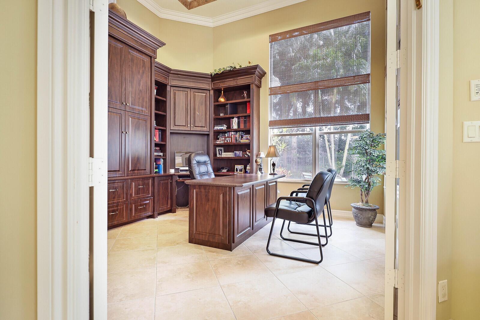 Experience understated elegance in this rarely available one story 3 bedroom, 3 bathroom, complete with a home office. The spacious layout features a split floor plan, volume ceilings with stunning detailing, crown molding, bespoke millwork and a custom bar and wall unit. The home is perfect for gracious living and entertaining with its open floor plan and sun drenched eat in kitchen with stainless steel appliances. Glass double doors open to a handsome home office with coffered ceilings an gorgeous backyard views. A beautiful and inviting master retreat features tray ceilings, custom walk in closet and a luxurious master bath with dual vanities, glass enclosed shower and soaking tub. Relax and entertain in your own newly landscaped backyard oasis featuring a covered lanai, summer