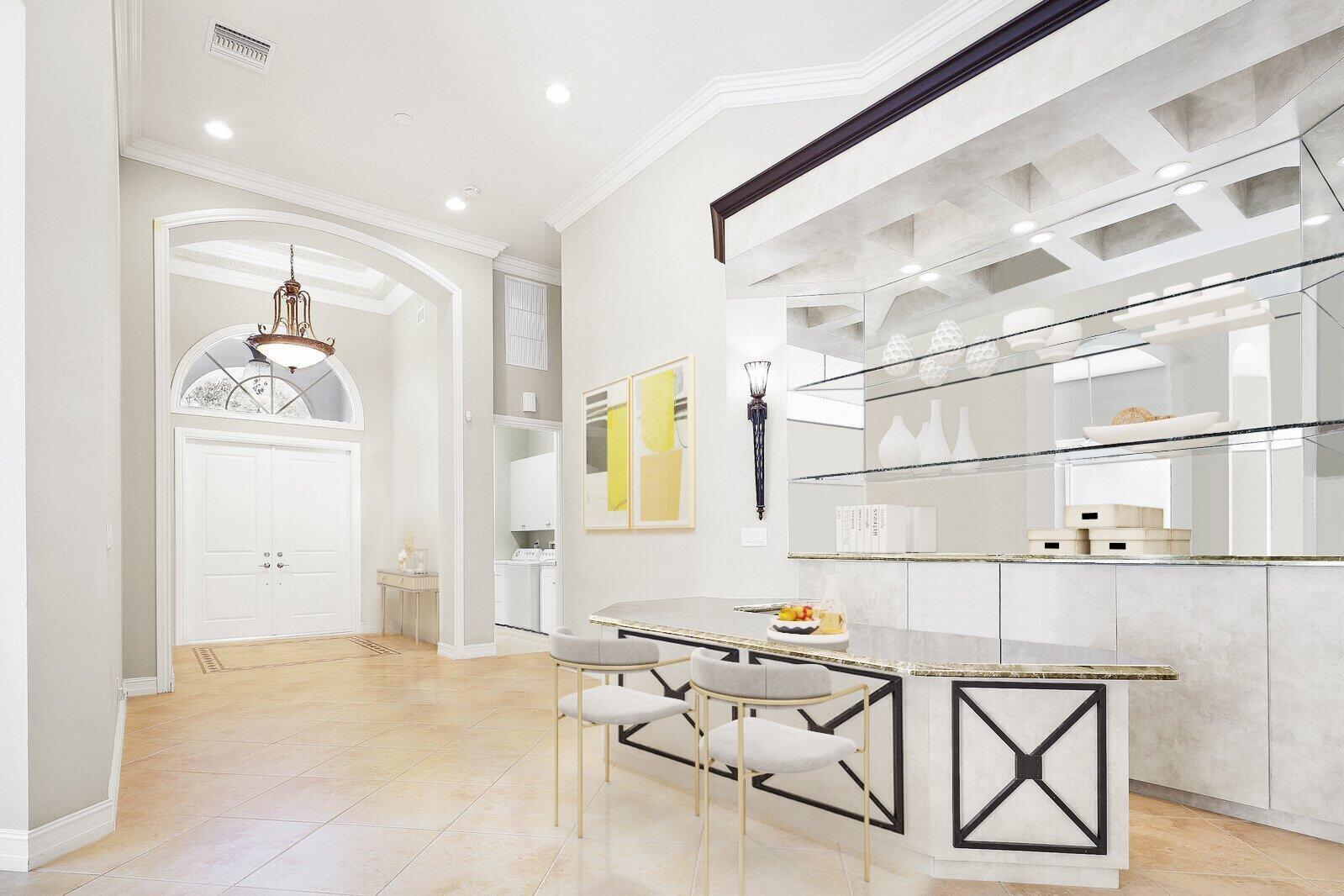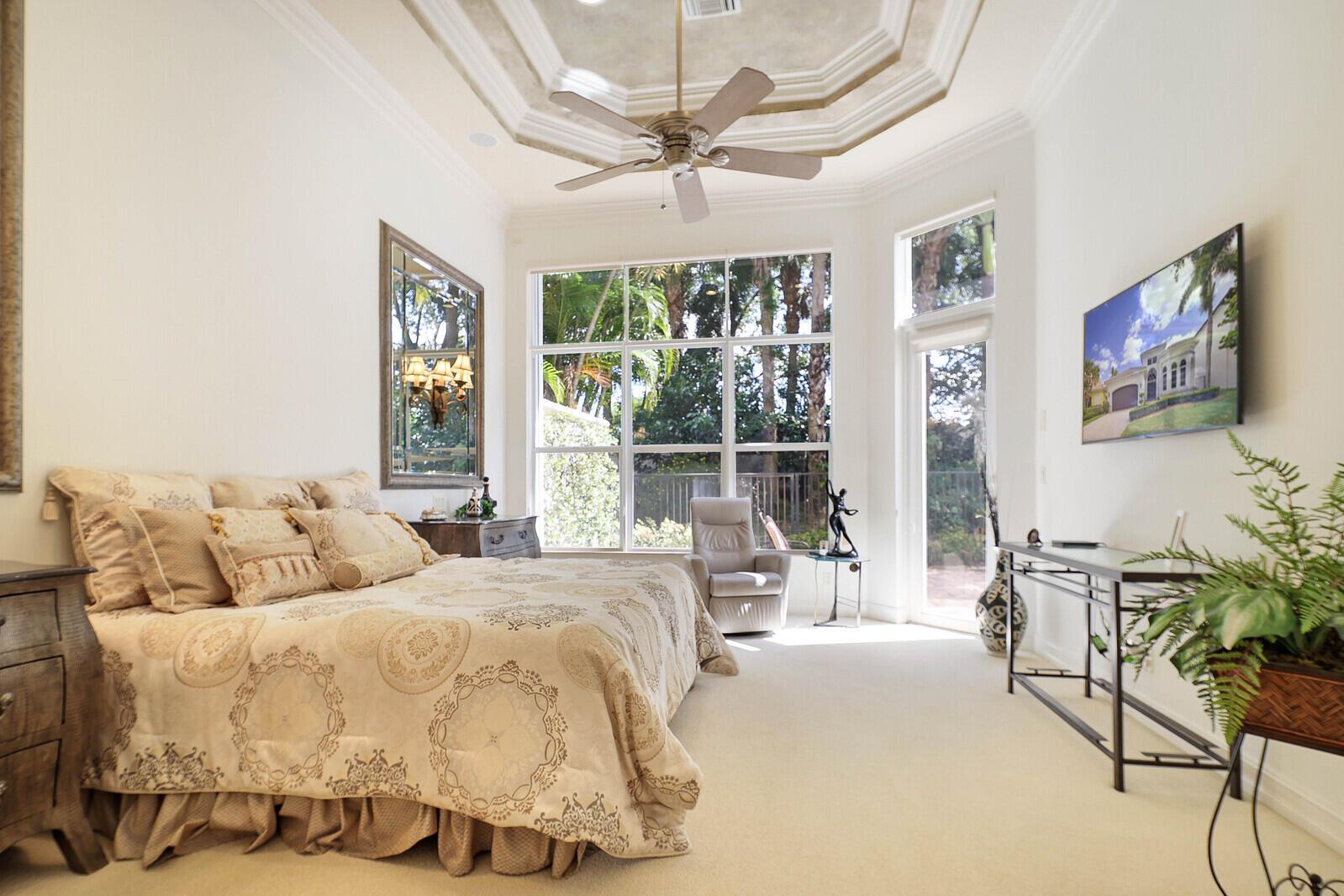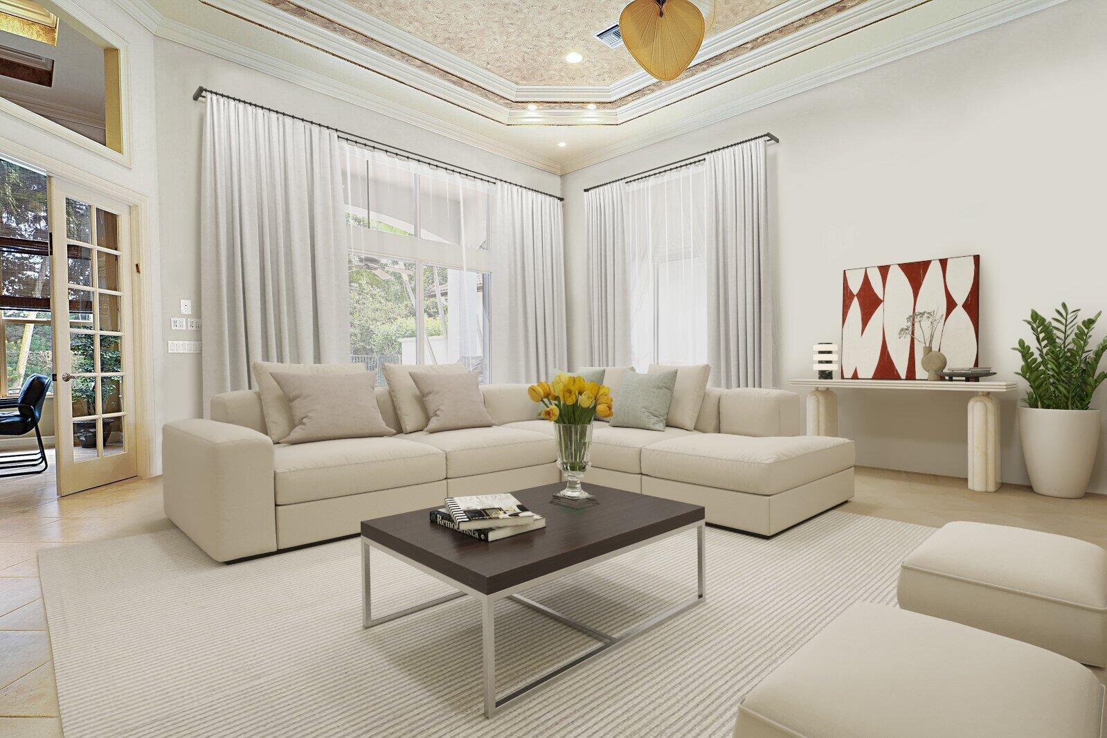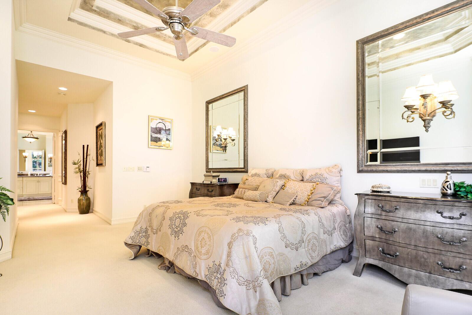 Experience understated elegance in this rarely available one story 3 bedroom, 3 bathroom, complete with a home office. The spacious layout features a split floor plan, volume ceilings with stunning detailing, crown molding, bespoke millwork and a custom bar and wall unit. The home is perfect for gracious living and entertaining with its open floor plan and sun drenched eat in kitchen with stainless steel appliances. Glass double doors open to a handsome home office with coffered ceilings an gorgeous backyard views. A beautiful and inviting master retreat features tray ceilings, custom walk in closet and a luxurious master bath with dual vanities, glass enclosed shower and soaking tub. Relax and entertain in your own newly landscaped backyard oasis featuring a covered lanai, summer
