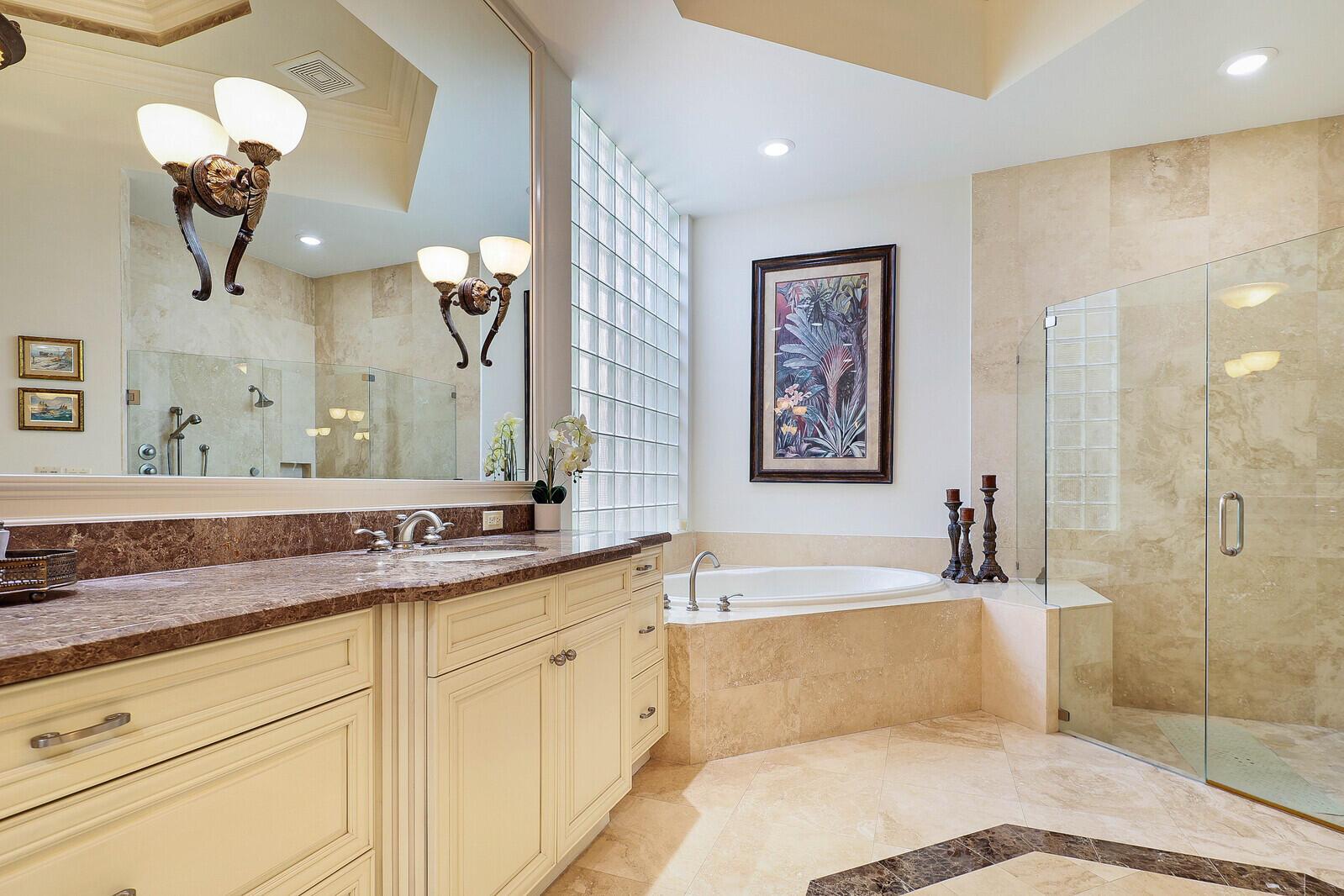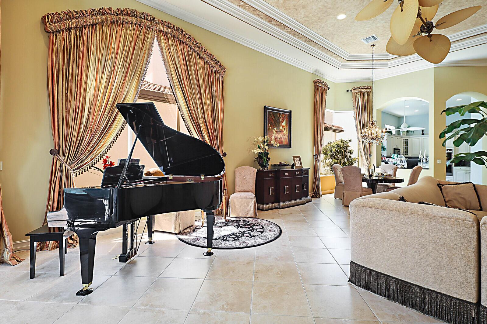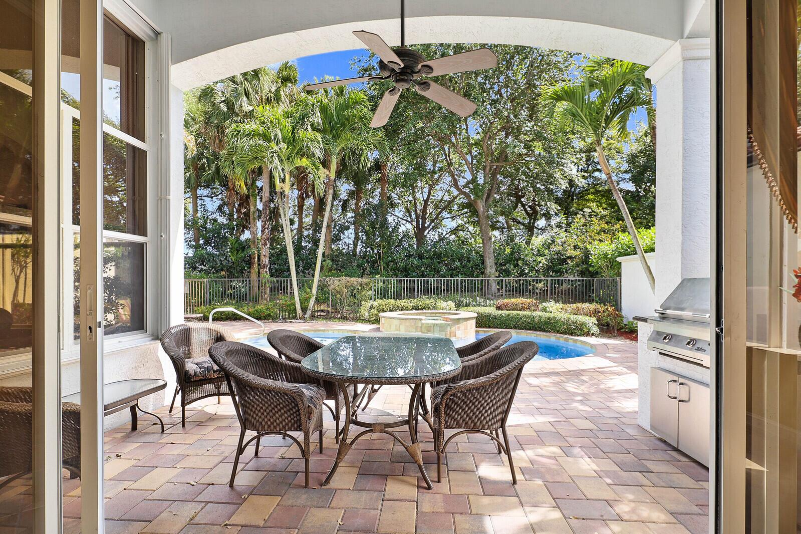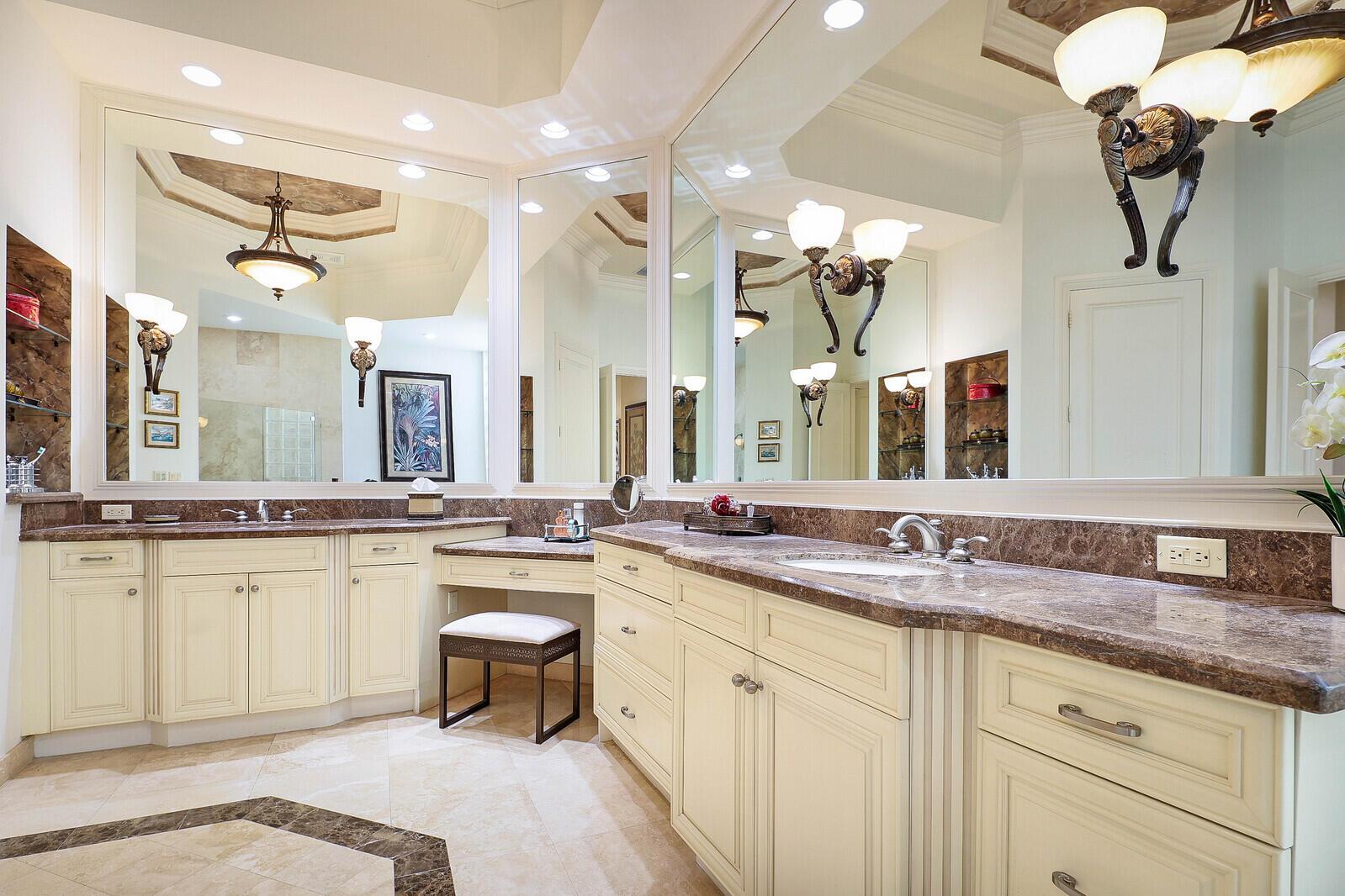 Experience understated elegance in this rarely available one story 3 bedroom, 3 bathroom, complete with a home office. The spacious layout features a split floor plan, volume ceilings with stunning detailing, crown molding, bespoke millwork and a custom bar and wall unit. The home is perfect for gracious living and entertaining with its open floor plan and sun drenched eat in kitchen with stainless steel appliances. Glass double doors open to a handsome home office with coffered ceilings an gorgeous backyard views. A beautiful and inviting master retreat features tray ceilings, custom walk in closet and a luxurious master bath with dual vanities, glass enclosed shower and soaking tub. Relax and entertain in your own newly landscaped backyard oasis featuring a covered lanai, summer