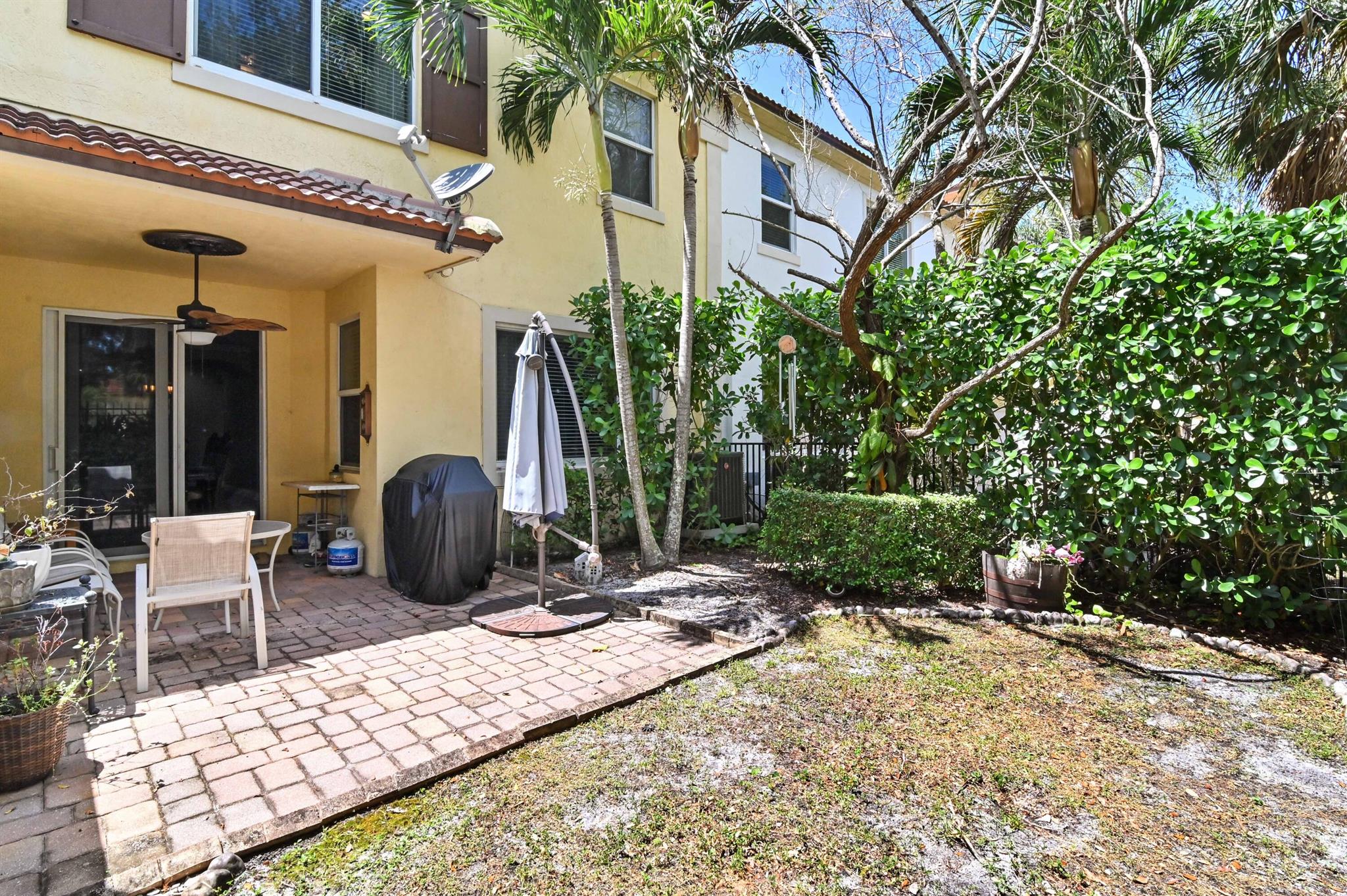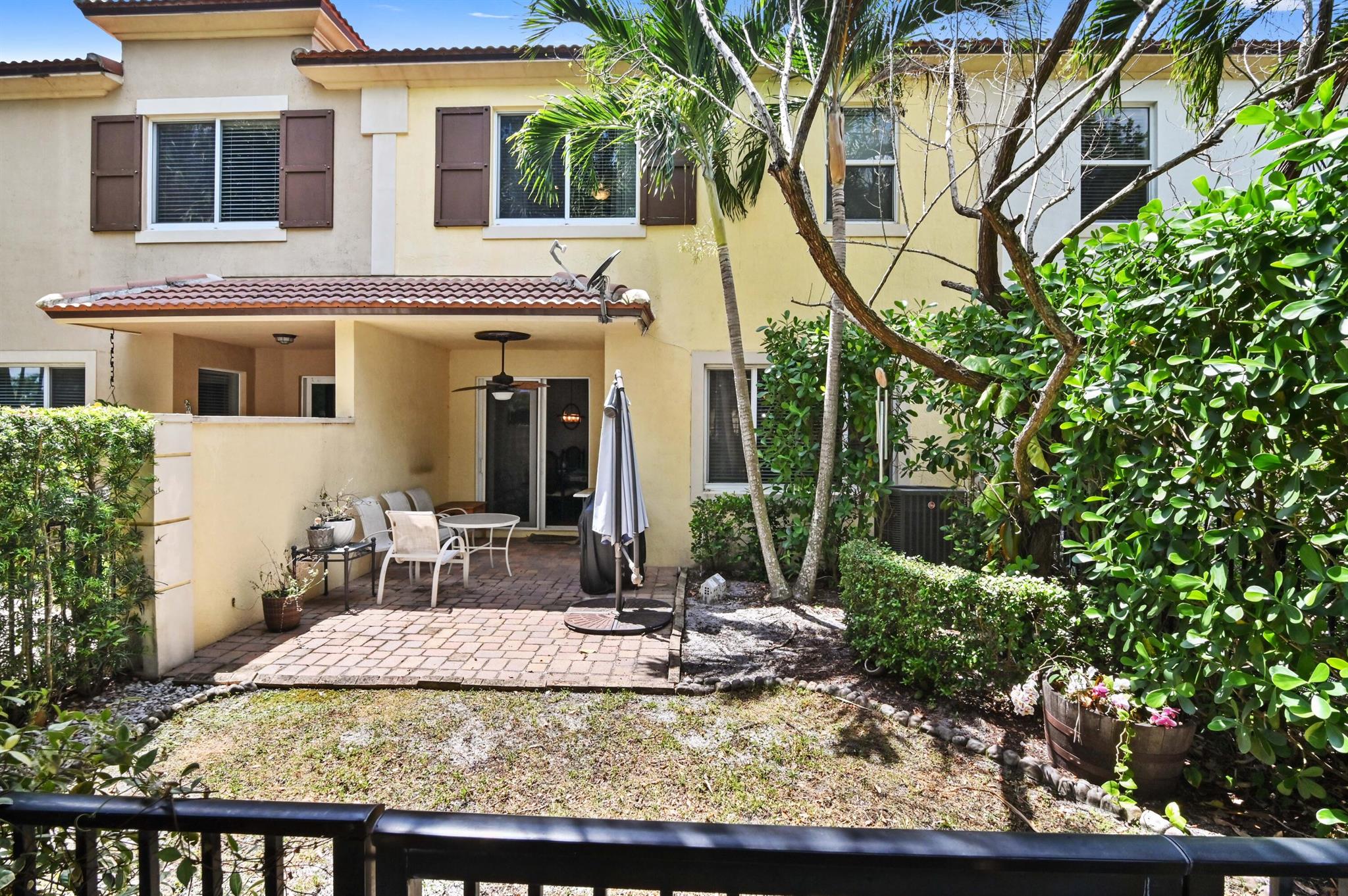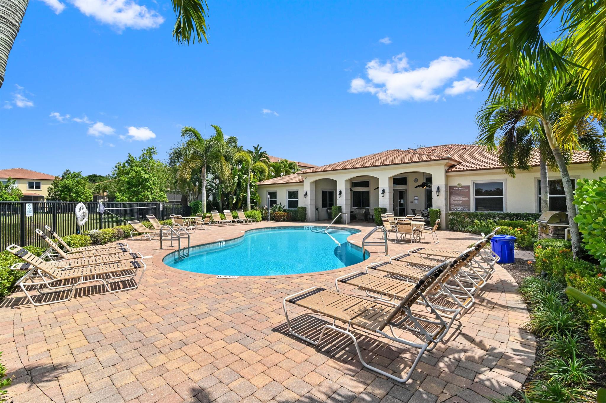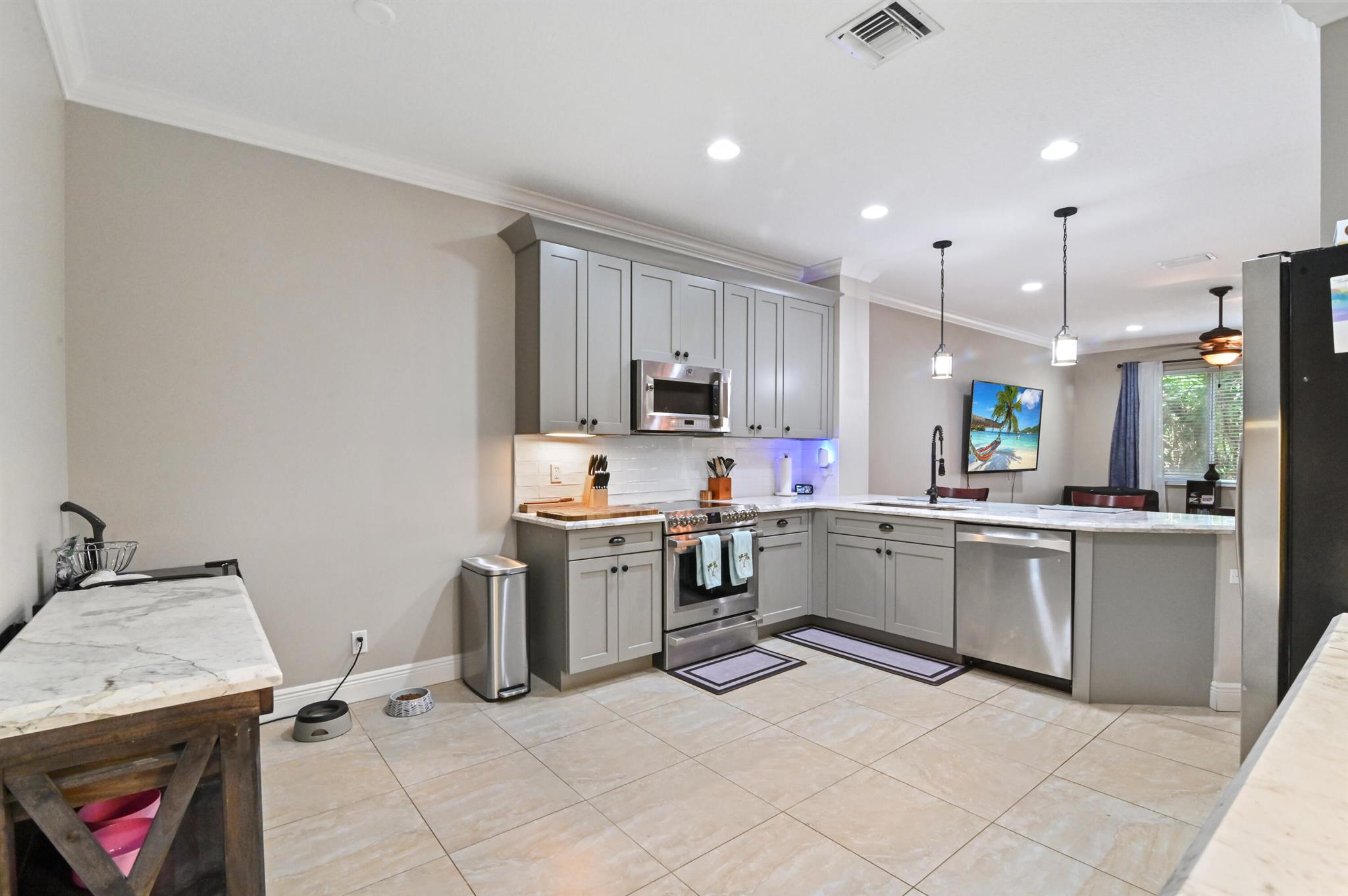 Come live in this beautifully remodeled, spacious, two story townhome w/ impact windows. Custom kitchen w/ Quartzite counters, professional grade stove/oven, matching convection microwave, dual sinks, under cabinet lighting and 42'' cabinets. Crown molding and hardwood floors on lower level with laminate wood adorning the staircase. All bedrooms are nicely sized. Oversized primary w/ two massive walk in closets and tray ceiling. Plenty of storage with cabinetry in the garage. AC done in 2023! Landscaped backyard with private extended patio. Upstairs laundry room with wash basin and front loading washer/dryer. Centrally located close to the Turnpike, I-95, Downtown, Cityplace, airport and the beach. HOA covers insurance, exterior maintenance, clubhouse with game room and heated pool.