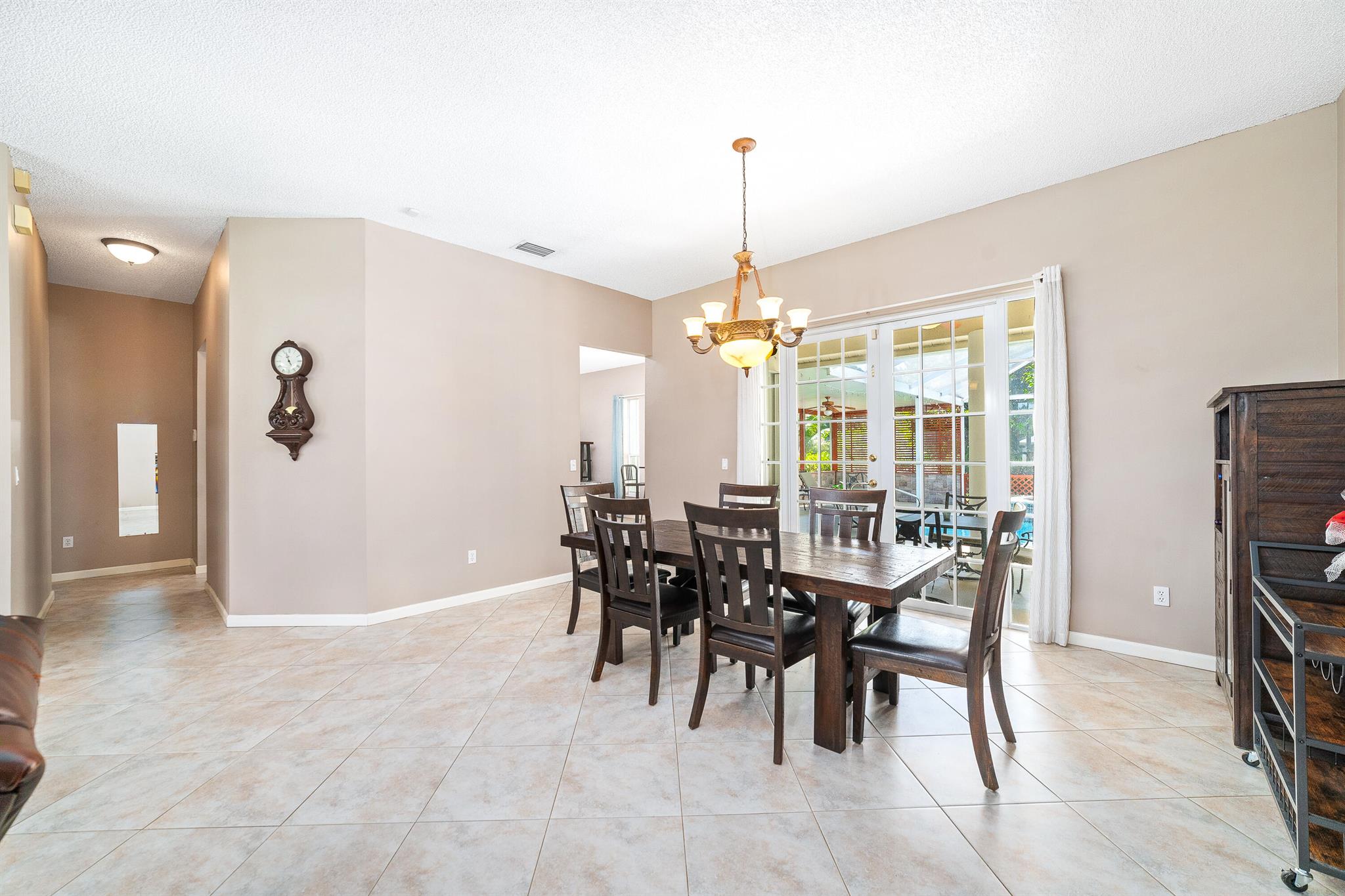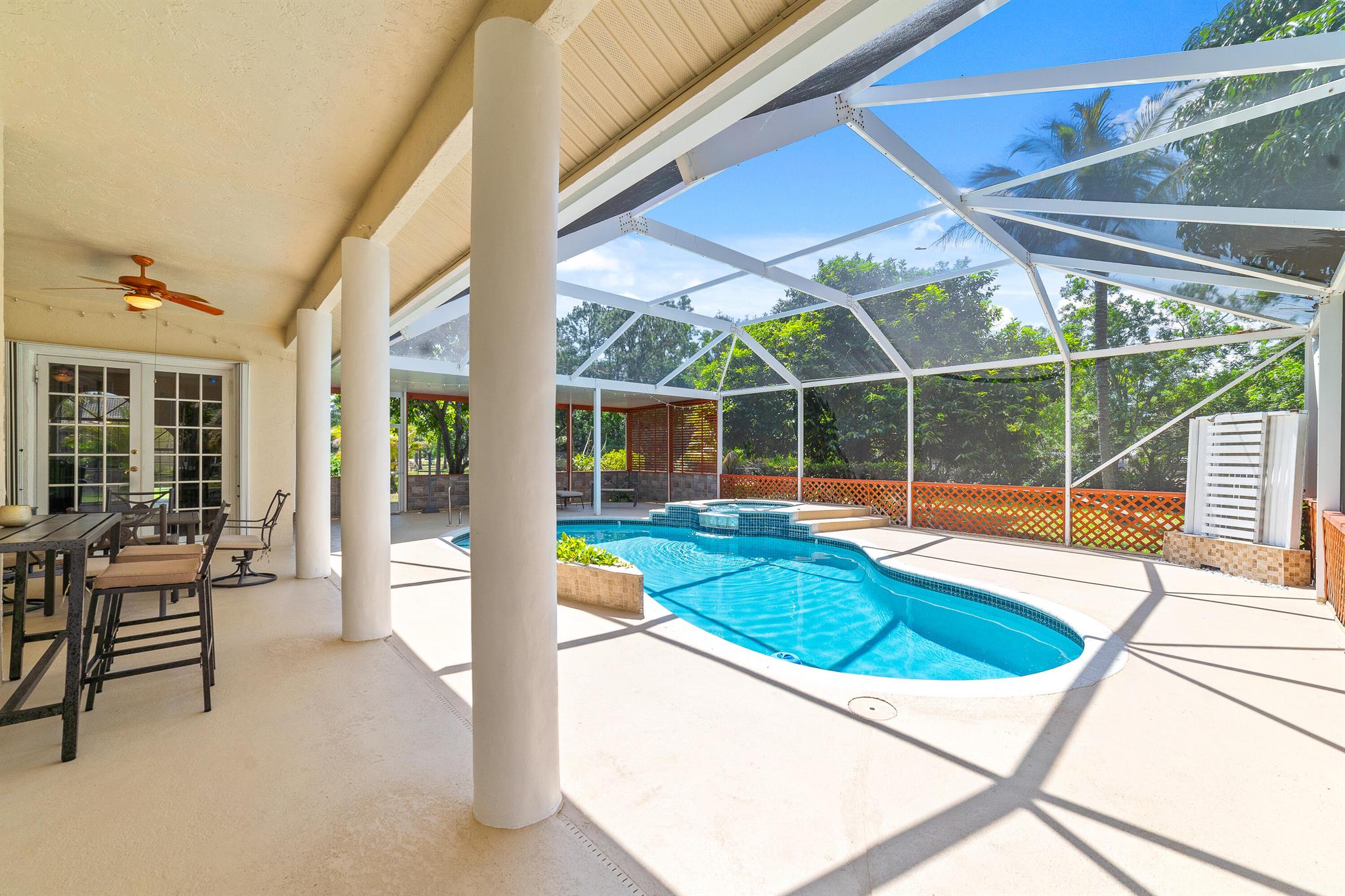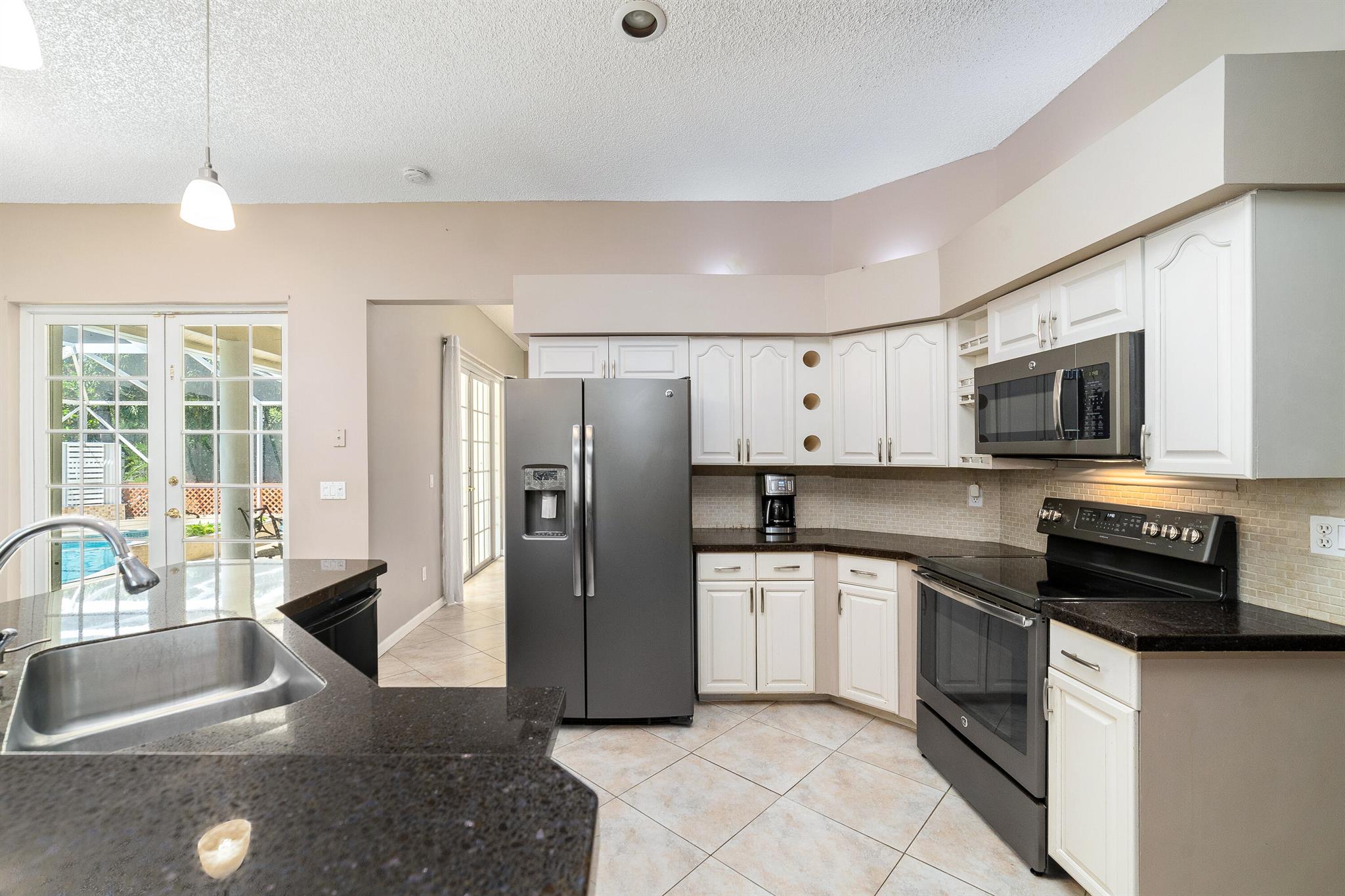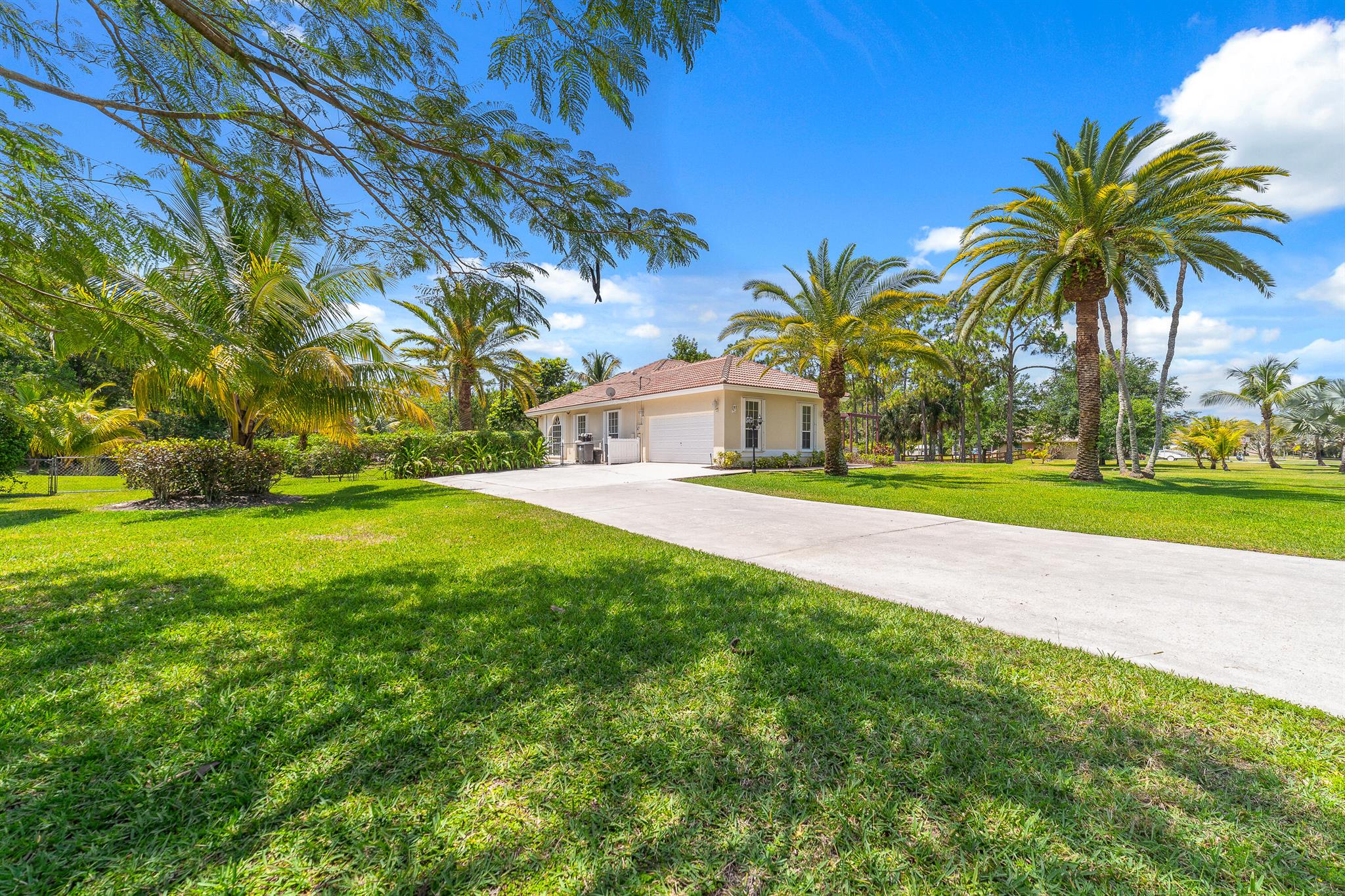 Enjoy the perfect blend of indoor and outdoor living in this beautiful pool home in a great location with NO HOA! It rests on a private 1.15 acre lot in a prime location on a quiet, dead-end and paved street only 1.5 miles from the new town center and near several top notch golf courses. A-rated elementary and middle schools! The home features 10' high ceilings, tile flooring diagonally, French front and patio doors, accordion shutters, whole house water filtration system, exterior painted in 2024, newly painted S-tile roof installed in 2016, and HVAC replaced in 2021. The upgraded kitchen is equipped with beautiful granite countertops, white cabinets, pantry, and island. Primary bedroom offers access to the patio and features his and her walk-in closets. En-suite primary bathroom is