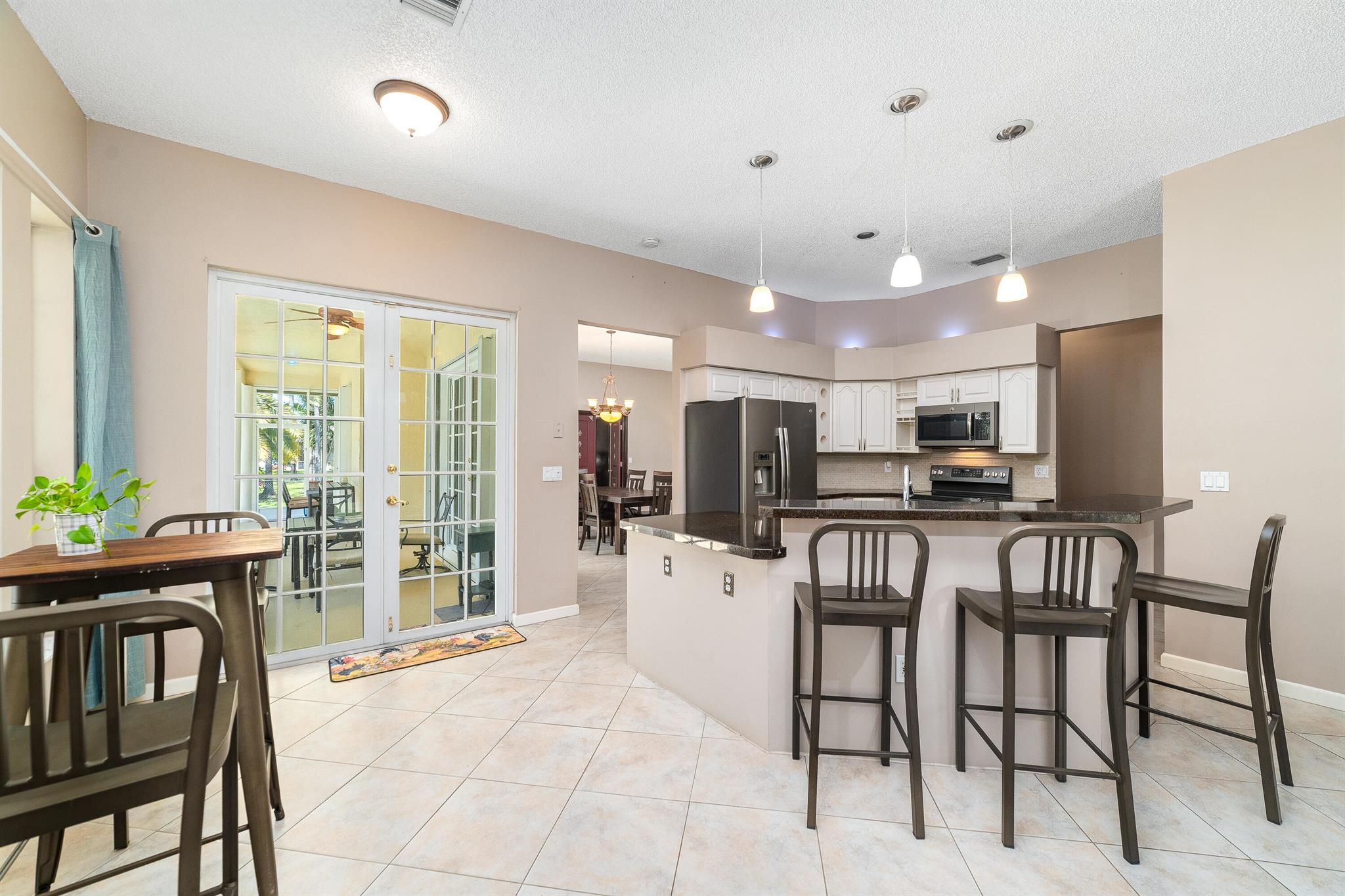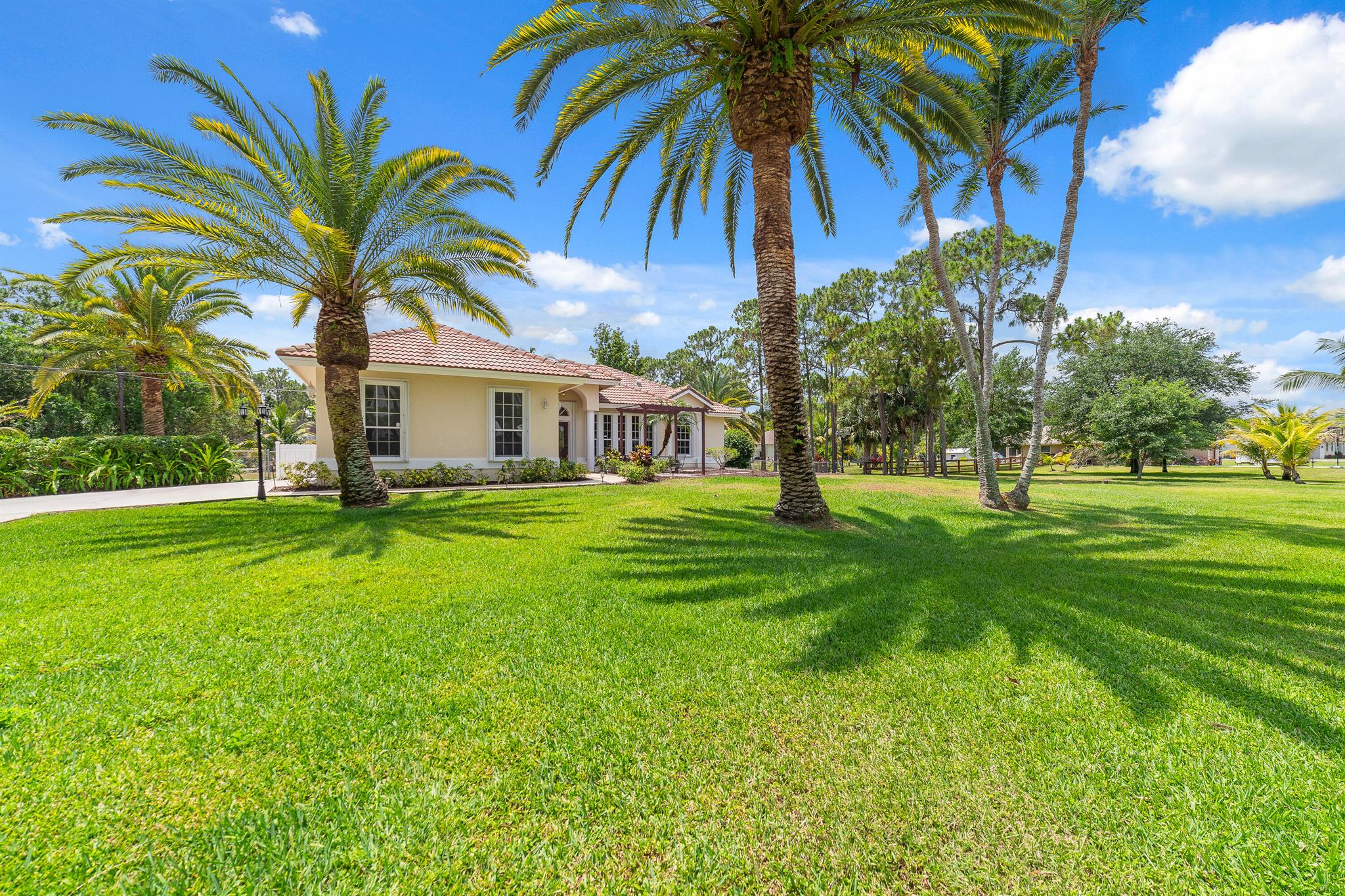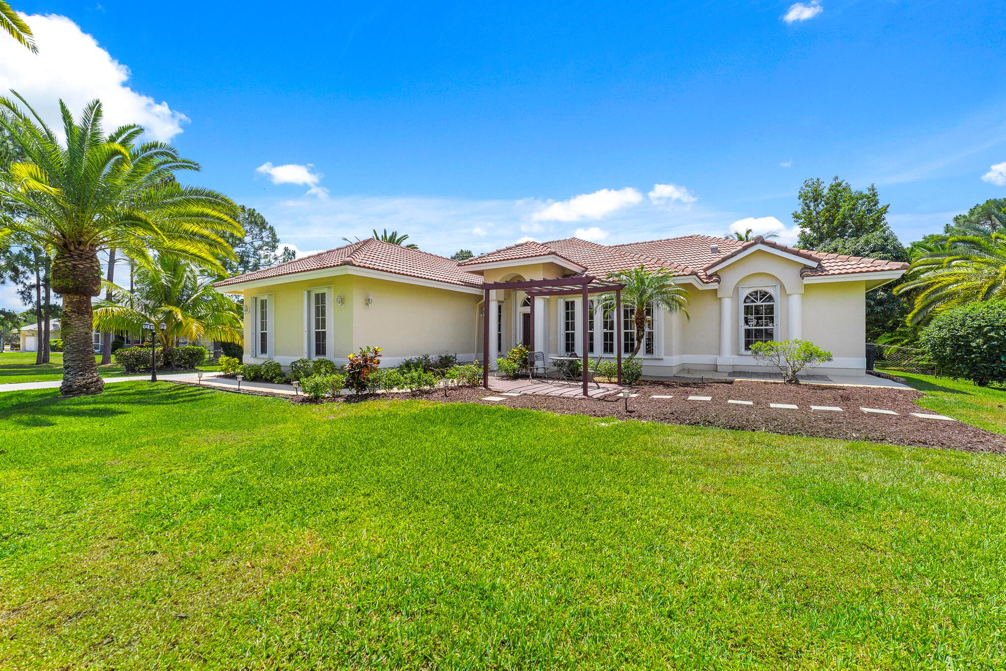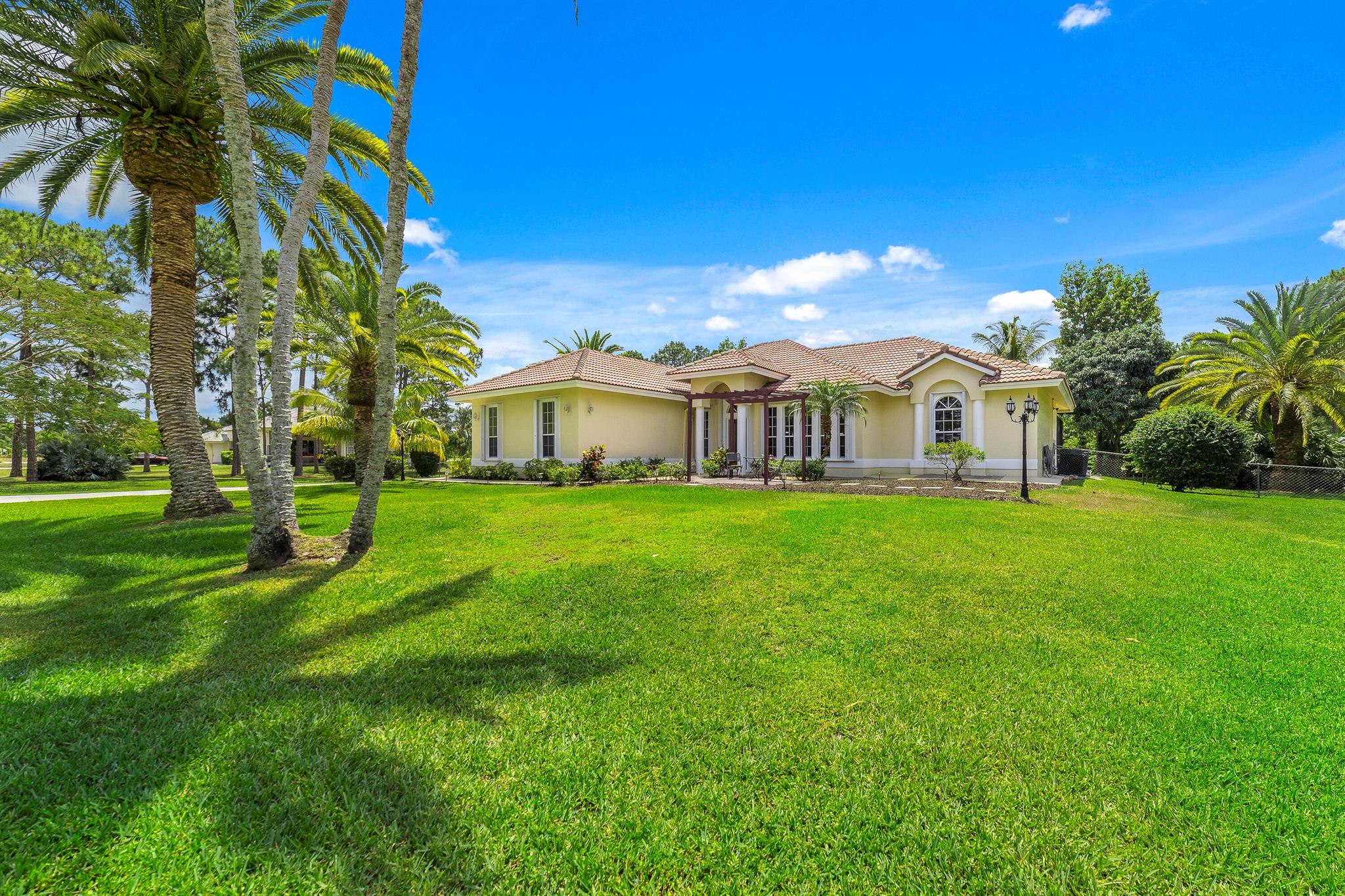 Enjoy the perfect blend of indoor and outdoor living in this beautiful pool home in a great location with NO HOA! It rests on a private 1.15 acre lot in a prime location on a quiet, dead-end and paved street only 1.5 miles from the new town center and near several top notch golf courses. A-rated elementary and middle schools! The home features 10' high ceilings, tile flooring diagonally, French front and patio doors, accordion shutters, whole house water filtration system, exterior painted in 2024, newly painted S-tile roof installed in 2016, and HVAC replaced in 2021. The upgraded kitchen is equipped with beautiful granite countertops, white cabinets, pantry, and island. Primary bedroom offers access to the patio and features his and her walk-in closets. En-suite primary bathroom is