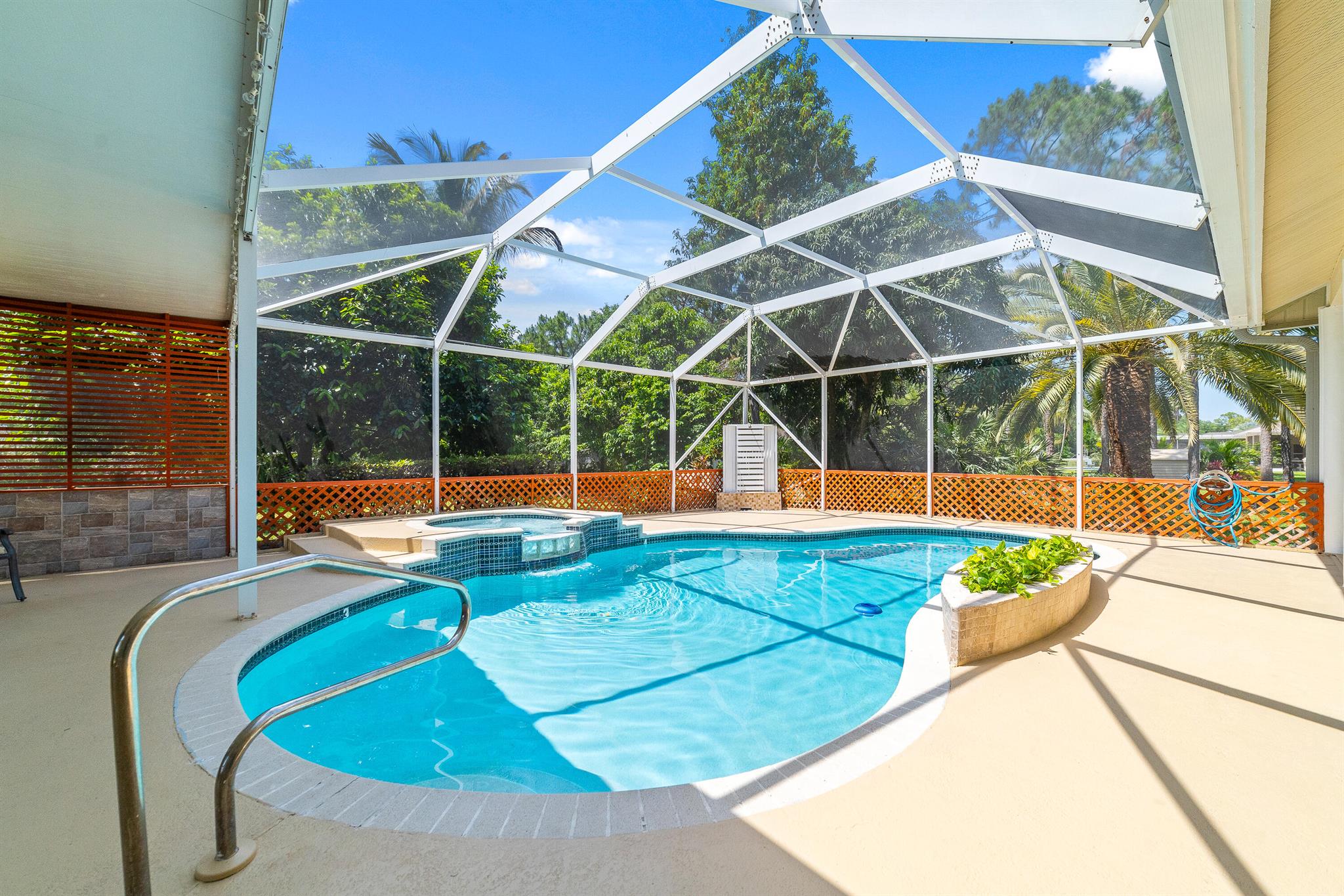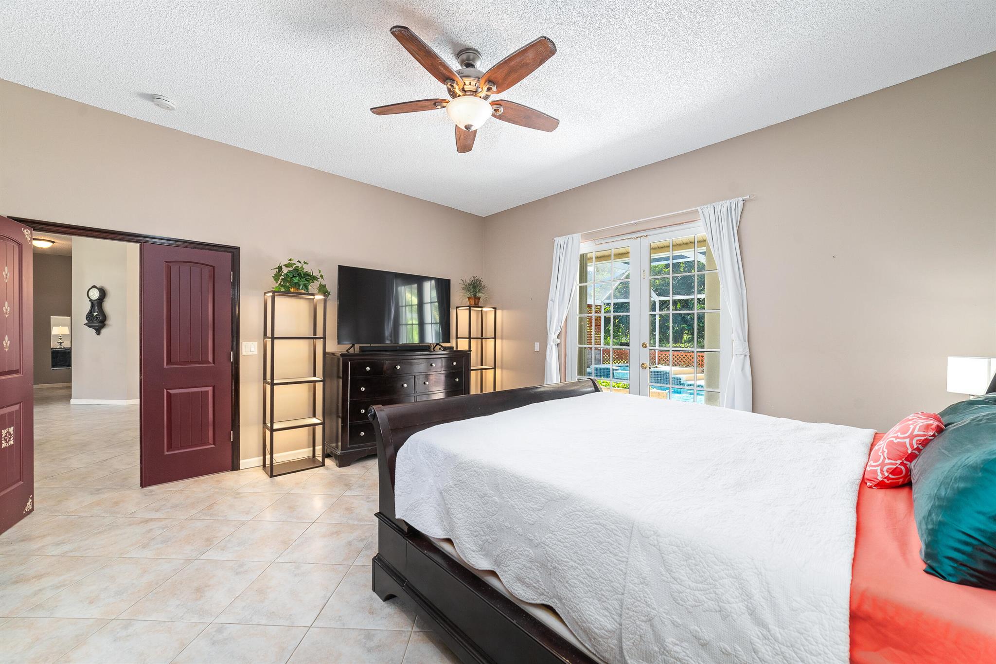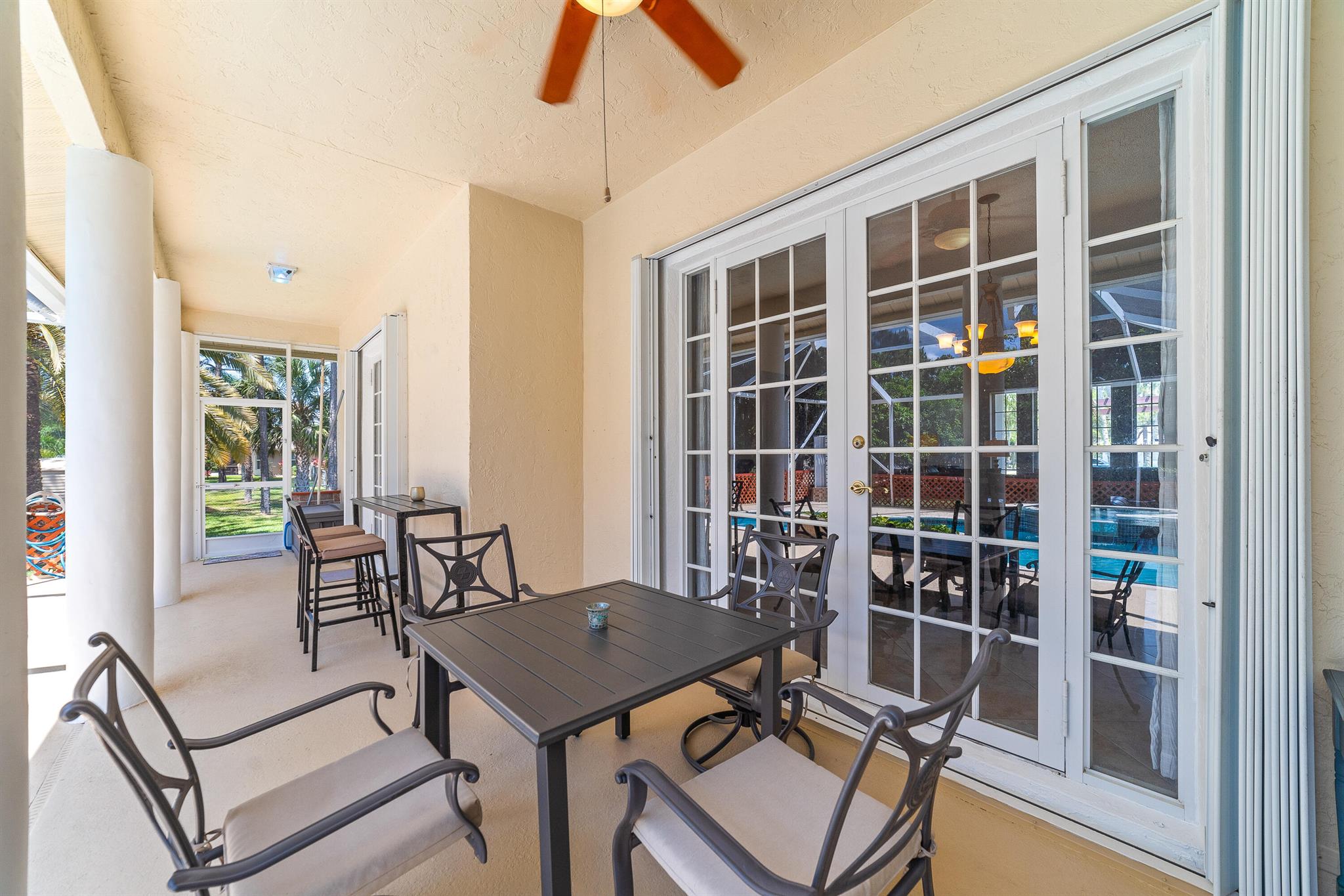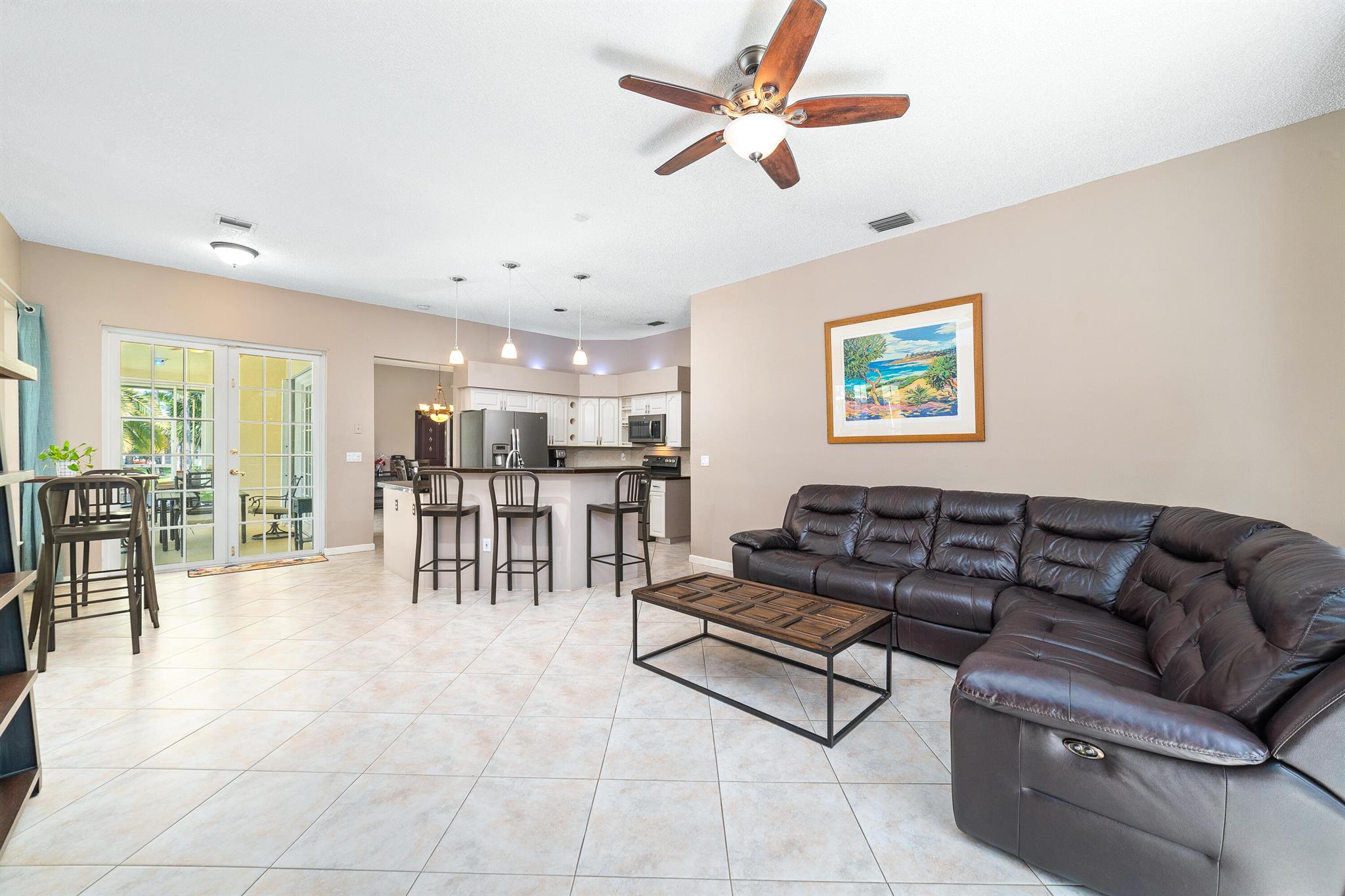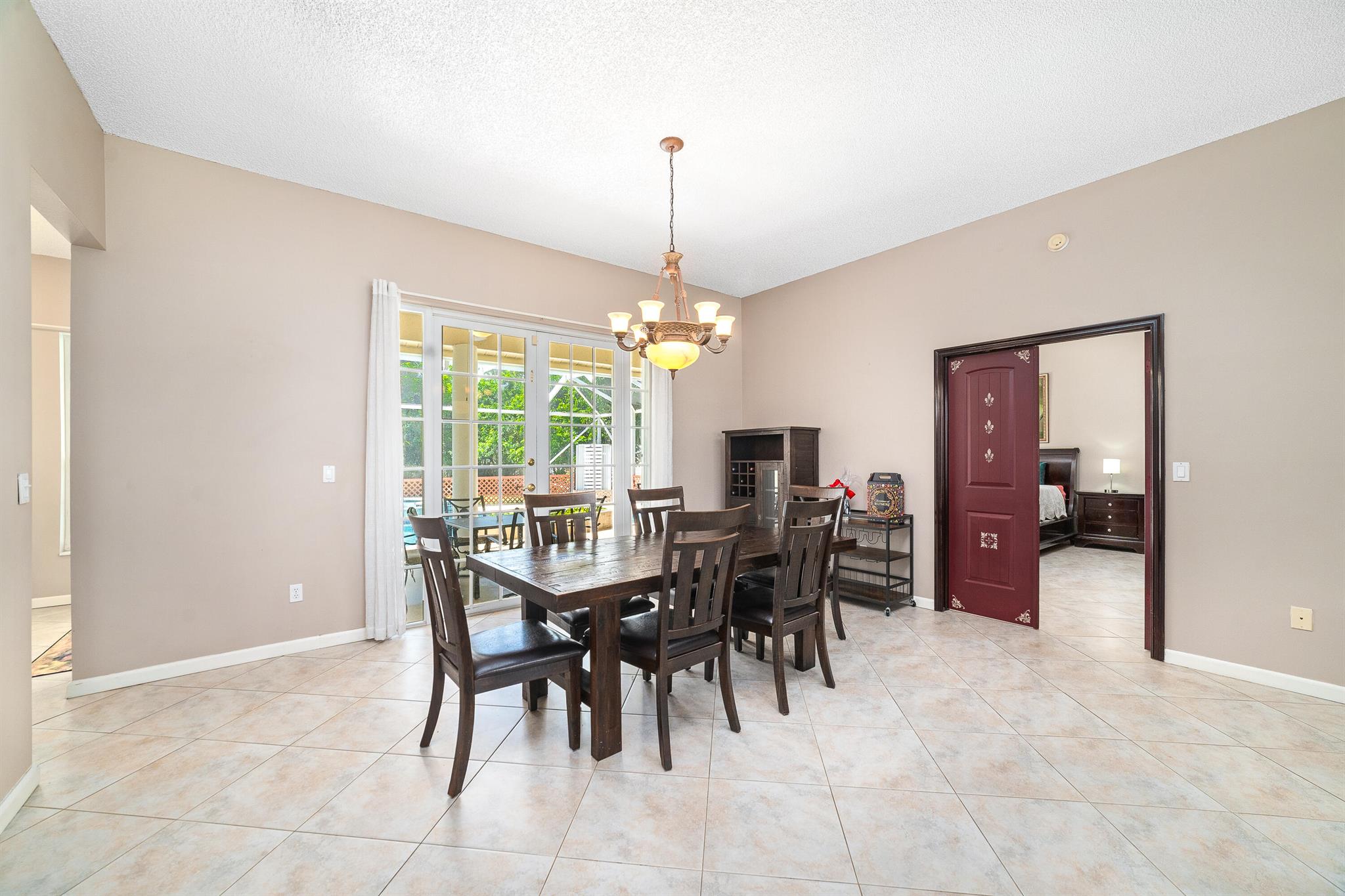 Enjoy the perfect blend of indoor and outdoor living in this beautiful pool home in a great location with NO HOA! It rests on a private 1.15 acre lot in a prime location on a quiet, dead-end and paved street only 1.5 miles from the new town center and near several top notch golf courses. A-rated elementary and middle schools! The home features 10' high ceilings, tile flooring diagonally, French front and patio doors, accordion shutters, whole house water filtration system, exterior painted in 2024, newly painted S-tile roof installed in 2016, and HVAC replaced in 2021. The upgraded kitchen is equipped with beautiful granite countertops, white cabinets, pantry, and island. Primary bedroom offers access to the patio and features his and her walk-in closets. En-suite primary bathroom is
