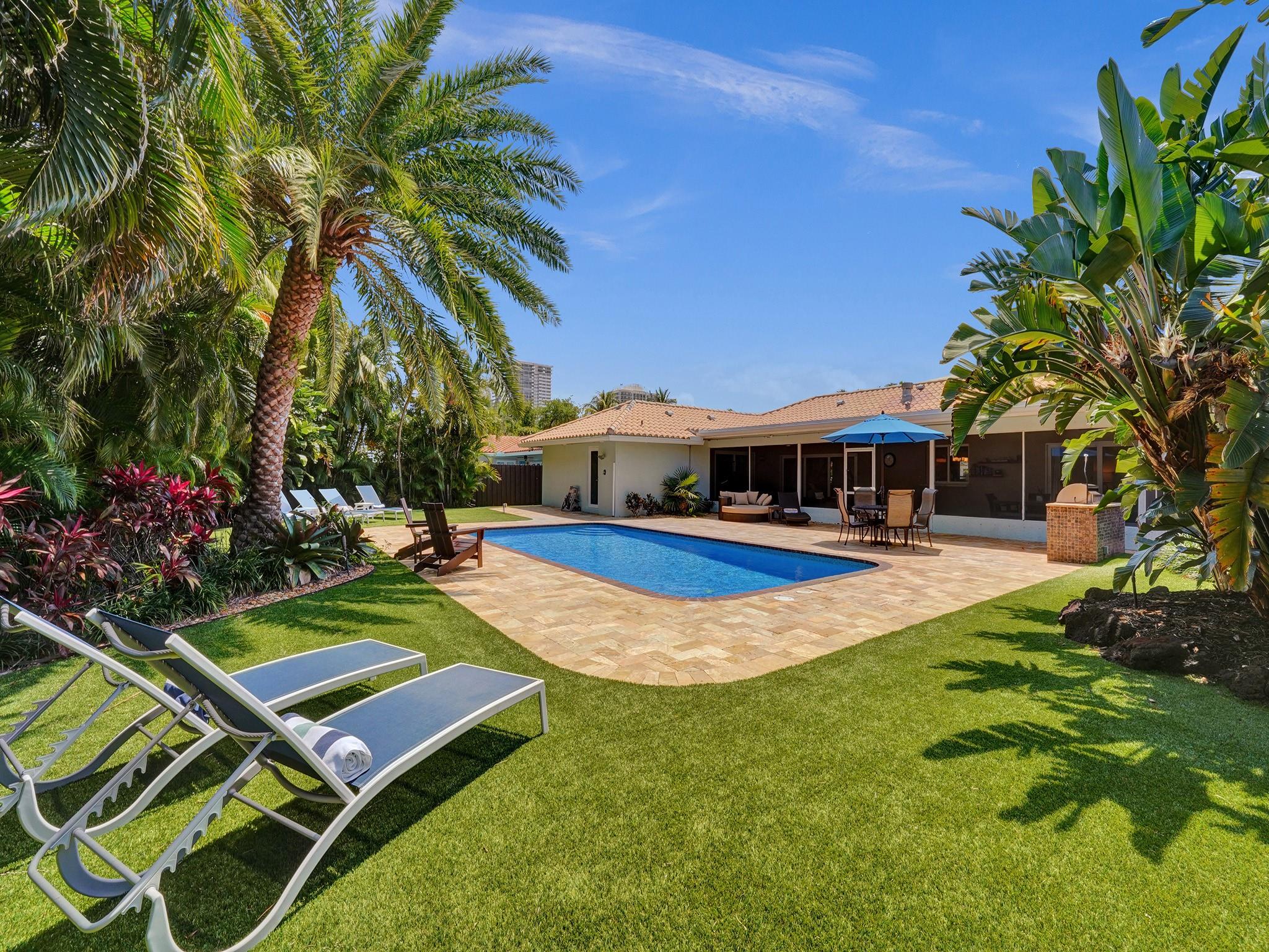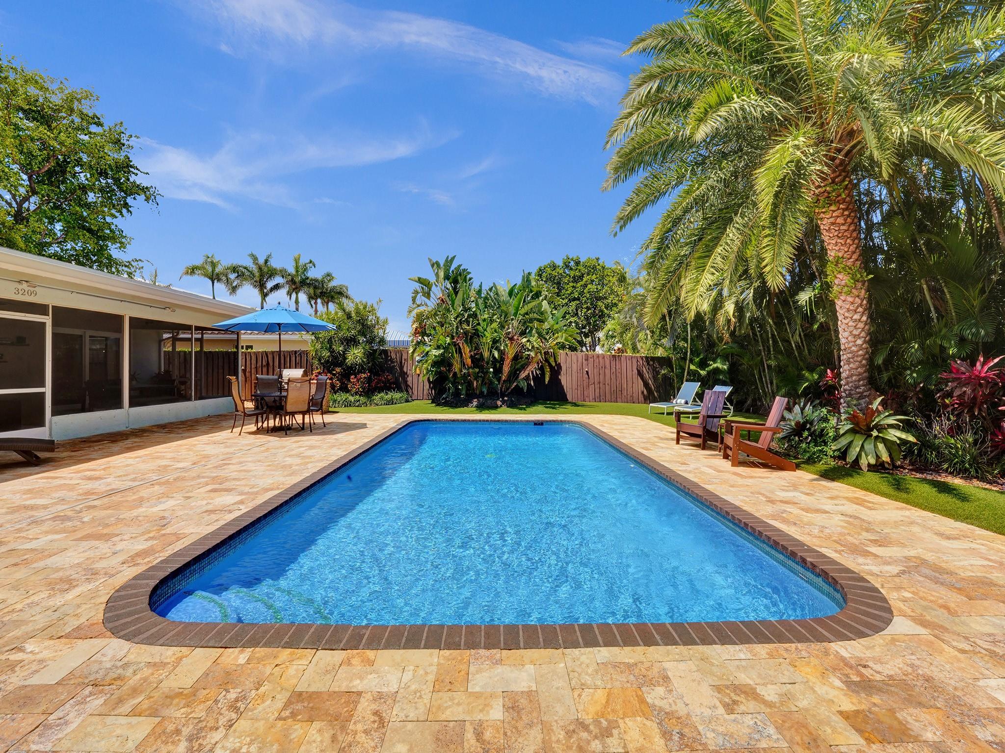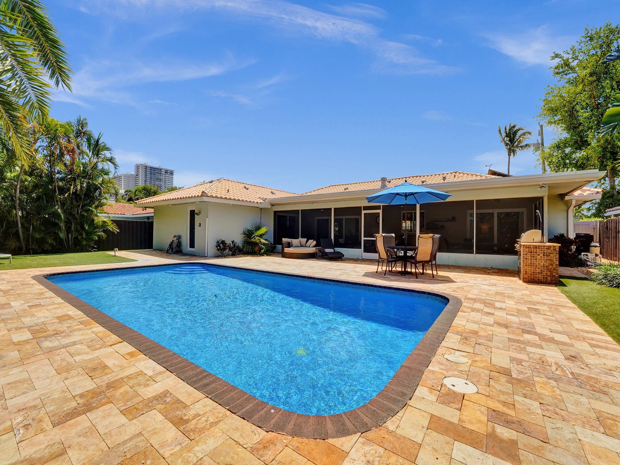 Welcome to your new TURNKEY secluded resort style home located on a quiet street within a 10 minute walking distance to the beach. This updated modern home features an oversize private professionally landscaped yard with a heated saltwater pool. The huge, screened lanai off the main living area will be your go too space to relax. Large living room with 2-sided wood burning fireplace, separate dining area. Kitchen features SS appliances, granite counters tops and adjoining sitting room. Large private primary bedroom with access to lanai, ensuite bathroom and Cedar WIC. Generous size secondary bedrooms and closet space. Impact windows & doors, 2 car garage with updated systems will make owning this home worry free. Close to shopping, airport, downtown Fort Lauderdale, Las Olas Blvd & LBS