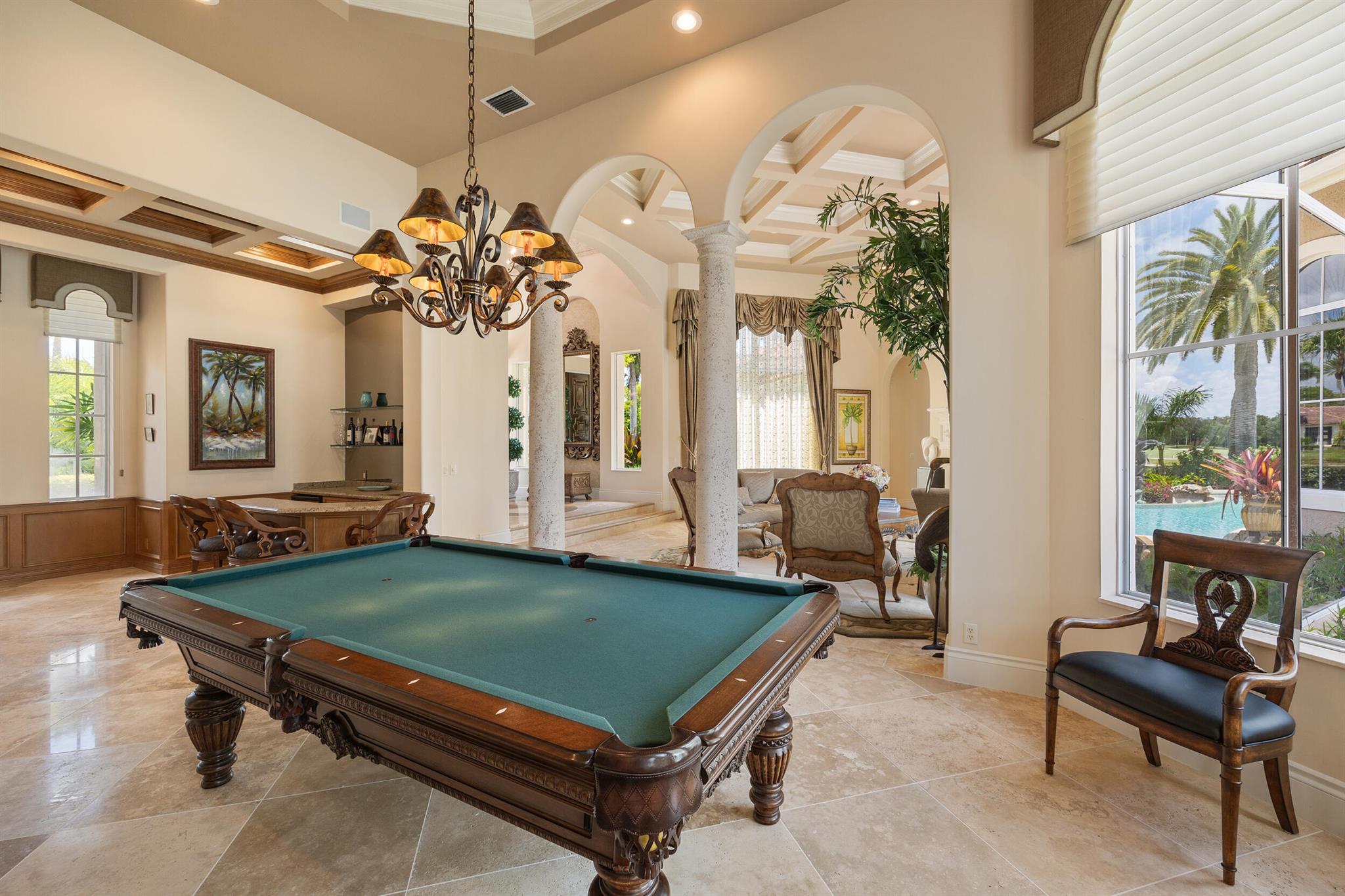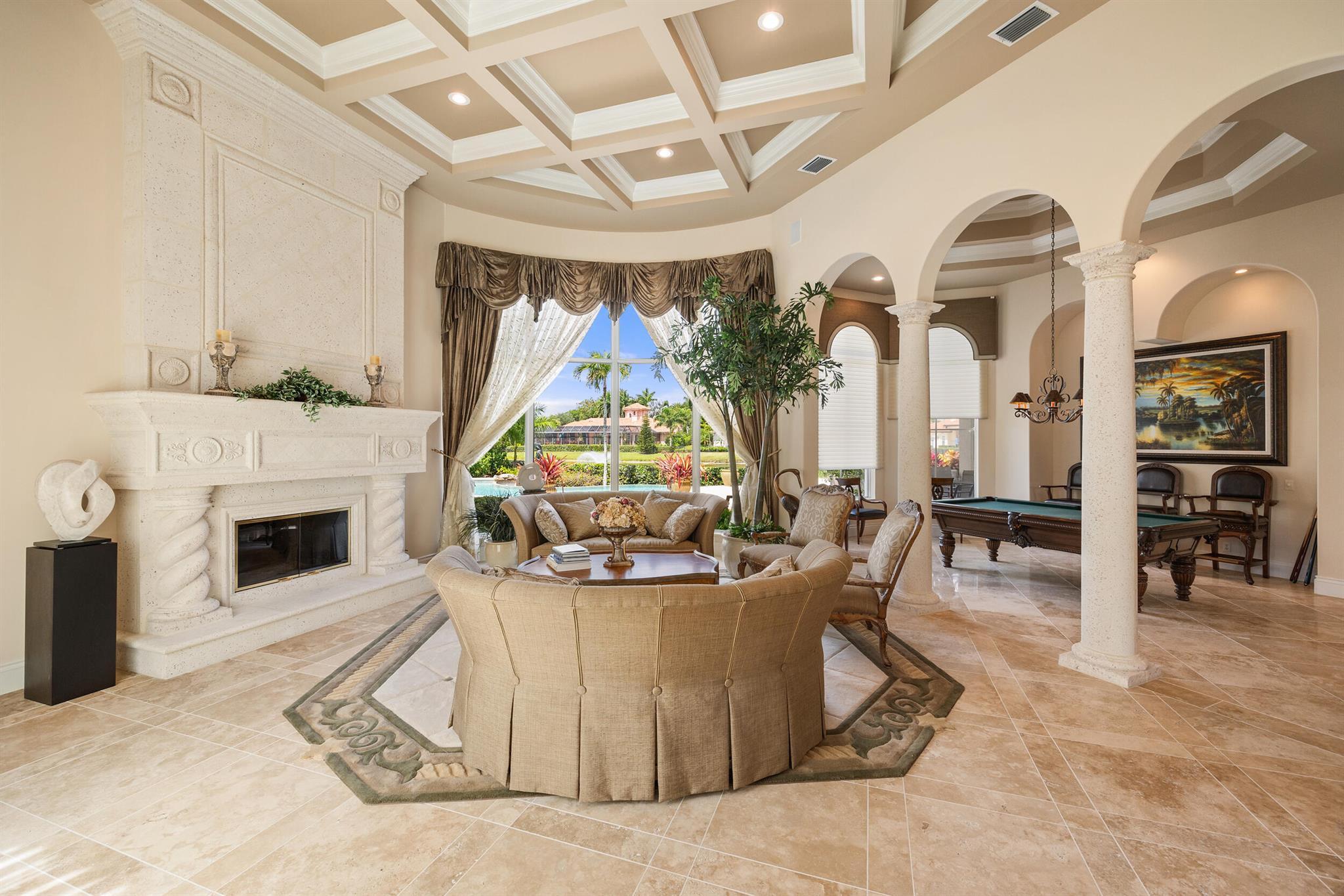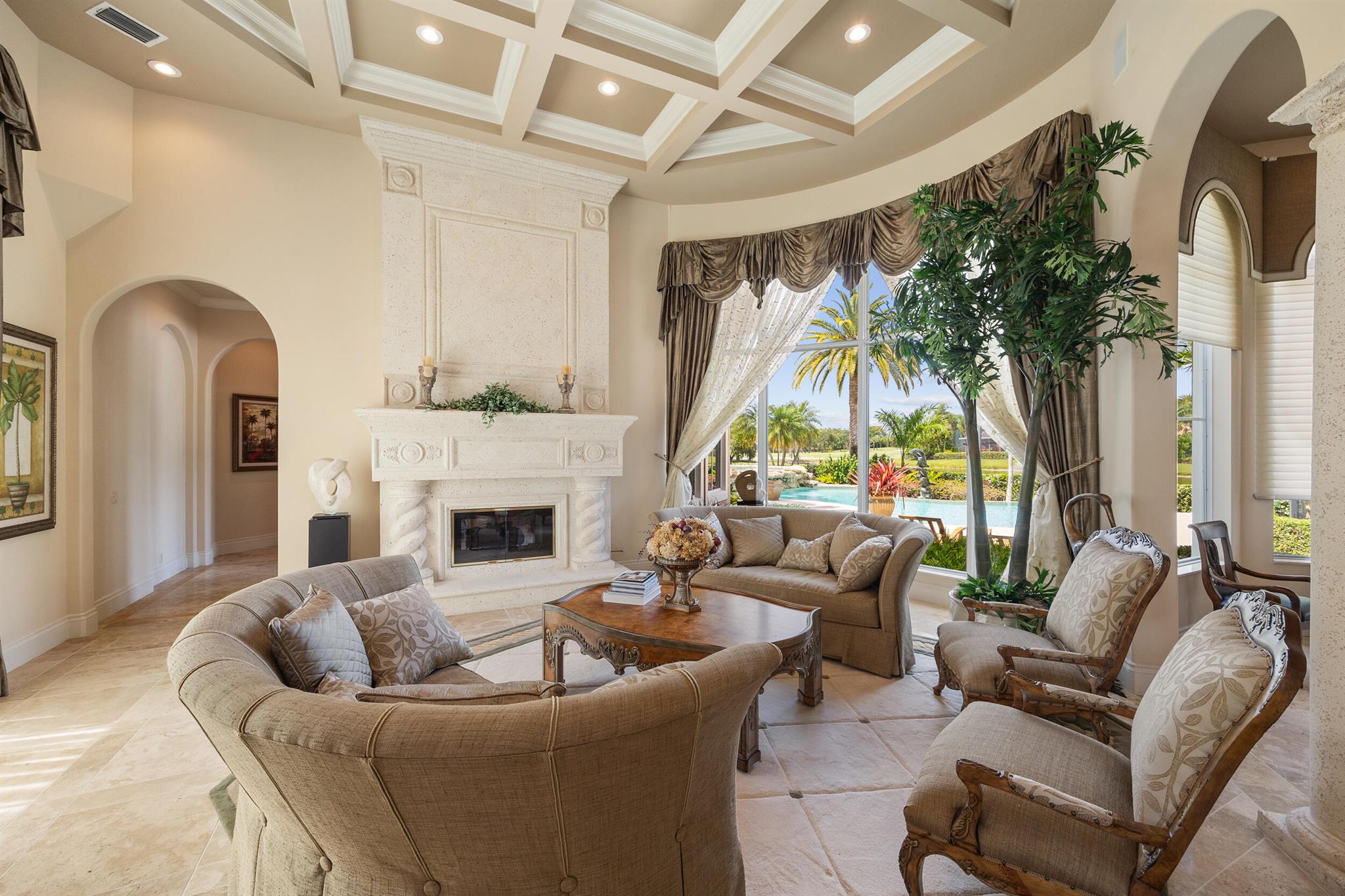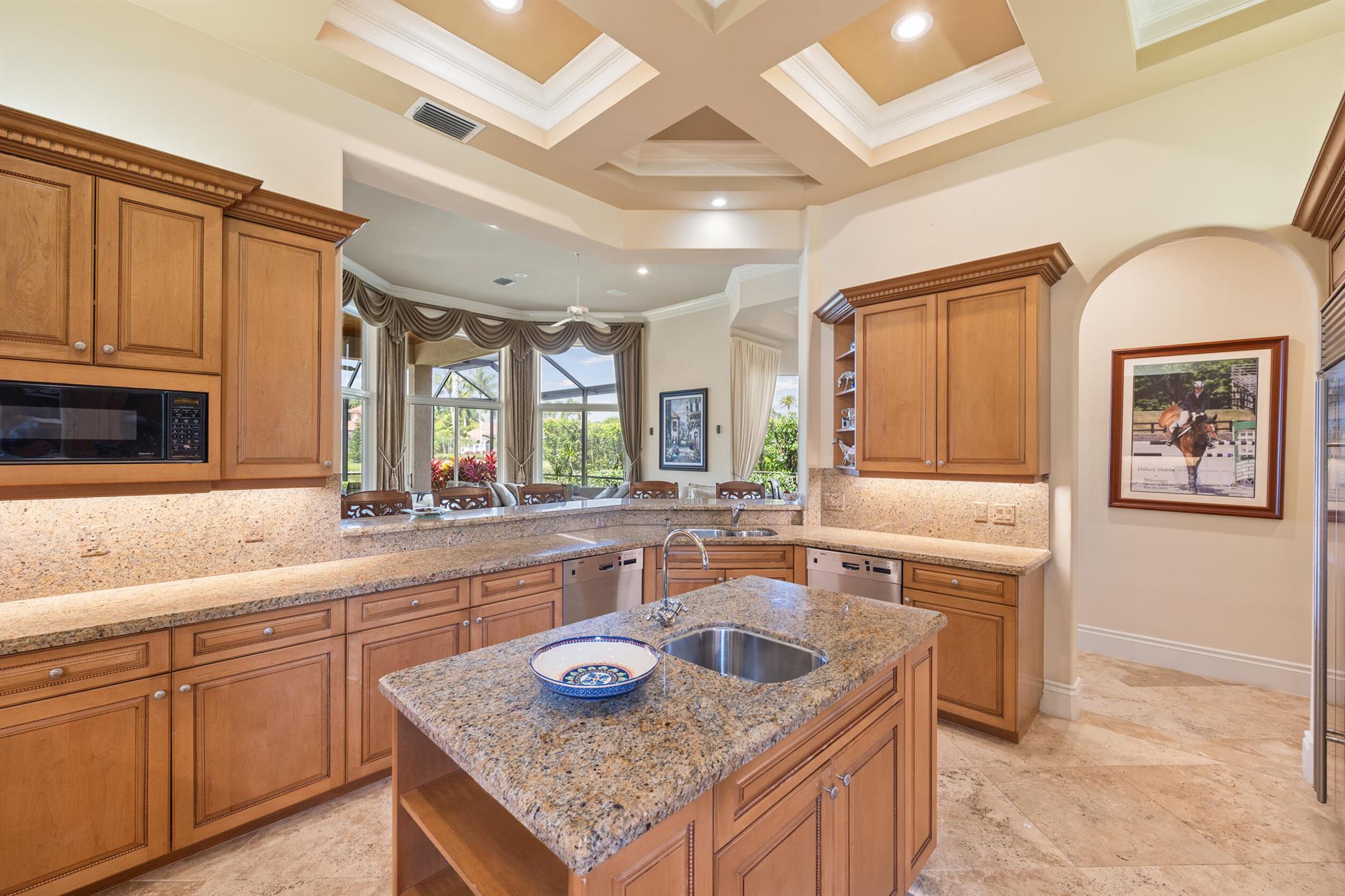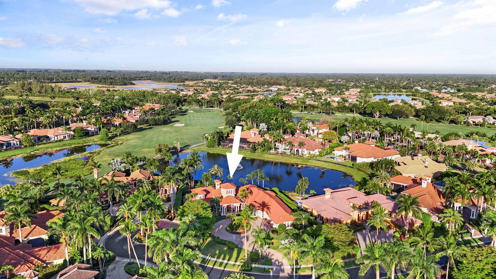 Meticulously kept residence in the exclusive Eagle Isle community. Enjoy Florida living with outstanding backyard water and award winning Jack Nicklaus-designed Legend Course views. From the moment you walk through the custom double doors you will notice the attention to detail with custom architectural and craftsmanship details. Impressive interior finishes throughout the home include coffered ceiling, crown molding, dramatic inlays, columns, stone fireplace and Saturnia floors. Hurricane windows and doors. Office is adorned with custom wood-paneled walls and plantation wood shutters. Gourmet kitchen with granite countertops, 2 dishwashers and 2 sinks and a butler's pantry. Separate sit down bar.