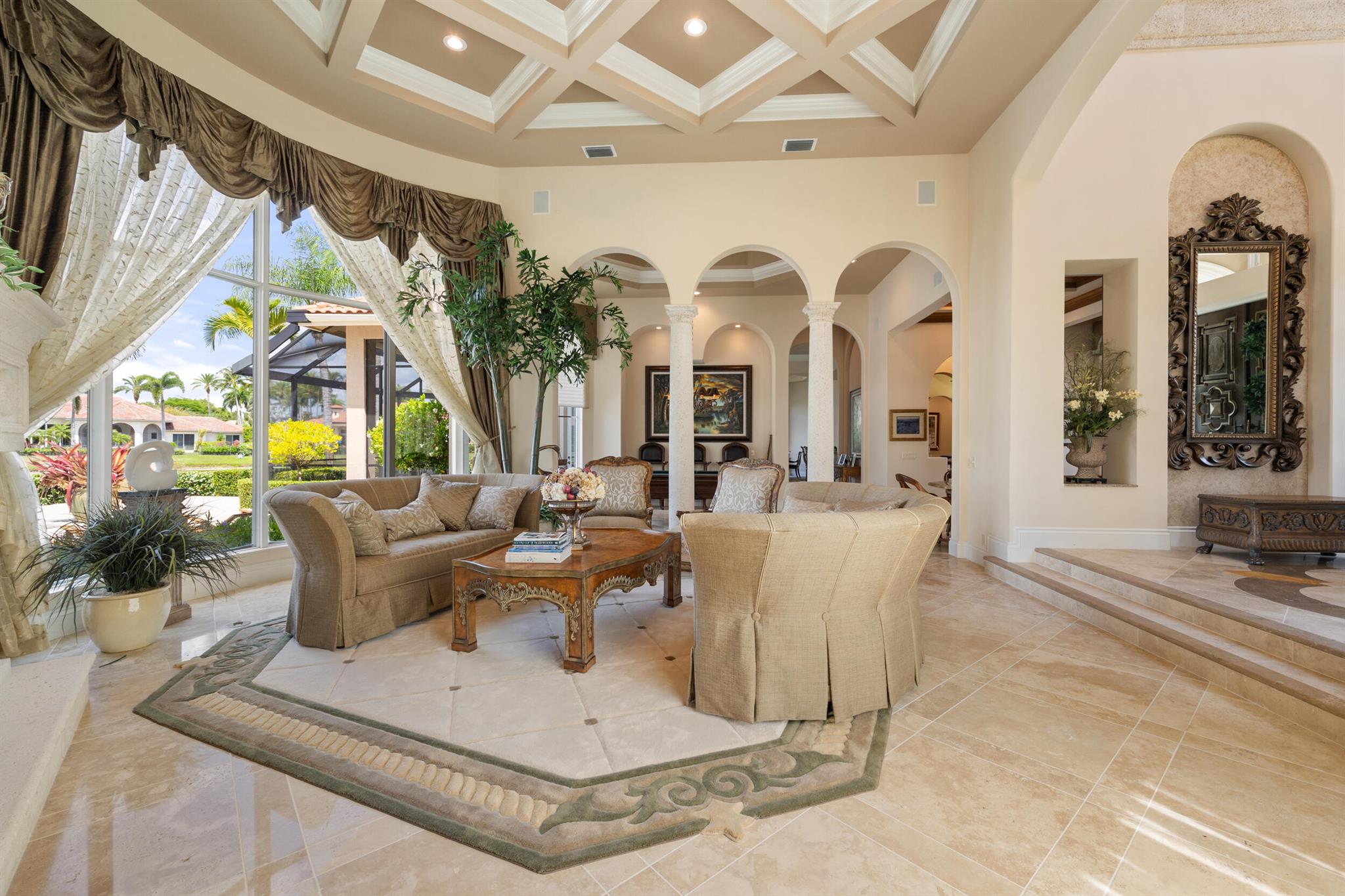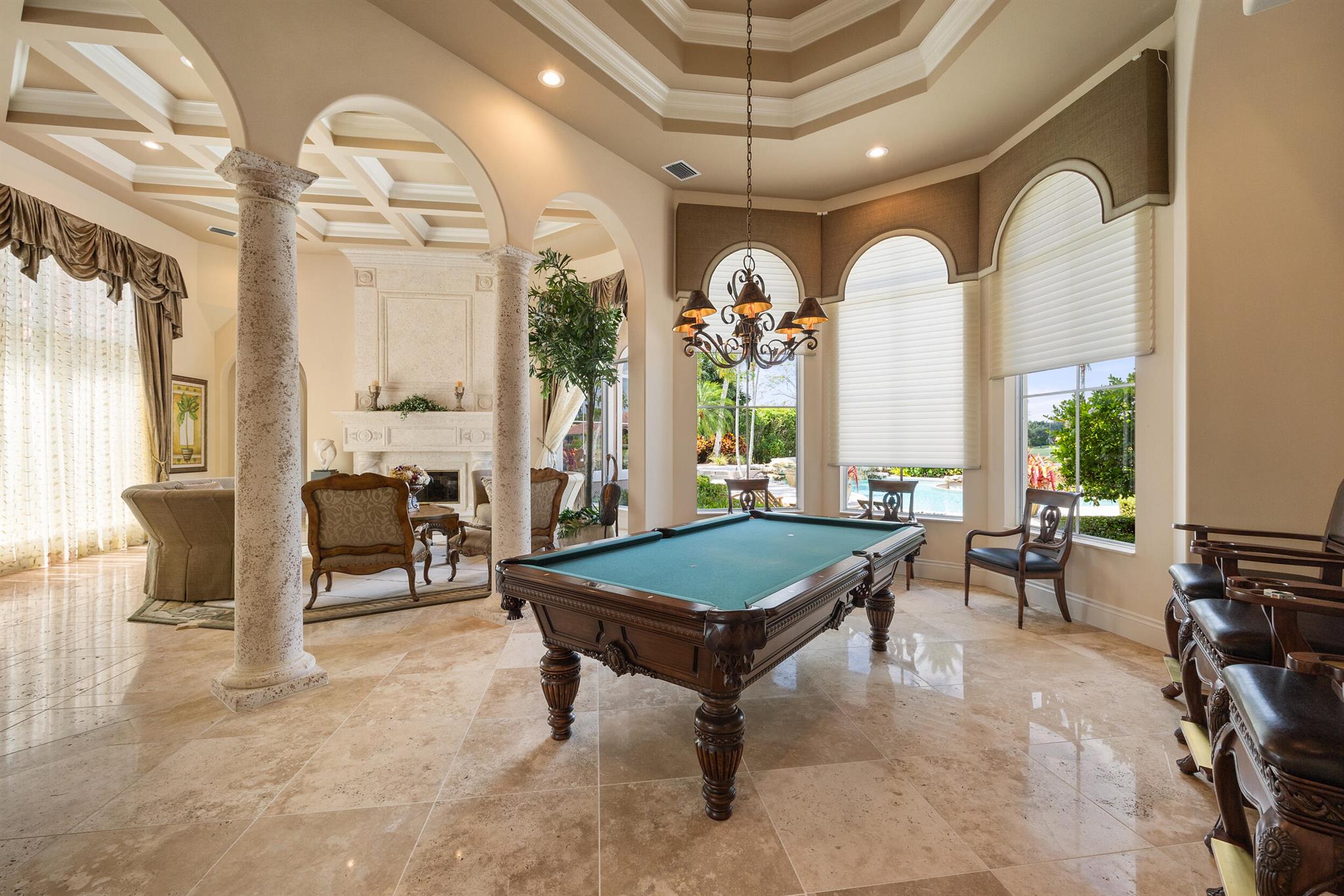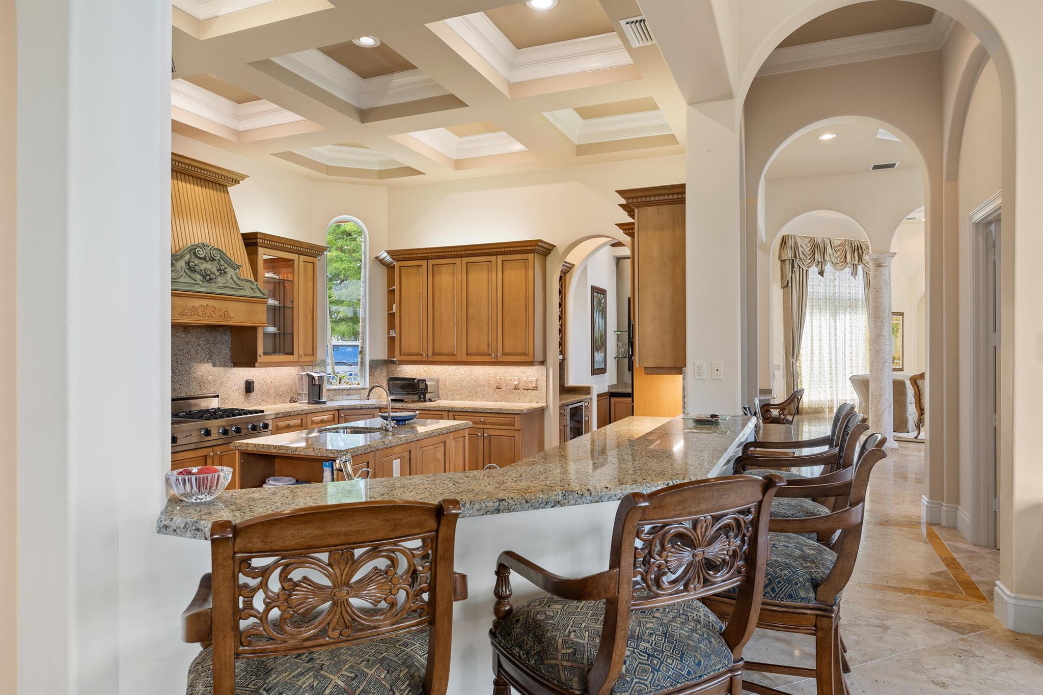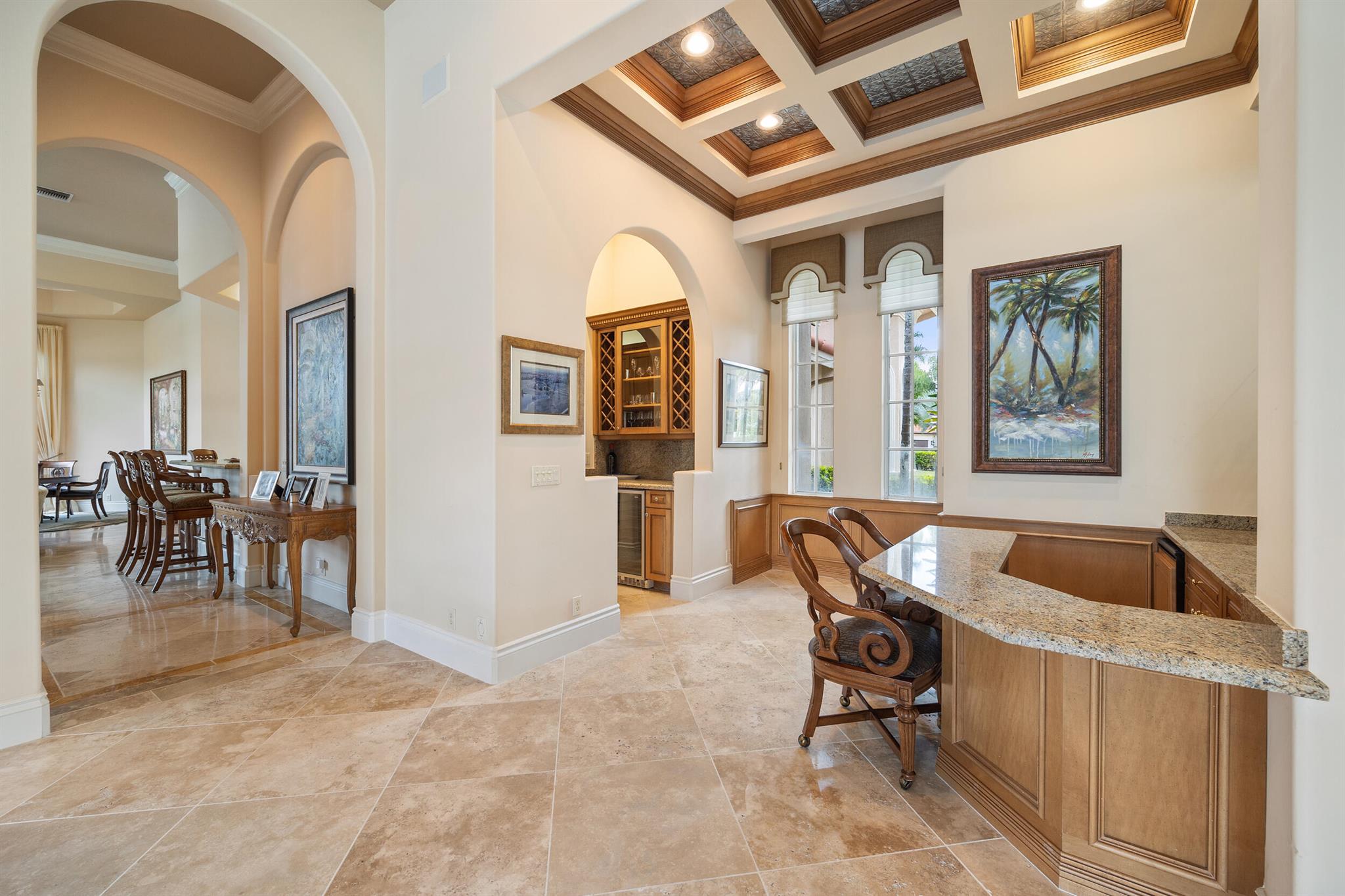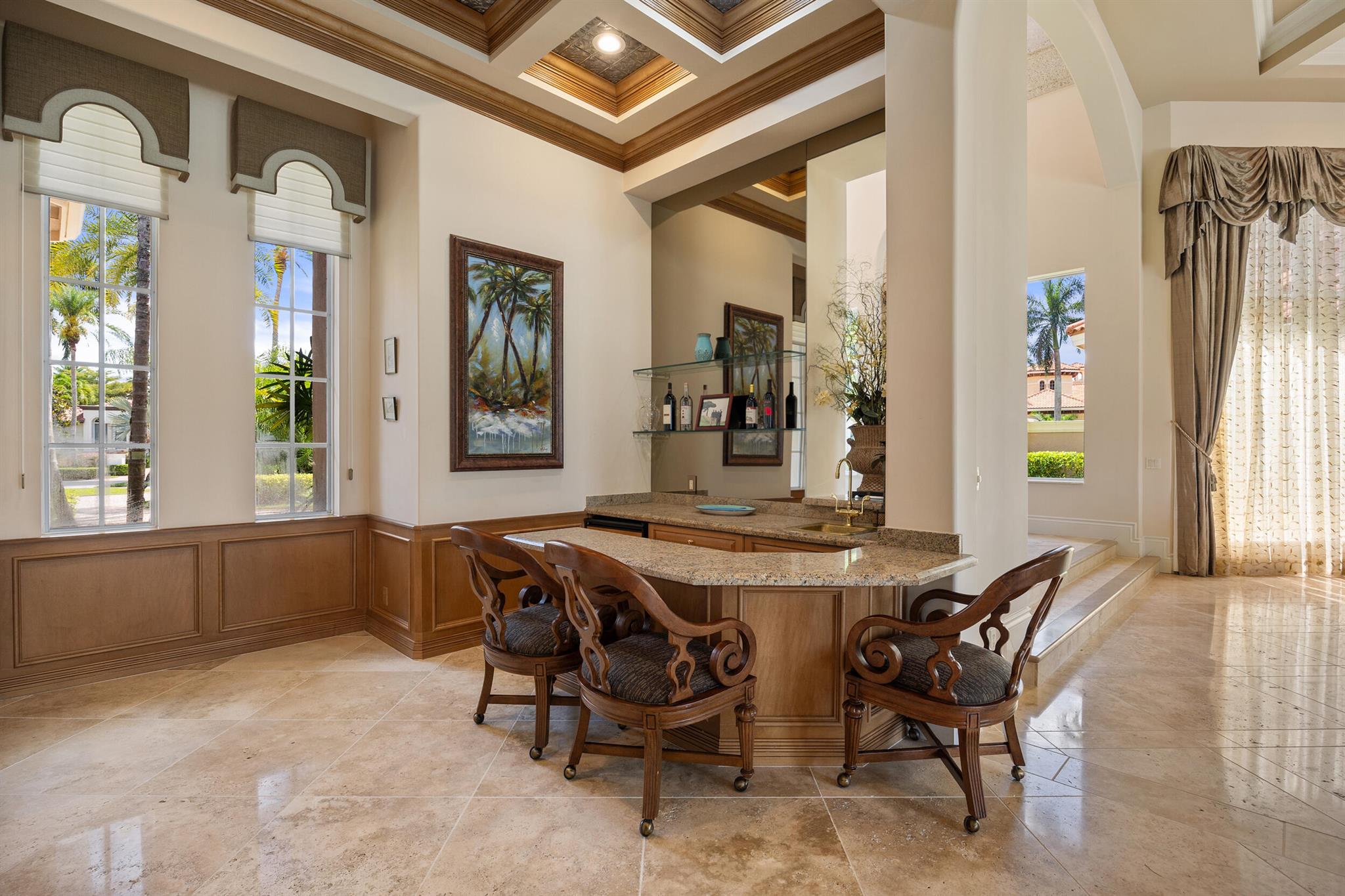 Meticulously kept residence in the exclusive Eagle Isle community. Enjoy Florida living with outstanding backyard water and award winning Jack Nicklaus-designed Legend Course views. From the moment you walk through the custom double doors you will notice the attention to detail with custom architectural and craftsmanship details. Impressive interior finishes throughout the home include coffered ceiling, crown molding, dramatic inlays, columns, stone fireplace and Saturnia floors. Hurricane windows and doors. Office is adorned with custom wood-paneled walls and plantation wood shutters. Gourmet kitchen with granite countertops, 2 dishwashers and 2 sinks and a butler's pantry. Separate sit down bar.