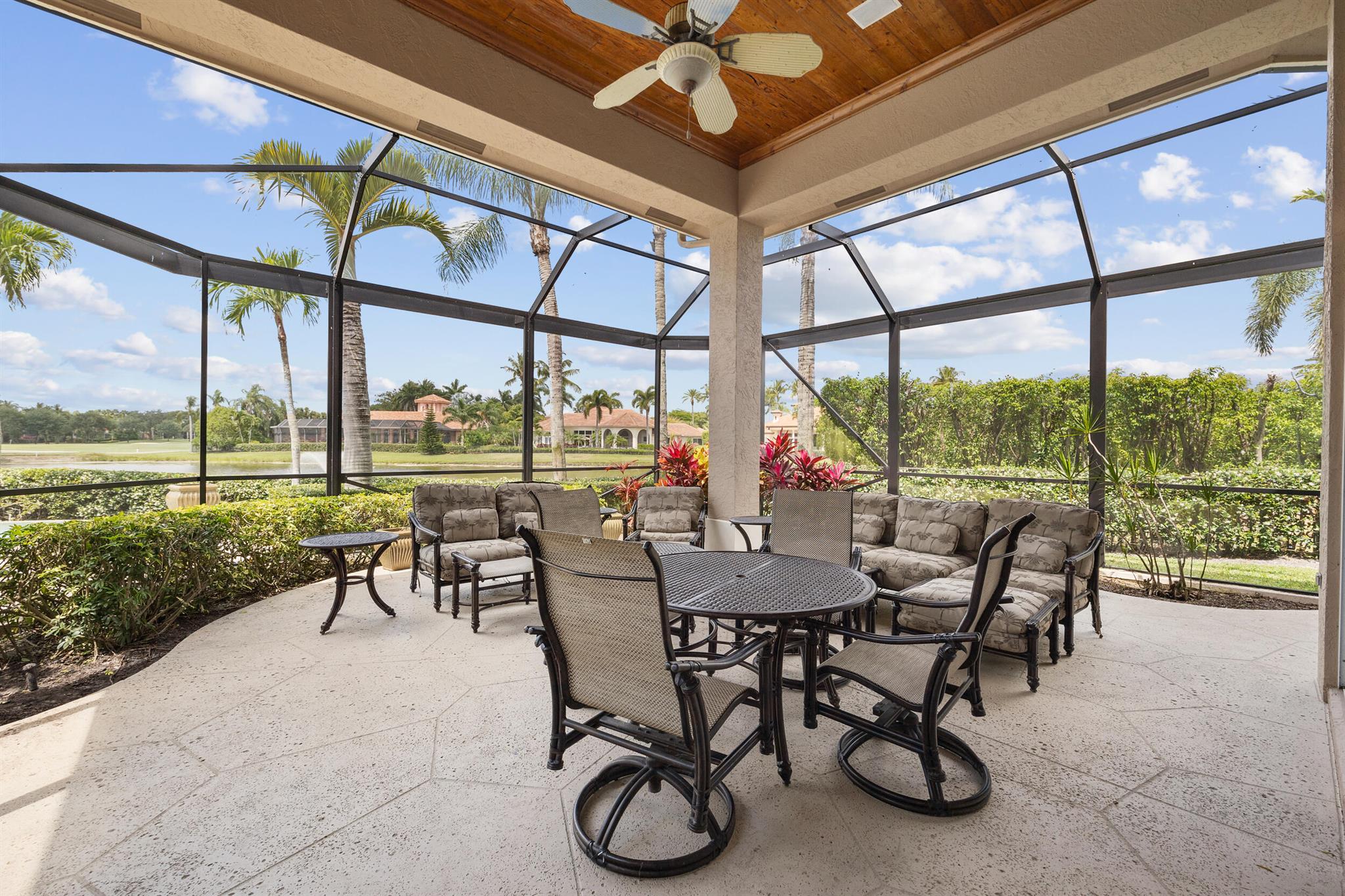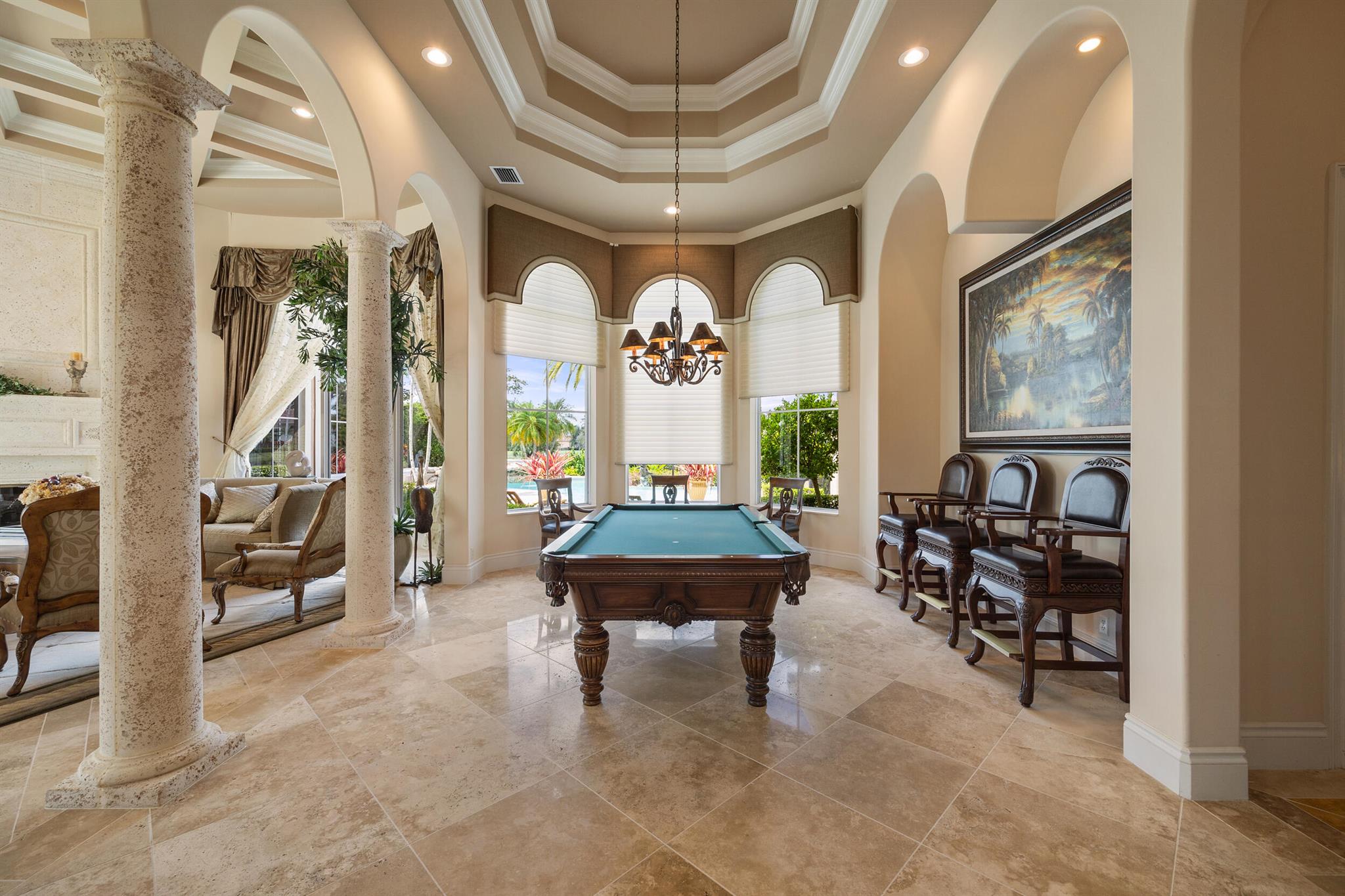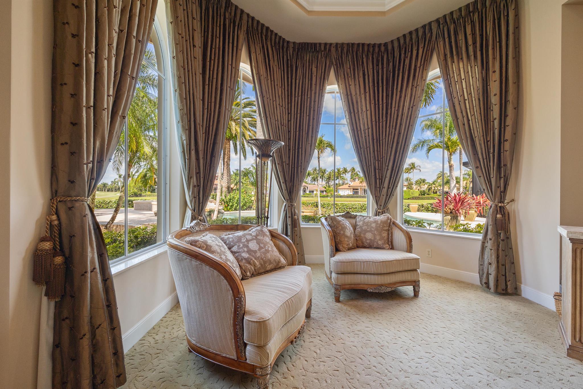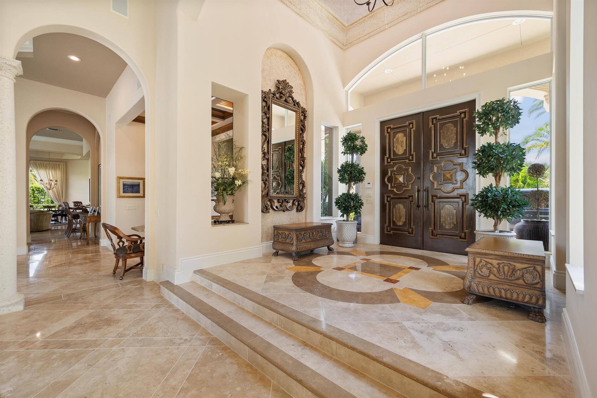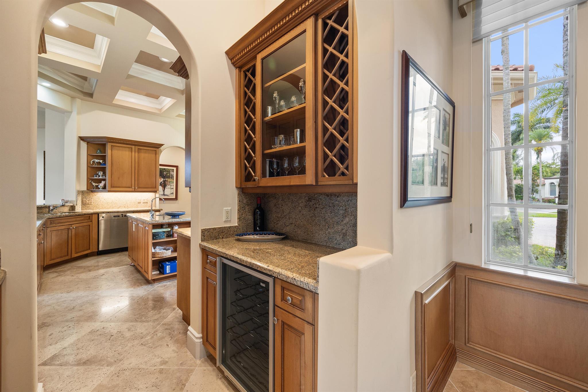 Meticulously kept residence in the exclusive Eagle Isle community. Enjoy Florida living with outstanding backyard water and award winning Jack Nicklaus-designed Legend Course views. From the moment you walk through the custom double doors you will notice the attention to detail with custom architectural and craftsmanship details. Impressive interior finishes throughout the home include coffered ceiling, crown molding, dramatic inlays, columns, stone fireplace and Saturnia floors. Hurricane windows and doors. Office is adorned with custom wood-paneled walls and plantation wood shutters. Gourmet kitchen with granite countertops, 2 dishwashers and 2 sinks and a butler's pantry. Separate sit down bar.
