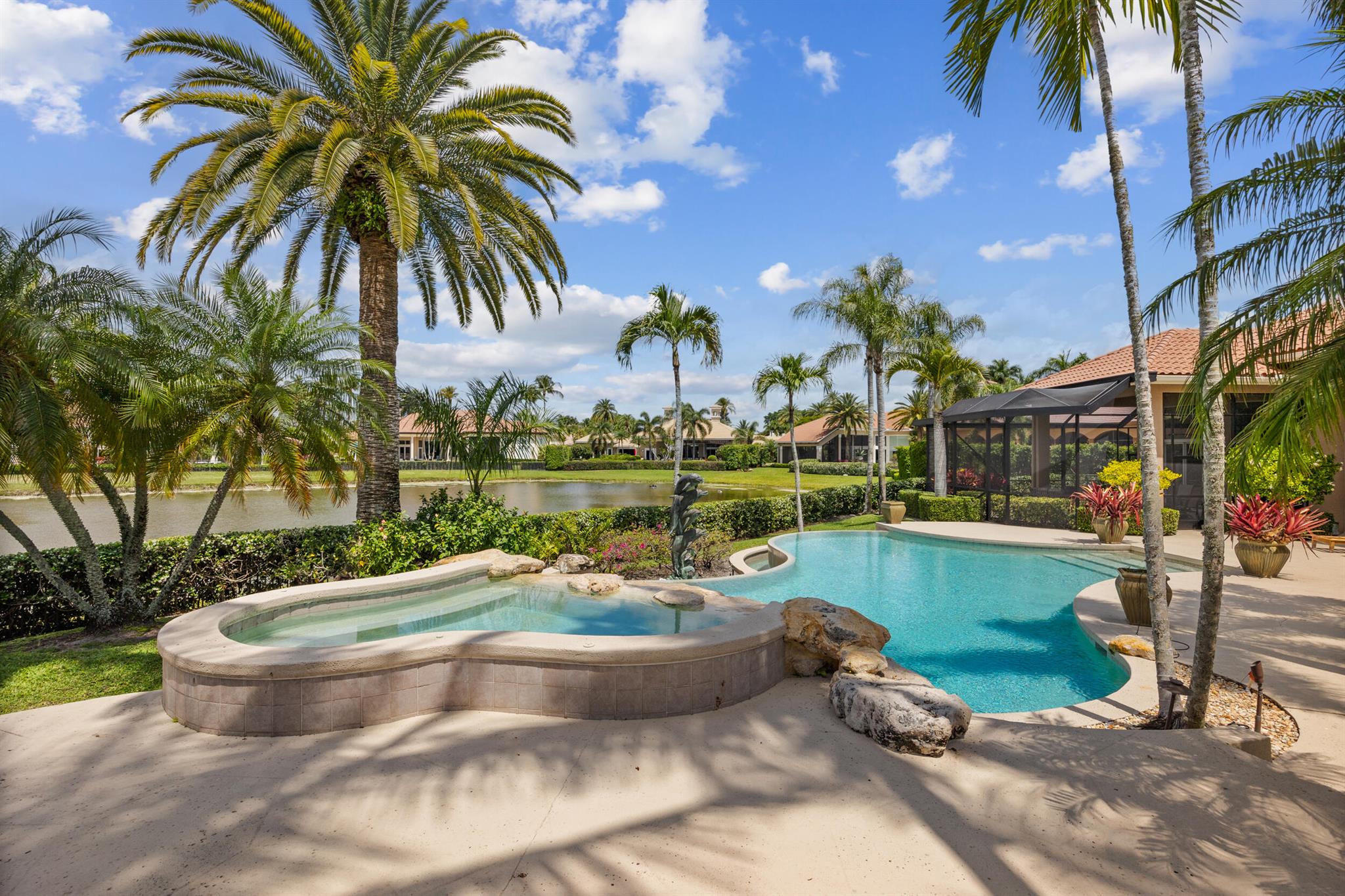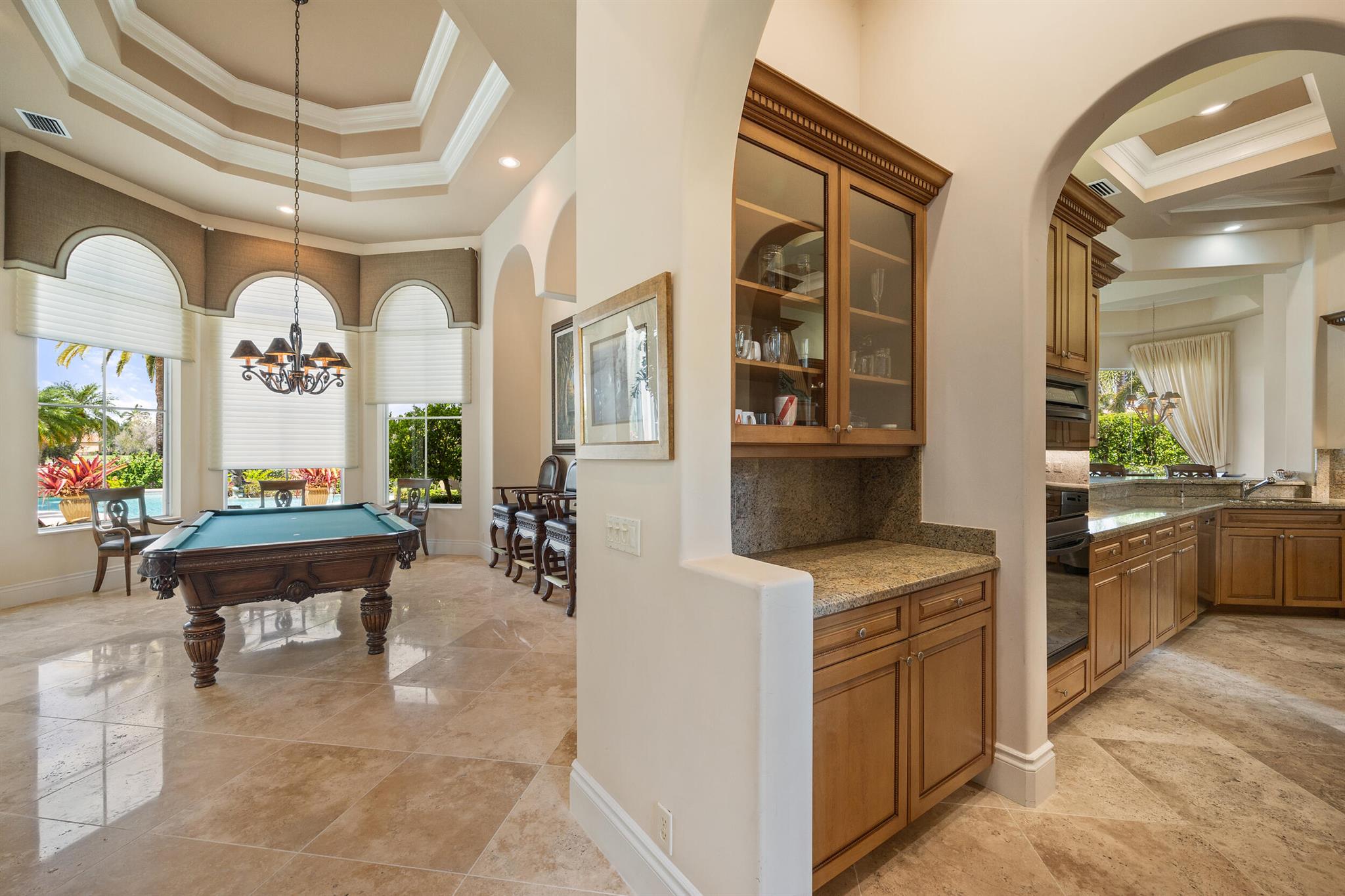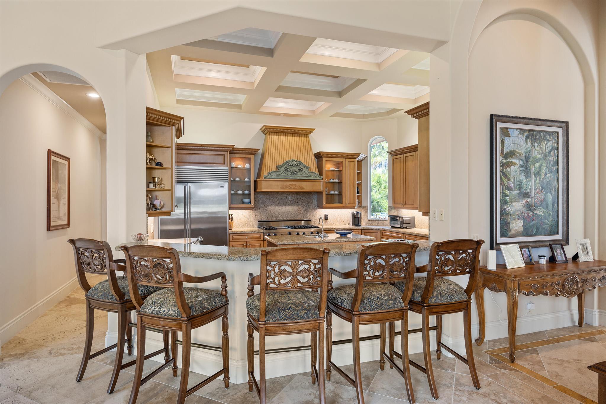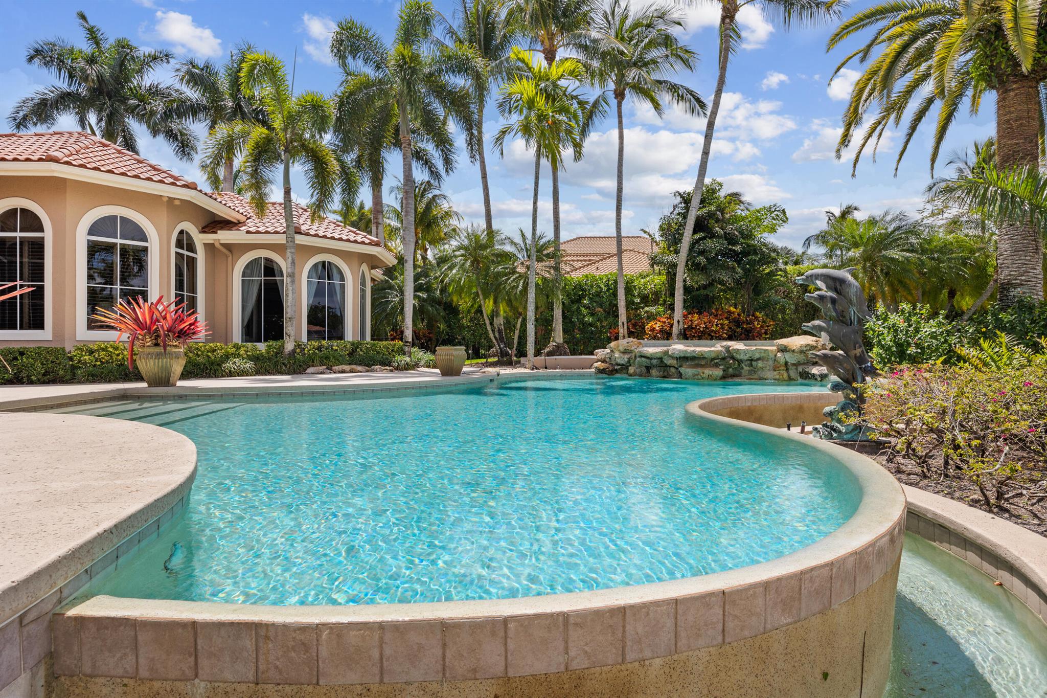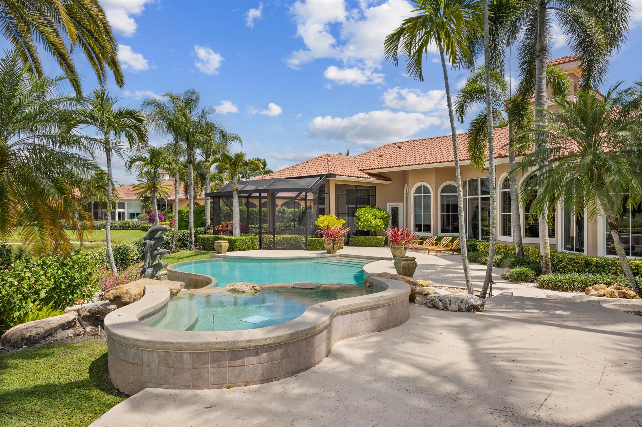 Meticulously kept residence in the exclusive Eagle Isle community. Enjoy Florida living with outstanding backyard water and award winning Jack Nicklaus-designed Legend Course views. From the moment you walk through the custom double doors you will notice the attention to detail with custom architectural and craftsmanship details. Impressive interior finishes throughout the home include coffered ceiling, crown molding, dramatic inlays, columns, stone fireplace and Saturnia floors. Hurricane windows and doors. Office is adorned with custom wood-paneled walls and plantation wood shutters. Gourmet kitchen with granite countertops, 2 dishwashers and 2 sinks and a butler's pantry. Separate sit down bar.