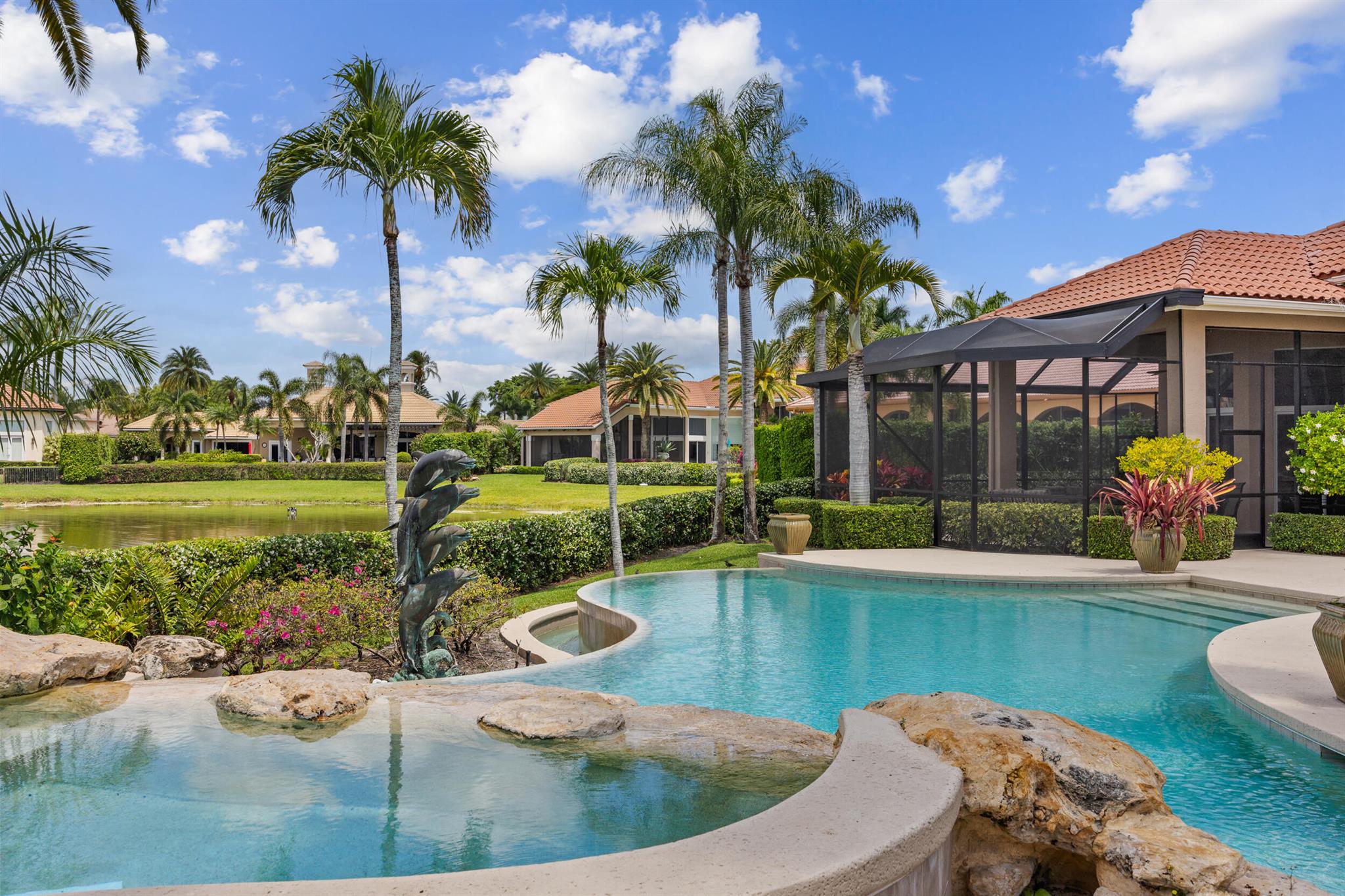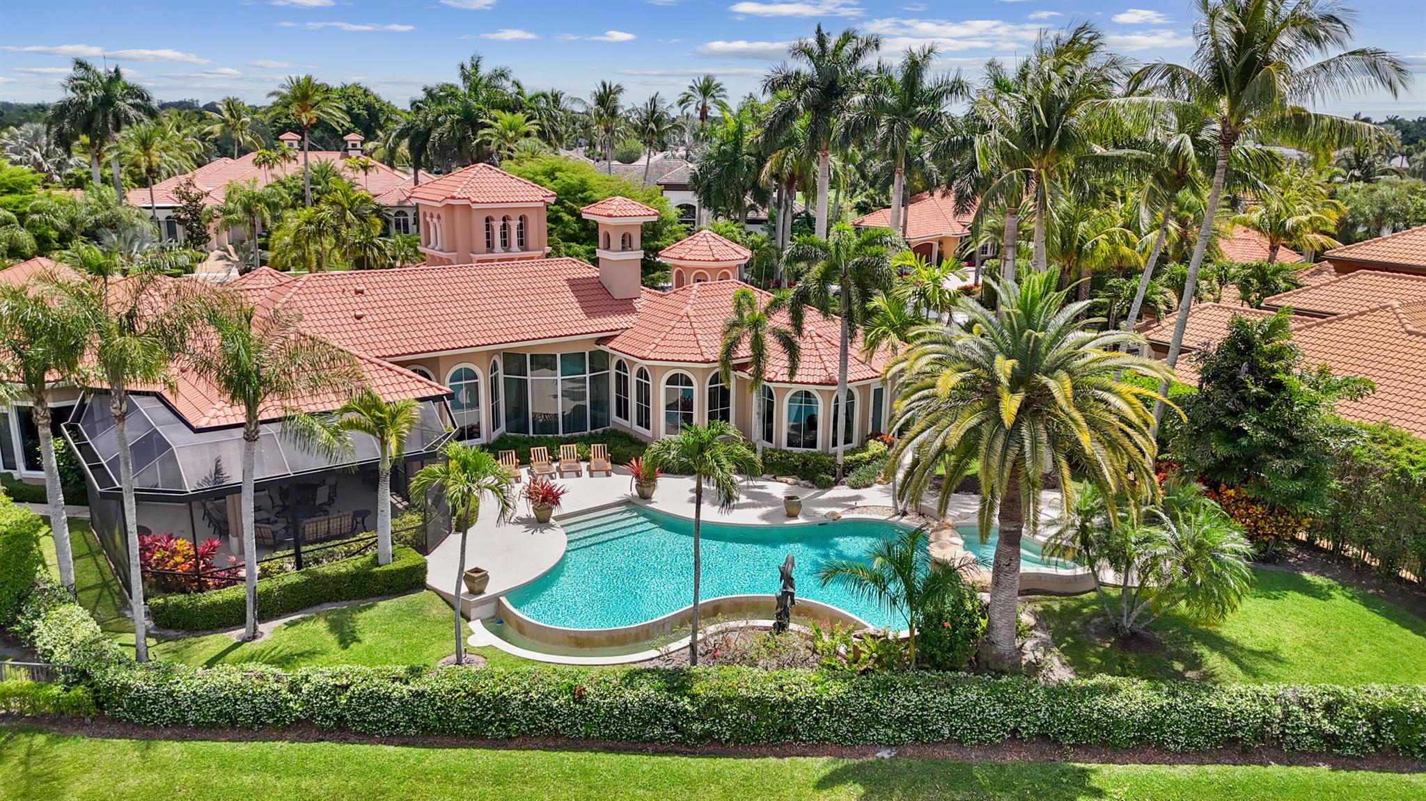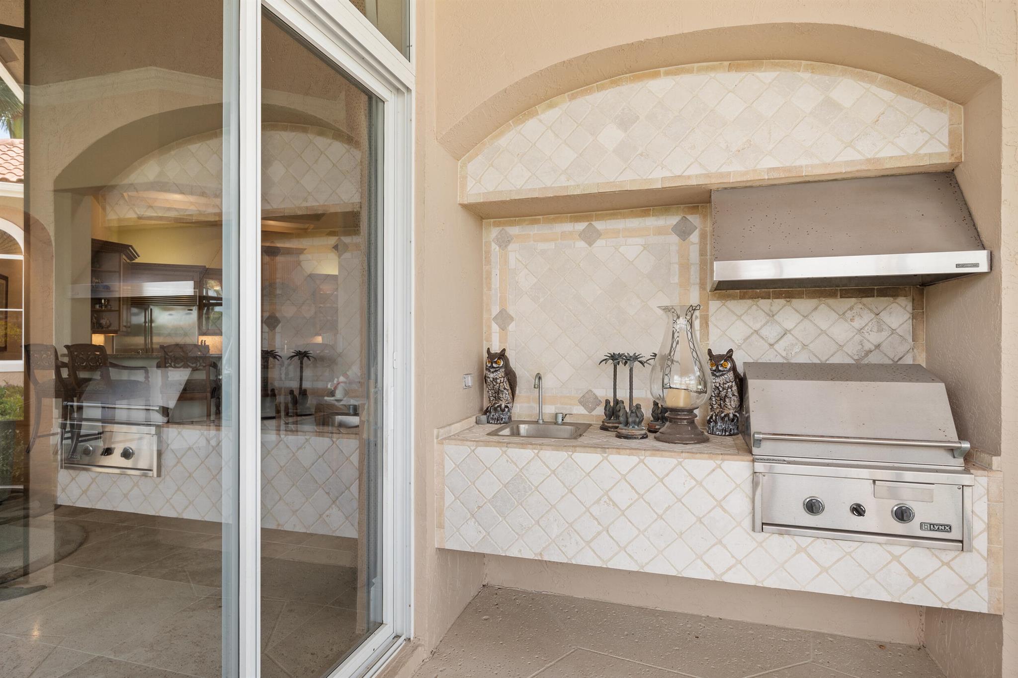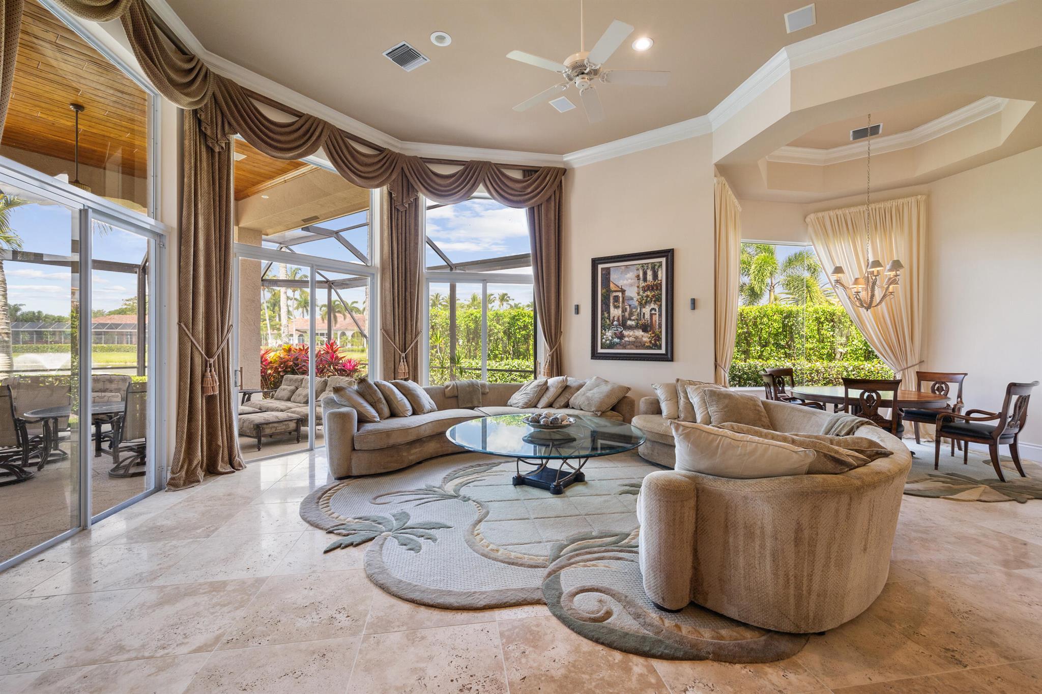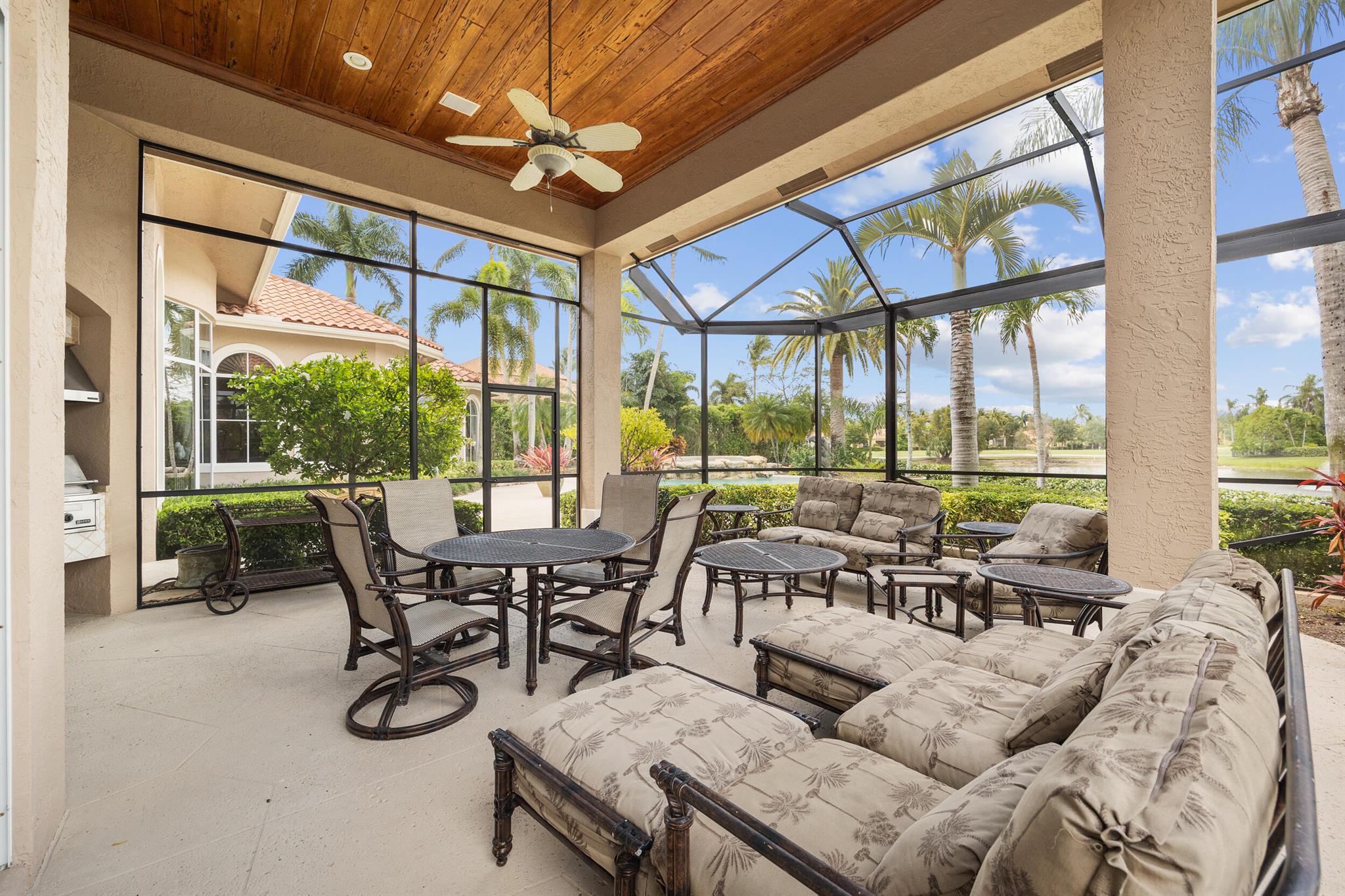 Meticulously kept residence in the exclusive Eagle Isle community. Enjoy Florida living with outstanding backyard water and award winning Jack Nicklaus-designed Legend Course views. From the moment you walk through the custom double doors you will notice the attention to detail with custom architectural and craftsmanship details. Impressive interior finishes throughout the home include coffered ceiling, crown molding, dramatic inlays, columns, stone fireplace and Saturnia floors. Hurricane windows and doors. Office is adorned with custom wood-paneled walls and plantation wood shutters. Gourmet kitchen with granite countertops, 2 dishwashers and 2 sinks and a butler's pantry. Separate sit down bar.