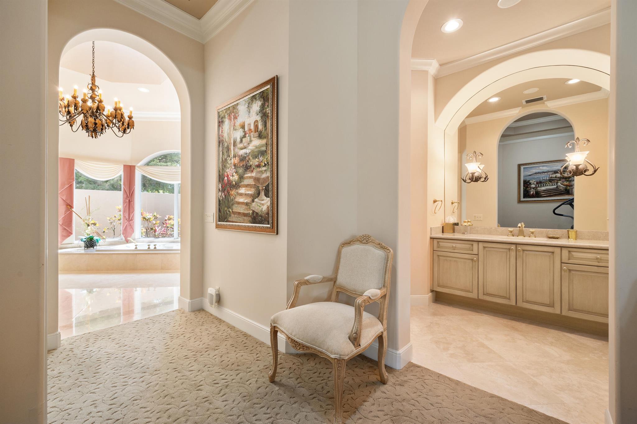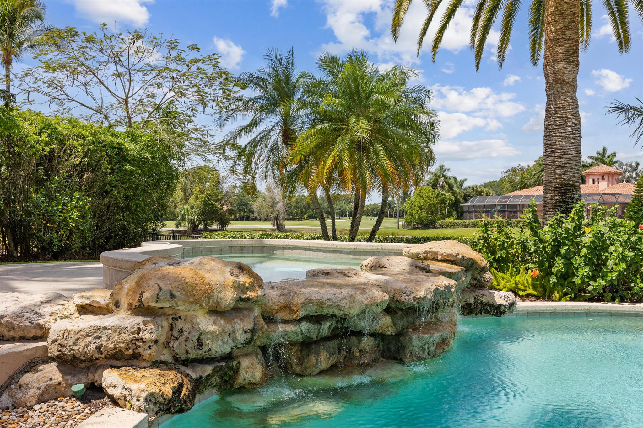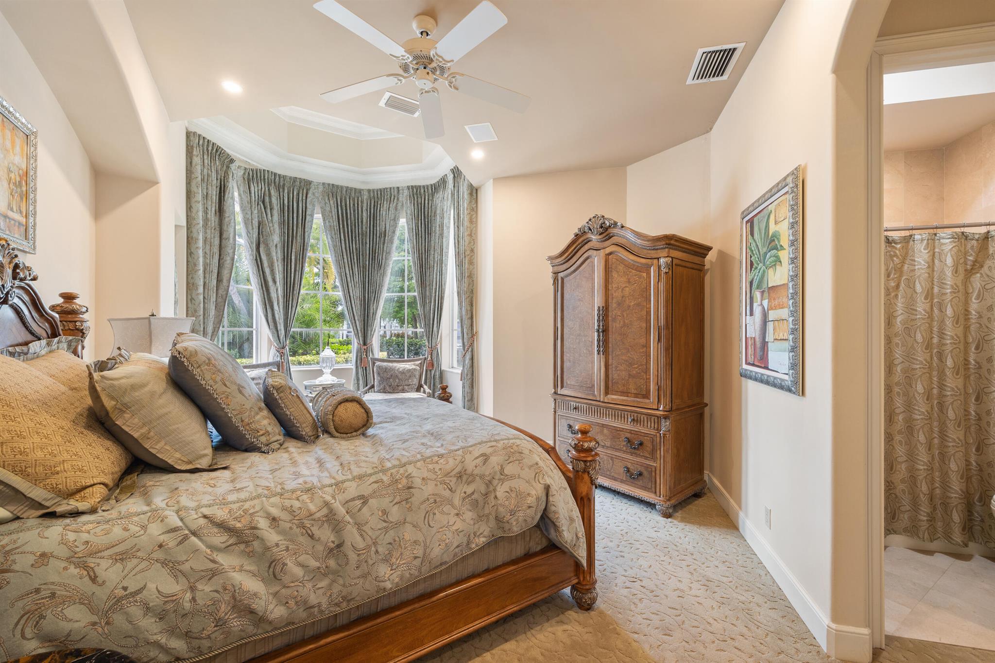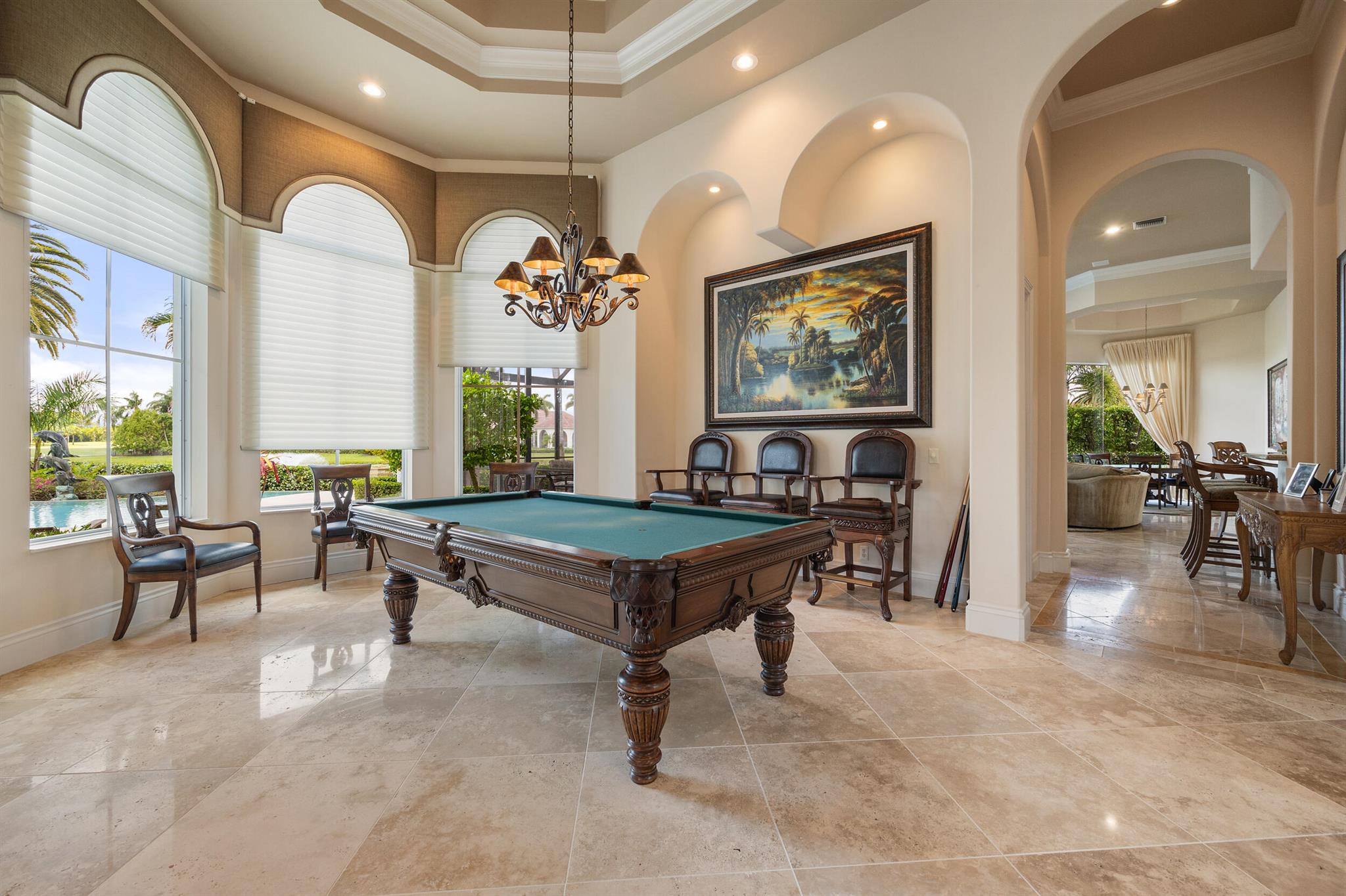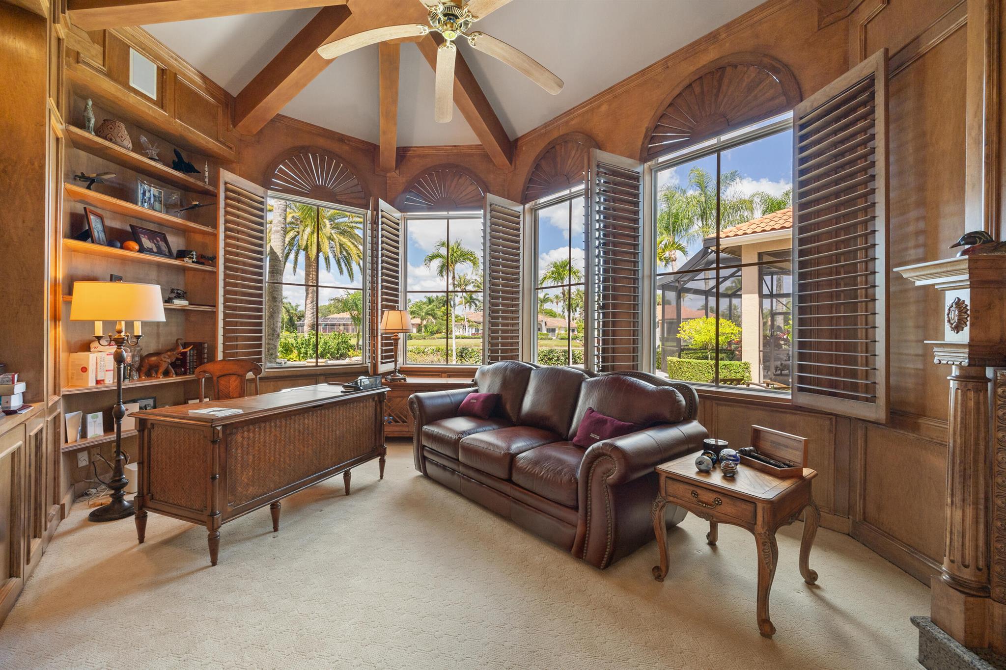 Meticulously kept residence in the exclusive Eagle Isle community. Enjoy Florida living with outstanding backyard water and award winning Jack Nicklaus-designed Legend Course views. From the moment you walk through the custom double doors you will notice the attention to detail with custom architectural and craftsmanship details. Impressive interior finishes throughout the home include coffered ceiling, crown molding, dramatic inlays, columns, stone fireplace and Saturnia floors. Hurricane windows and doors. Office is adorned with custom wood-paneled walls and plantation wood shutters. Gourmet kitchen with granite countertops, 2 dishwashers and 2 sinks and a butler's pantry. Separate sit down bar.