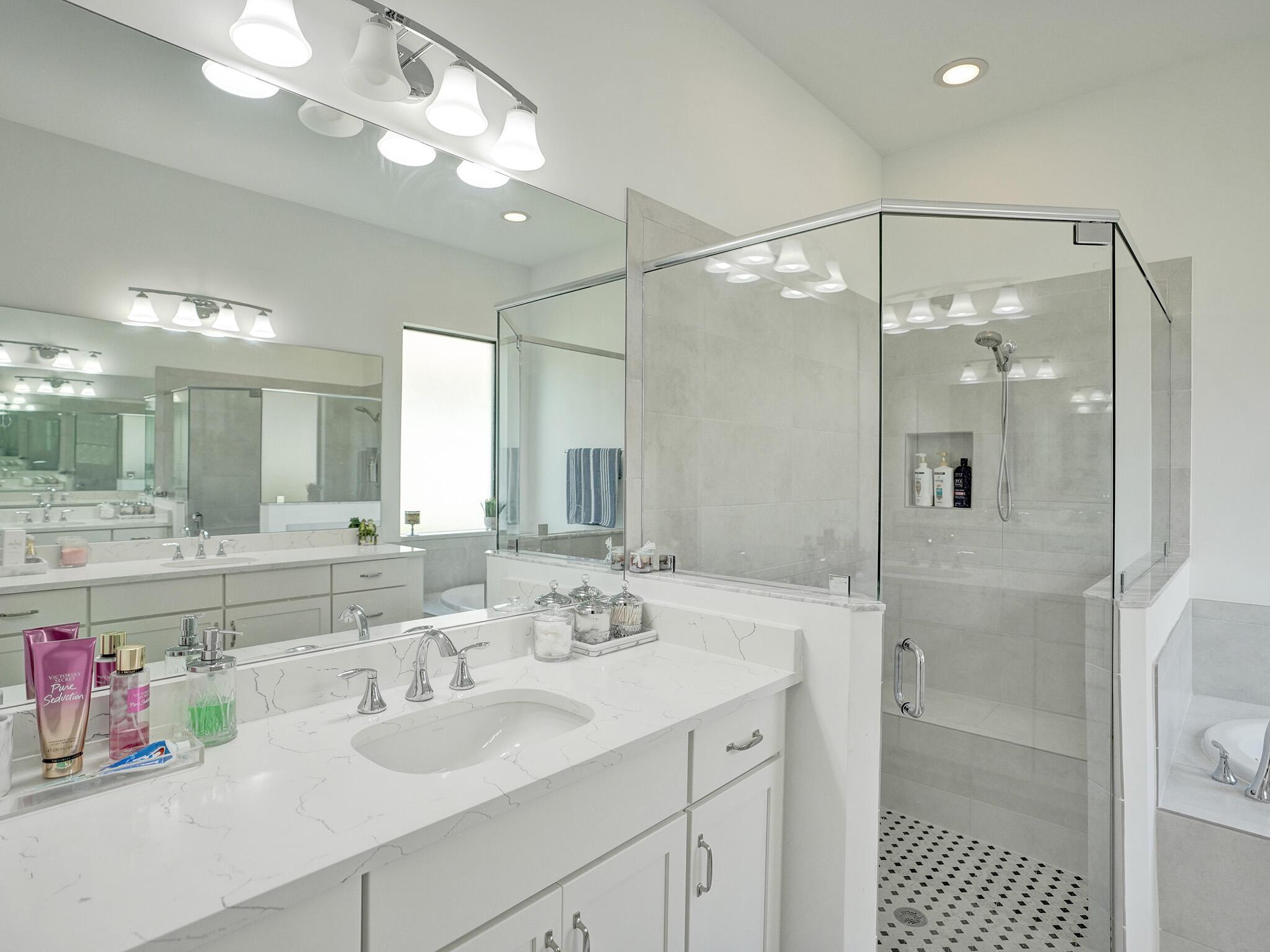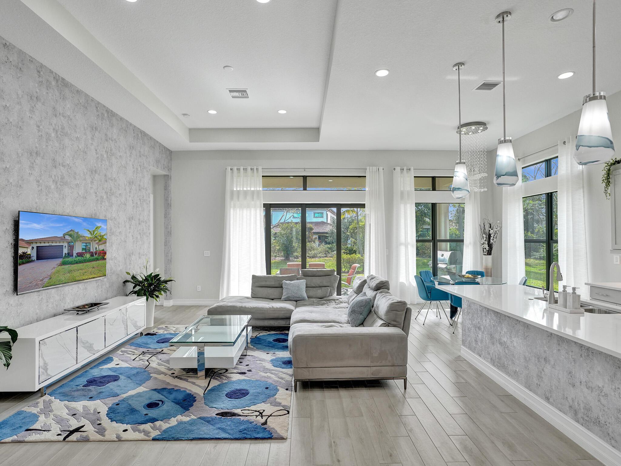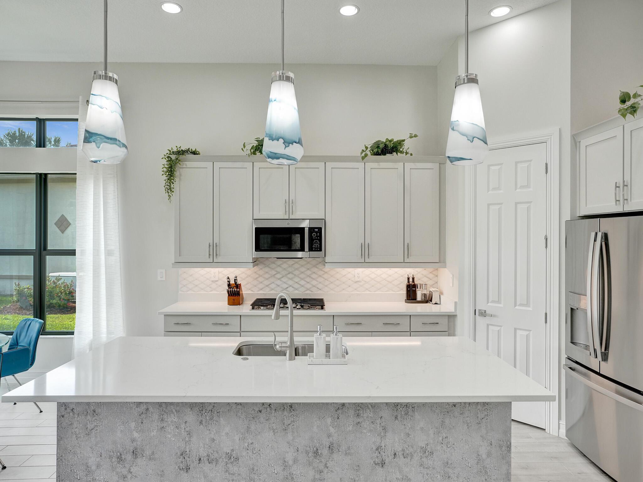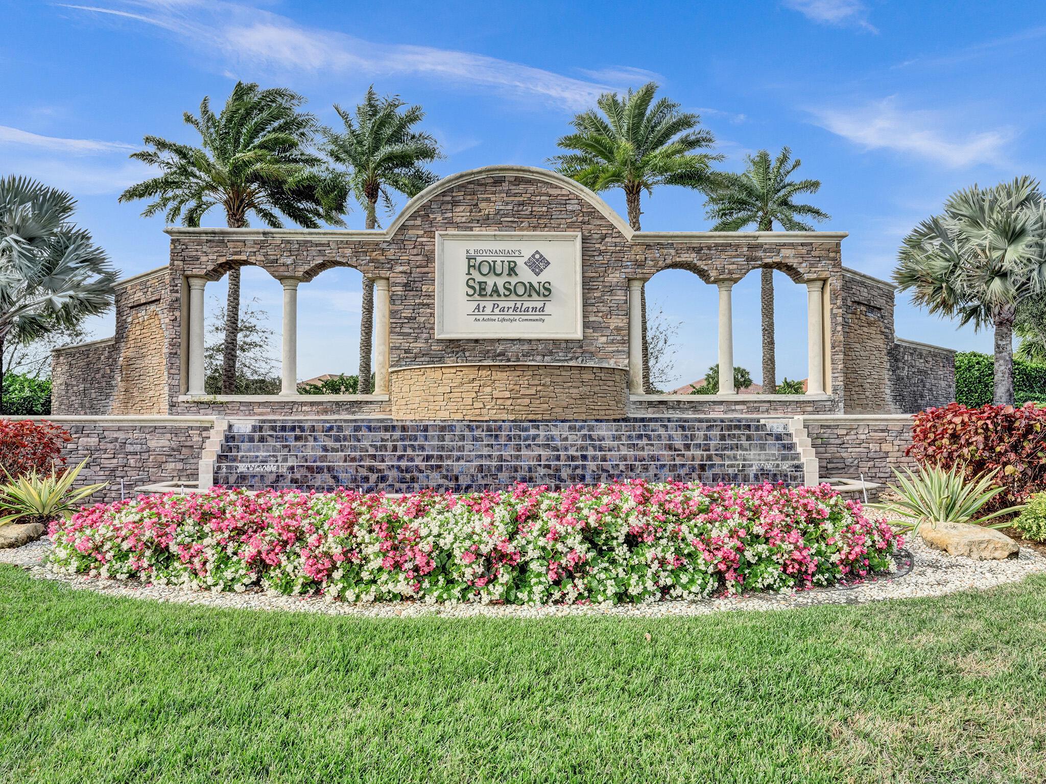 Upgrades Galore in this Gem! Experience luxury living in this tastefully-upgraded home located in the highly sought-after Four Seasons Community. Two bedrooms with its own en-suite bathrooms, plus a versatile den that's perfect for a home office or guest room. Top-notch finishes throughout: Exquisite tiled flooring in the living areas and high-quality vinyl flooring in the bedrooms. Kitchen features sleek quartz countertops, upgraded LED lighting, and stainless steel appliances. WiFi thermostat, motorized shades, dimming switches. Stunning wallpaper accents throughout. Sits on an oversized pie-shaped lot, ample space and prewiring for a pool. Comes with an oversized Weber Grill and located near the community entrance. See documents for HOA amenities and what's included in the monthly HOA