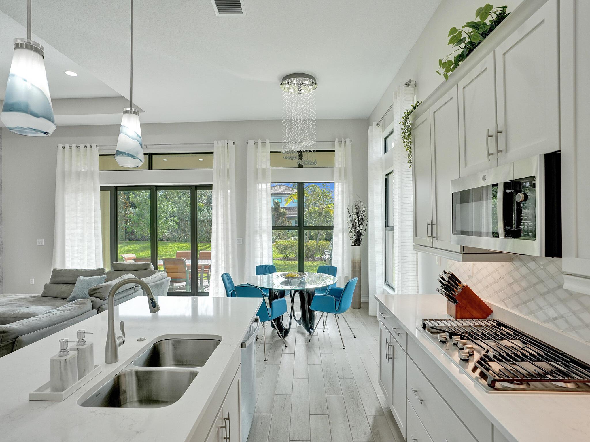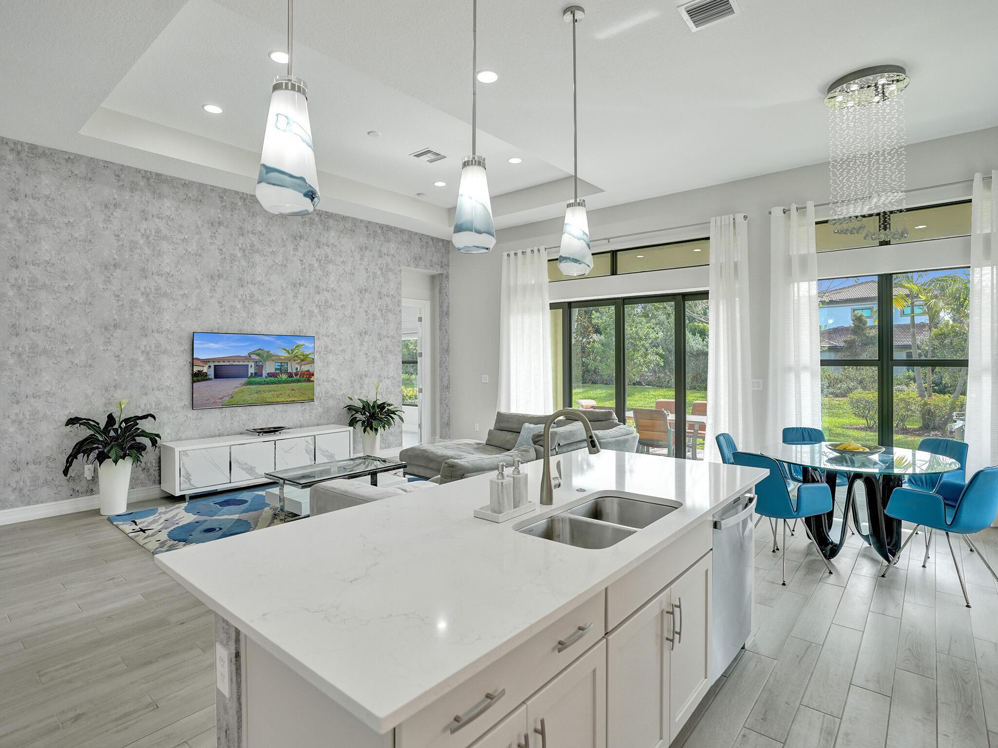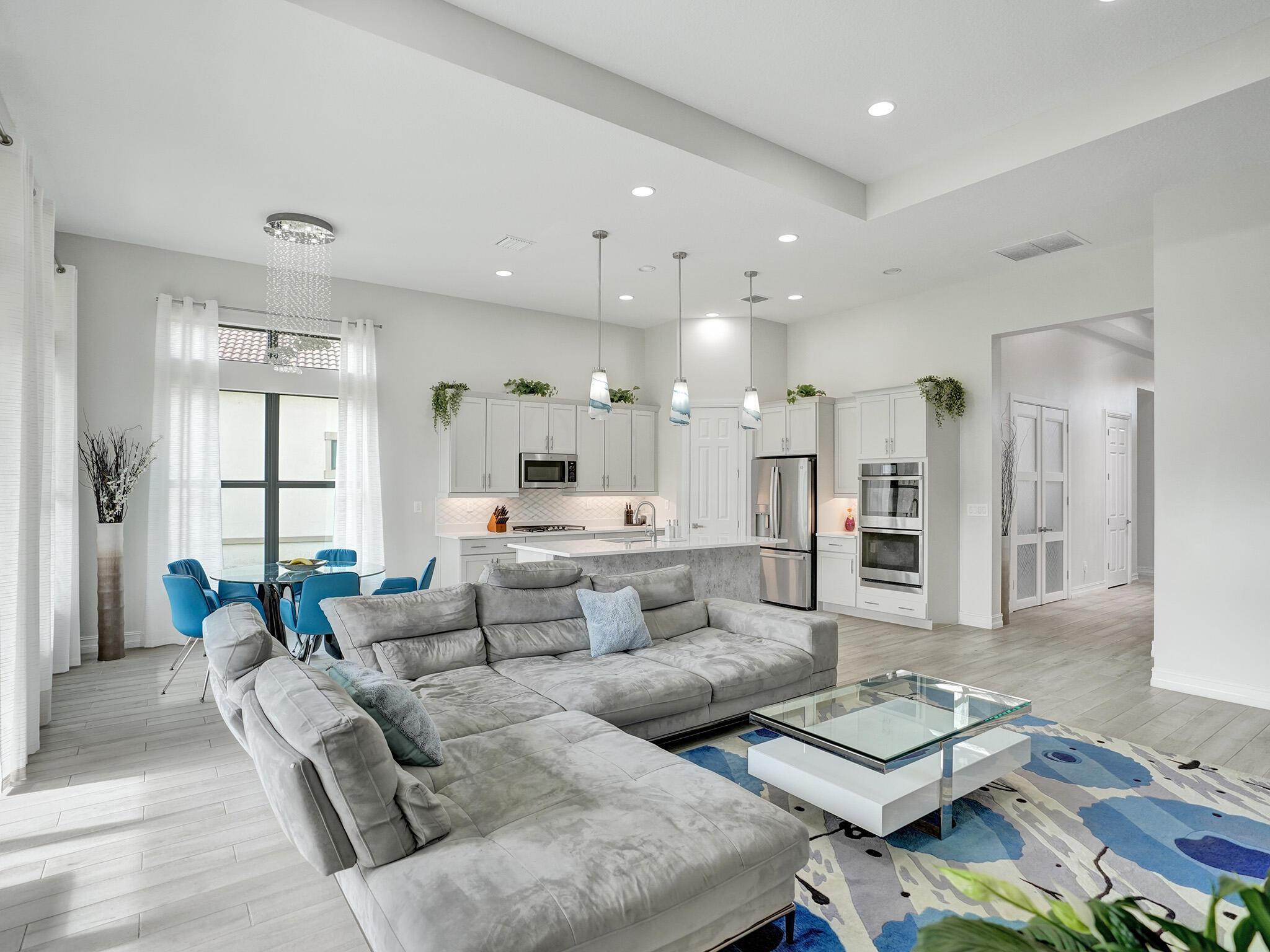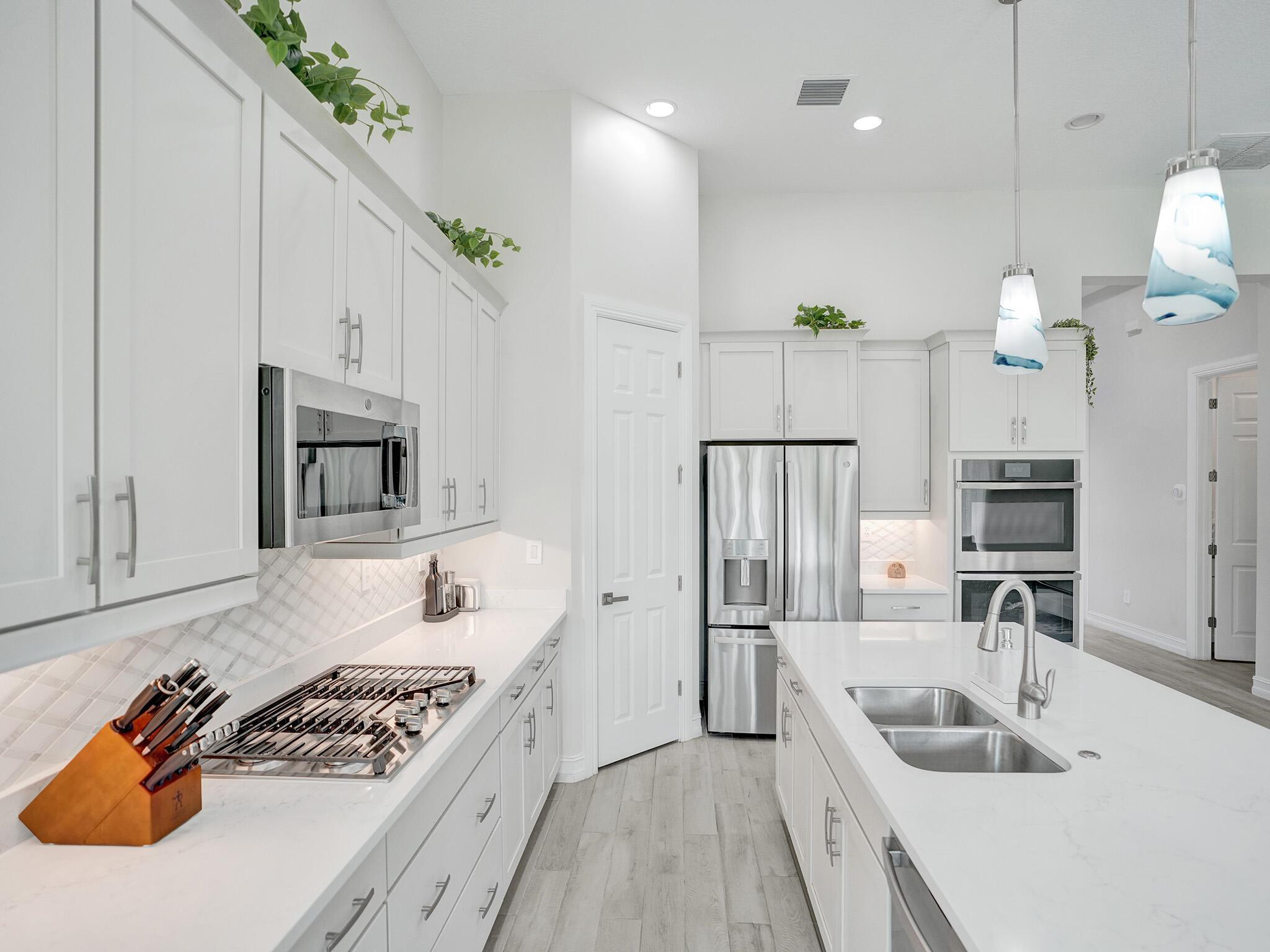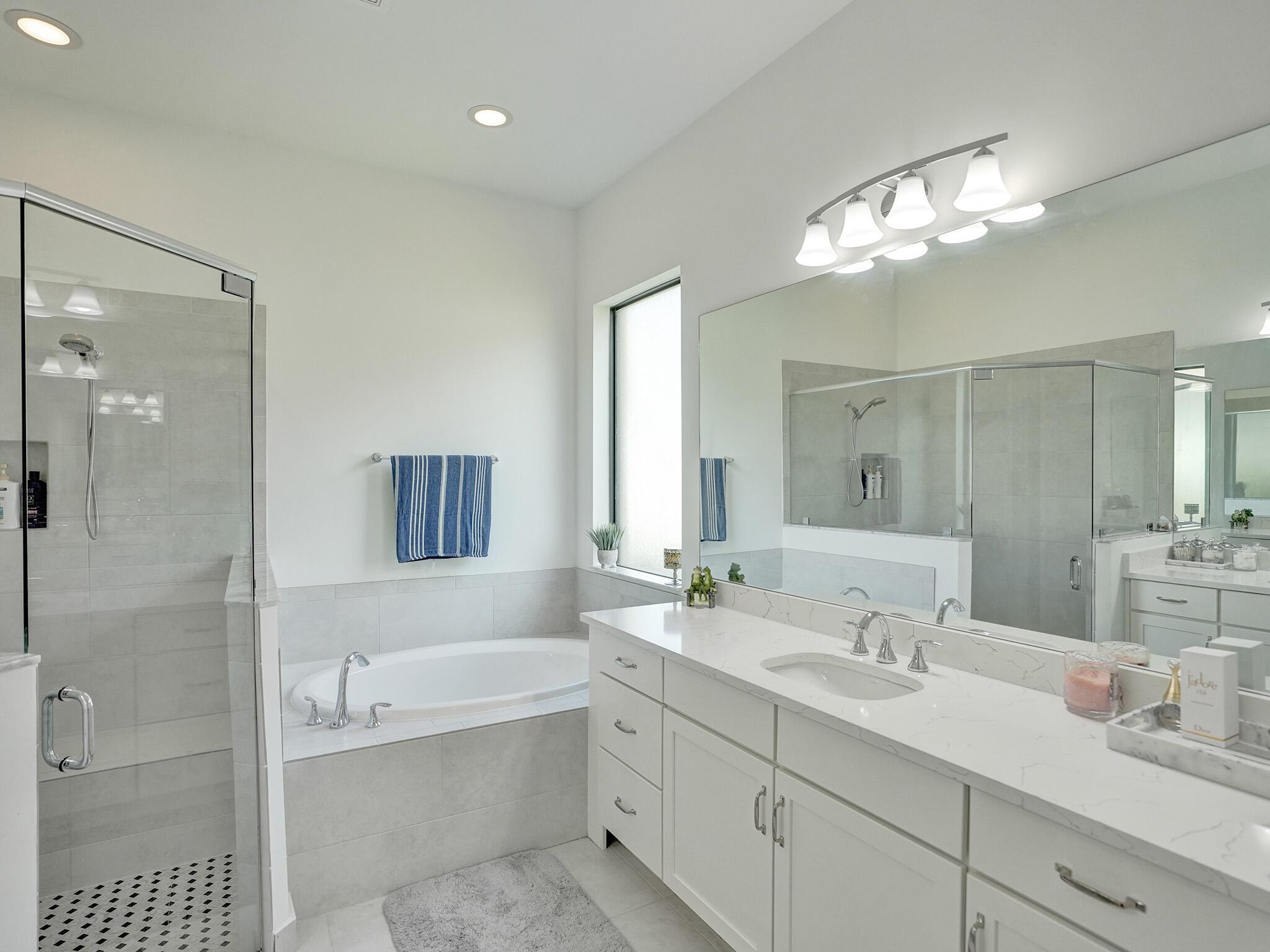 Upgrades Galore in this Gem! Experience luxury living in this tastefully-upgraded home located in the highly sought-after Four Seasons Community. Two bedrooms with its own en-suite bathrooms, plus a versatile den that's perfect for a home office or guest room. Top-notch finishes throughout: Exquisite tiled flooring in the living areas and high-quality vinyl flooring in the bedrooms. Kitchen features sleek quartz countertops, upgraded LED lighting, and stainless steel appliances. WiFi thermostat, motorized shades, dimming switches. Stunning wallpaper accents throughout. Sits on an oversized pie-shaped lot, ample space and prewiring for a pool. Comes with an oversized Weber Grill and located near the community entrance. See documents for HOA amenities and what's included in the monthly HOA