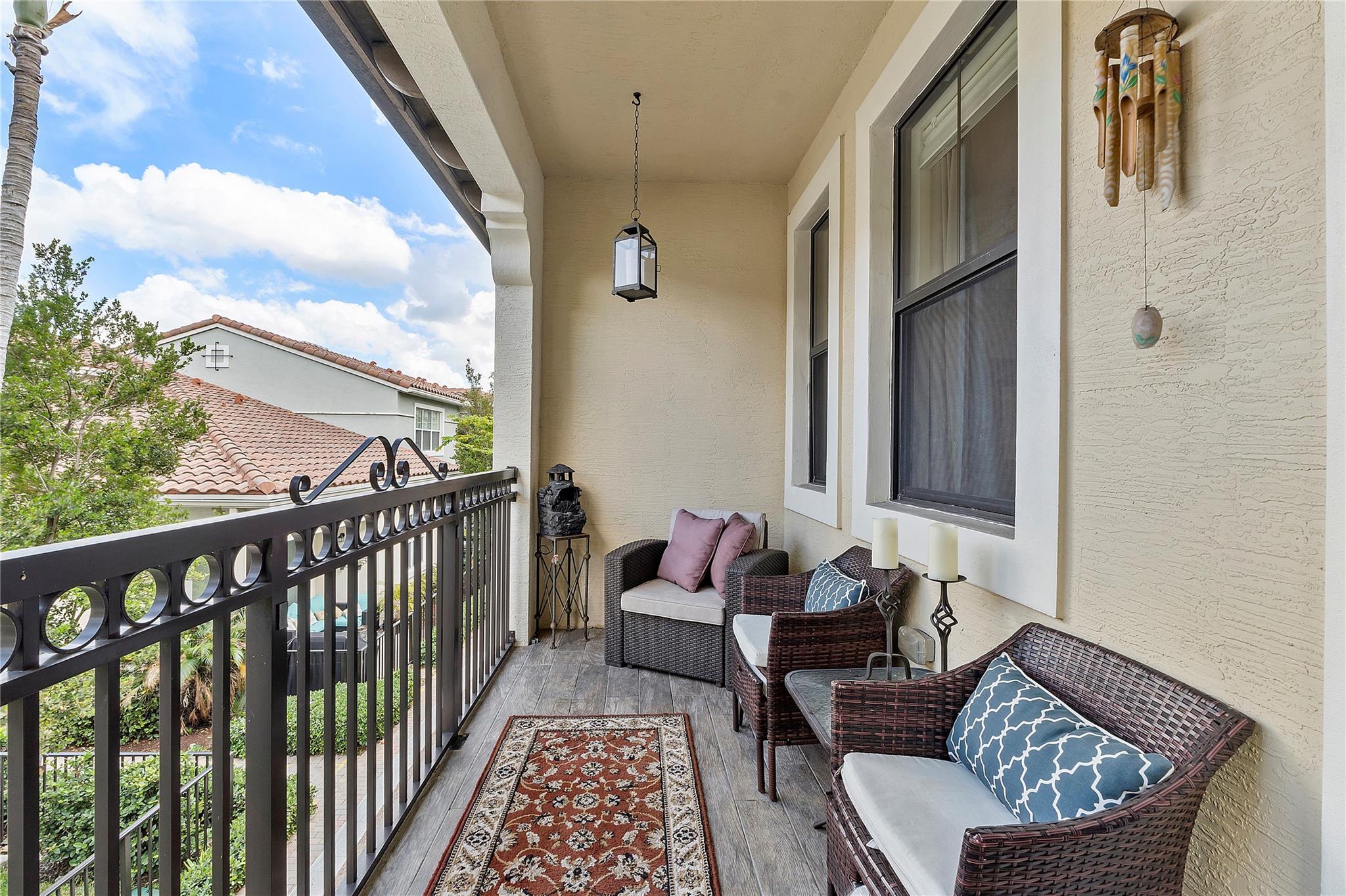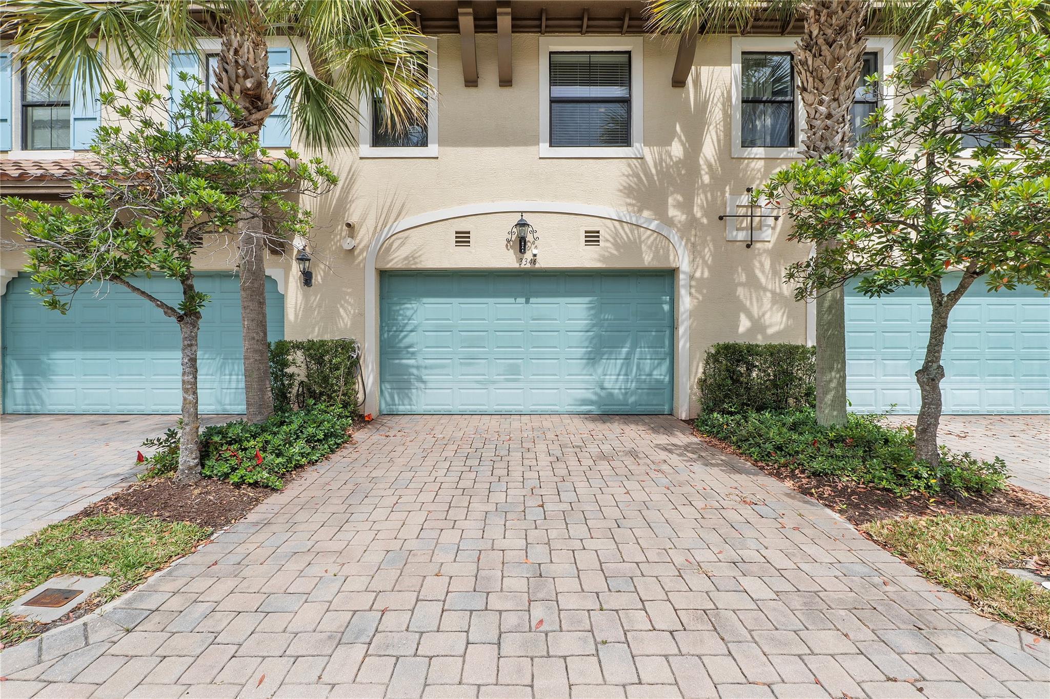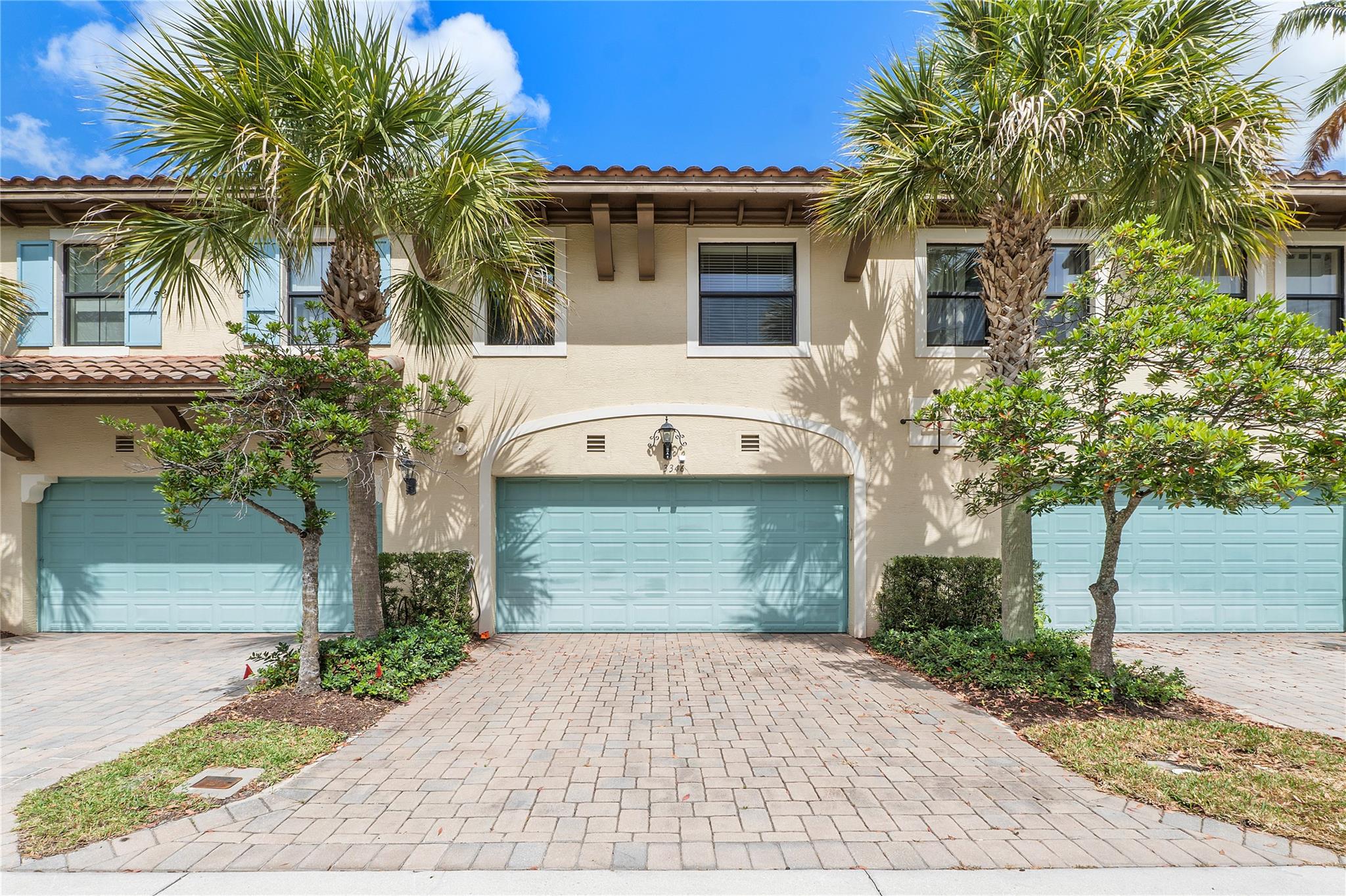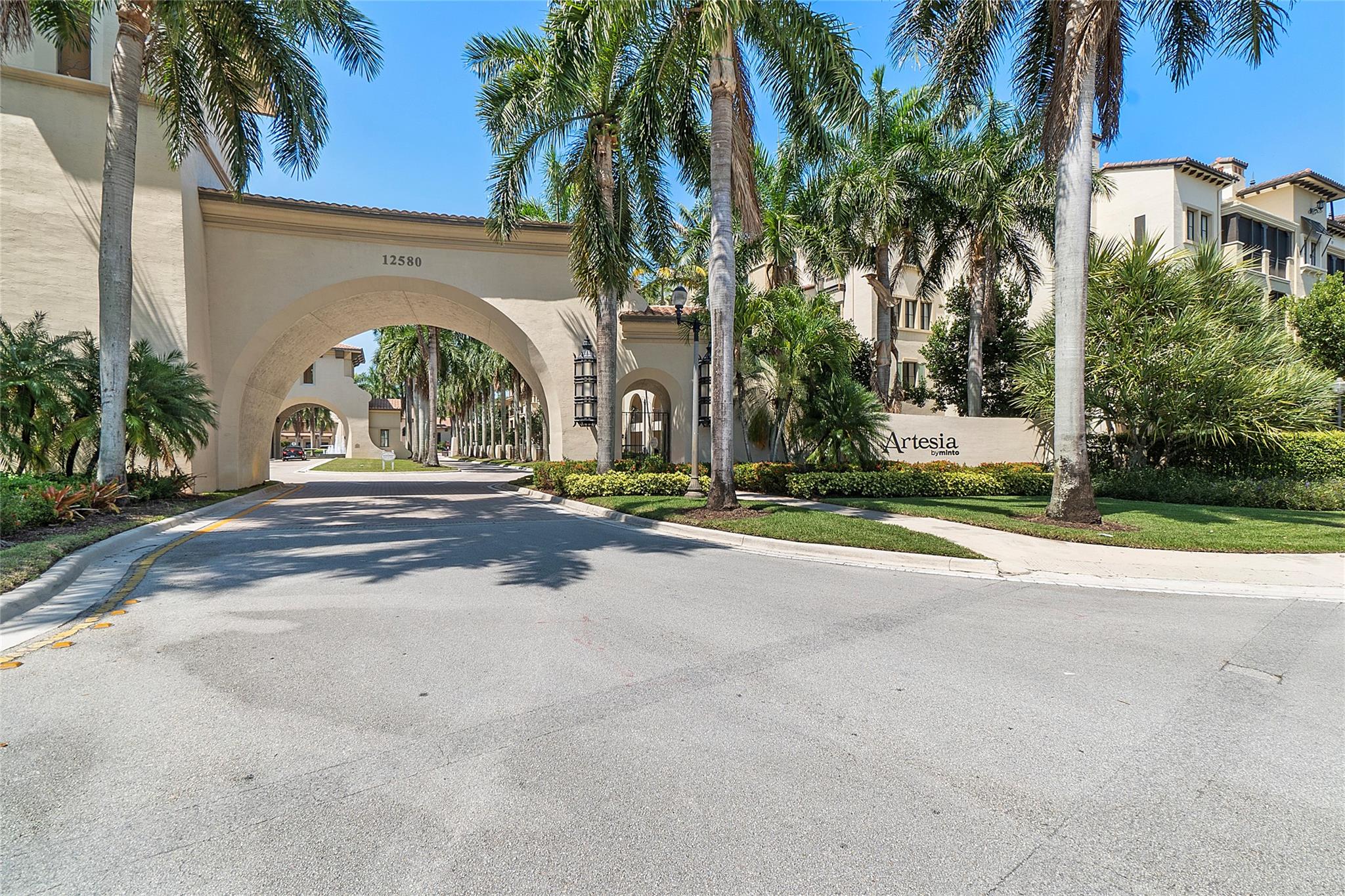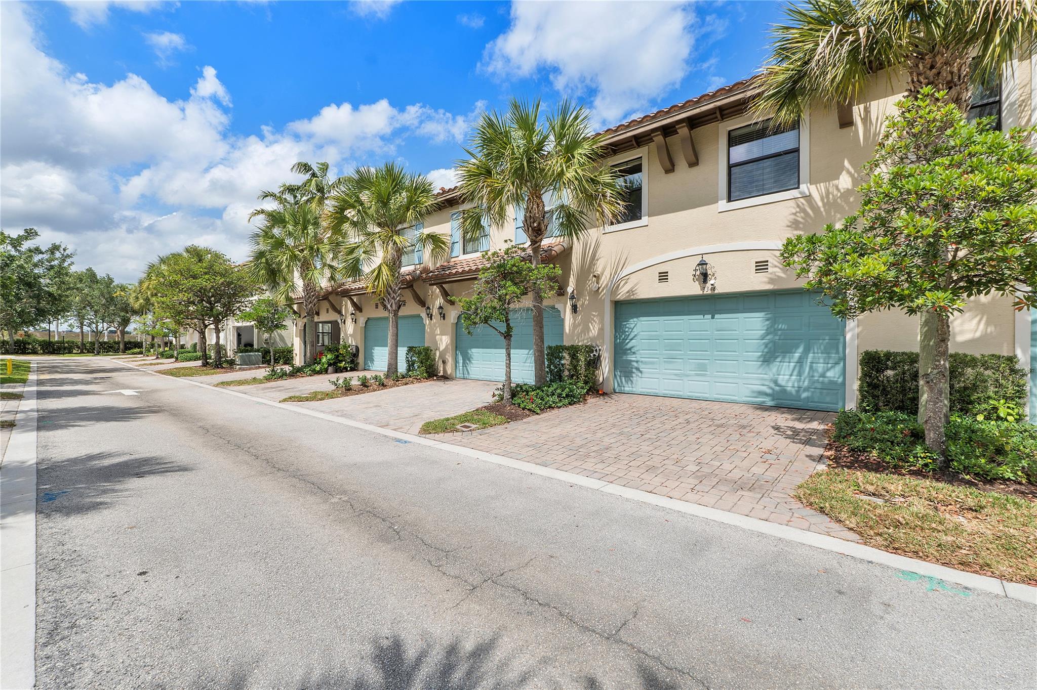 Artesia is an exclusive guard gated community with many luxury ammenities. This two story Mediterranean style townhome has 3 bedrooms, 2.5 bathrooms and a two car garage. The front porch entrance leads to an open concept living area with an updated kitchen with white cabinetry, white quartz countertops and SS appliances. Large island with seating along with a dining area. Neutral tile flooring downstairs and wood laminate on stairs and second floor. All 3 bedrooms are upstairs. Primary suite has private balcony. Primary bath has dual sinks, large shower & large walk-in closet. Additional 2 bedrooms and 1 bath and laundry room all upstairs. Impact windows thoughout. Custom Gladiator garage system with cabinets, slat walls and flooring. Water filtration system for entire home.