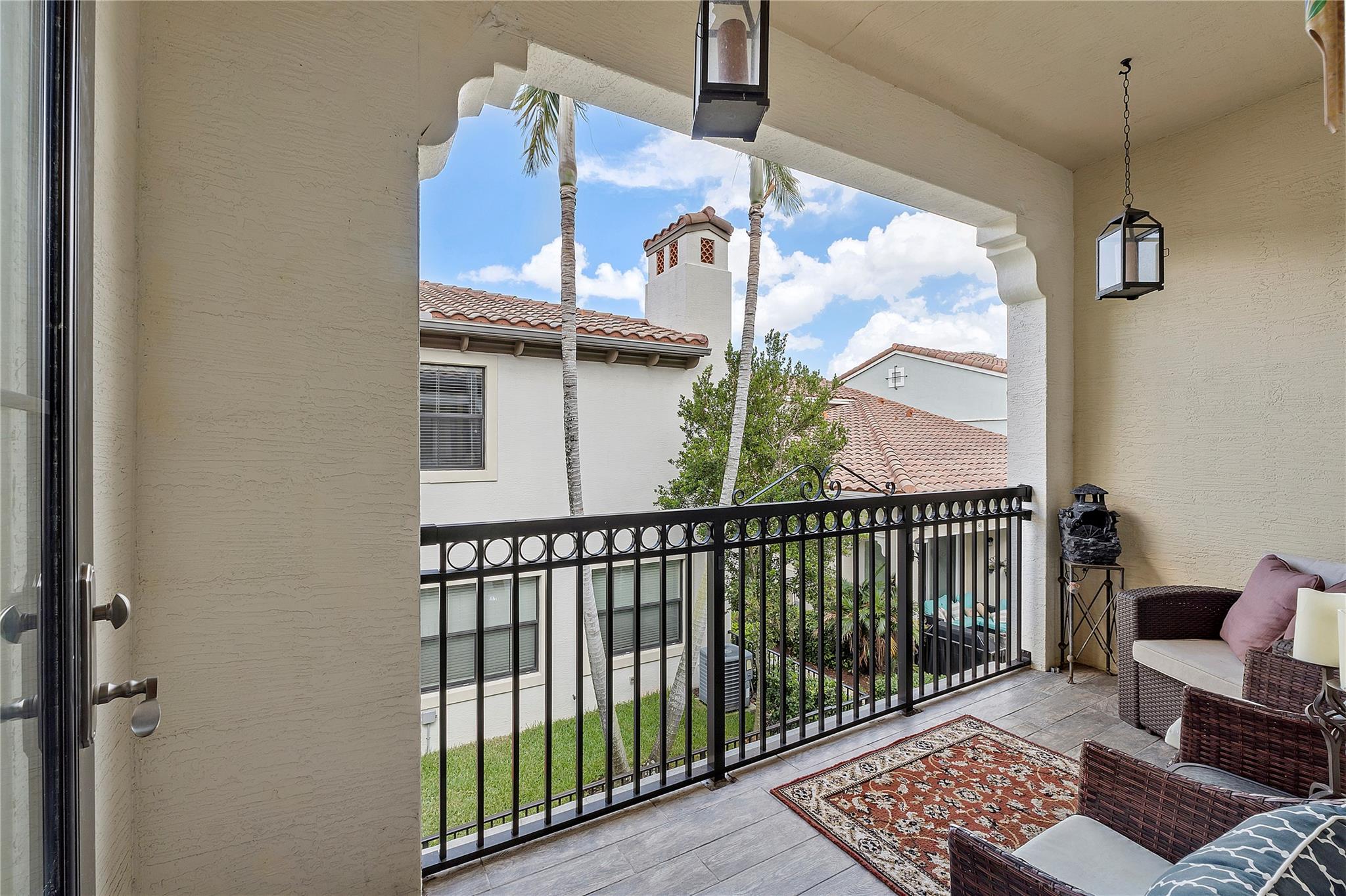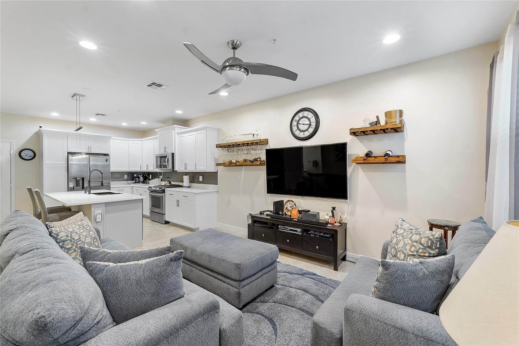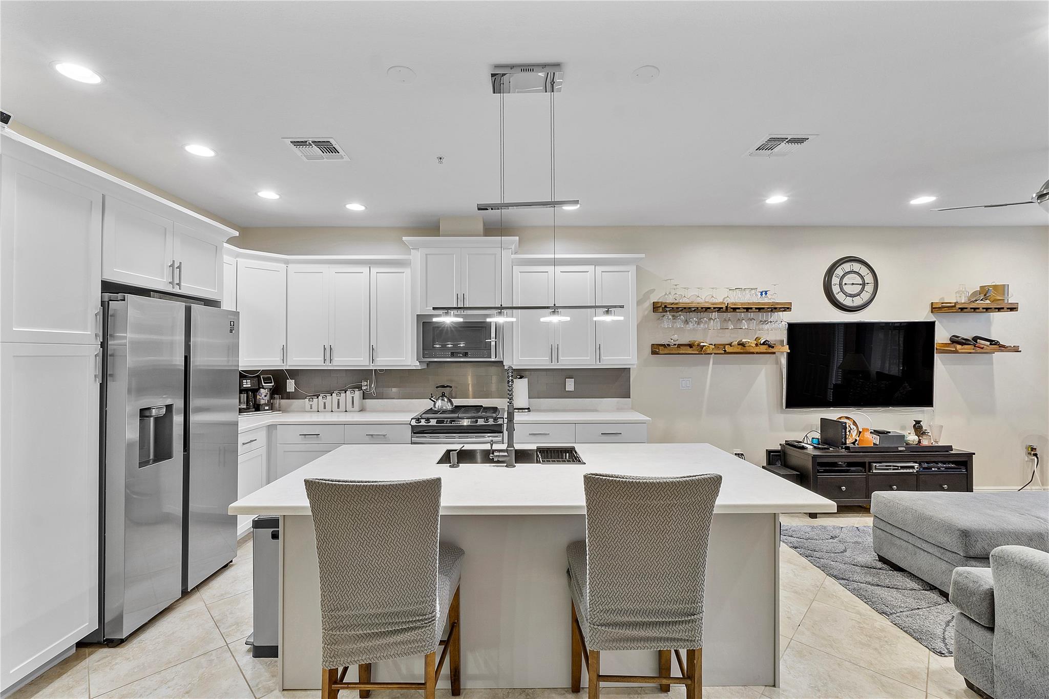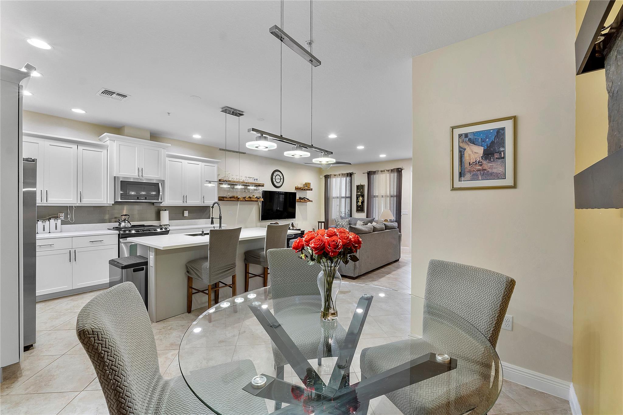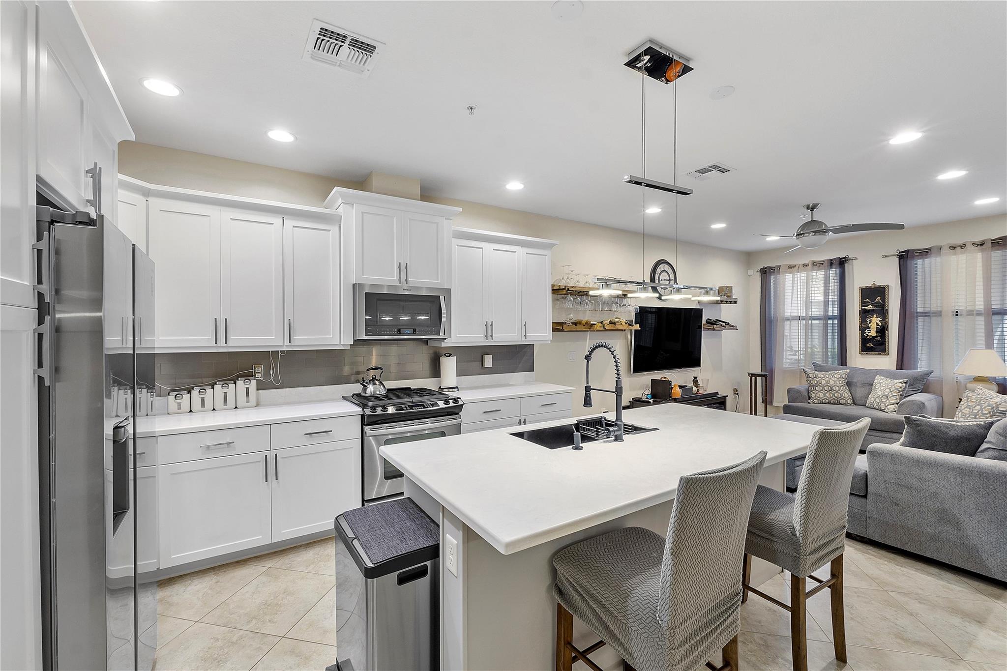 Artesia is an exclusive guard gated community with many luxury ammenities. This two story Mediterranean style townhome has 3 bedrooms, 2.5 bathrooms and a two car garage. The front porch entrance leads to an open concept living area with an updated kitchen with white cabinetry, white quartz countertops and SS appliances. Large island with seating along with a dining area. Neutral tile flooring downstairs and wood laminate on stairs and second floor. All 3 bedrooms are upstairs. Primary suite has private balcony. Primary bath has dual sinks, large shower & large walk-in closet. Additional 2 bedrooms and 1 bath and laundry room all upstairs. Impact windows thoughout. Custom Gladiator garage system with cabinets, slat walls and flooring. Water filtration system for entire home.
