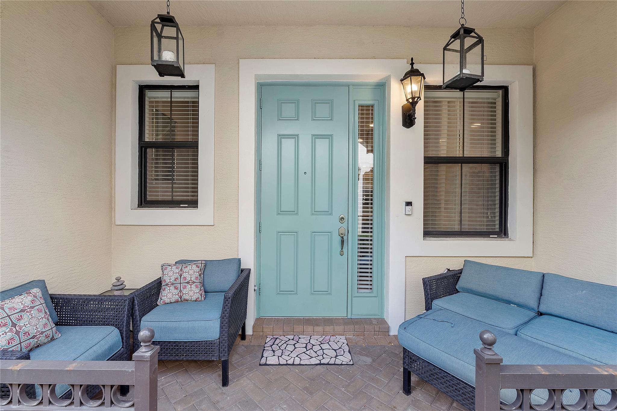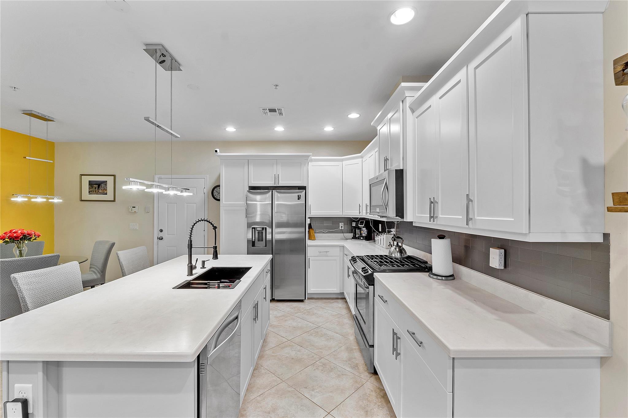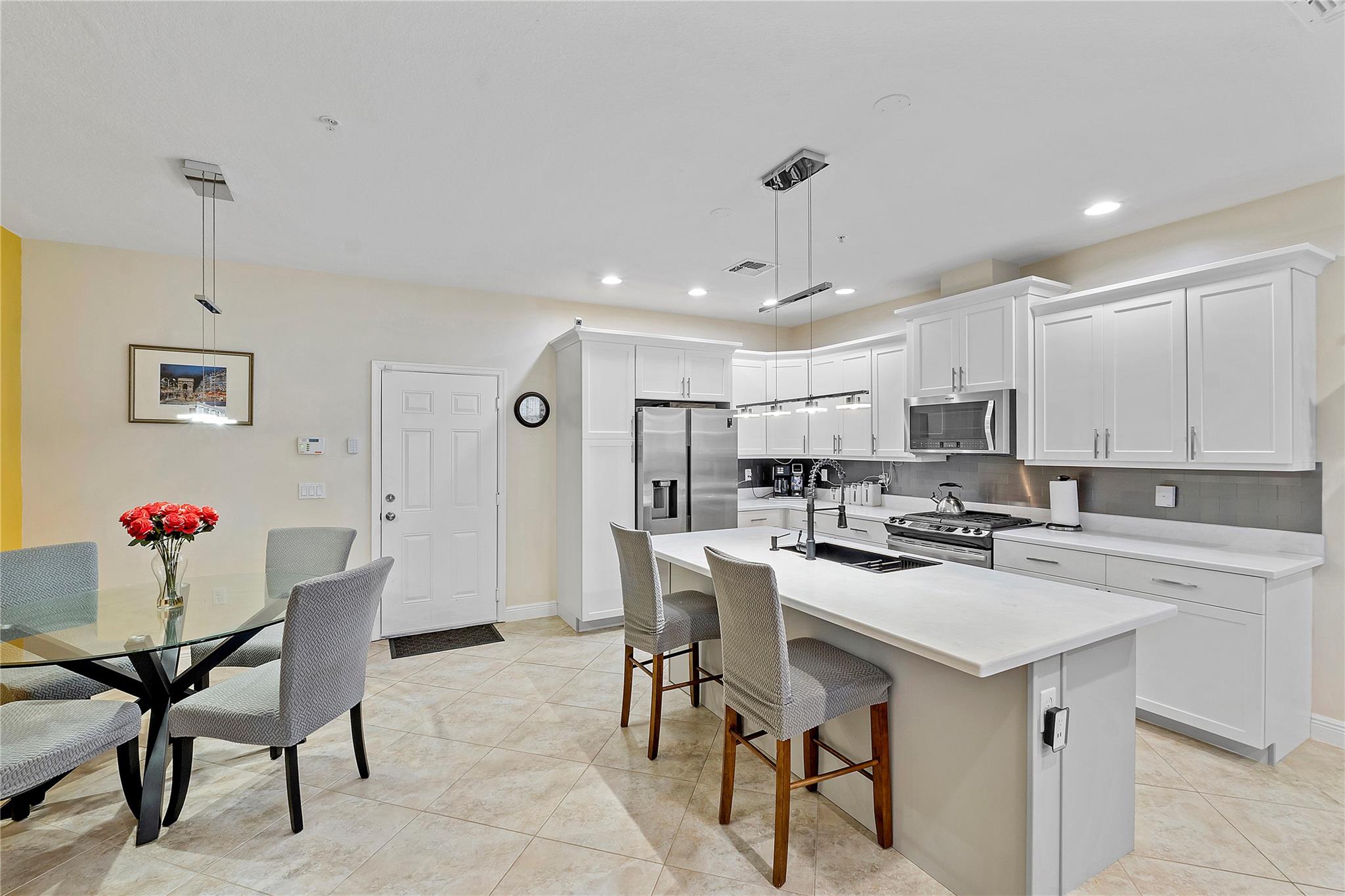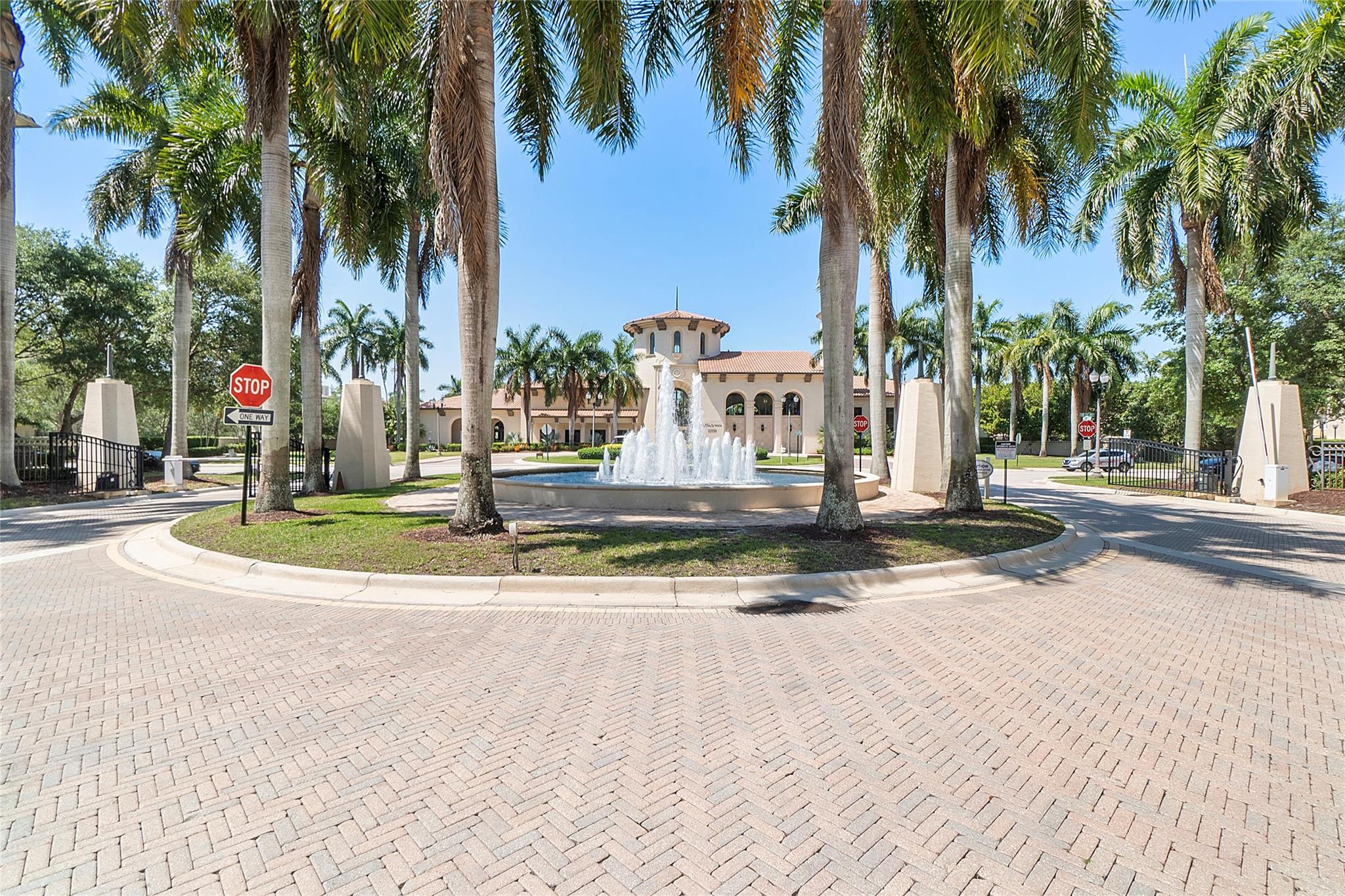 Artesia is an exclusive guard gated community with many luxury ammenities. This two story Mediterranean style townhome has 3 bedrooms, 2.5 bathrooms and a two car garage. The front porch entrance leads to an open concept living area with an updated kitchen with white cabinetry, white quartz countertops and SS appliances. Large island with seating along with a dining area. Neutral tile flooring downstairs and wood laminate on stairs and second floor. All 3 bedrooms are upstairs. Primary suite has private balcony. Primary bath has dual sinks, large shower & large walk-in closet. Additional 2 bedrooms and 1 bath and laundry room all upstairs. Impact windows thoughout. Custom Gladiator garage system with cabinets, slat walls and flooring. Water filtration system for entire home.
