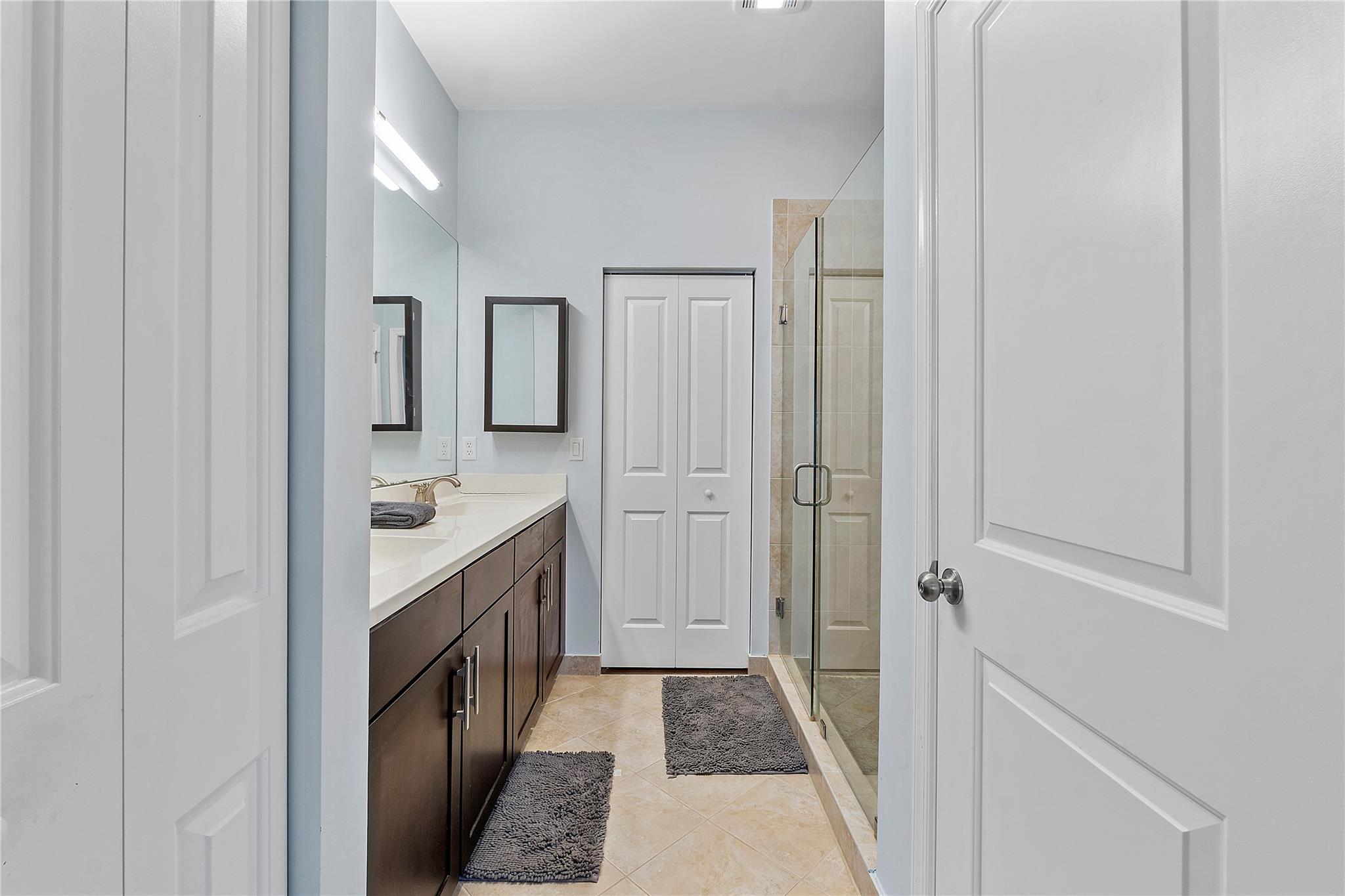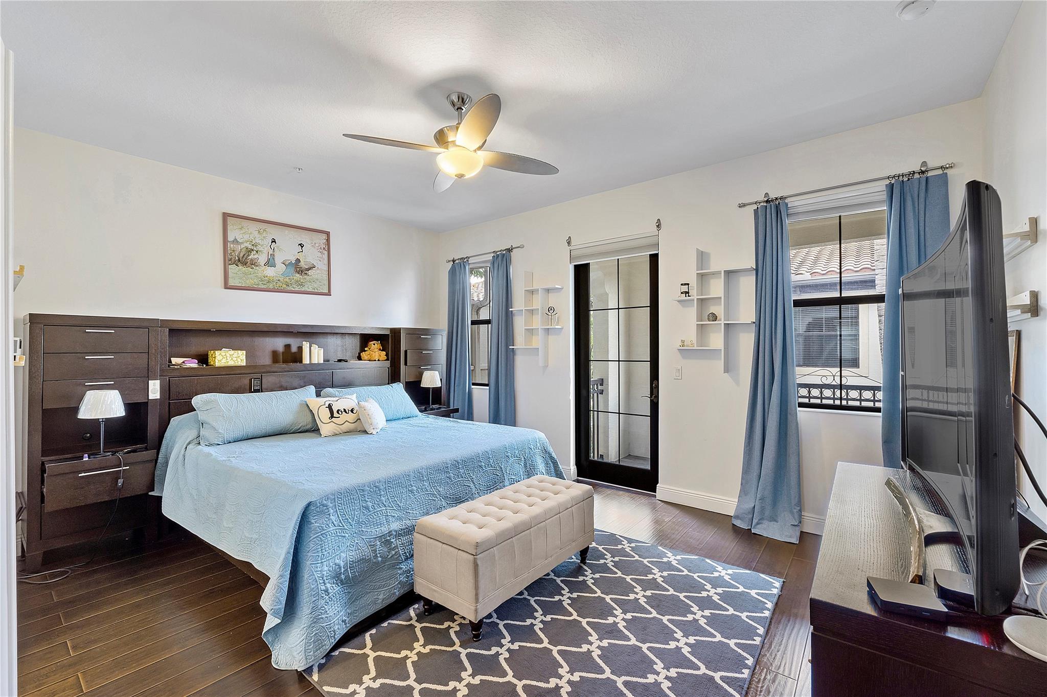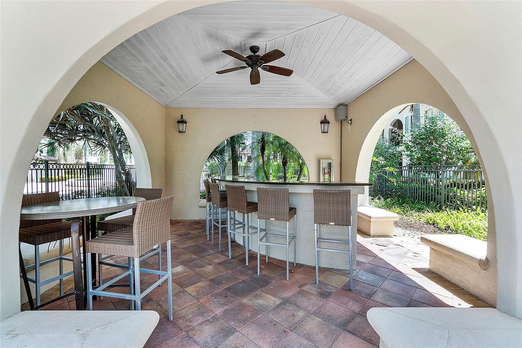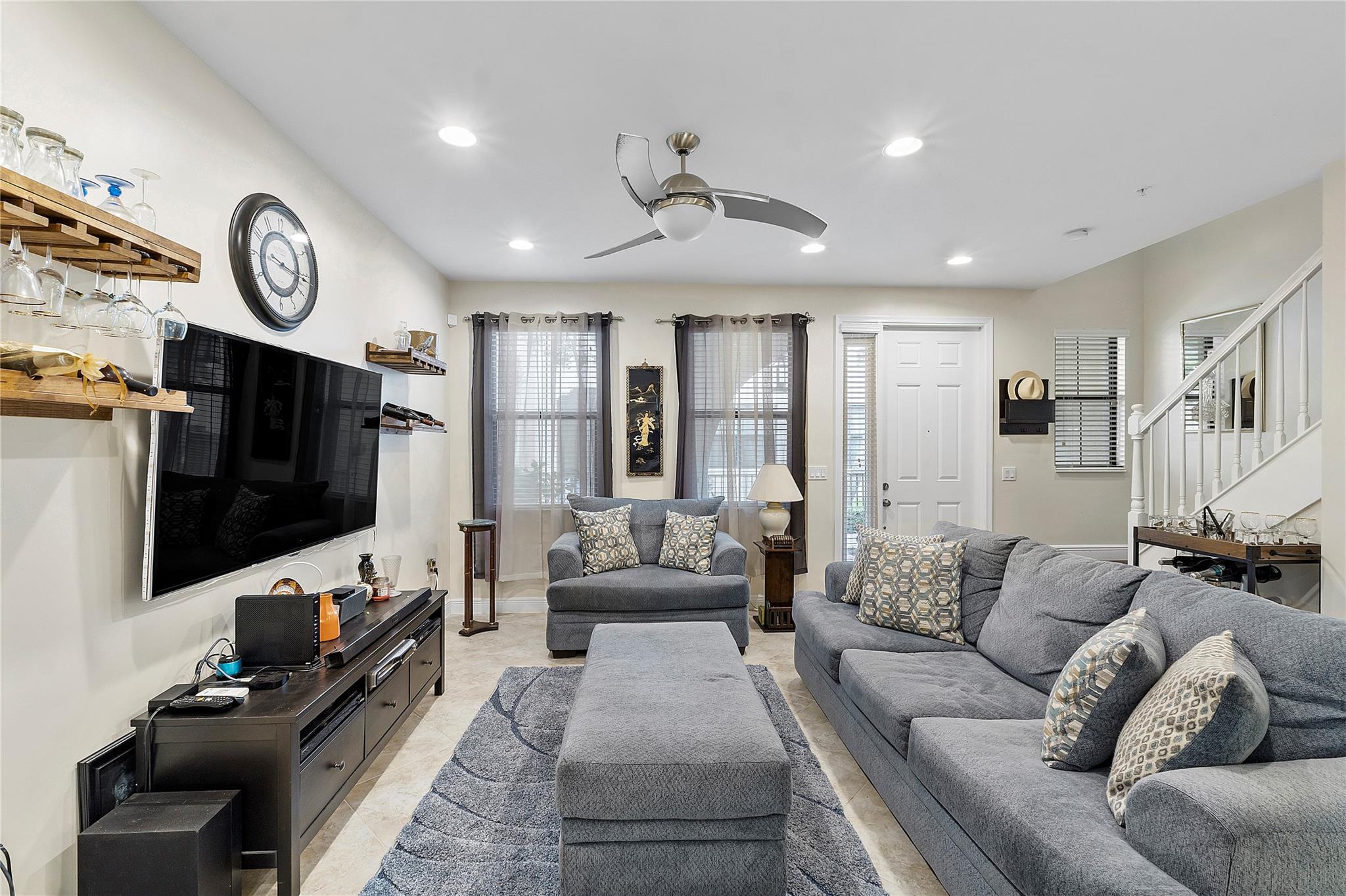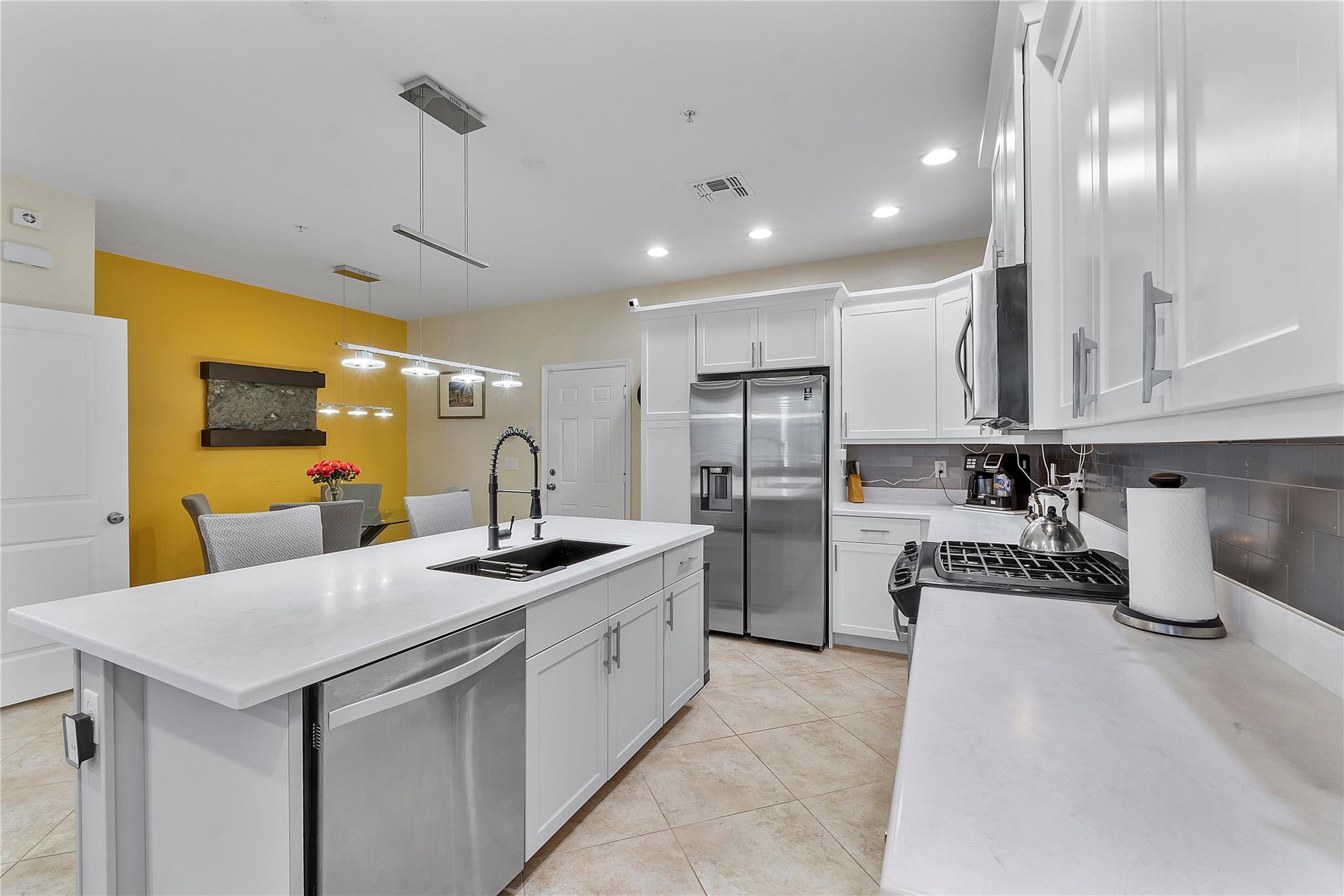 Artesia is an exclusive guard gated community with many luxury ammenities. This two story Mediterranean style townhome has 3 bedrooms, 2.5 bathrooms and a two car garage. The front porch entrance leads to an open concept living area with an updated kitchen with white cabinetry, white quartz countertops and SS appliances. Large island with seating along with a dining area. Neutral tile flooring downstairs and wood laminate on stairs and second floor. All 3 bedrooms are upstairs. Primary suite has private balcony. Primary bath has dual sinks, large shower & large walk-in closet. Additional 2 bedrooms and 1 bath and laundry room all upstairs. Impact windows thoughout. Custom Gladiator garage system with cabinets, slat walls and flooring. Water filtration system for entire home.