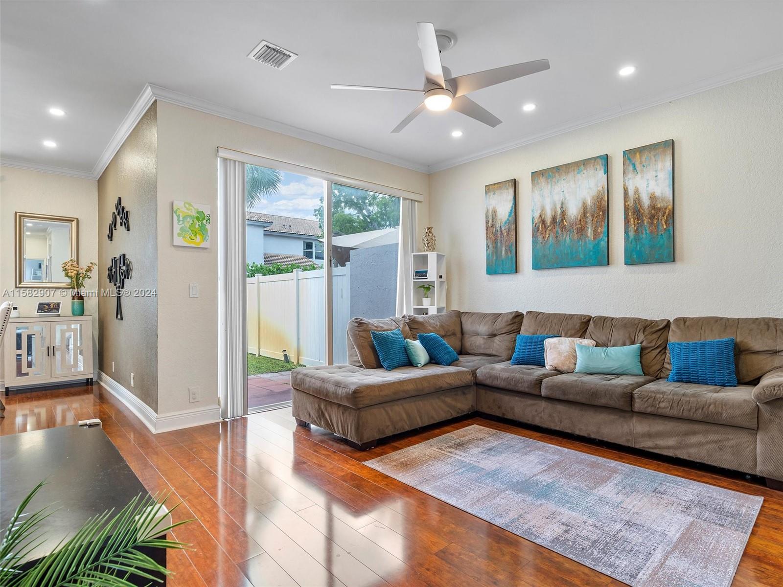 Beautiful 3+ Bedrooms / 2.5 Bathrooms townhouse in oversized corner lot located in desirable gated community of Sterling Place in Pembroke Shores. The home boasts a spacious interior layout with high ceilings, separate living area, and formal dining. The family room is the heart of this home, along with the large backyard, fully fenced, and perfect for entertaining guests. Renovated open kitchen with wood cabinets, granite countertop, and stainless-steel appliances. Guest bathroom conveniently located on the 1st floor. Primary bedroom with bonus room, currently used as an office, but could be used as a nursery, or converted in a huge walking closet! Wood flooring throughout. 1-Car garage and driveway fit 2 additional cars. Community pool. Close to shopping, restaurants, hospitals and I-75
