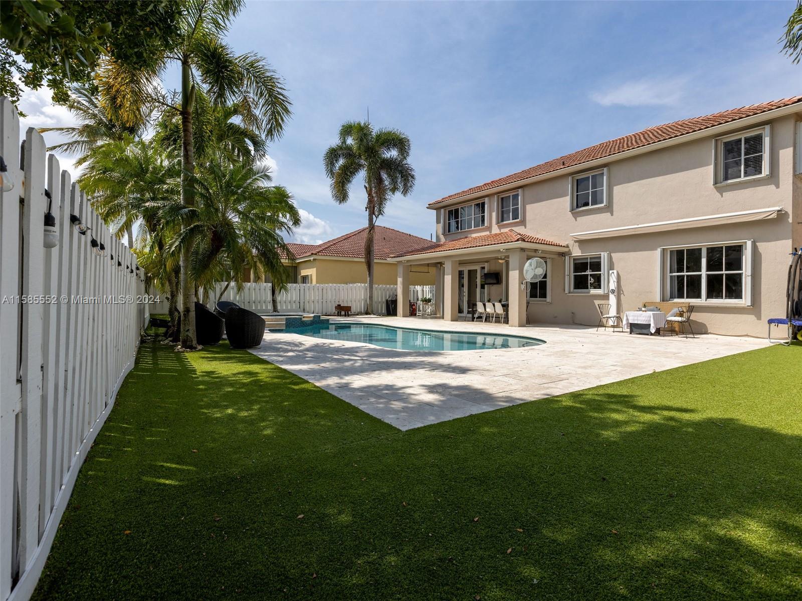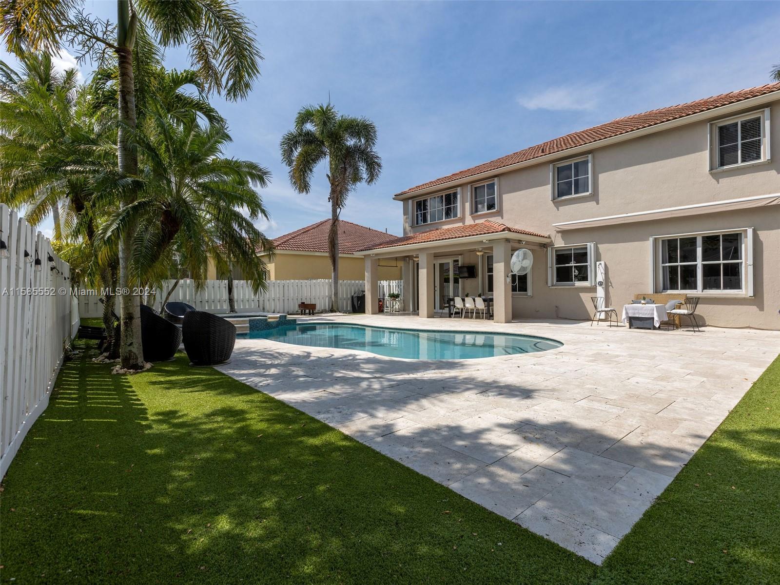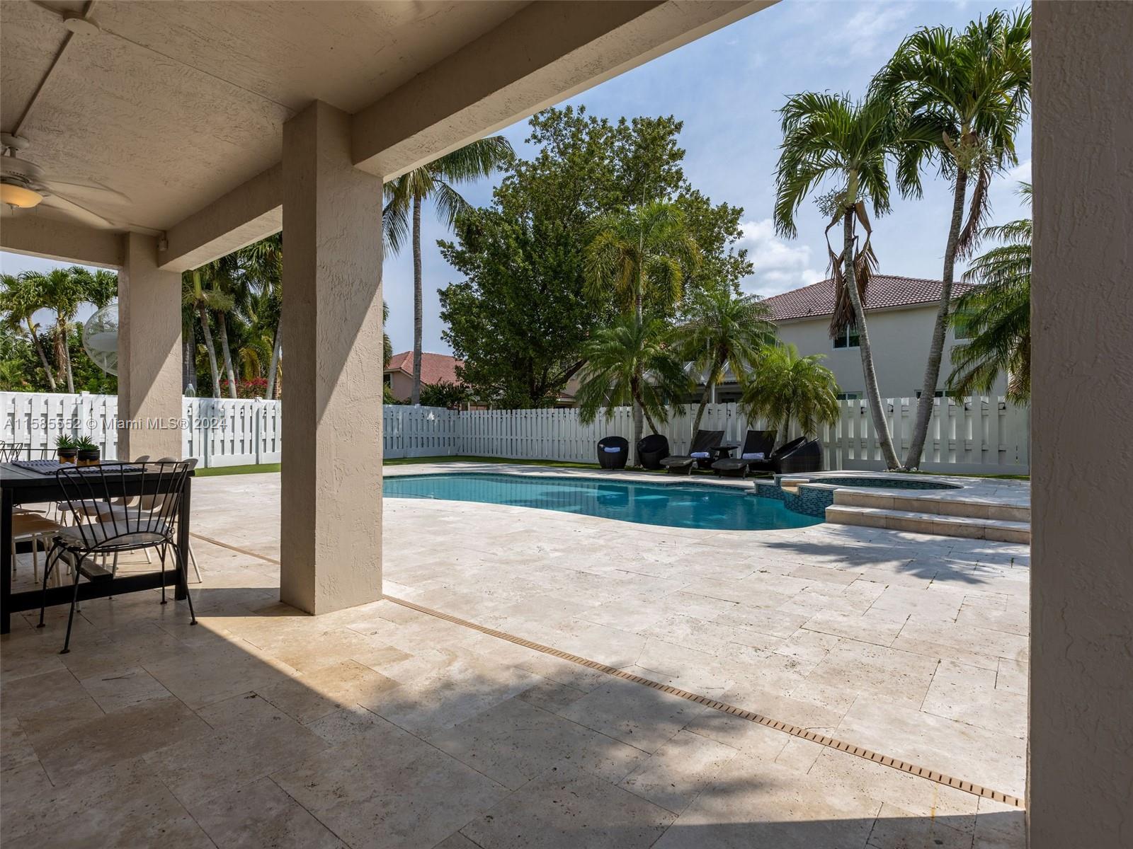 Amazing 5 BEDROOM PLUS OFFICE Home at The Meadows, one of Weston's gated communities! Double height ceilings in living room and family room, great floor plan, full of light, spacious kitchen with an island, perfect for entertaining! Family room with volume ceilings overlooking spacious backyard with amazing palm trees, renovated pool and spa, beautiful modern travertine pavers, covered patio plus awning, great for family events! 1 bedroom and 1 full bathroom on first floor, ideal for guests. 2nd floor primary bedroom with his and hers walk-in closets plus attached room perfect for office/gym/dream closet. Big 3 car garage and more parking space on driveway. Community offers pool, playground and sports court. A + Weston schools: Gator Run Elem., Falcon Cove Middle School, Cypress Bay High.