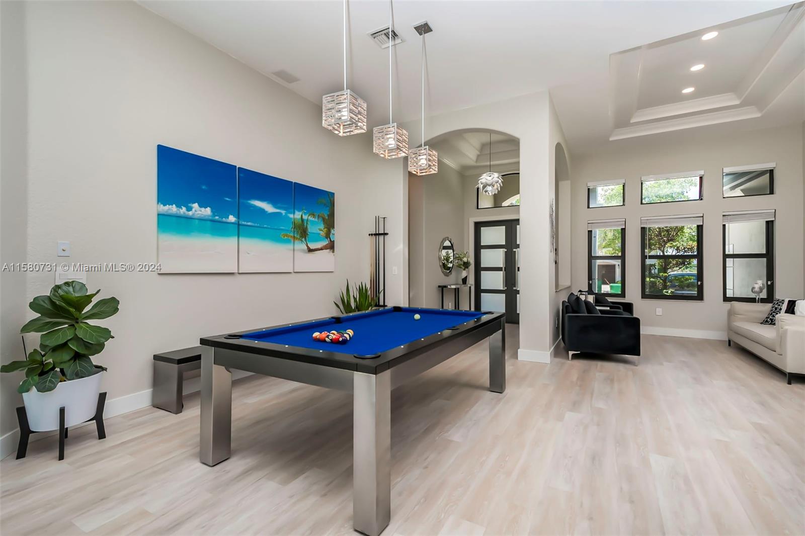 Beautiful single-story lakefront home in the quiet gated community of Grand Isles in Sunset Lakes! This 5-bedroom, 3-bath home features renovations inside and outside, including hurricane impact windows/doors, roof, flooring, A/C, driveway, pool pavers, and more. It features high-end finishes, renovated gourmet kitchen with quartz countertops, stainless-steel appliances, and spacious 12-foot ceilings. The fenced-in backyard has stunning lake views and beautiful salt-water pool perfect for unwinding and entertaining. Other features include a modern pool table that converts to a sleek dining table, integrated EuroCave Pro wine fridge, and an amazing luxurious spa-like primary bathroom! Make this bright and spacious turn-key retreat your new home.