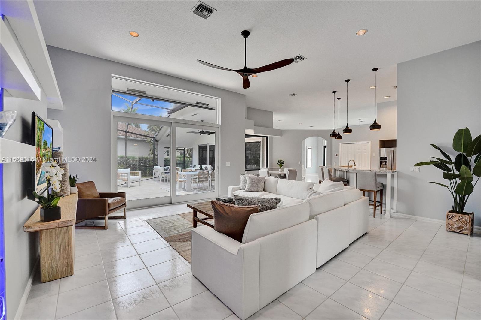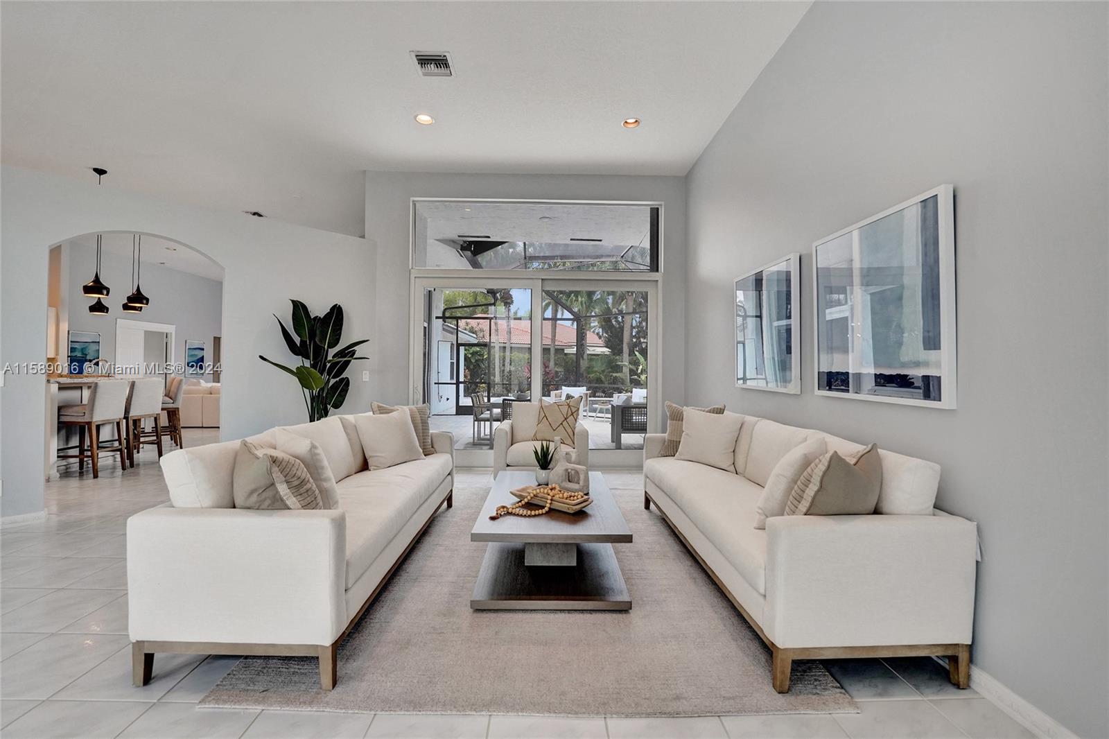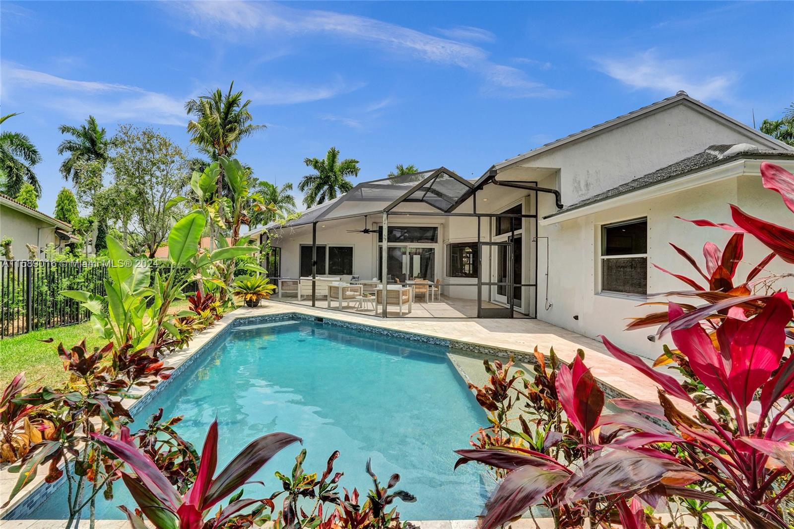 Welcome to this exquisite 5-bed, 3-bath residence in the prestigious Weston Hills CC. This beautifully designed home seamlessly blends elegance with modern convenience, featuring an open-concept layout, soaring volume ceilings, and stylish plantation shutters. The newly renovated primary bathroom, bright white kitchen showcases stunning marble countertops and stainless steel appliances. Bamboo wood flooring enhances the bedrooms, with tile floors throughout the main living areas. Recent updates include a 2022 roof, new A/C, impact sliding doors, accordion shutters, and a 3-car garage. Step outside to the screened patio and enjoy the serene saltwater pool with a sun shelf and fountains set against a travertine pool deck within a fully fenced yard. Optional furniture purchase is available.