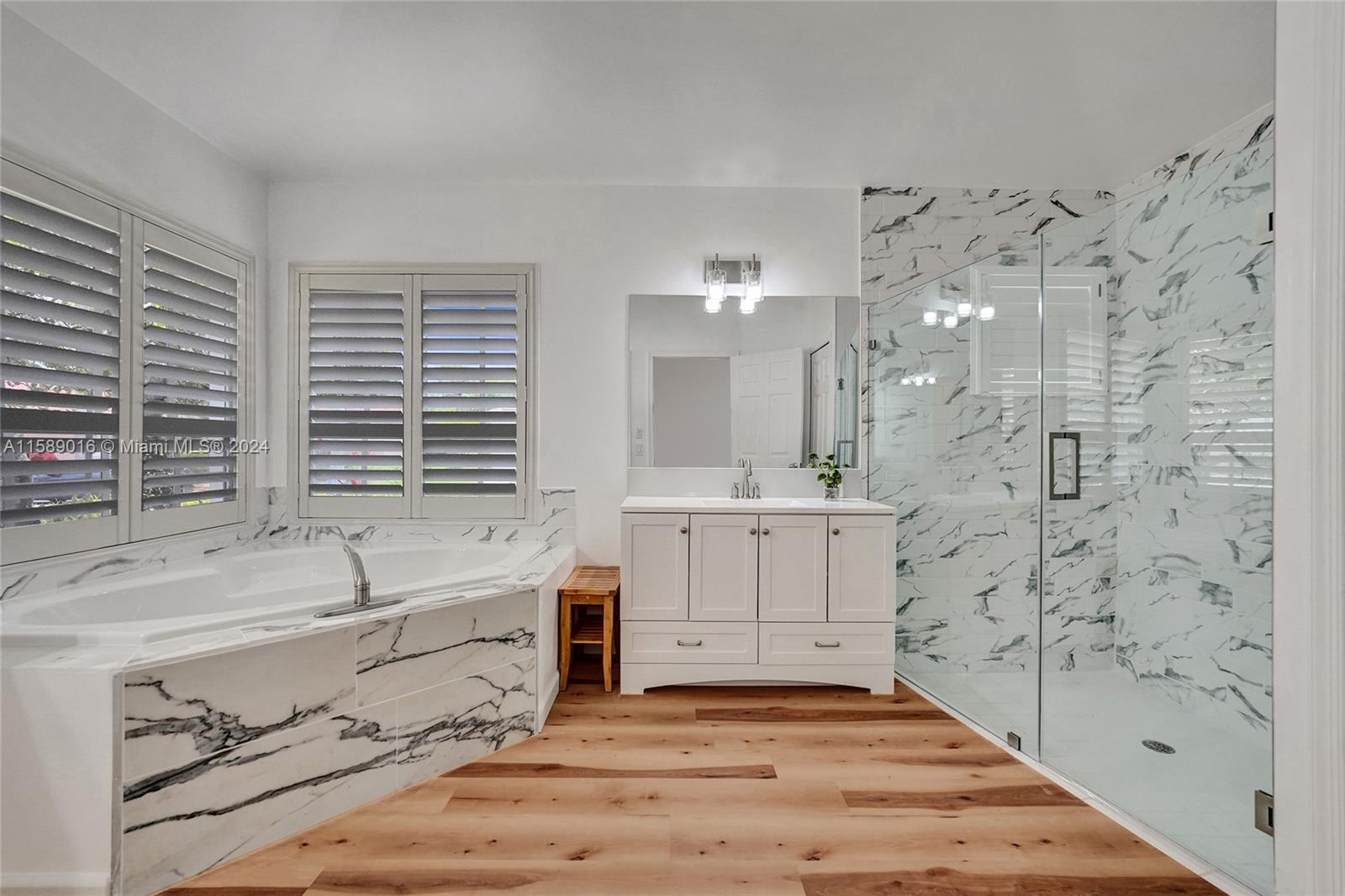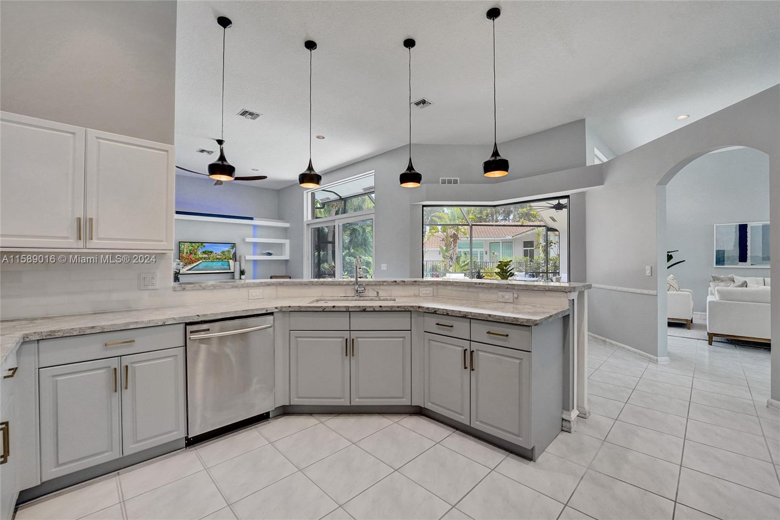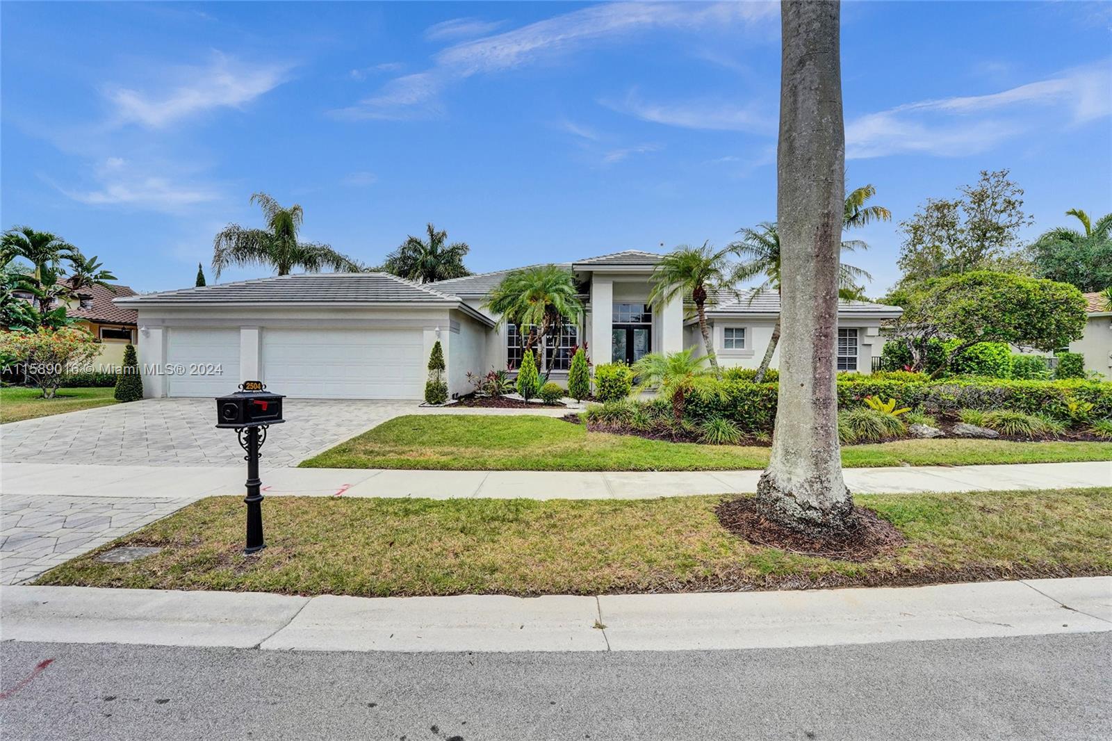 Welcome to this exquisite 5-bed, 3-bath residence in the prestigious Weston Hills CC. This beautifully designed home seamlessly blends elegance with modern convenience, featuring an open-concept layout, soaring volume ceilings, and stylish plantation shutters. The newly renovated primary bathroom, bright white kitchen showcases stunning marble countertops and stainless steel appliances. Bamboo wood flooring enhances the bedrooms, with tile floors throughout the main living areas. Recent updates include a 2022 roof, new A/C, impact sliding doors, accordion shutters, and a 3-car garage. Step outside to the screened patio and enjoy the serene saltwater pool with a sun shelf and fountains set against a travertine pool deck within a fully fenced yard. Optional furniture purchase is available.