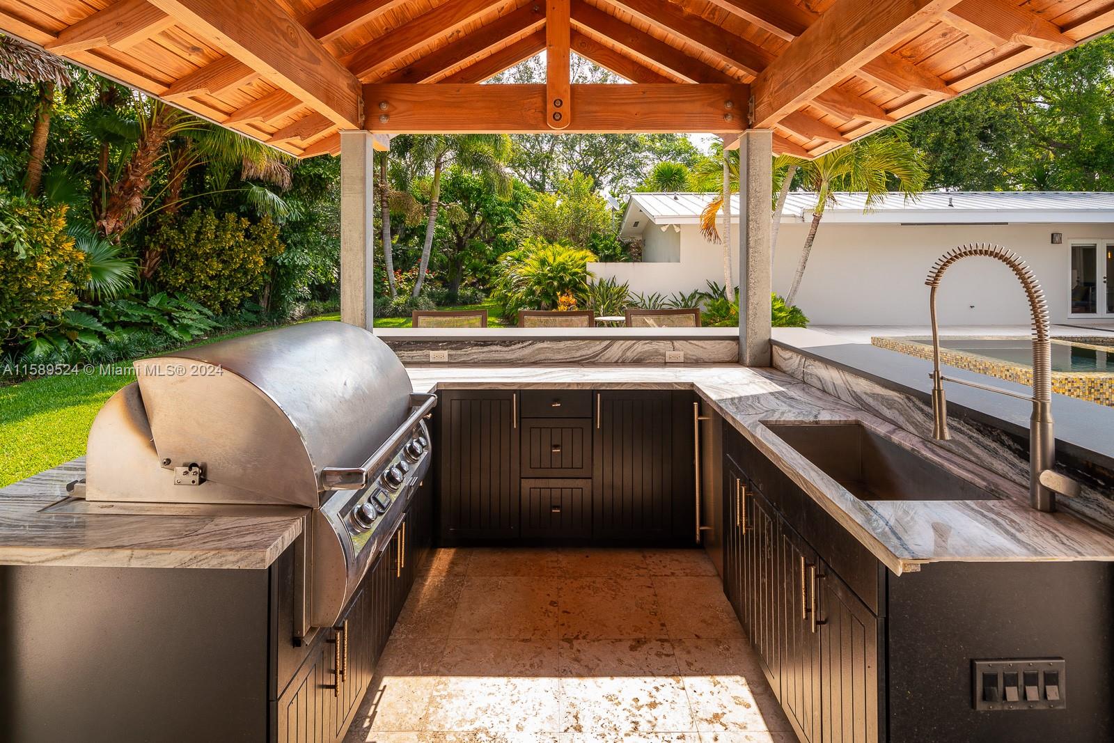 This North Pinecrest walled & gated 1-story resort-style estate truly has it all: 4919 gross living area per appraisal on a 35,109 sq. ft. lot, 4/4, a car collector's dream air-conditioned 4-car-garage with lift, security system, work-station & loft, luxurious poolside primary suite w/ double walk-in closets, master chef's kitchen w/ top-of-the-line appliances & newly installed quartz counters, dramatic high-ceilinged main living room & formal dining room, new 4th bedroom & laundry room added in 2023, capacious covered terrace w/fully outfitted summer kitchen, flex space: gym/yoga studio or air conditioned space for 2 cars, resort-style pool & spa, native plantings, koi pond, whole house generator & more! Public Schools are "A" schools: Pinecrest Elementary. & Palmetto High