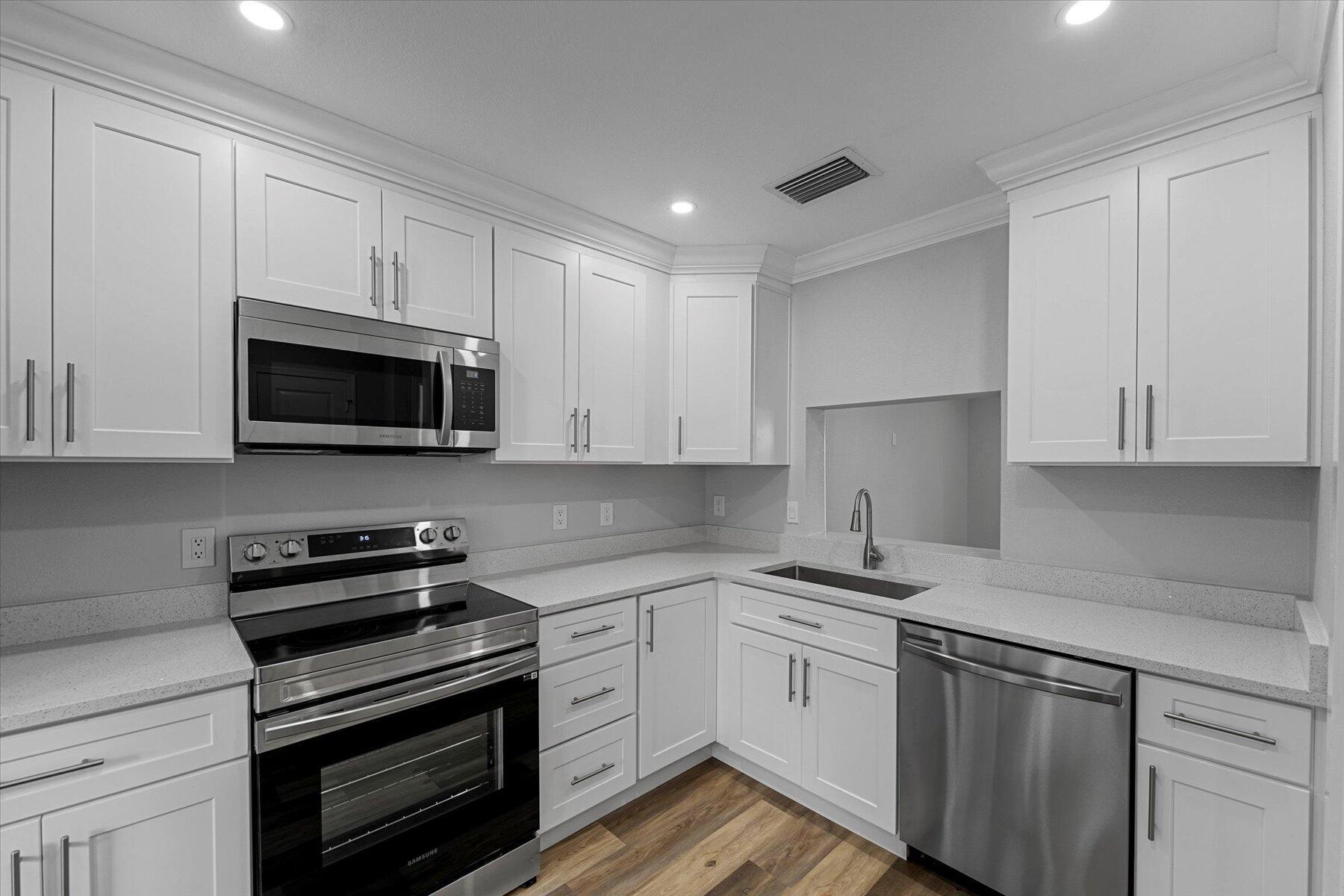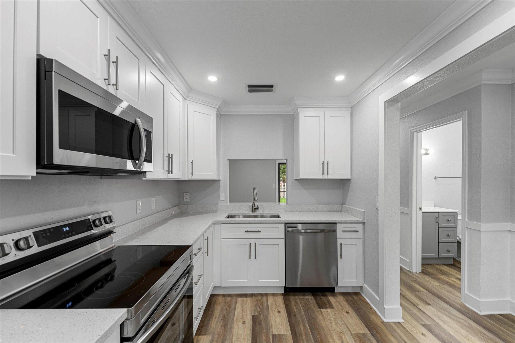 Welcome to this beautiful 2 bedrooms, 1.5 baths just completed redesigned to perfection townhouse. This beautiful townhouse has been completely gutted, renovated and it hosts a state of the art kitchen featuring quartz countertops, spacious brand-new white cabinets and brand-new stainless steel appliances. Supreme crown molding and modern recessed ceiling lights throughout. Equipped with top-notch new AC, new electrical panel and new water heater. Fenced in private backyard features newly installed sod, extra storage space, view to the community park and peaceful greenery. Two assigned parking spaces and very low HOA. Pet friendly and all ages community. Conveniently located near shops, restaurants and major highways. This is an amazing opportunity!