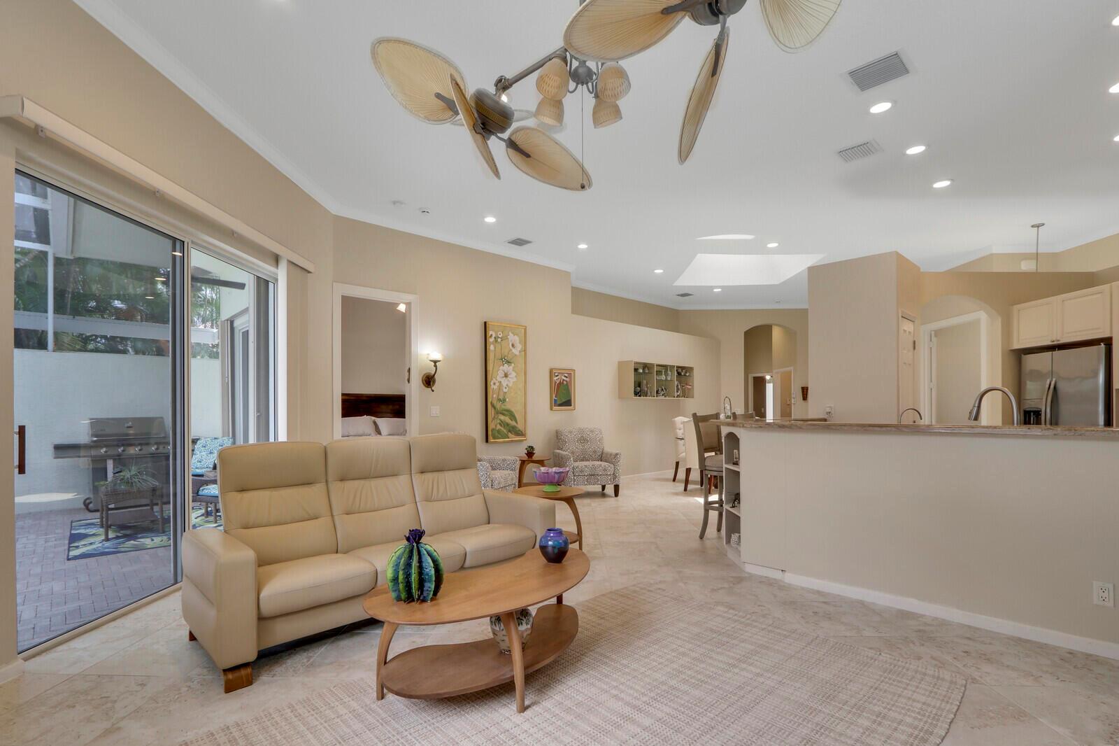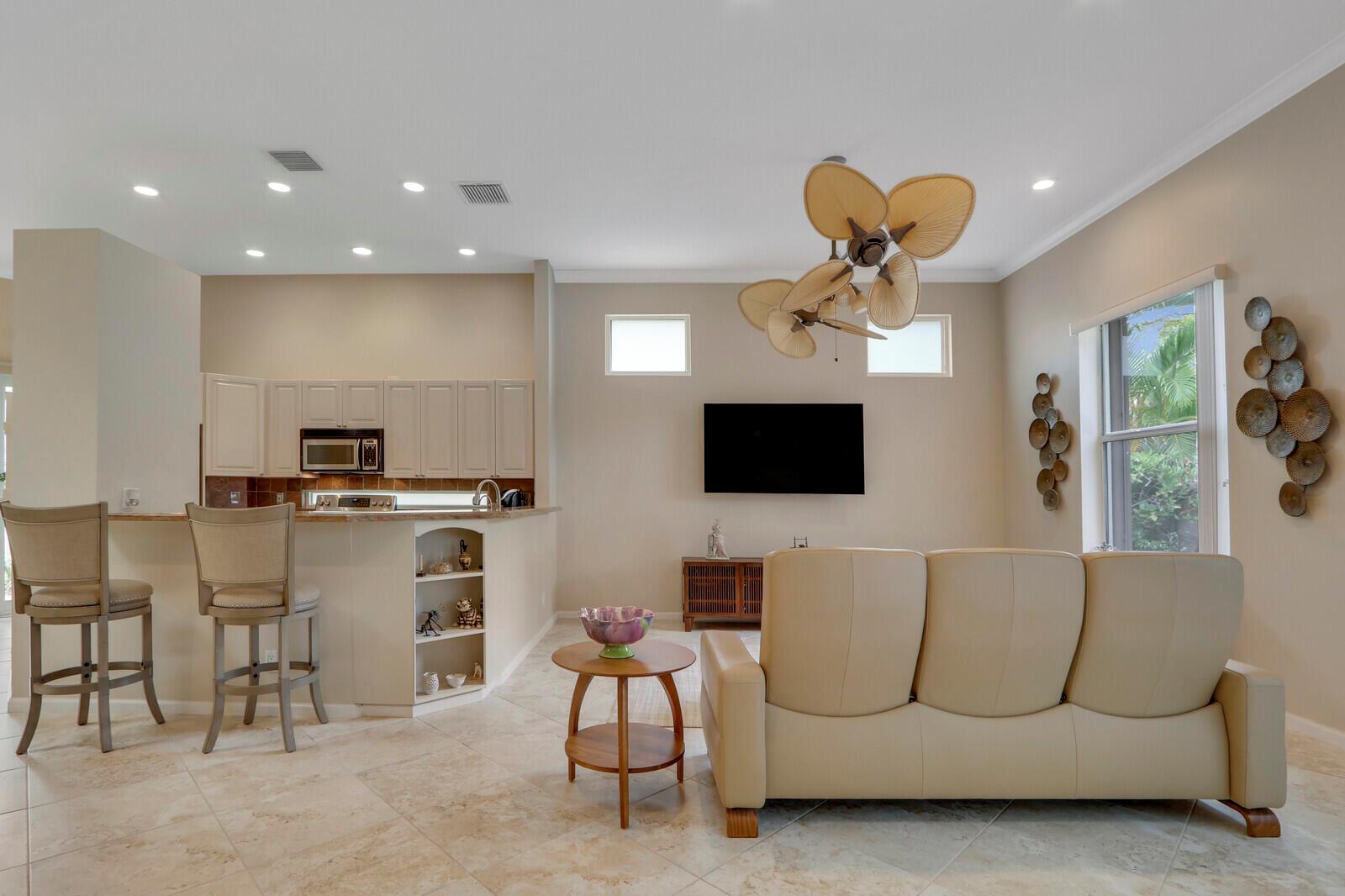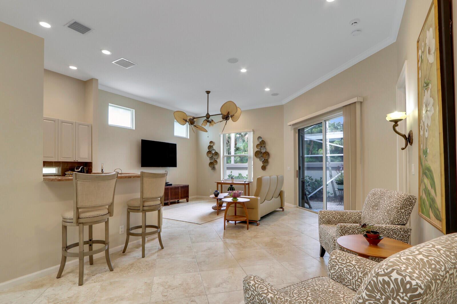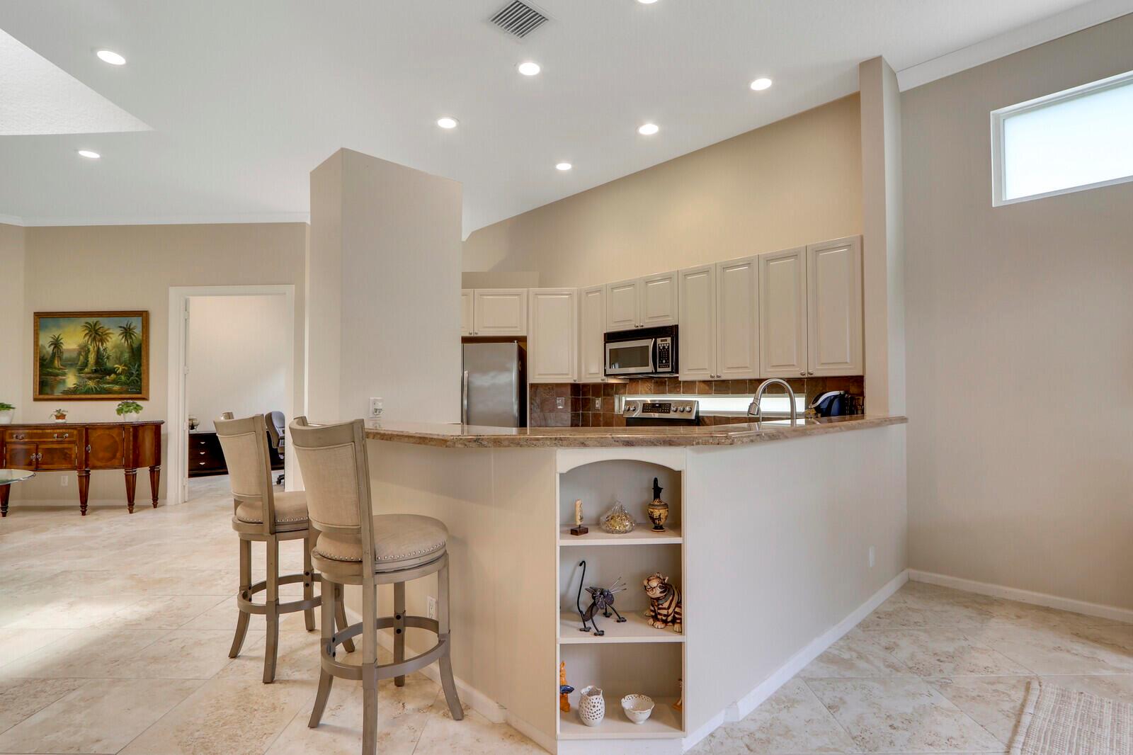 Move in ready, single family, one story 3 bedroom, 2 bath newly renovated with new roof, downspouts, gutter, freshly painted, new impact glass front door, some impact glass windows, 5 addt'l recessed lights in the Great room, renovated bathrooms, custom closet in Master, 18'' tile throughout all common areas, Kitchen cabinets upgraded 2023, A/C 10/2020, WH 2019. Great open floor plan for entertaining. 11 foot ceilings. Come and visit this move in ready home, beautifully landscaped. See Detailed list for additional upgrades.The community of Larkspur Landing is close to the Clubhouse and is only one of four communities with a beautiful heated private pool and spa for residents only. The Club at Ibis is an award winning private equity club / 3 Jack Nicklaus family golf courses, 5 restaurants