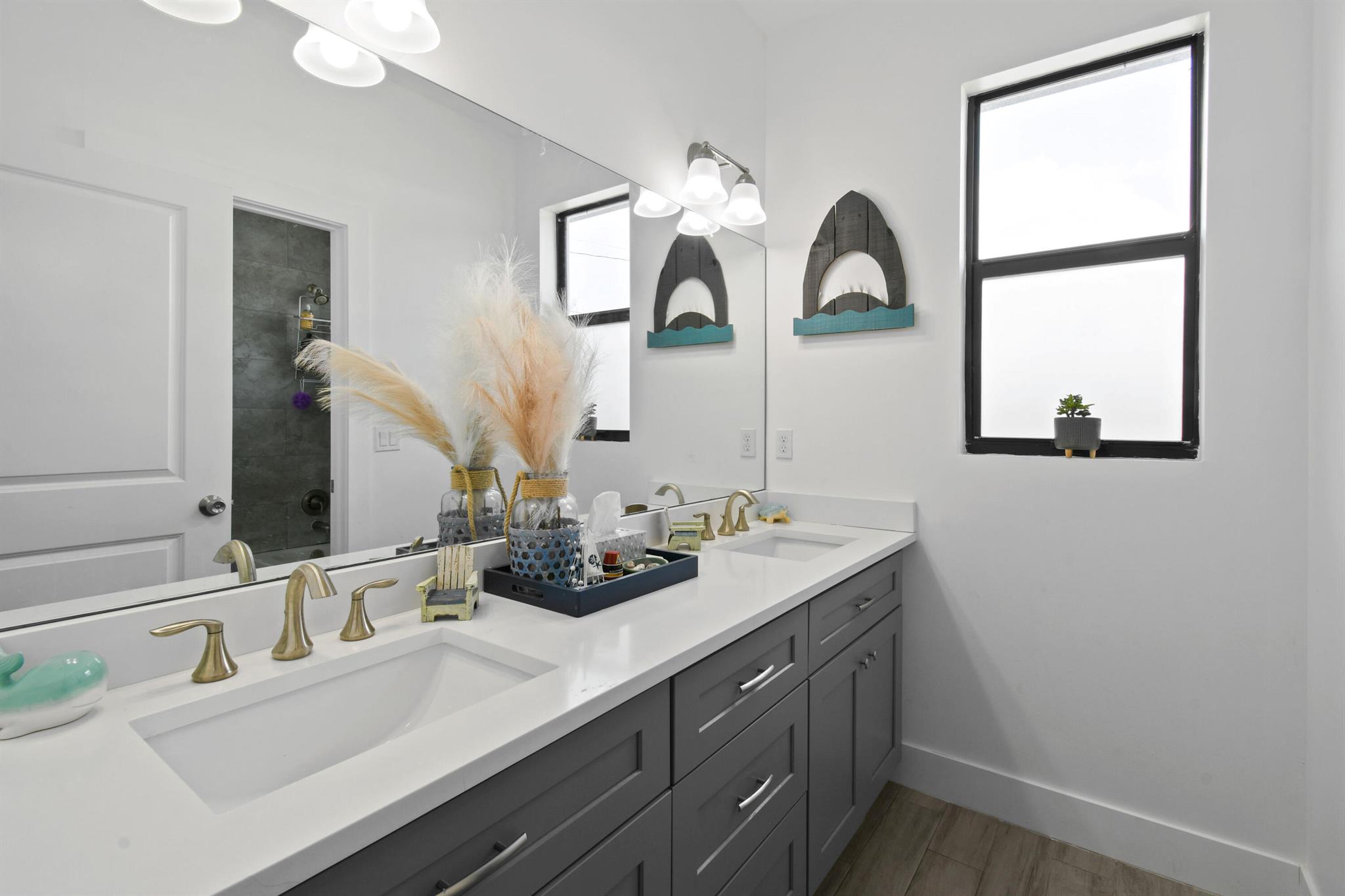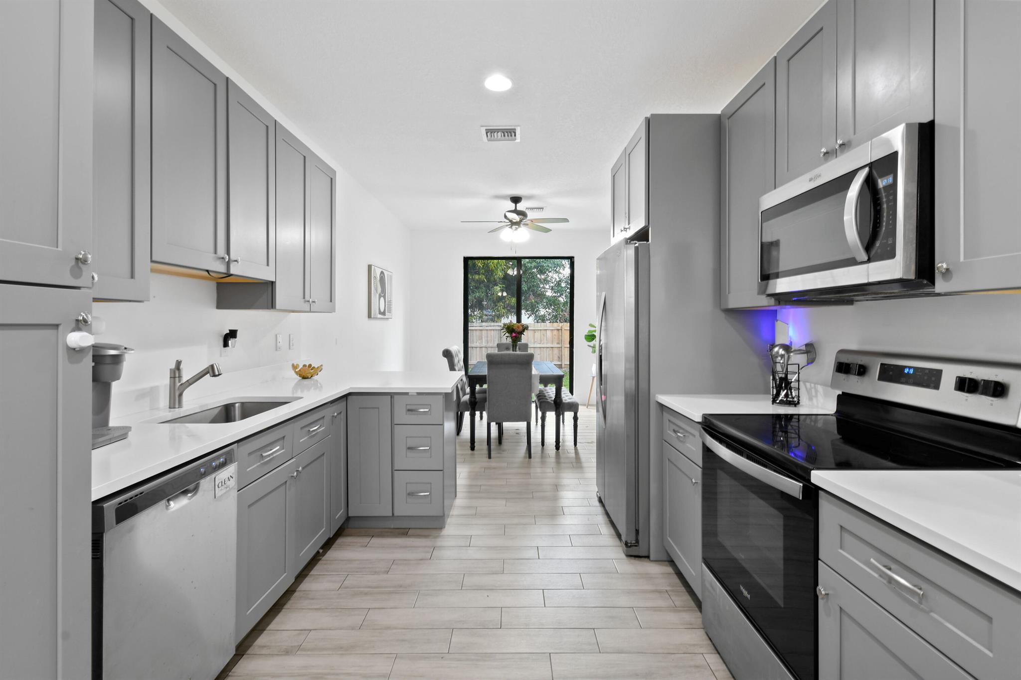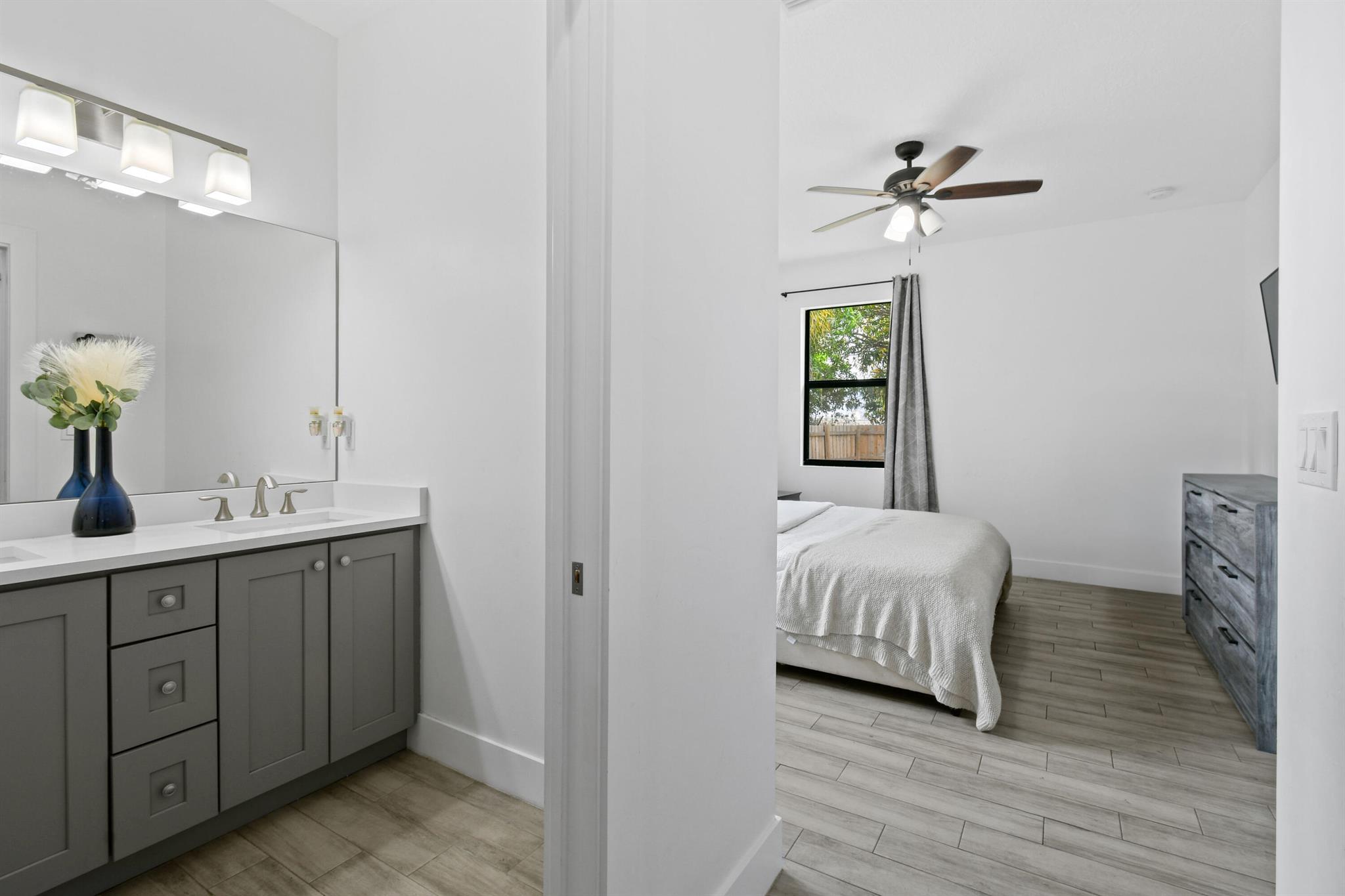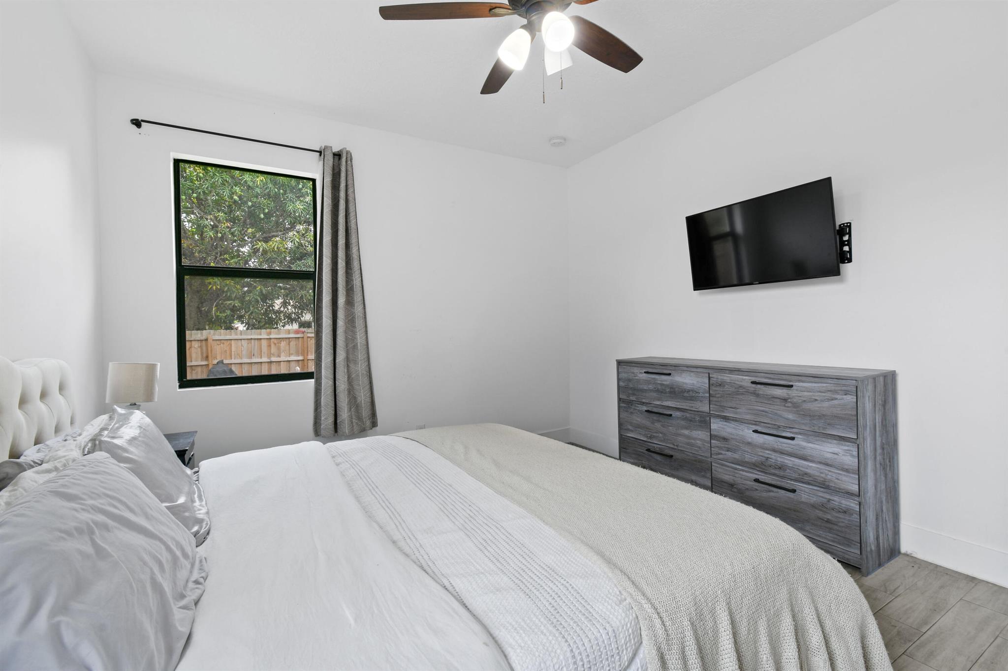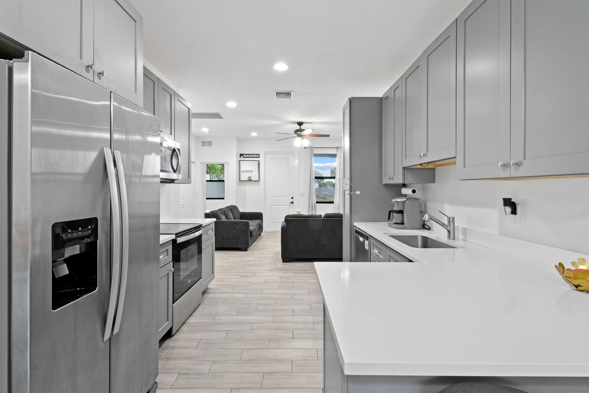A RARE GEM built in 2022, this spacious house boasts 5 bedrooms and 2 baths. The modern kitchen in grey and white is a standout feature with quartz countertops and stainless-steel appliances. Open floor plan with living and dining area. Split floor plan ensuring privacy for all. Massive primary suite with lovely bathroom featuring dual sinks and shower. Beautiful wood tile flooring throughout. Dual sinks and tub in 2nd bathrooms. Large completely fenced in backyard. IMPACT WINDOWS , NO HOA. Conveniently located near, shops, restaurants, beaches, downtown West Palm Beach and I95. Don't miss out on this excellent opportunity whether you're looking for an investment property or long-term family residence this house has the potential to meet all your need.