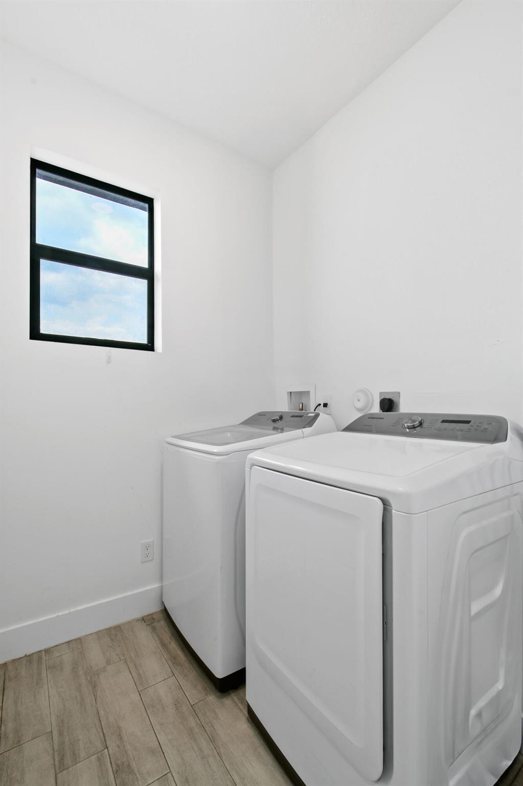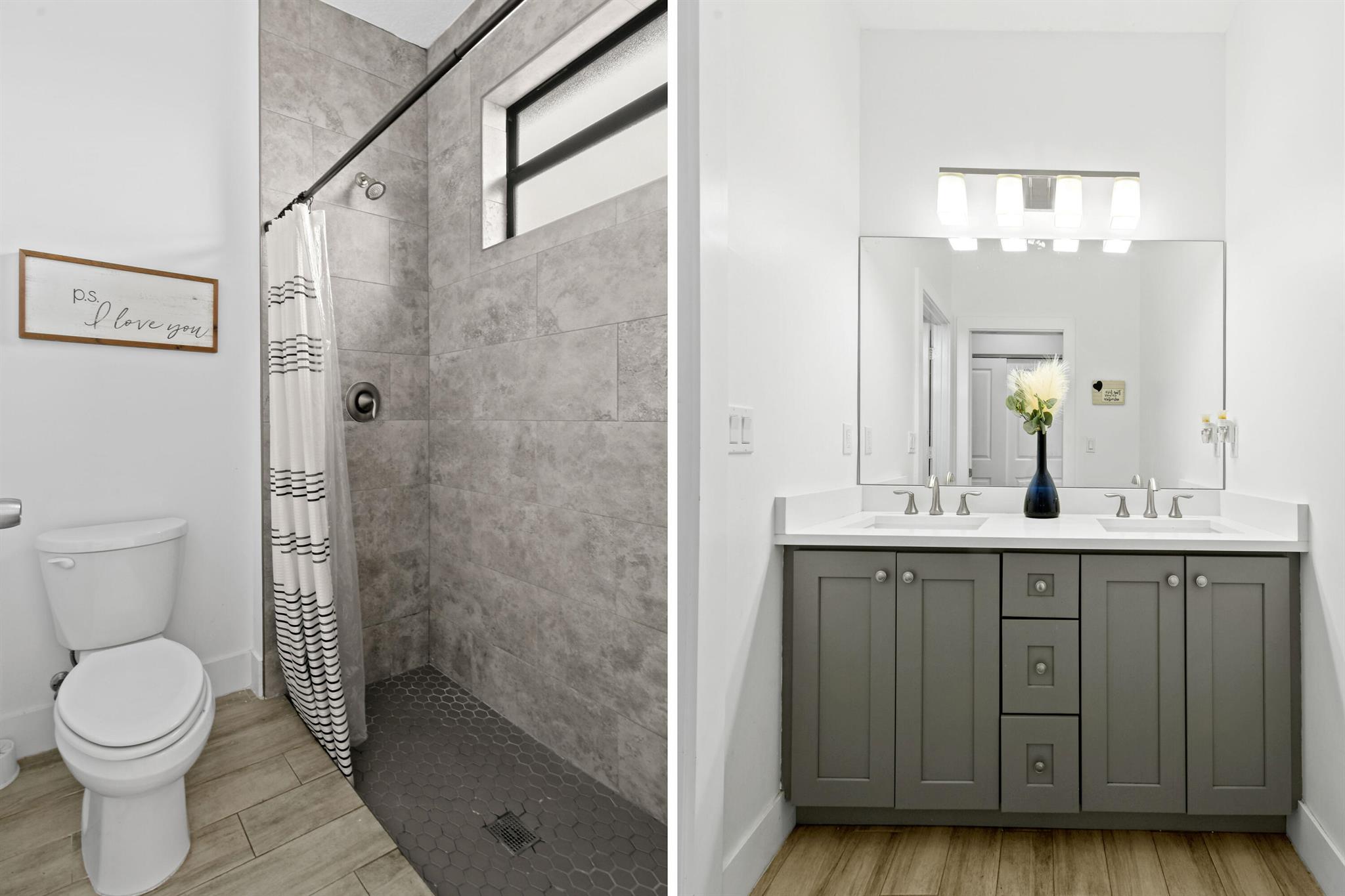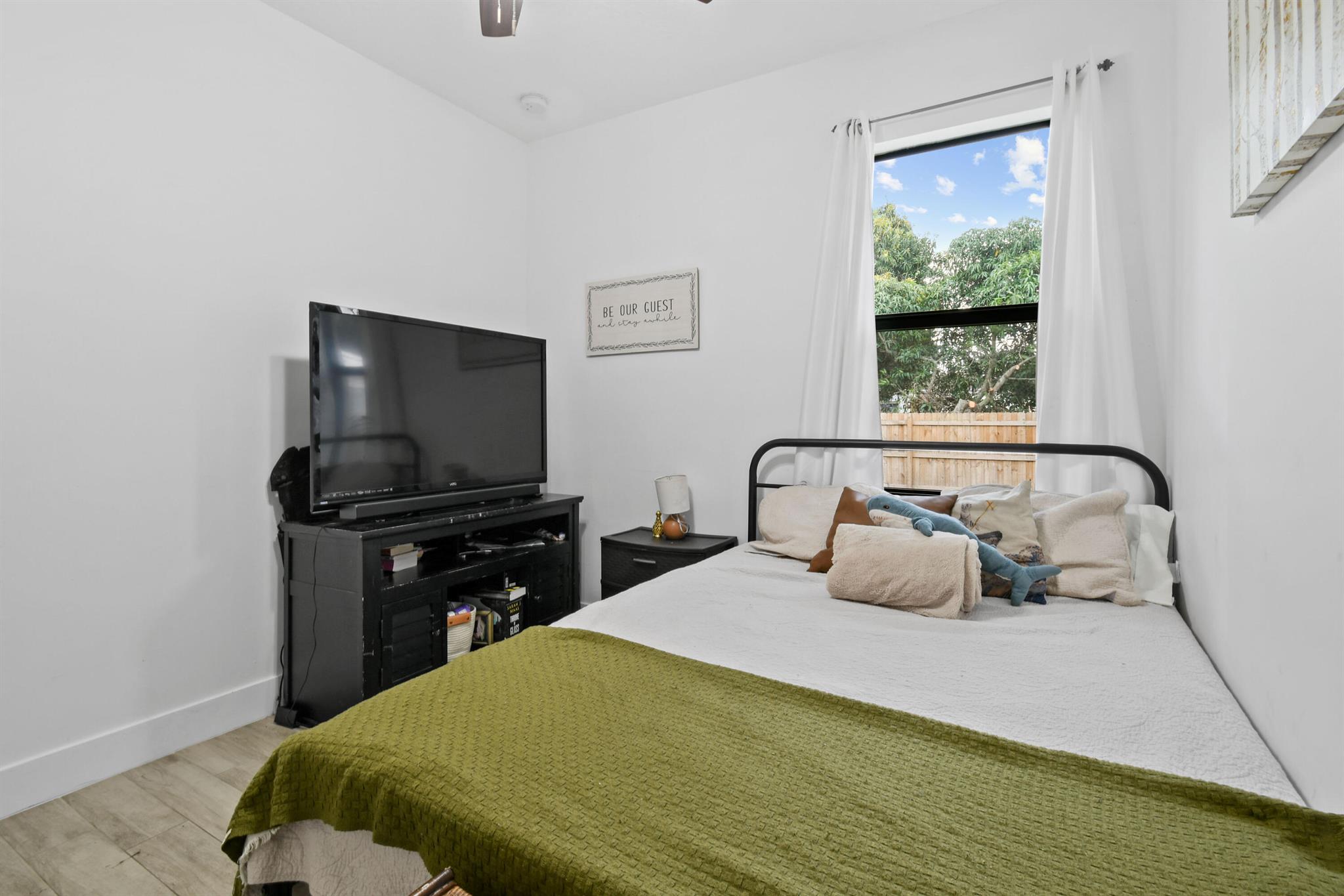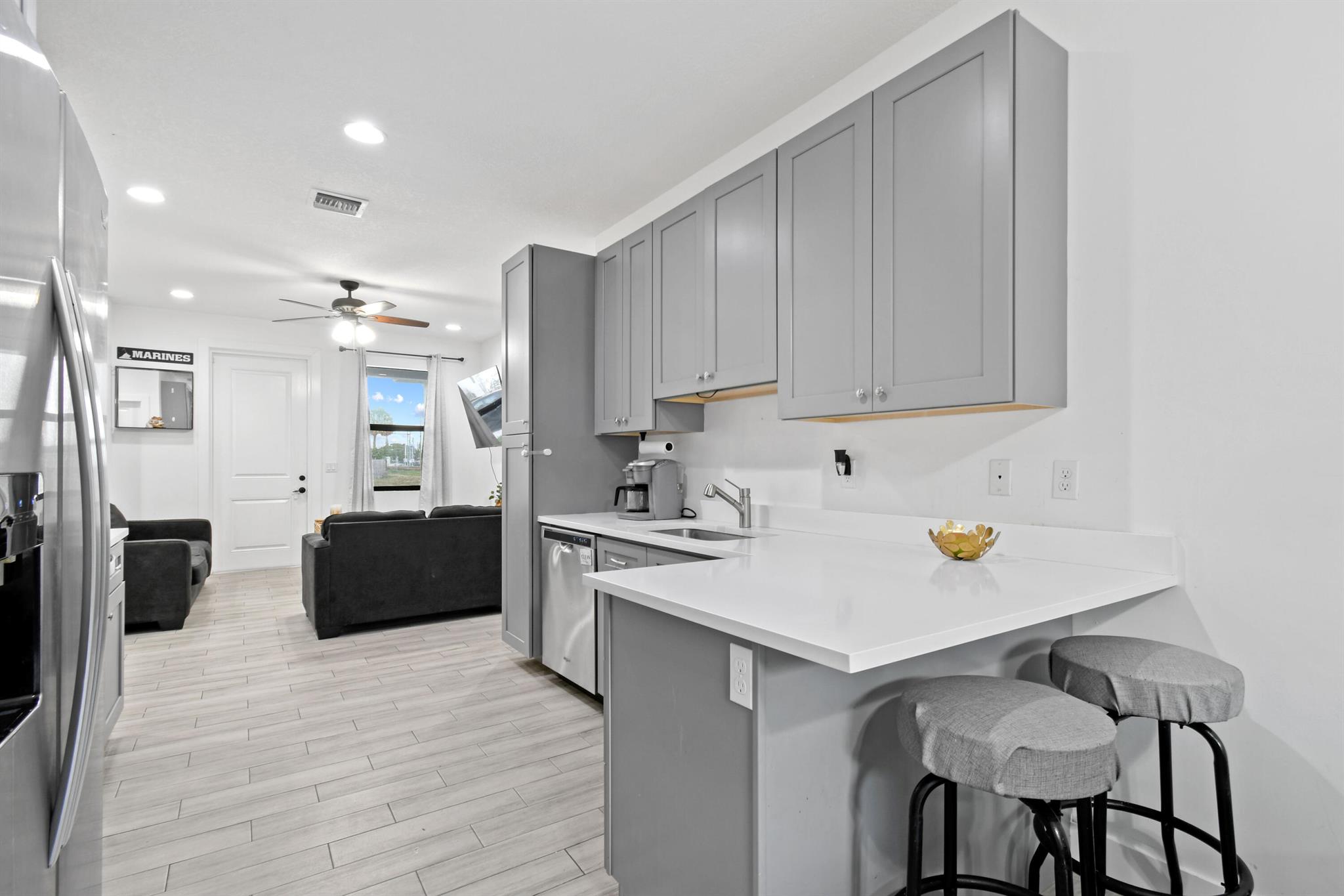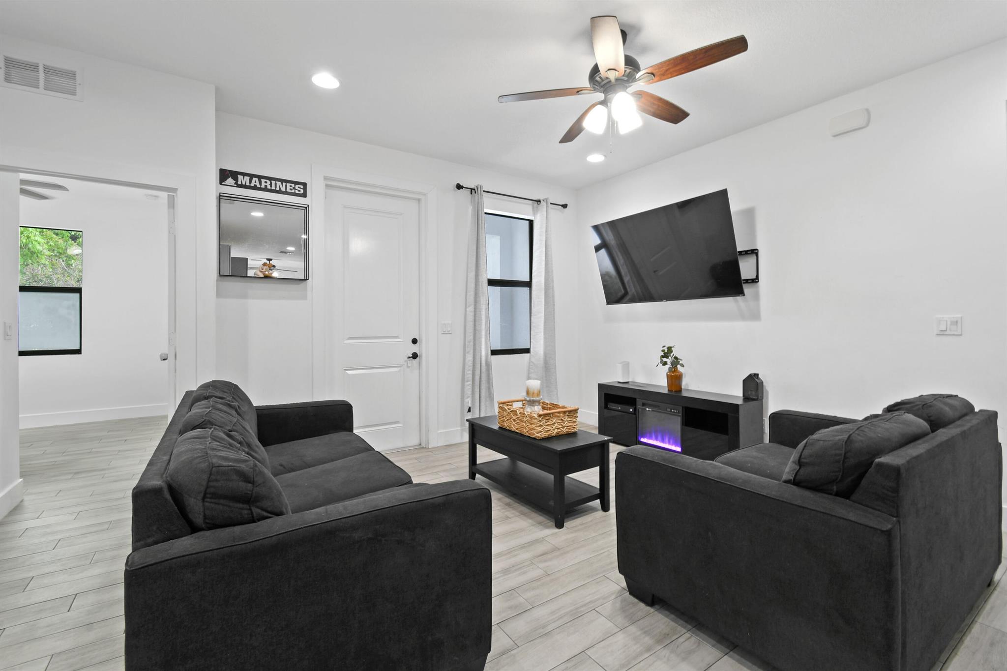A RARE GEM built in 2022, this spacious house boasts 5 bedrooms and 2 baths. The modern kitchen in grey and white is a standout feature with quartz countertops and stainless-steel appliances. Open floor plan with living and dining area. Split floor plan ensuring privacy for all. Massive primary suite with lovely bathroom featuring dual sinks and shower. Beautiful wood tile flooring throughout. Dual sinks and tub in 2nd bathrooms. Large completely fenced in backyard. IMPACT WINDOWS , NO HOA. Conveniently located near, shops, restaurants, beaches, downtown West Palm Beach and I95. Don't miss out on this excellent opportunity whether you're looking for an investment property or long-term family residence this house has the potential to meet all your need.