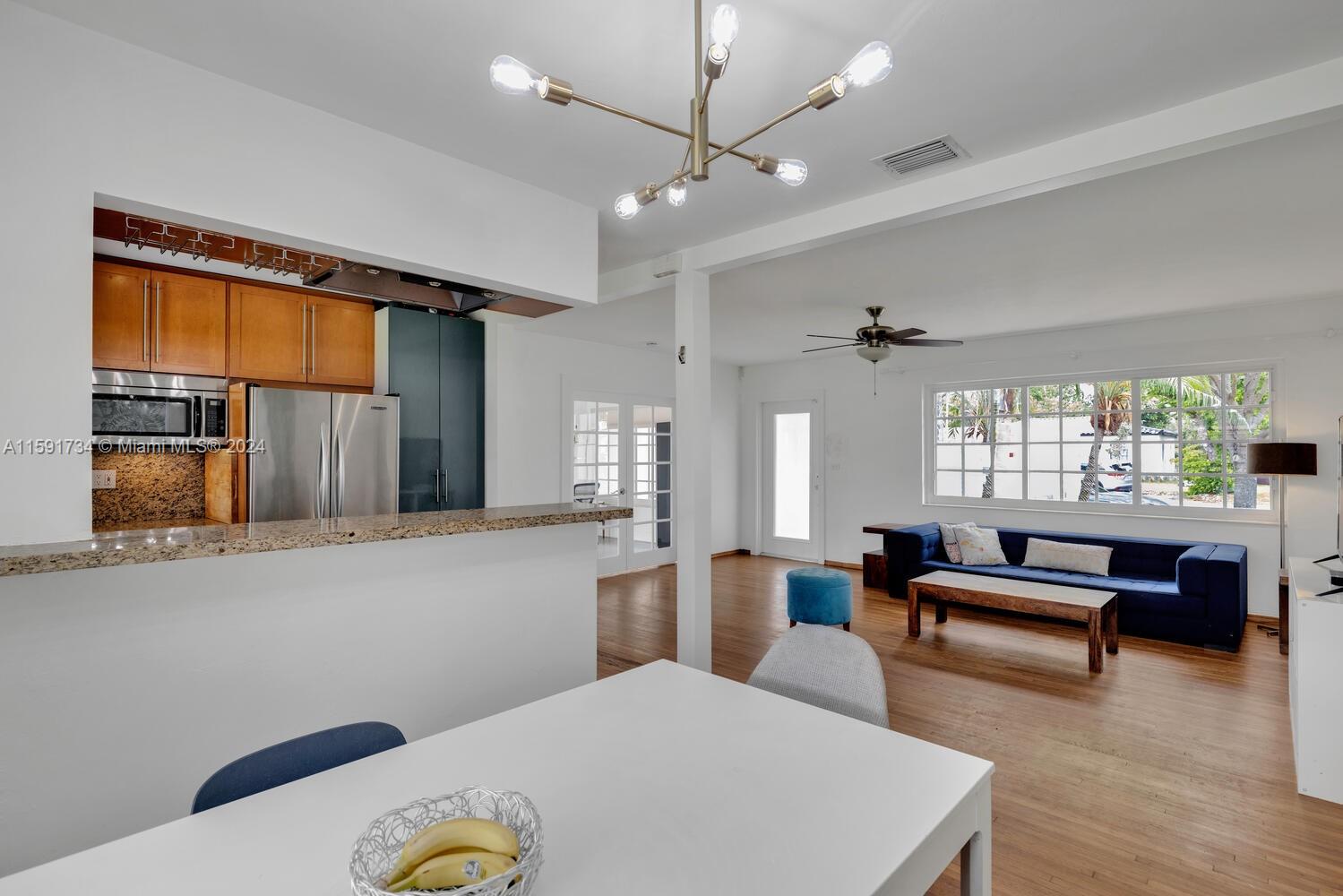 WELCOME HOME to your first home in Miami Shores! Classic MIMO 1950's 'Breezeblock' at the entrance. A pleasant OPEN concept w/natural light pouring through impact windows all around. A HUGE back yard is complete with a NEW fence + rolling gate for privacy and security. Imagine entertaining friends & family & hosting neighborhood BBQ's on the covered patio! Over 1700 total sq.ft. of comfortable space offers immediate expandability in separate "Florida Room" w/polished terrazzo floors and oversized garage w/vaulted ceilings (prime for future 3rd bdrm +sq.ft.). NO FLOOD ZONE=no flood insur required! Rest assured ... BONUS of NEW ROOF & transferable warranty! New appliances (Washer+Dryer+gas cooktop+oven range). Newer hot water heater. New central AC and sprinkler system....lots of positives!
