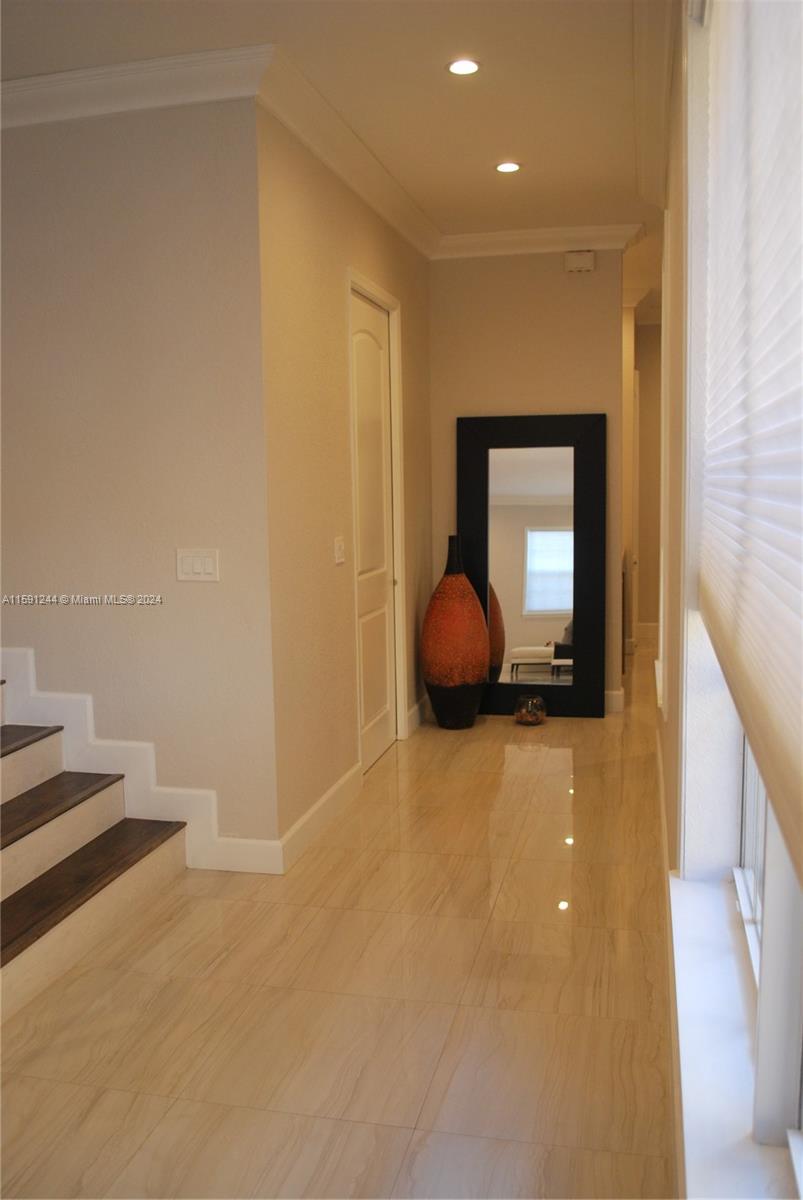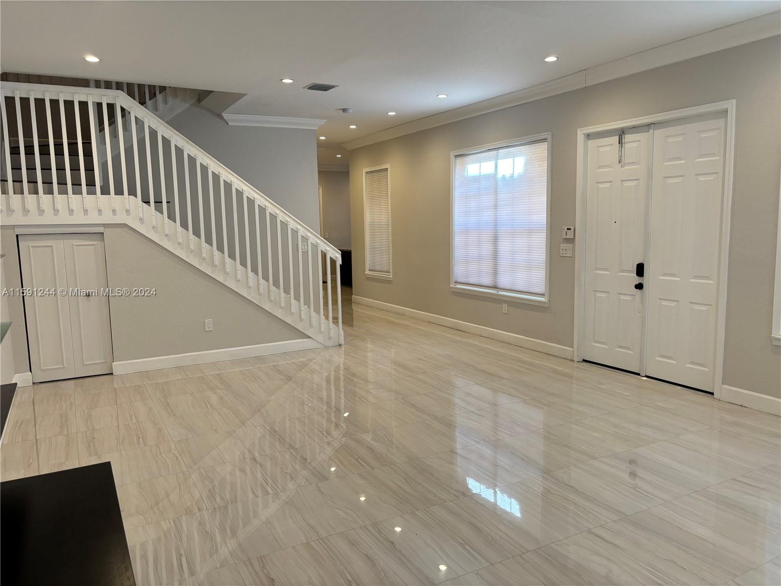 Spectacular recently Remodeled biggest Townhouse at "Cobblestone". Gated Community. Ready to Move. 4 Bed/3 Bath/2 Car garage/2 paved Patios. Secuity Alarm installed. Main Room with 2 walk in closets and Balcony. All rooms with Lamps/Fans. One Room and Full Bath are downstairs with separate entrance by Back Patio. Lot of Space for storage. Exquisite Finishes with Porcelain on 1st Floor and Wood on Stairs and 2nd Floor. Kitchen with Stainless still Appliances, Granite Countertop, Custom Cabinetry Ready for Wine Lovers. All House with High Ceiling and Modern "Ceiling Light Reflectors". Space for a Home Office.Beautiful Community with pool, gym,tot lot with Pool, Gym, Tot Lots for Kids, and Landscape. Quick Access to expressways, Malls, Restaurants, Markets, Hospitals and Class "A" Schools