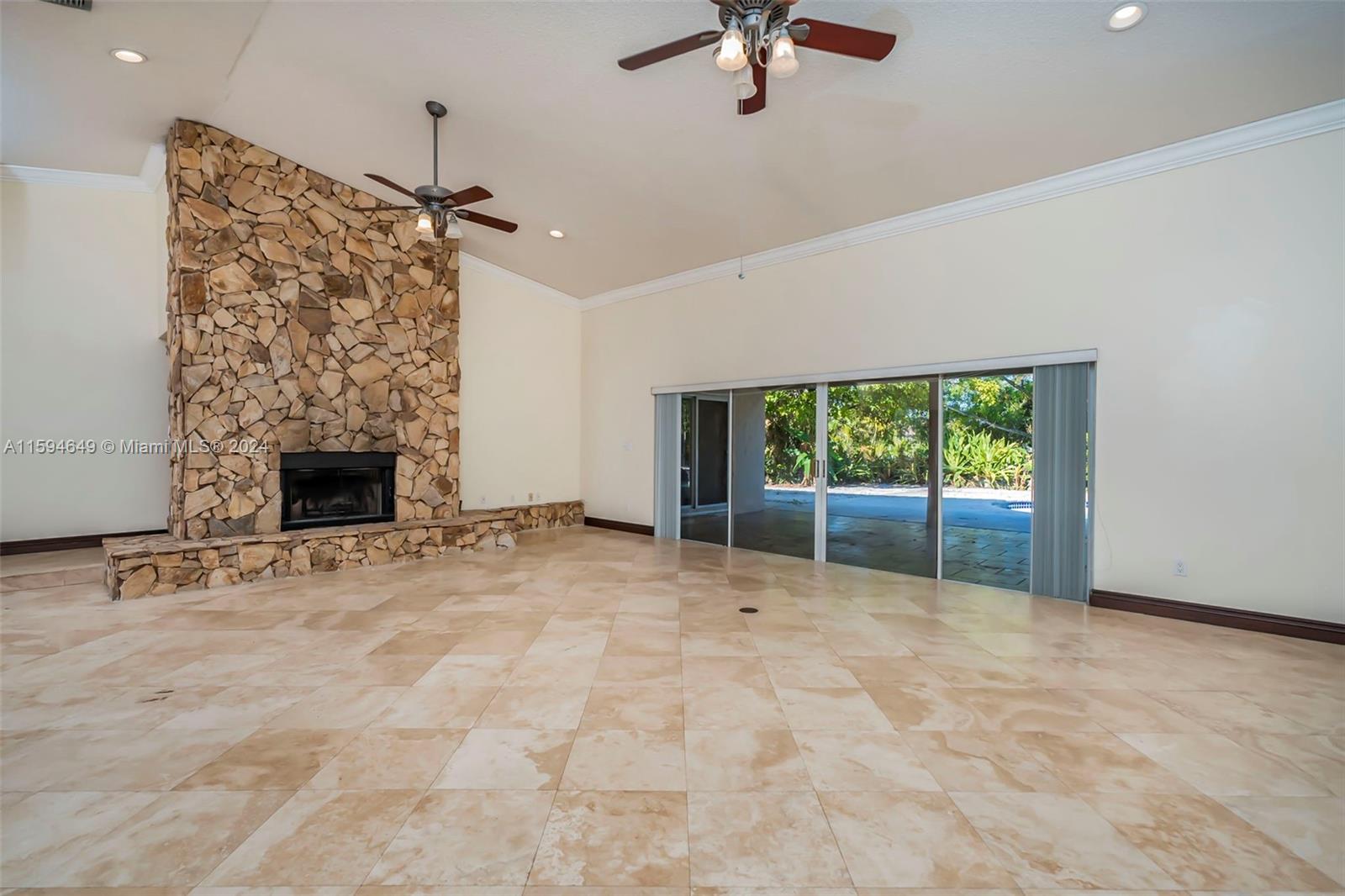Welcome to this stunning 4-bedroom, 2-bath home, sits on a 46,358 sqft lot & the best part NO HOA! As you step into the foyer, you'll be greeted by a grand living room featuring vaulted ceilings, a cozy fireplace, & sliding doors that open to your private backyard oasis. The kitchen boasts granite countertops, white shaker cabinets, crown molding, & recessed lighting. The primary suite features sliders providing direct access to the backyard, & a spacious walk-in California closet. The additional bedrooms are generously sized, offering comfort & versatility for family & guests. Outside, the property truly shines w/ it's refinished pool & separate spa surrounded by travertine stone. The extended driveway comfortably fits up to 8 cars. 2-car garage is equipped w/ shelves. Central HVAC system