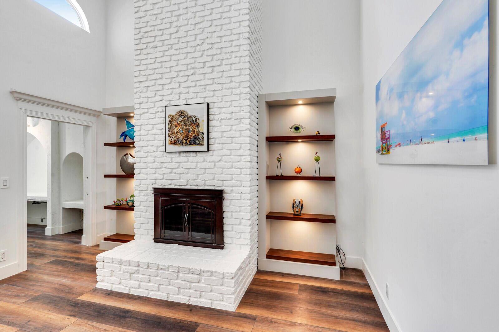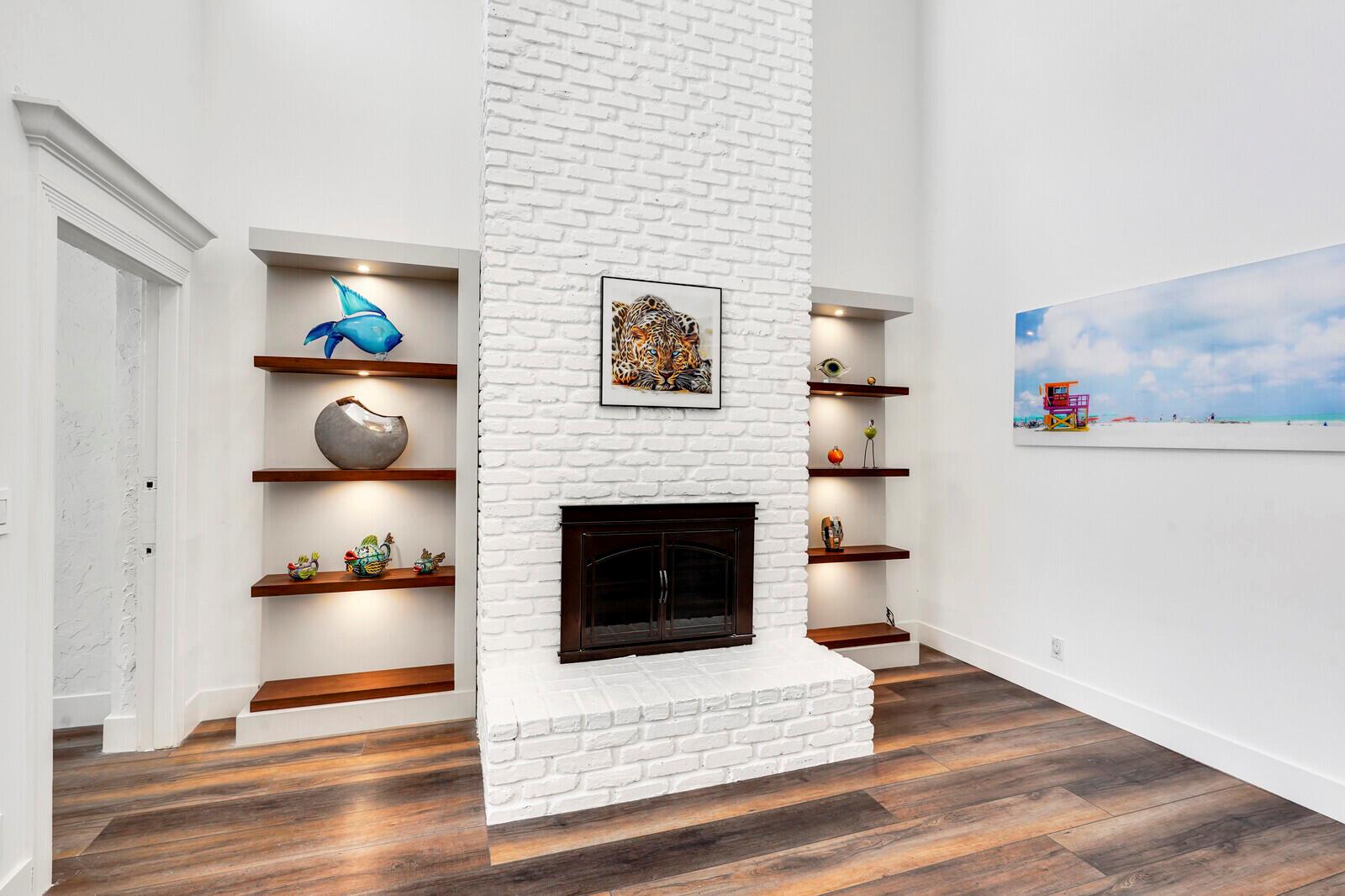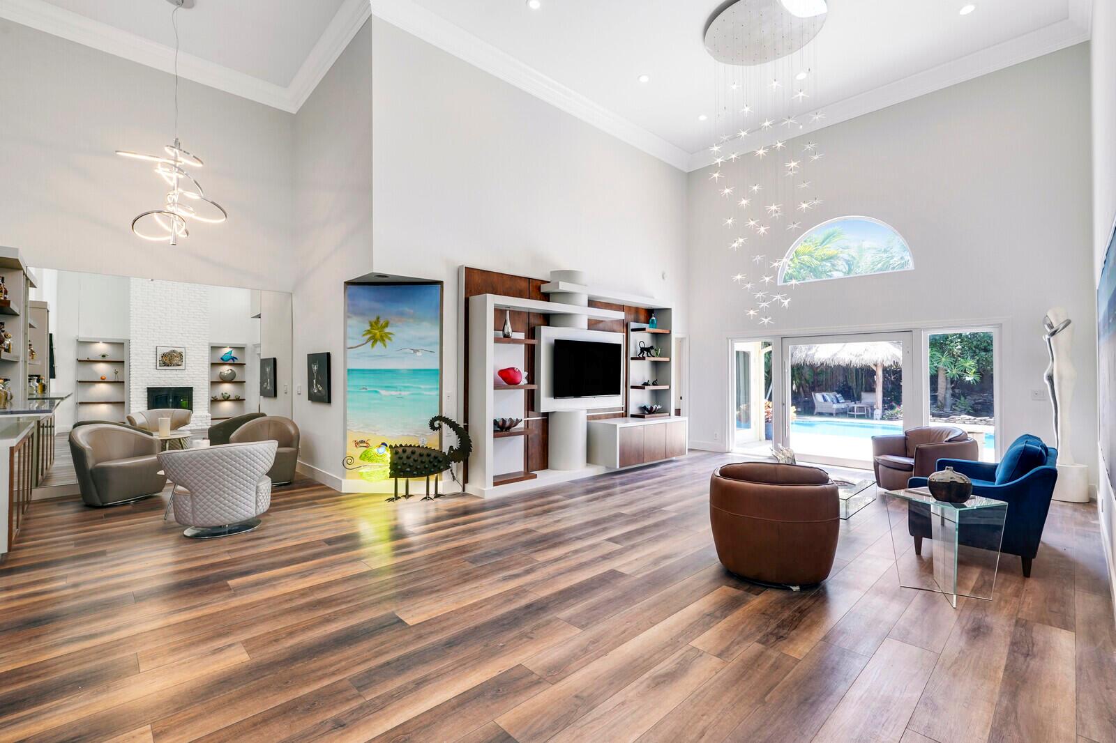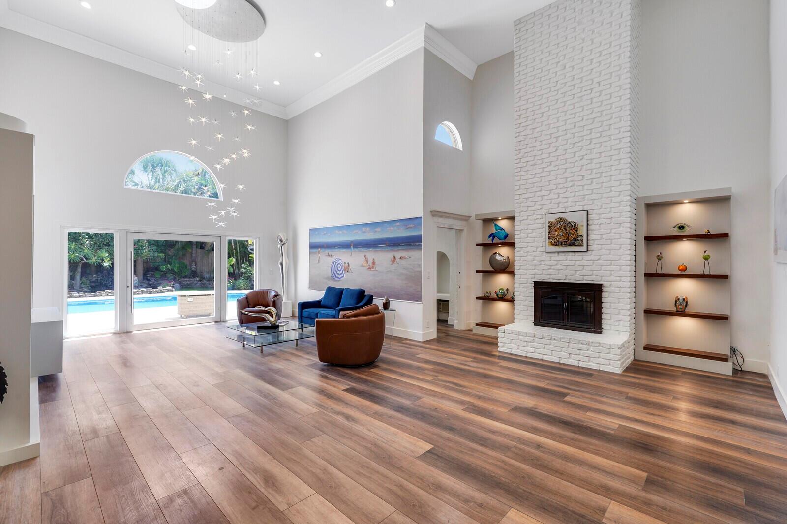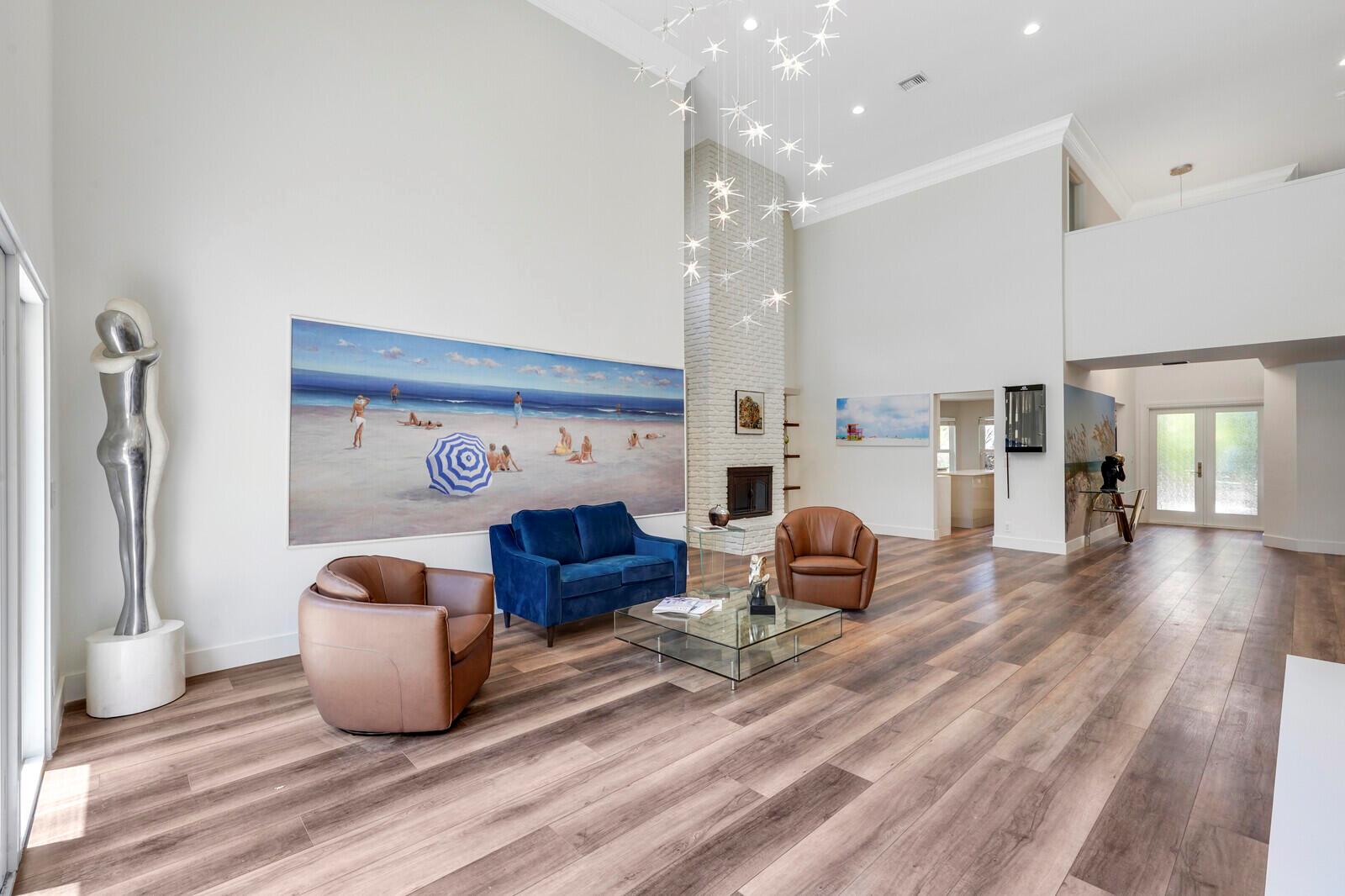 WATCH THE NARRATED VIDEO! Welcome home to the ideal blend of comfort and elegance! Nestled in a tranquil, private cul-de-sac in desirable West Boca Raton, this stunning 4-bedroom, 2.5-bathroom house offers 2573 square feet of beautifully renovated living space, designed to cater to refined tastes and practical needs. Step inside to be greeted by soaring 20-ft ceilings, an inviting dining room complete with a charming brick fireplace, a separate bar/lounge, and spacious living room. Primary suite is conveniently located on the main floor. The interior showcases custom lighting and unique artwork, setting a striking backdrop for everyday living. Luxuriate in the chef's kitchen, equipped with marble countertops, and explore the spacious bonus room perfect for a home office, wine room, study